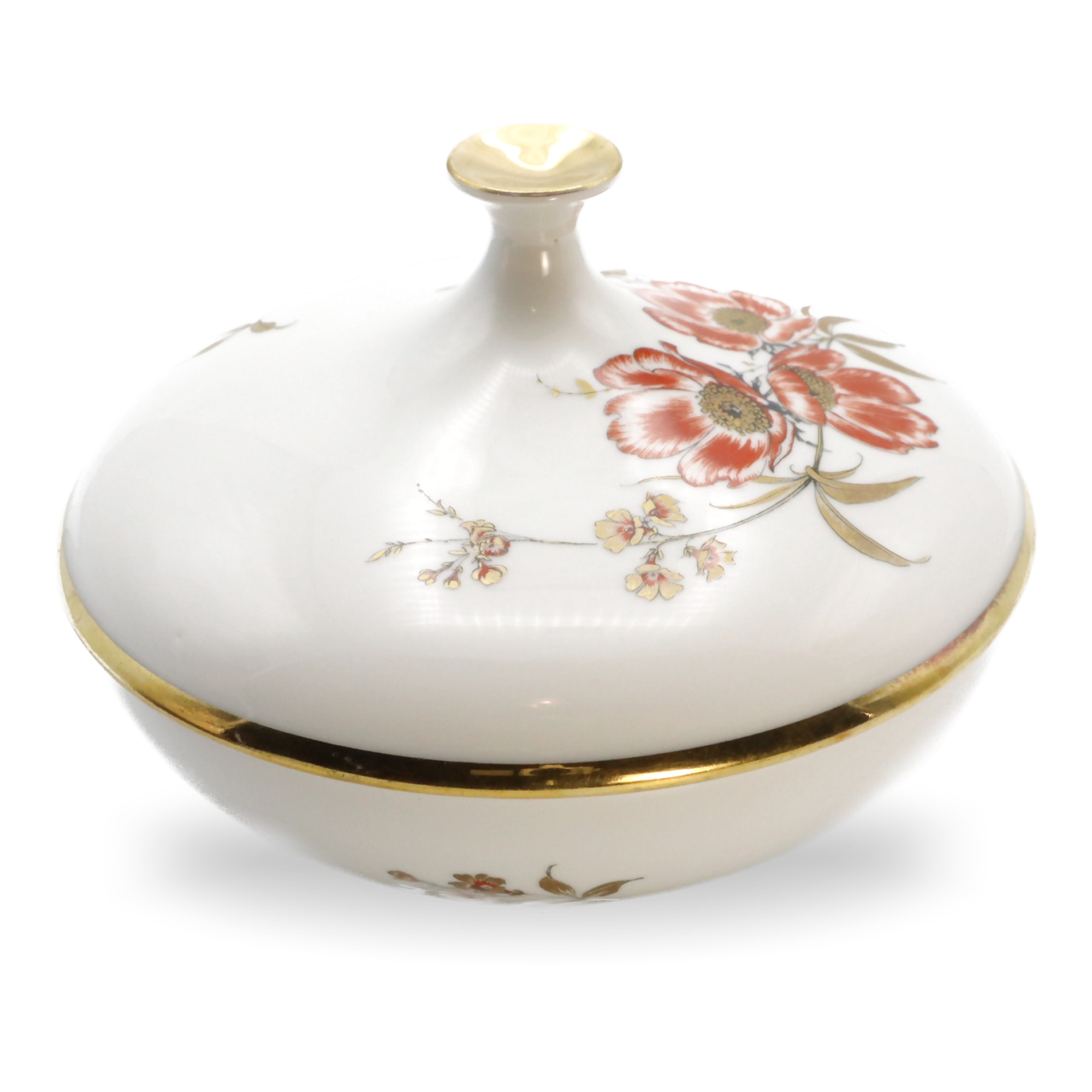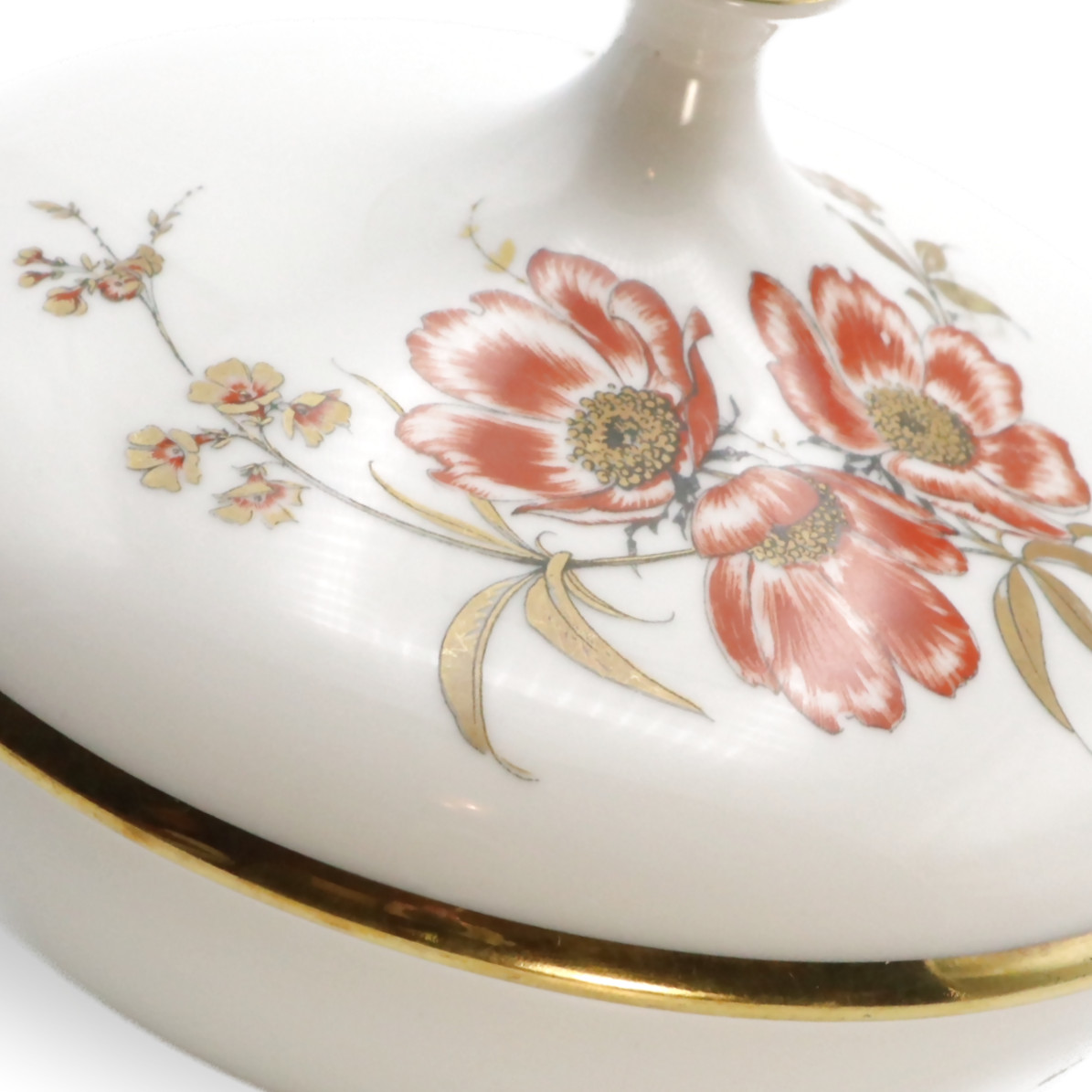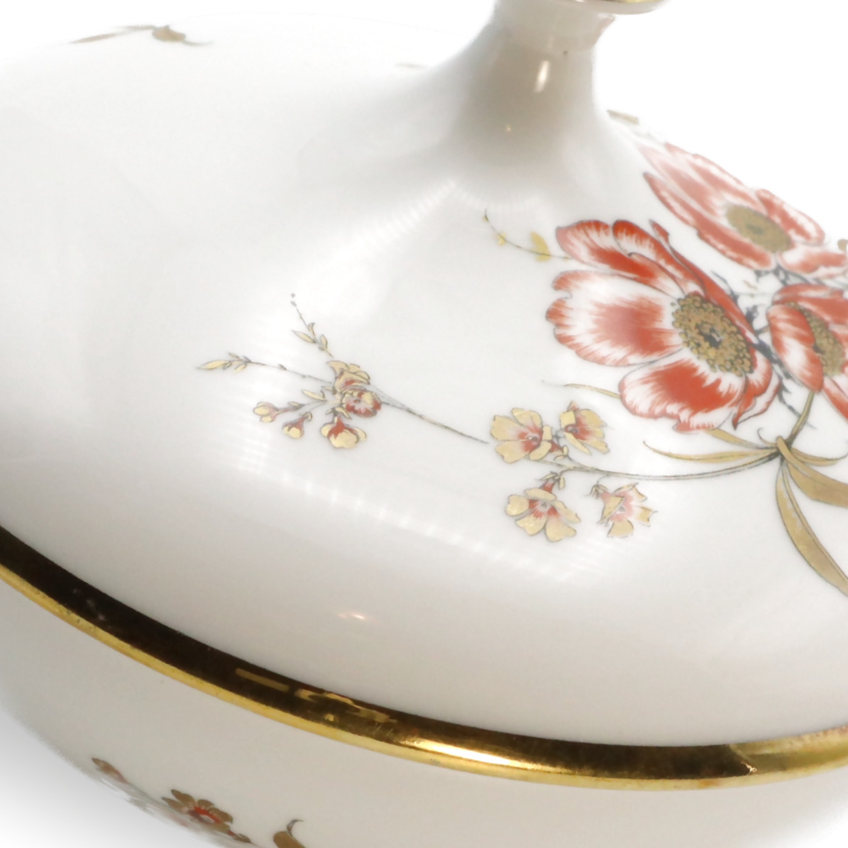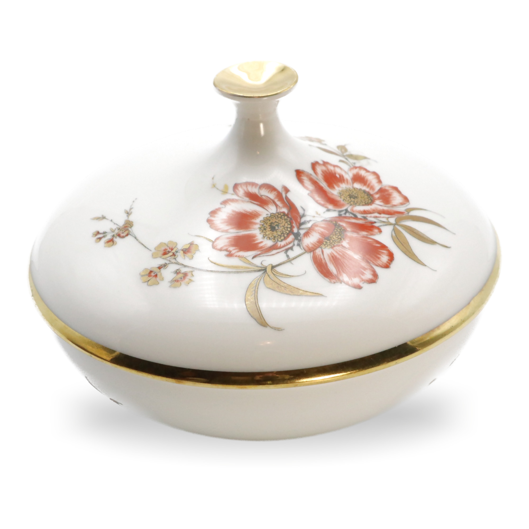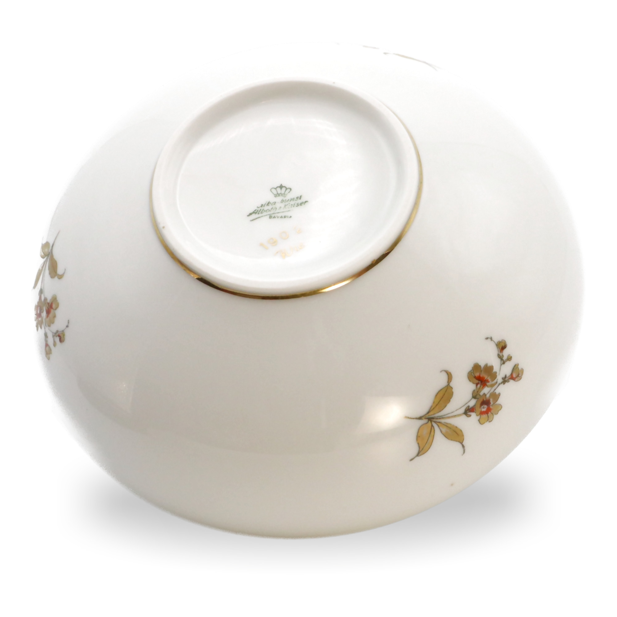 Known for their intricate floral patterns, luxurious gold accents, and smooth, high-gloss finishes, Alboth & Kaiser porcelain items are sought after for their aesthetic appeal and superior quality. This particular trinket box exemplifies the exquisite floral artistry, featuring vibrant blossoms delicately interwoven with fine, slender stems, showcasing the brand’s signature style.
