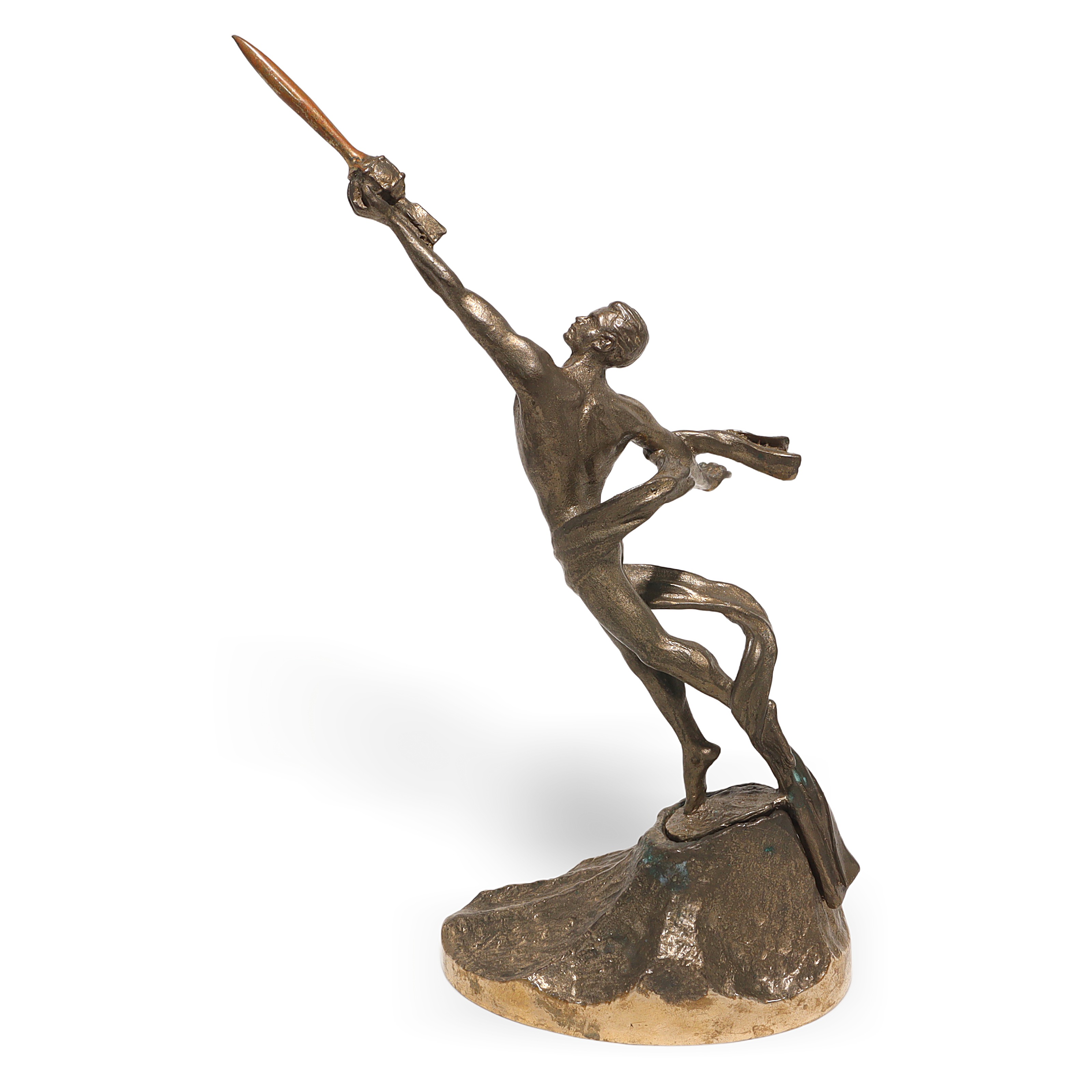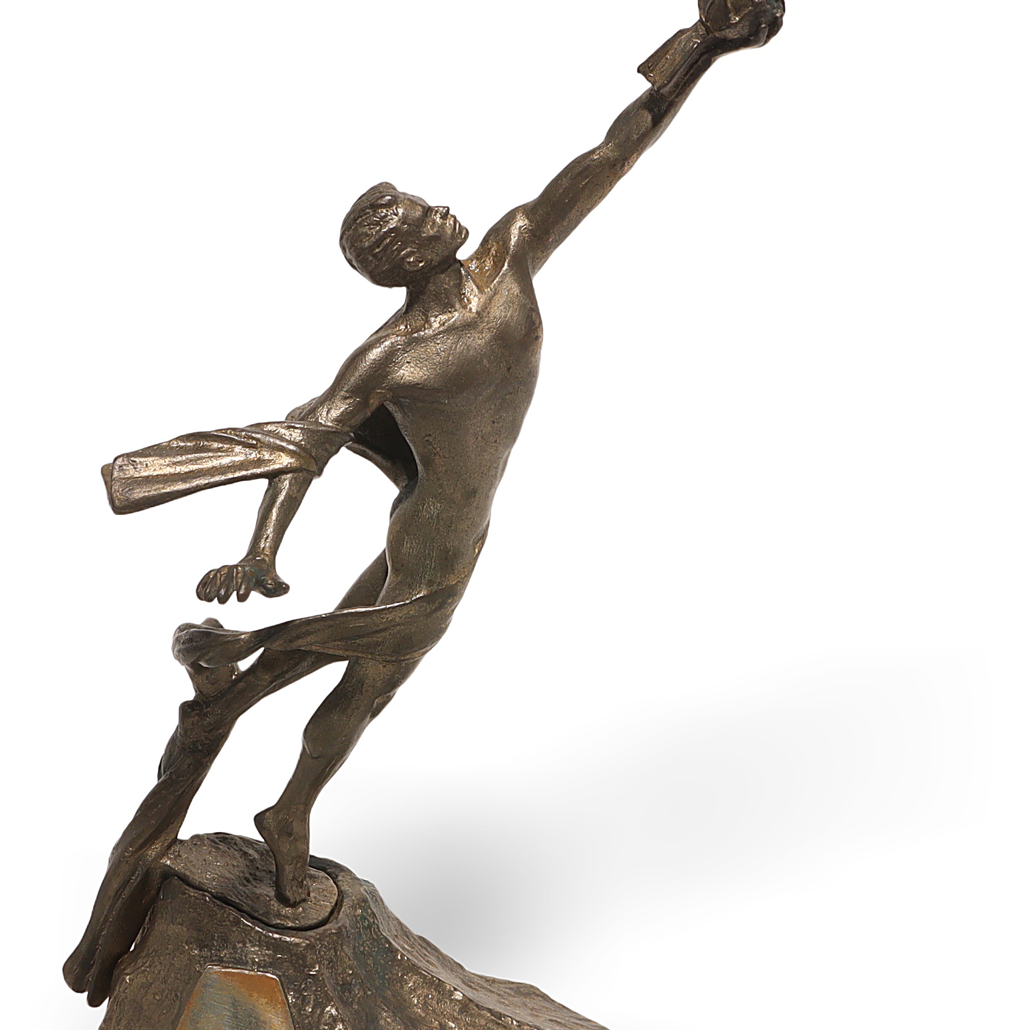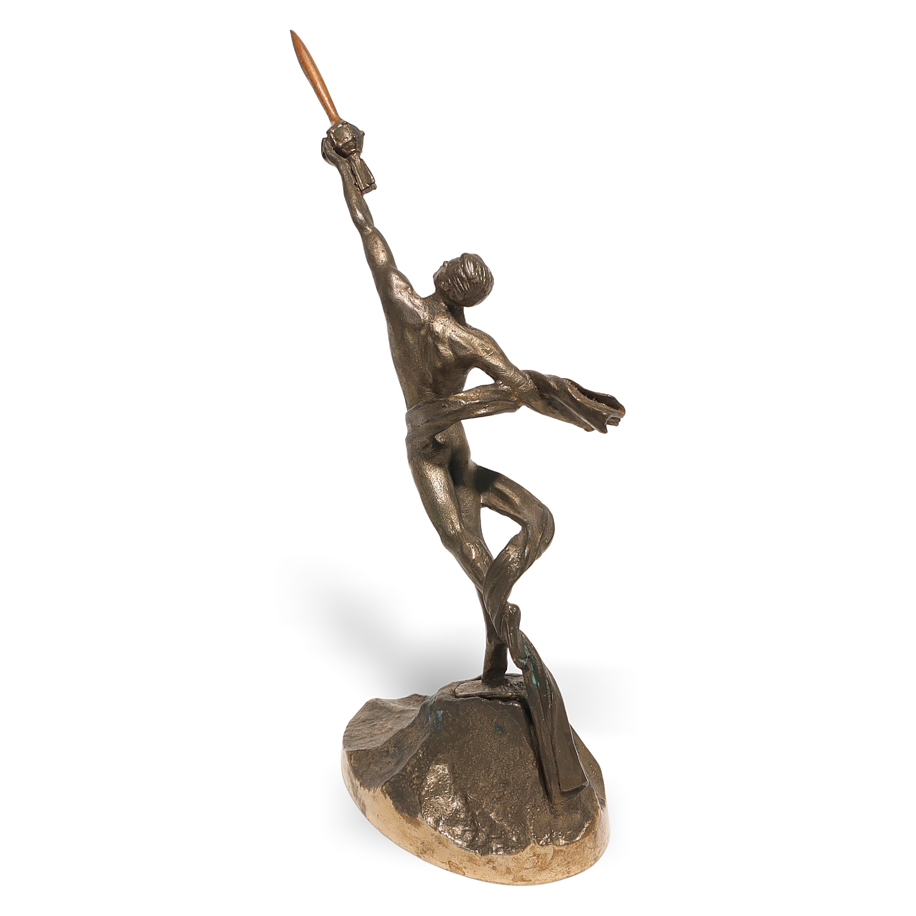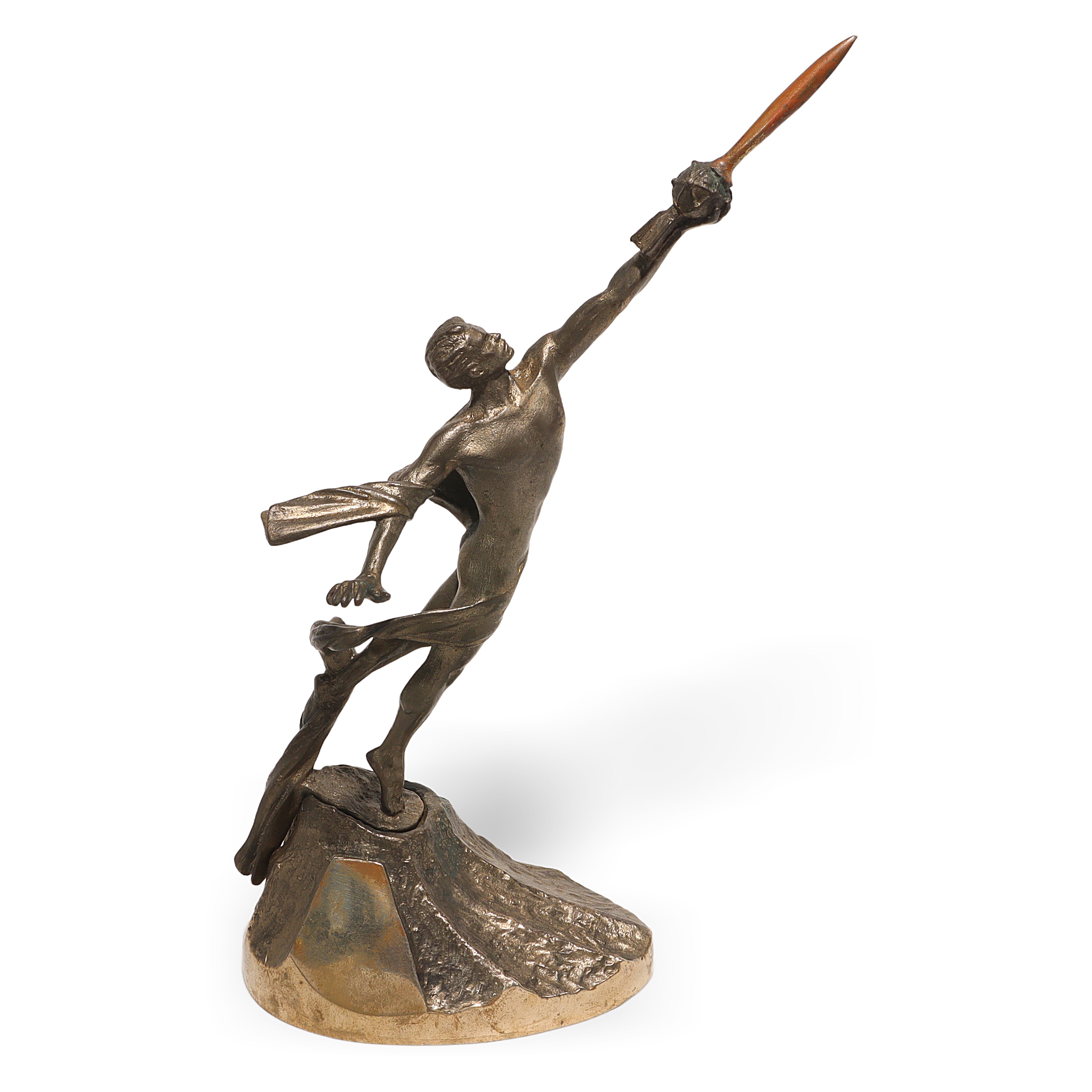 This is a vintage Art Deco–inspired bronze called Rocket Man, dated around 1960. The figure shows a streamlined male form springing…