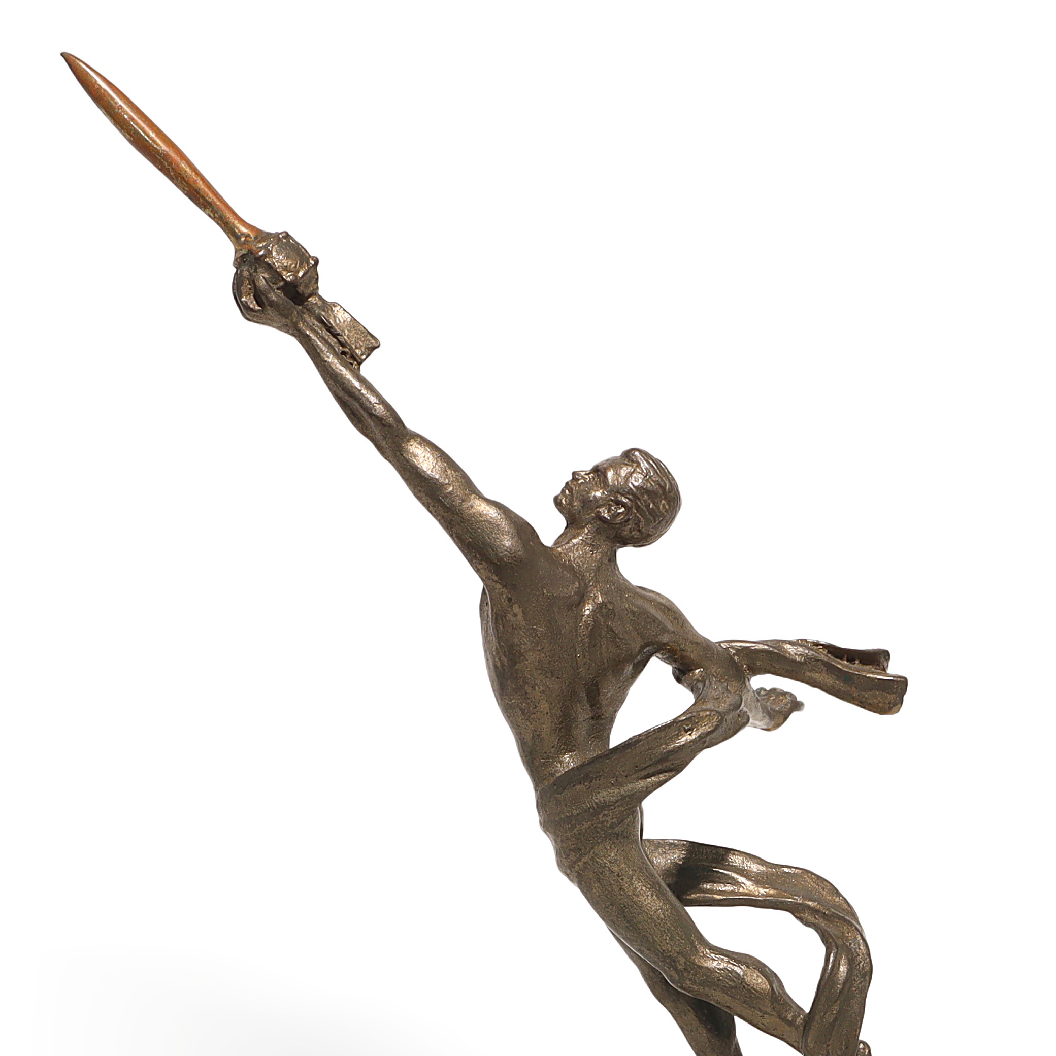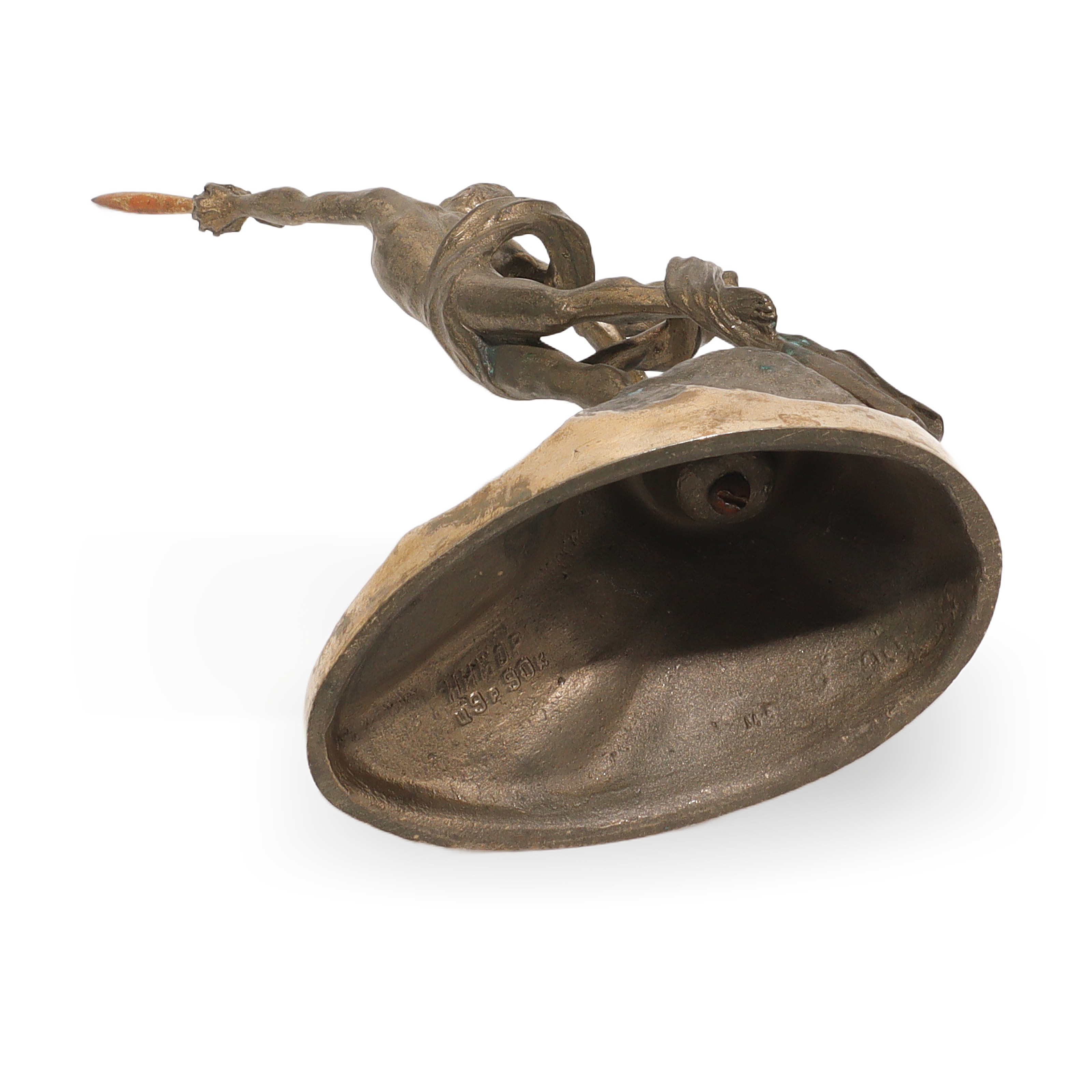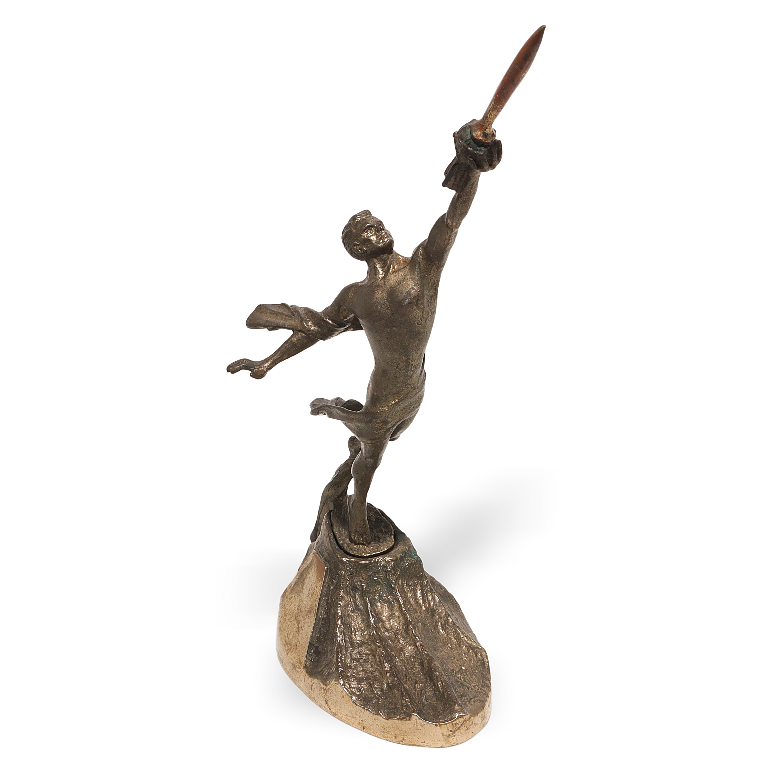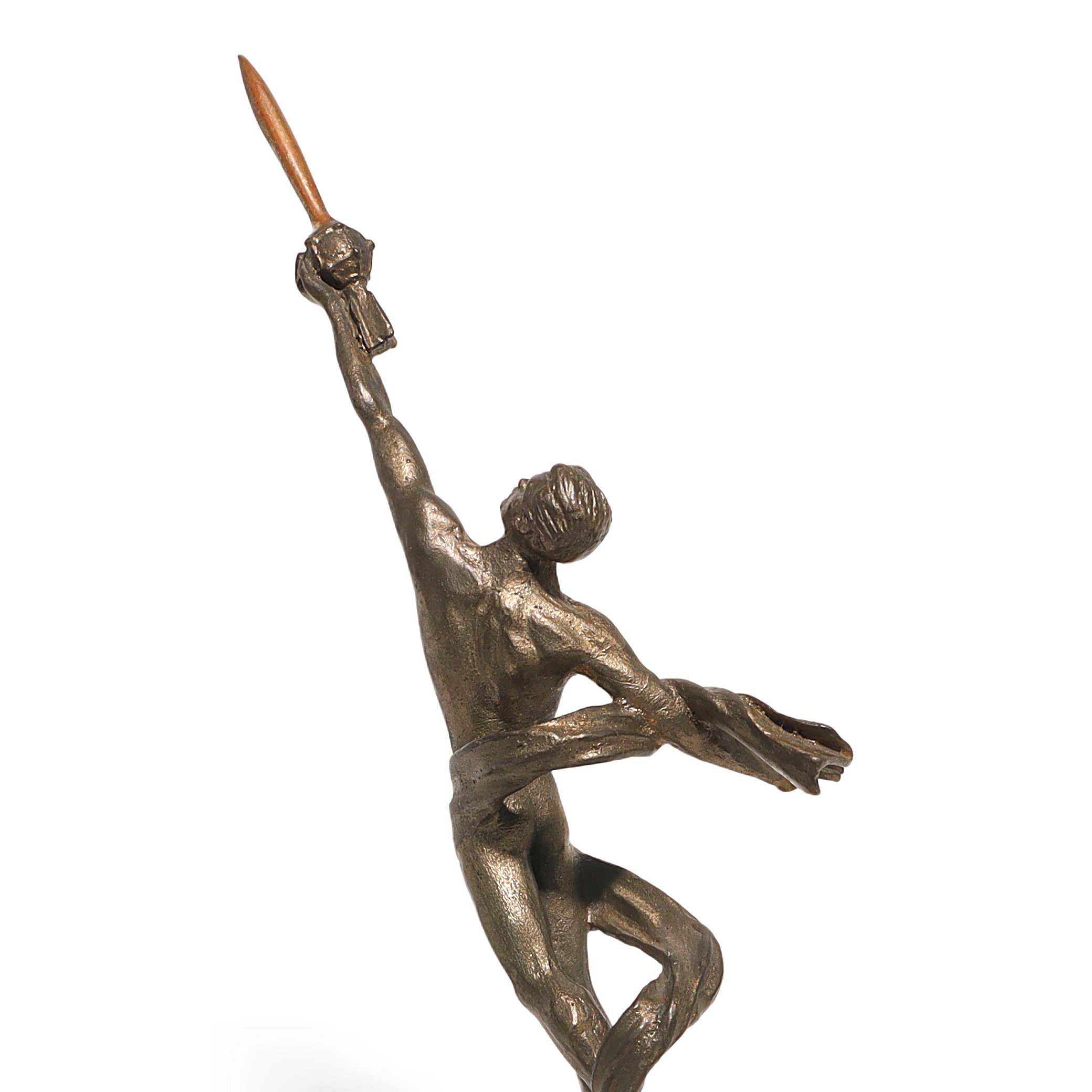 This is a vintage Art Deco–inspired bronze called Rocket Man, dated around 1960. The figure shows a streamlined male form springing…