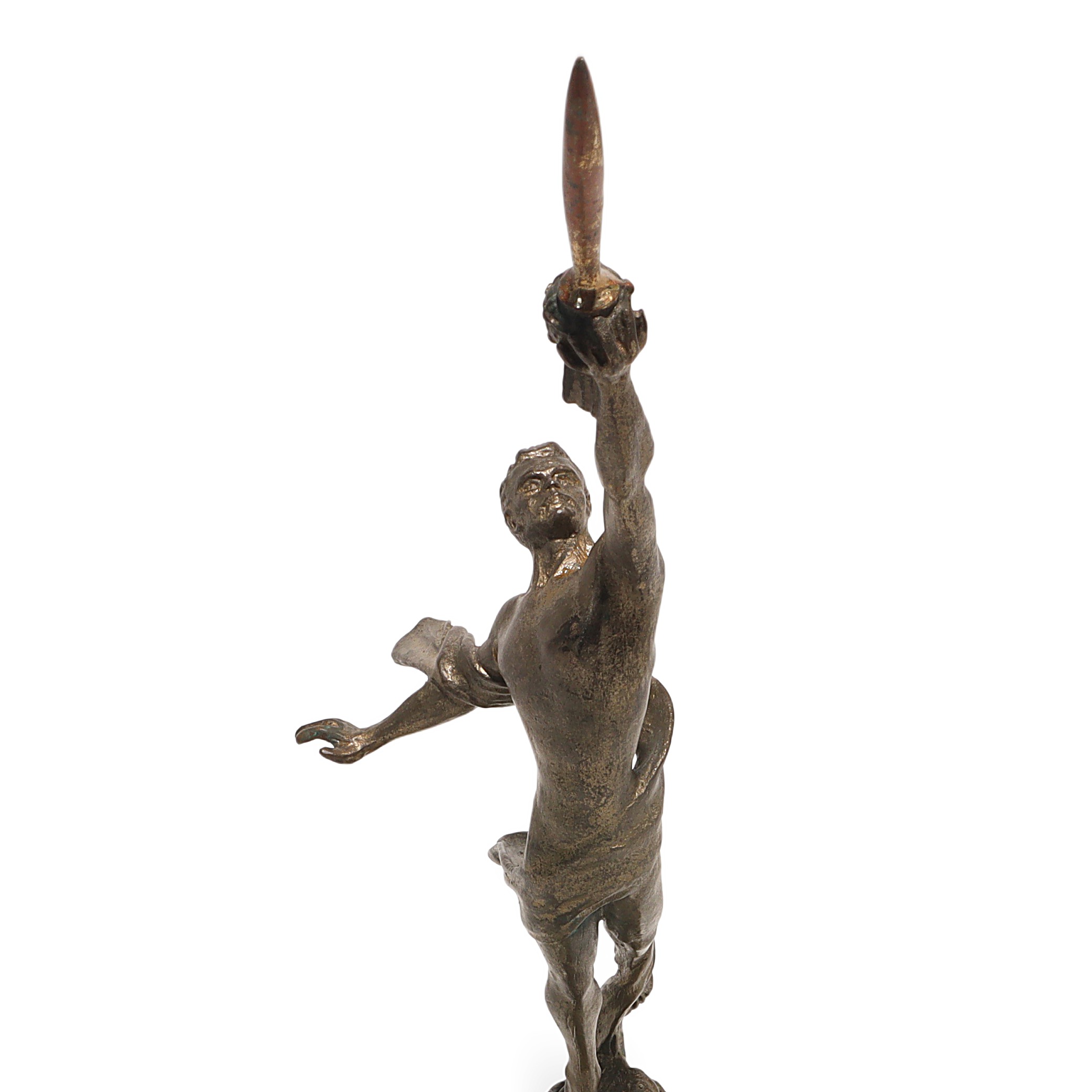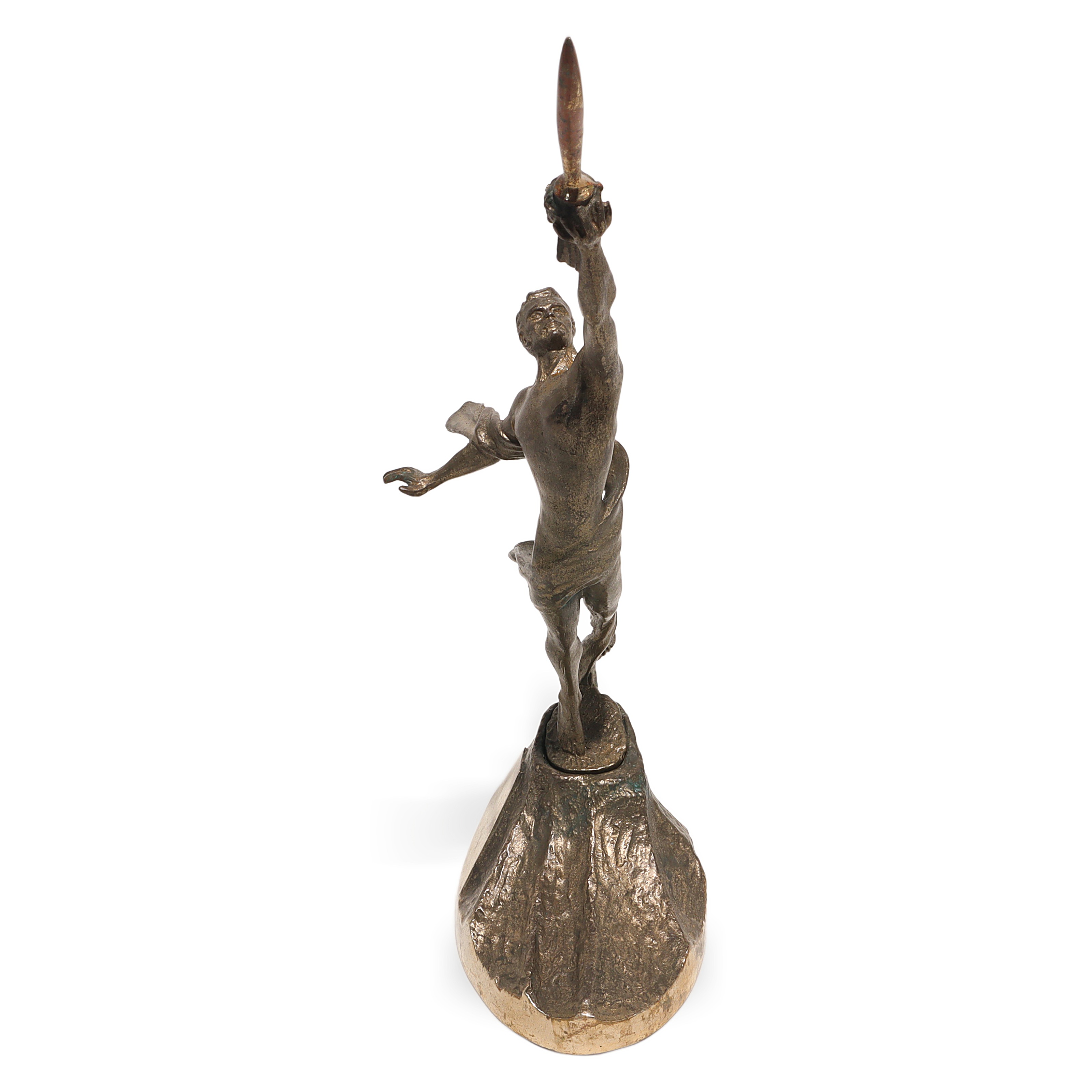 Branding on sculptures like this is often minimal or missing, so many are simply attributed to mid-century foundries that produced Art Deco revival and Jet Age figures for galleries, department stores, and award houses. Most were cast in bronze using the lost-wax process, then hand-finished; the contrasting rocket tip was sometimes polished or made from a different alloy for pop. Collectors prize these for their crossover style—Deco lines meeting 1960s space-race optimism—and for their solid, weighty feel compared to later resin reproductions. Original examples with the rocket intact and the base in clean shape are not common, making a Near Mint 1960 piece like this relatively scarce and very appealing to mid-century and Deco collectors alike.
