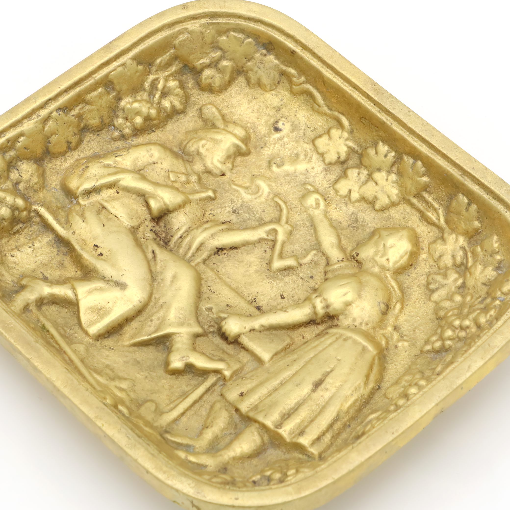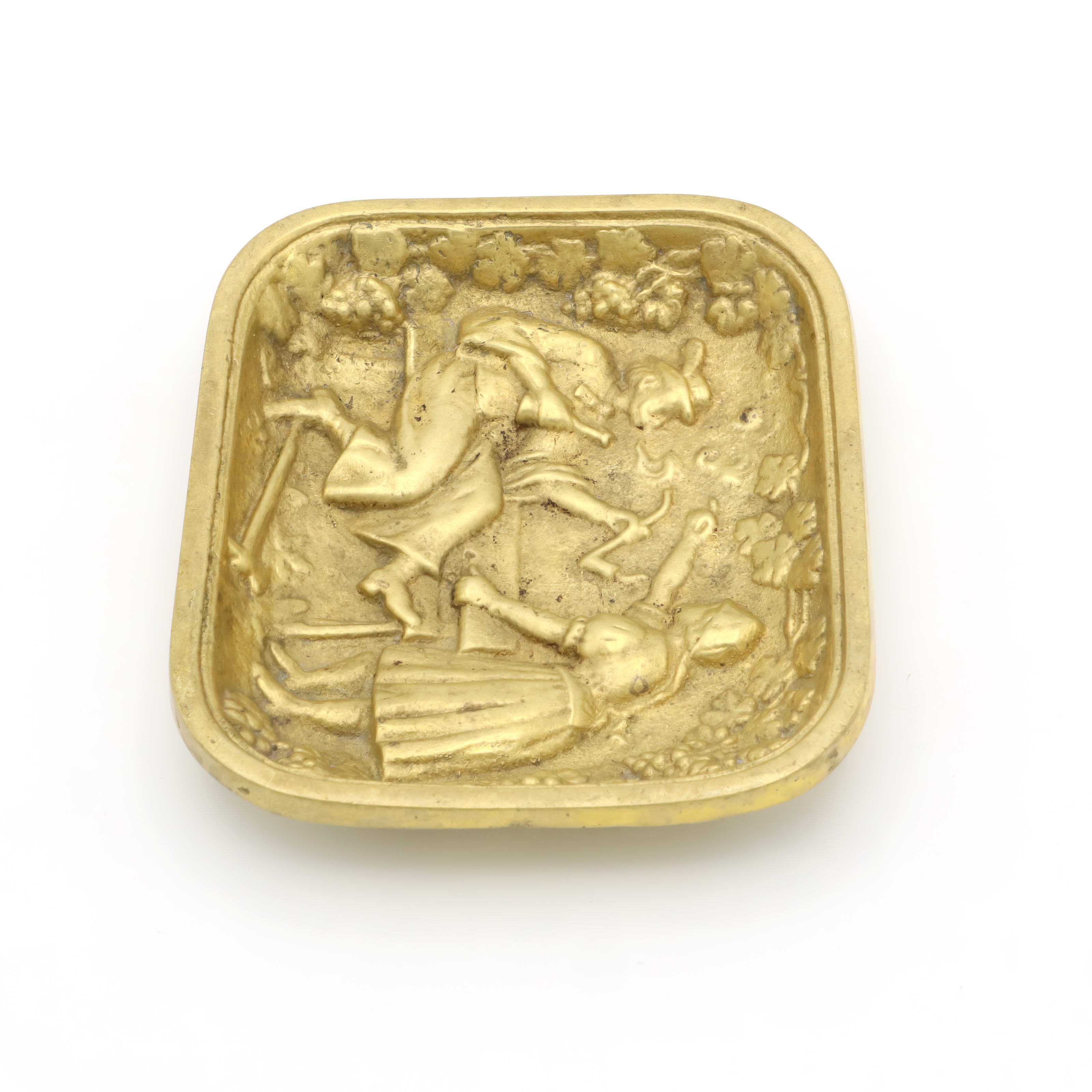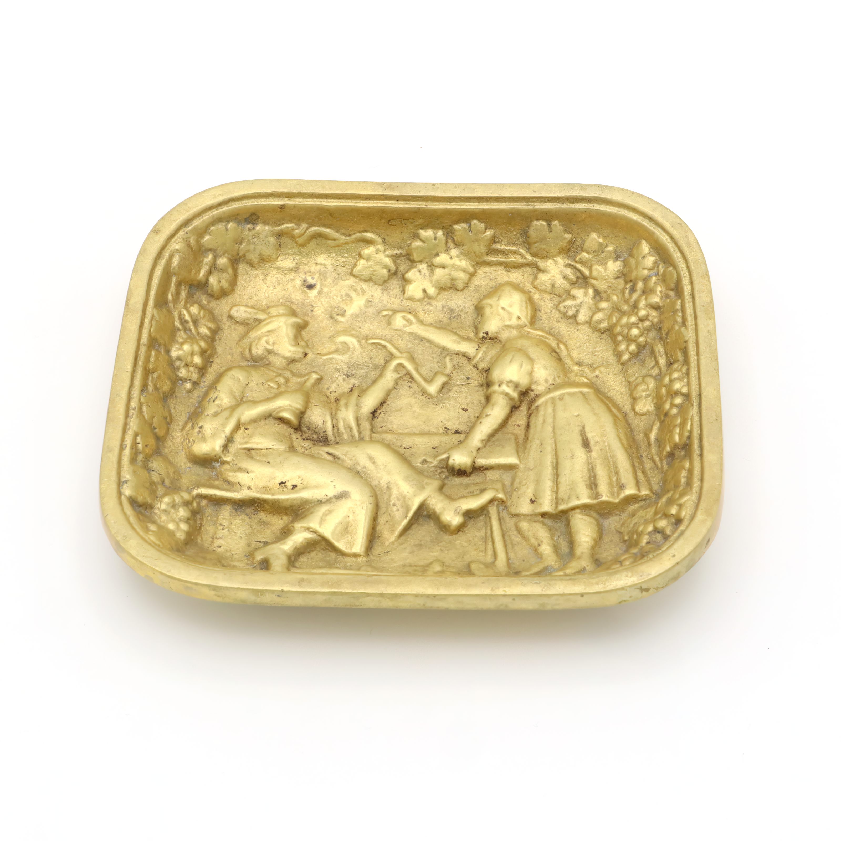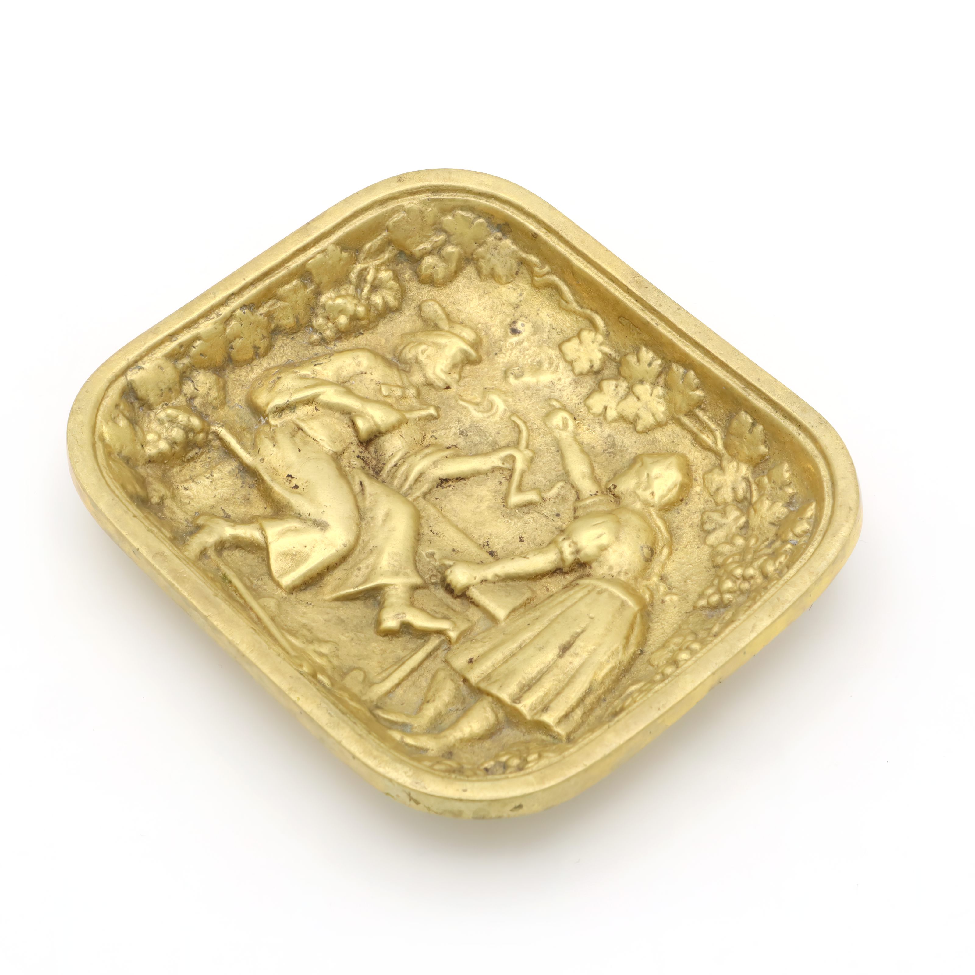 Back in the 1970s, valet trays like this one were a common sight on men’s dressers or at the front door. They were the catchall solution for things you needed every day—wallet, change, keys, cufflinks—or just a place to keep things organized. The folk art design was especially popular in Europe, with many similar trays being made in Germany, Italy, or Belgium. Heavy brass trays like this were valued for their durability and the warm, classic look that only gets better with age. Today, pieces like this have become collectable. They are no longer mass-produced with the same attention to detail and robust craftsmanship. You can spot the time and care that went into each molded detail—the intricate border of grapes and leaves, the expressive lines capturing a snapshot of rural life, and the soft golden patina developed over years of handling.
