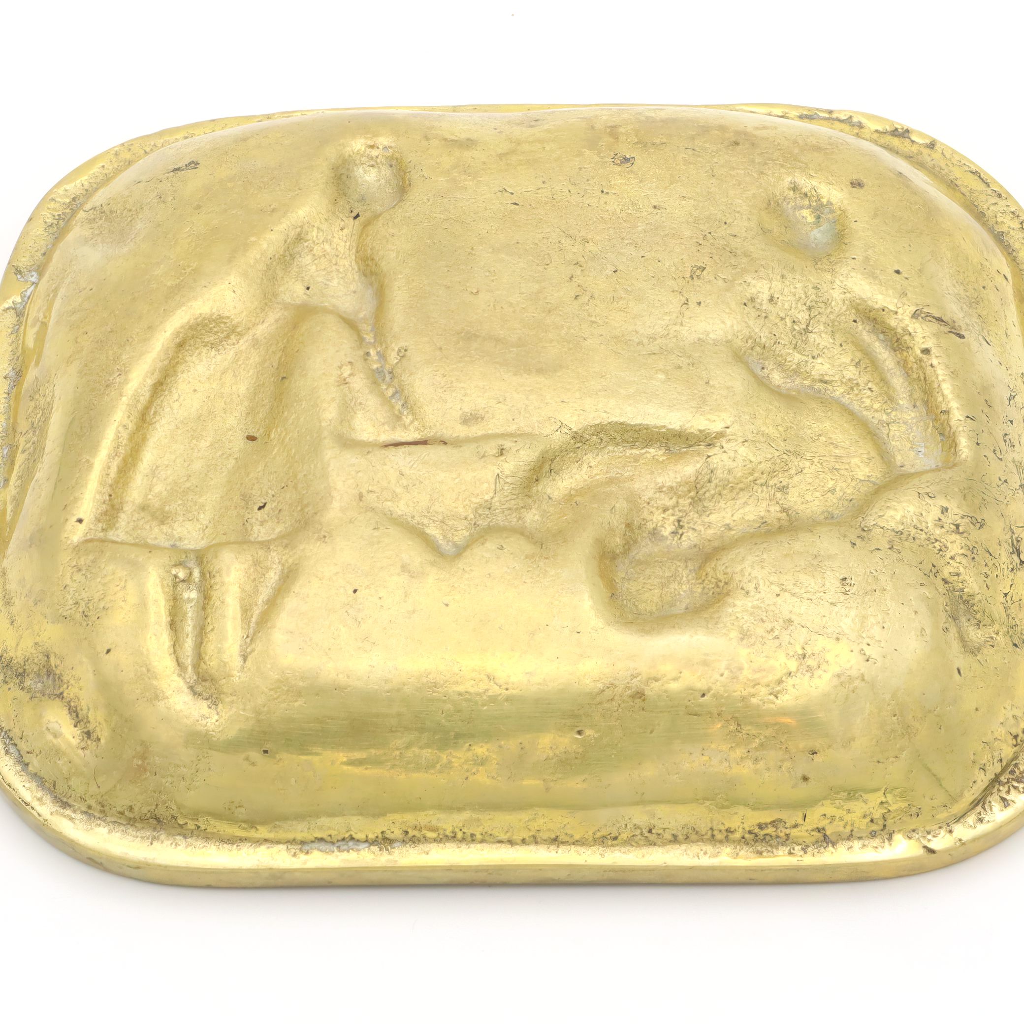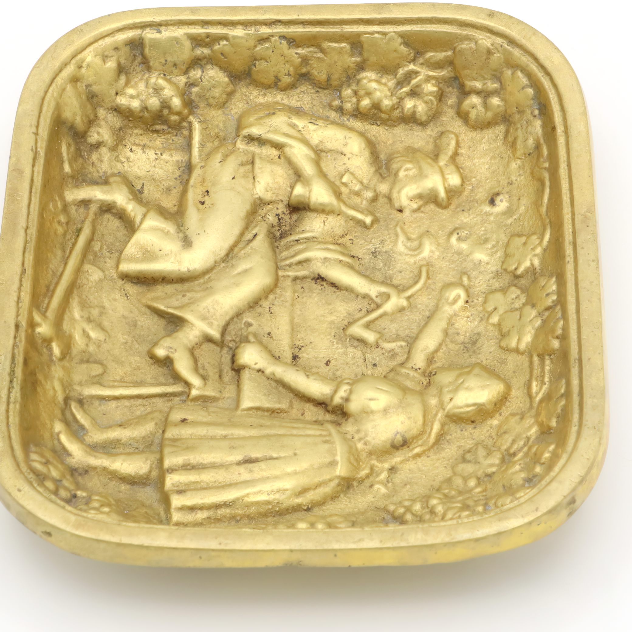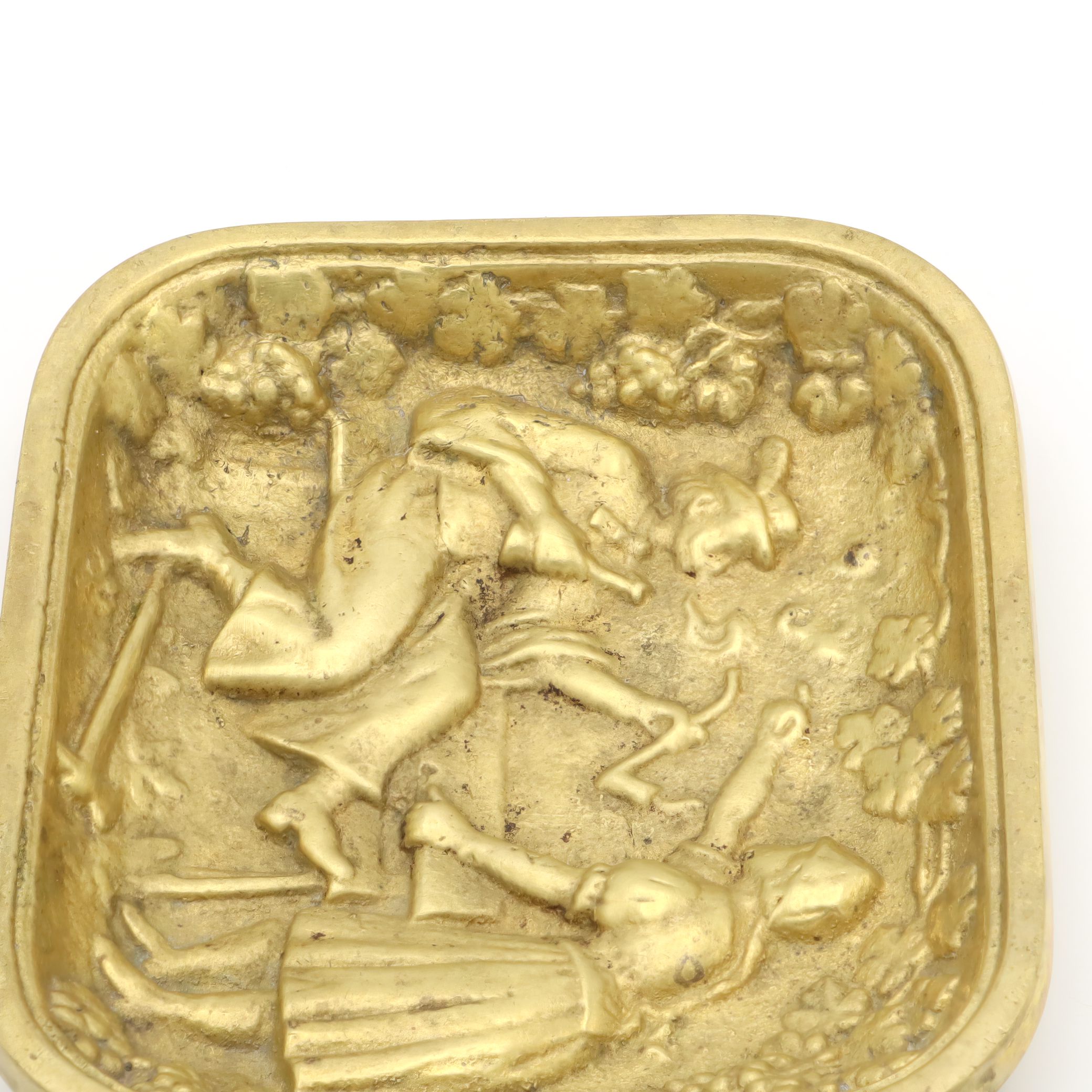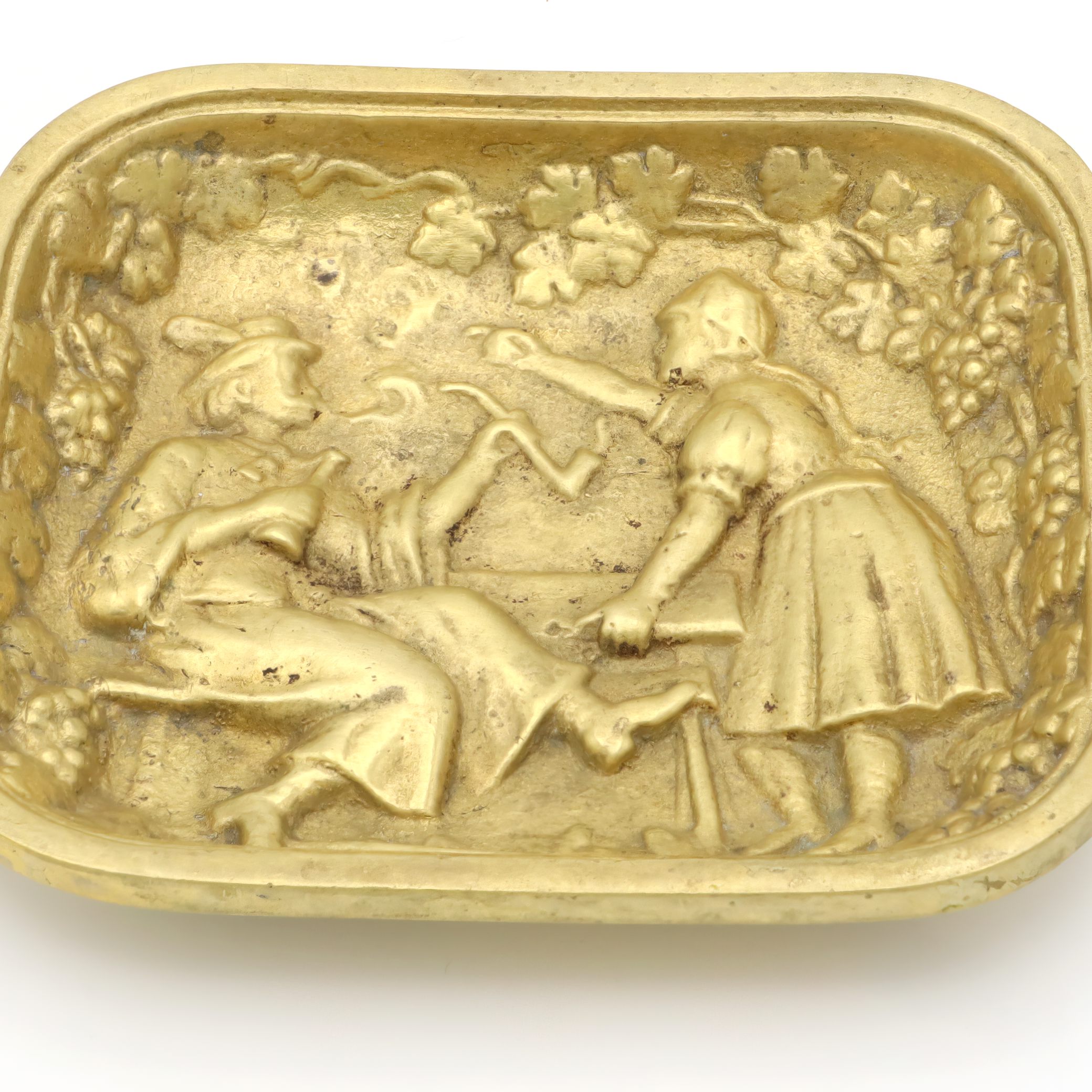 Back in the 1970s, valet trays like this one were a common sight on men’s dressers or at the front door. They were the catchall solution for things you needed every day—wallet, change, keys, cufflinks—or just a place to keep things organized. The folk art design was especially popular in Europe, with many similar trays being made in Germany, Italy, or Belgium. Heavy brass trays like this were valued for their durability and the warm, classic look that only gets better with age. Today, pieces like this have become collectable. They are no longer mass-produced with the same attention to detail and robust craftsmanship. You can spot the time and care that went into each molded detail—the intricate border of grapes and leaves, the expressive lines capturing a snapshot of rural life, and the soft golden patina developed over years of handling.