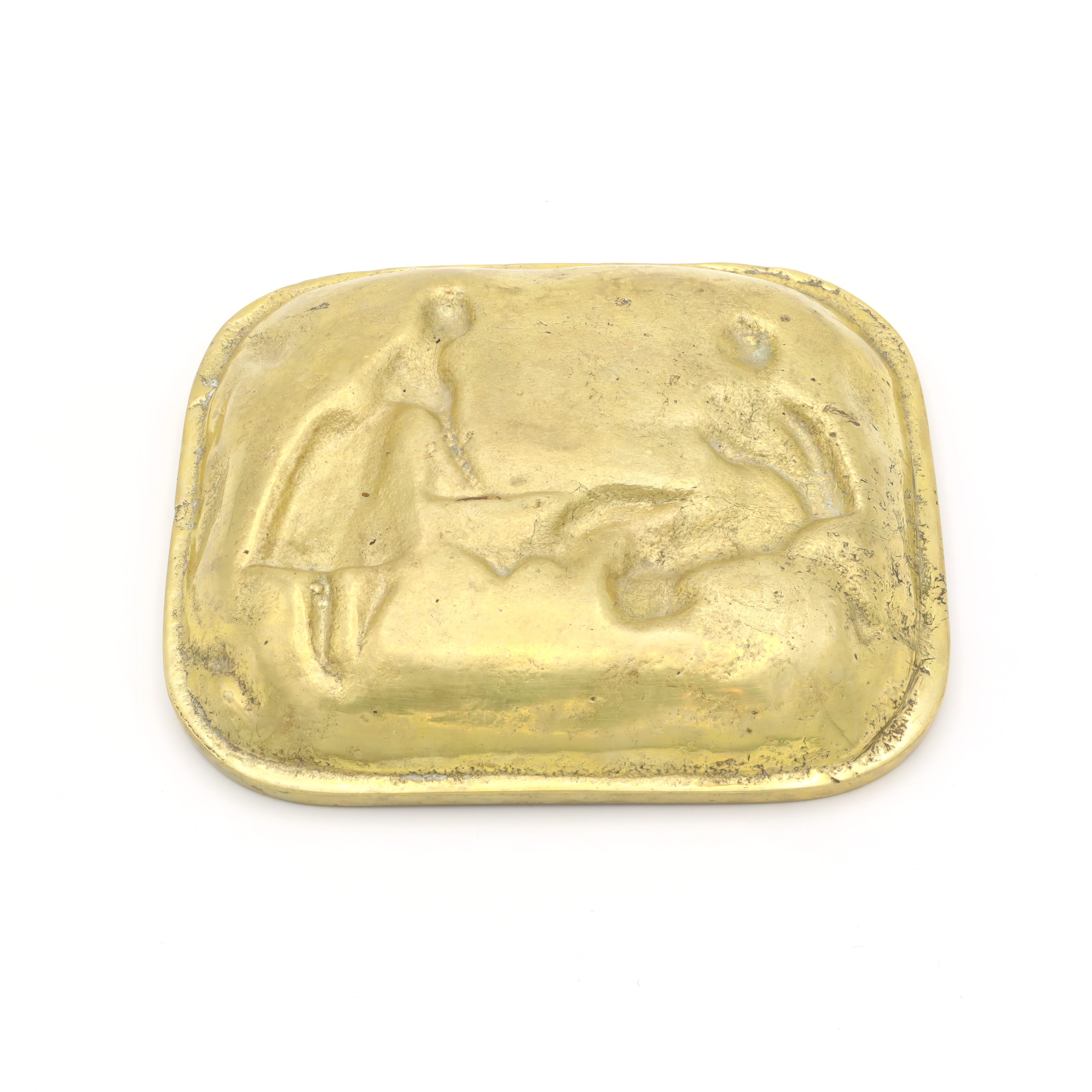 This item is a charming vintage brass valet tray, dating back to around 1970. Measuring about 1 inch in height, 4 inches wide, and 5 inches long, this piece was made as a catchall tray—perfect for holding jewelry, keys, coins, or other small everyday items. Its folk motif sets it apart, with a delightful raised scene that appears to show two people in rustic dress, surrounded by foliage. The design is packed with character and captures a sense of warmth and simplicity, making it fit beautifully in a mid-century, boho, or rustic home décor setting. The tray itself is made of solid brass, giving it a weighty, sturdy feel, and even after more than 50 years, it remains in very good plus condition, showing only minor signs of use.