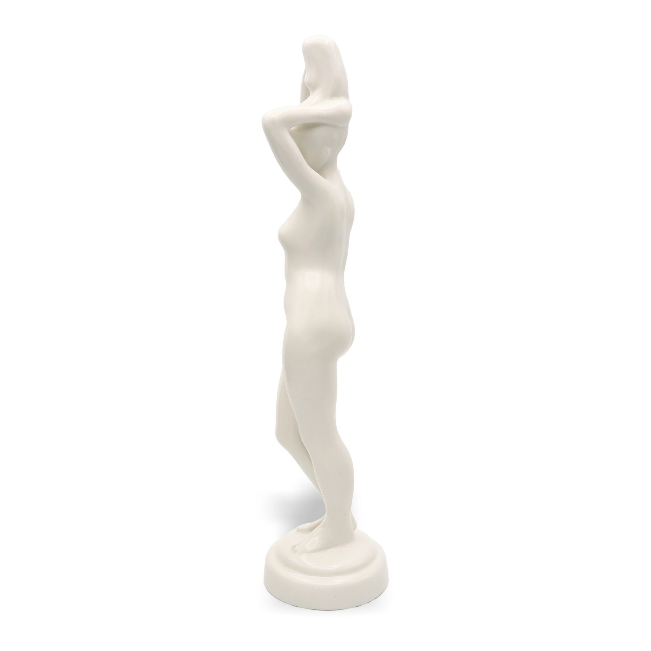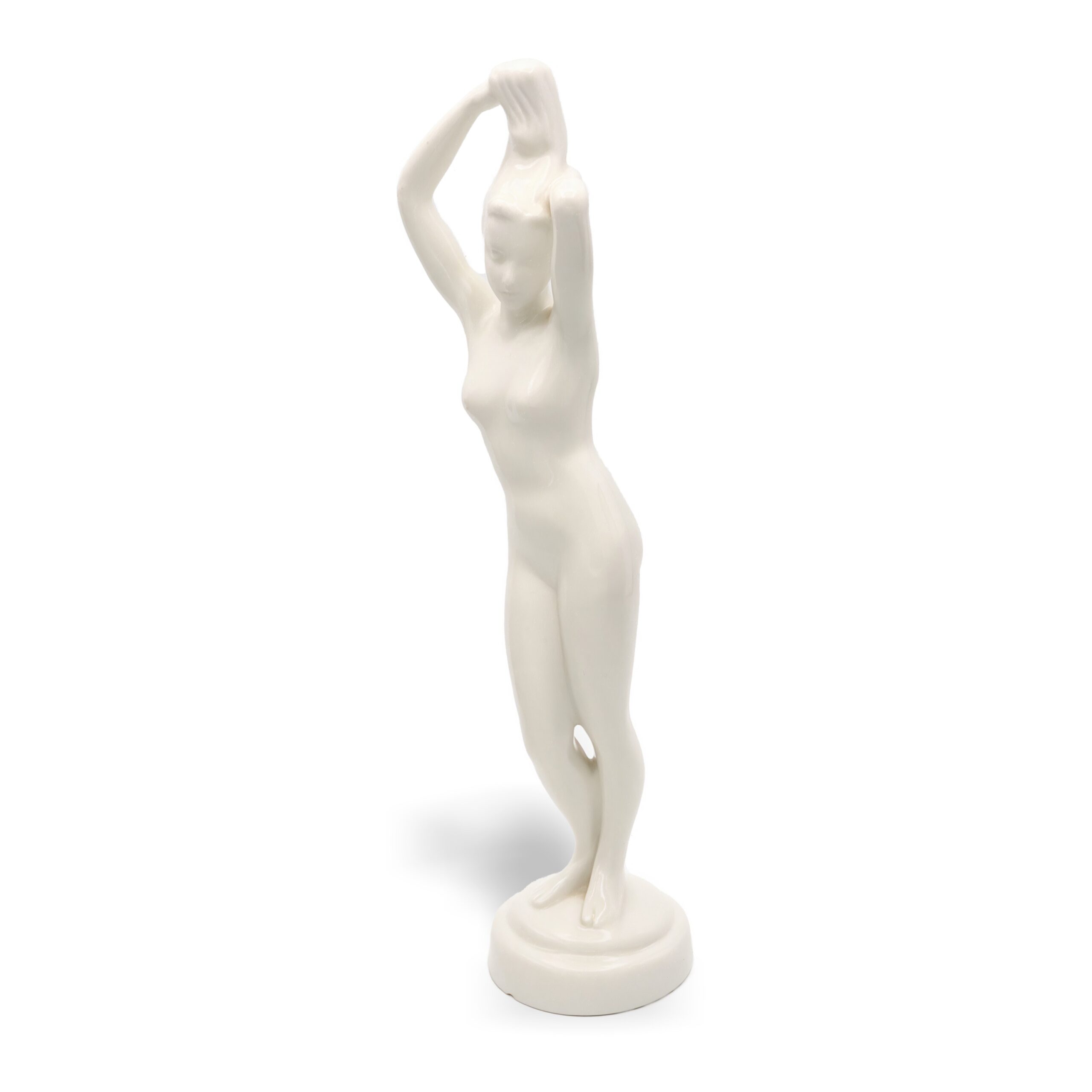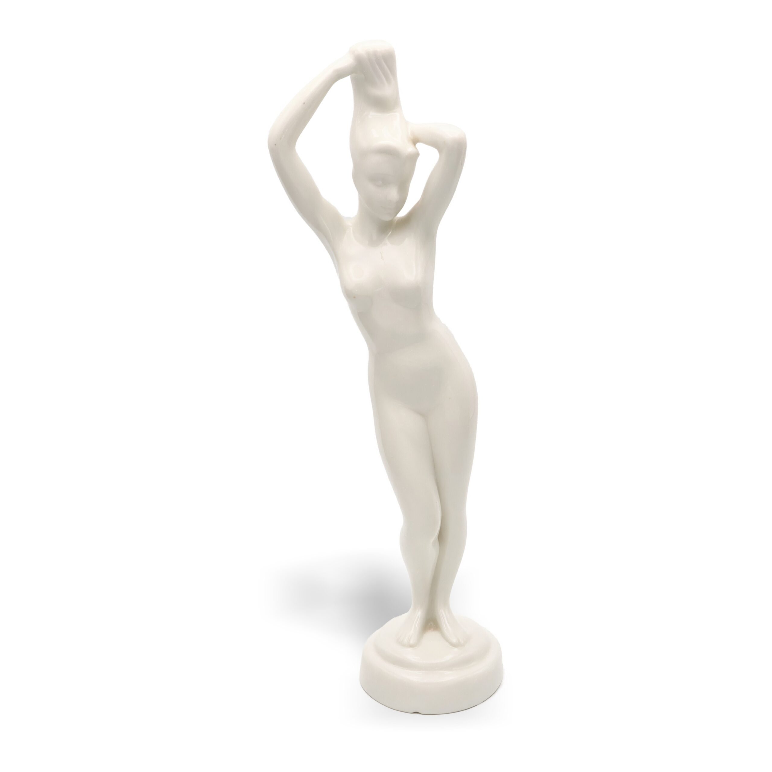 Introducing a beautifully crafted piece that is sure to add a touch of elegance to any space: an Aquincum Porcelain Nude Woman Standing. At a graceful 23cm tall, this stunning figurine is a masterpiece of pure white porcelain, exuding simplicity and beauty that will captivate the eye. The figure’s poised stance and fine details reflect an air of sophistication and subtlety. The overall condition is excellent, showing little to no signs of wear, making it a perfect addition for collectors or anyone who appreciates fine porcelain art.