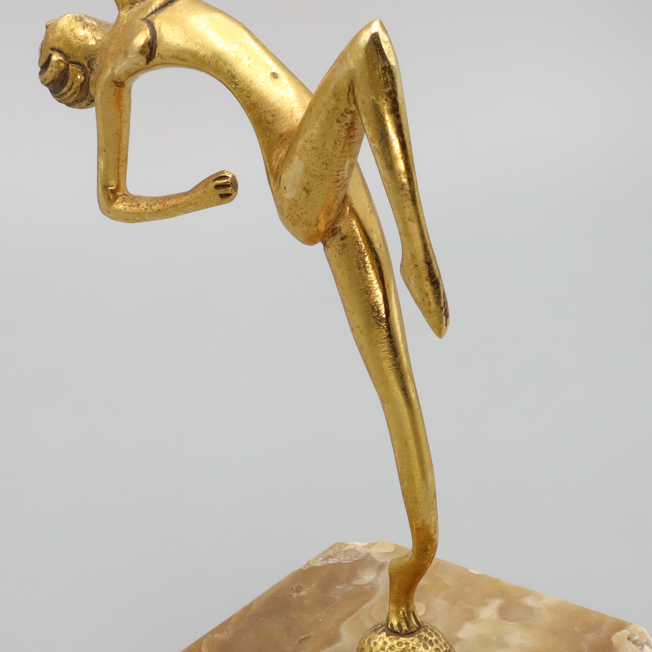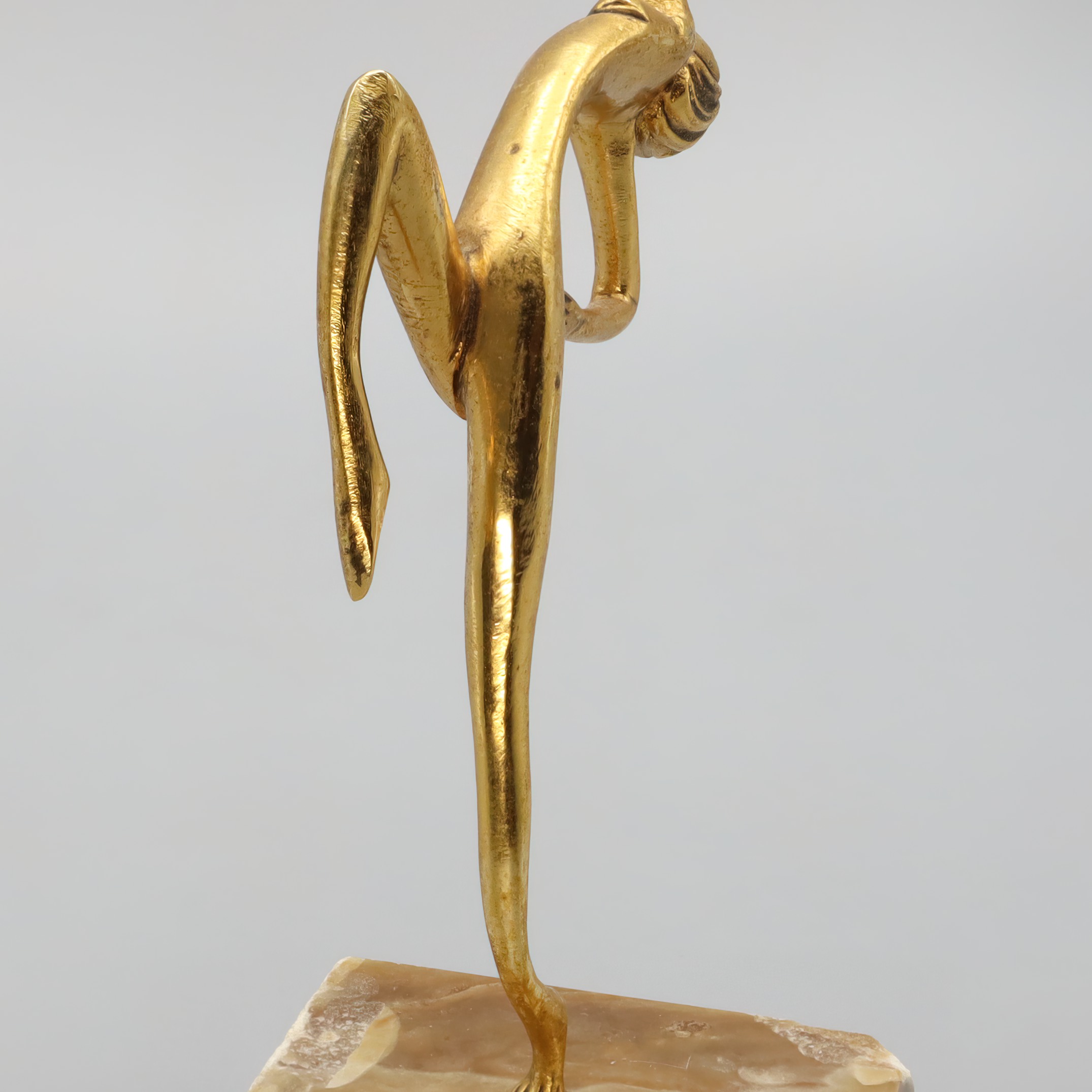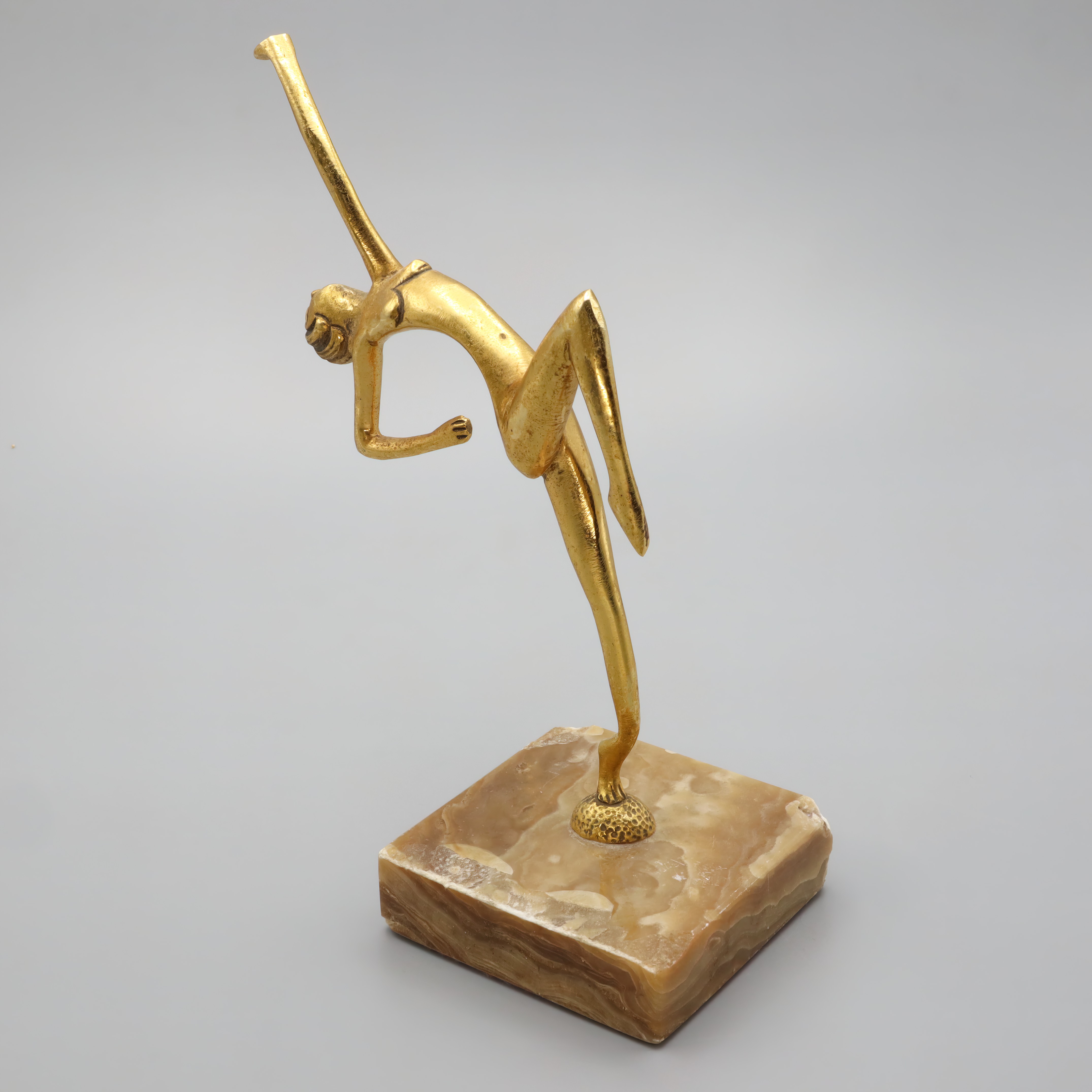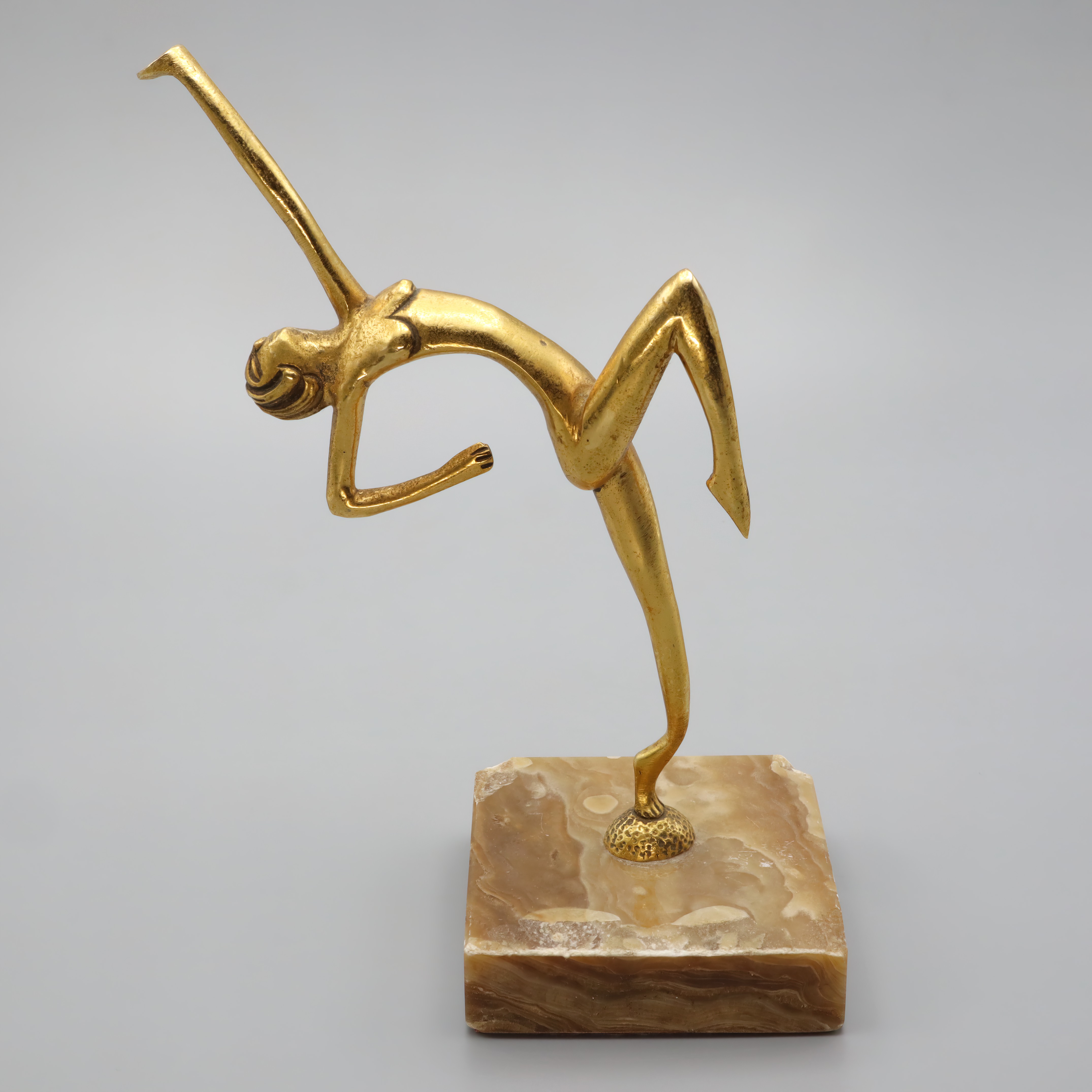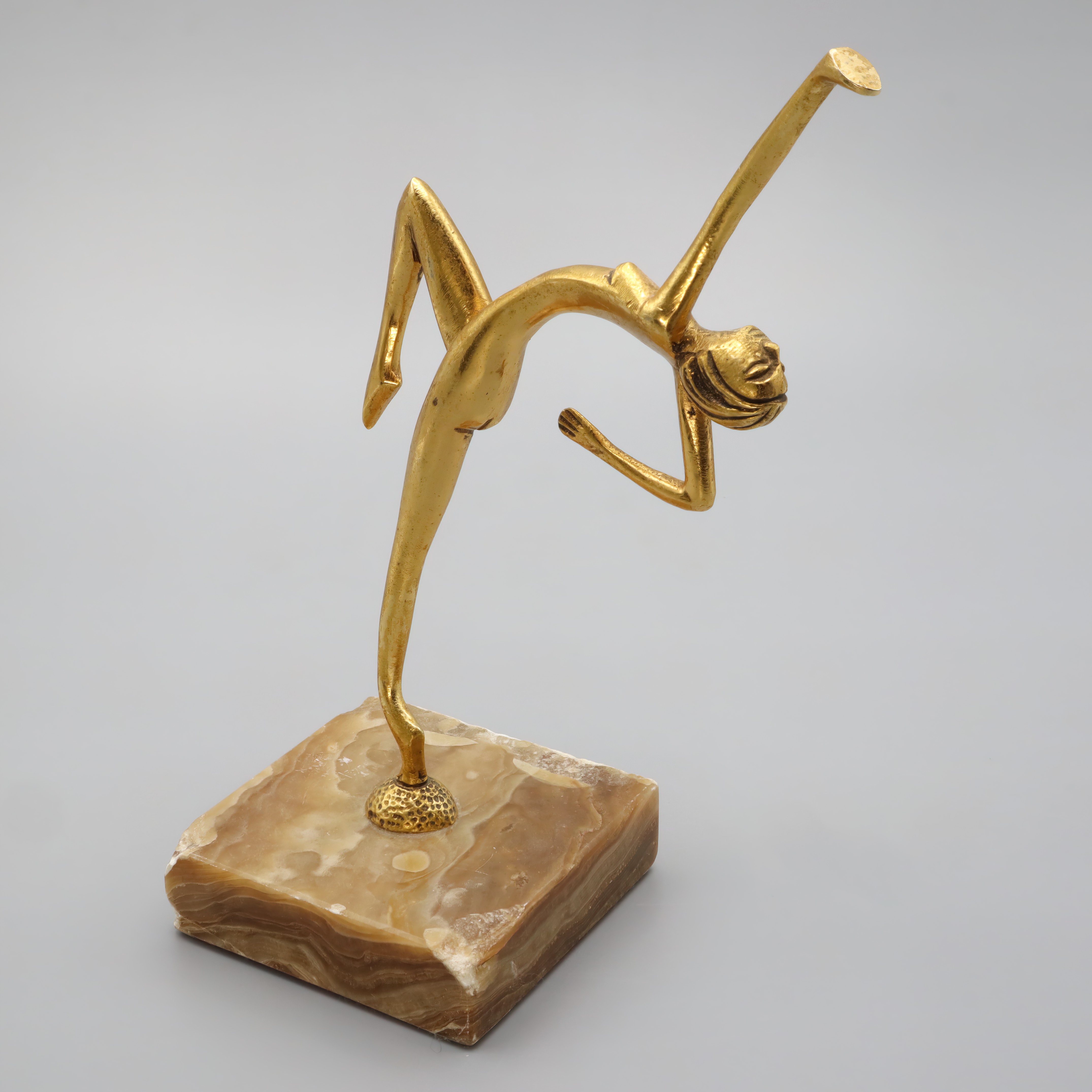 This elegant statue is a classic example of Art Deco design, featuring a bronze figurine of a dancer. Standing at 7.5 inches tall and crafted in 1930, it captures the graceful form of a woman in mid-dance. The statue’s sleek lines and stylized form are characteristic of the Art Deco era, a time when artists and designers embraced modernity and sophistication. Despite being nearly a century old, this piece is in near mint condition, making it a rare find for collectors and enthusiasts alike. Its small footprint, with a width of 3 inches and a length of 5 inches, allows it to fit easily into any display or decor setting, adding a touch of elegance and history.
