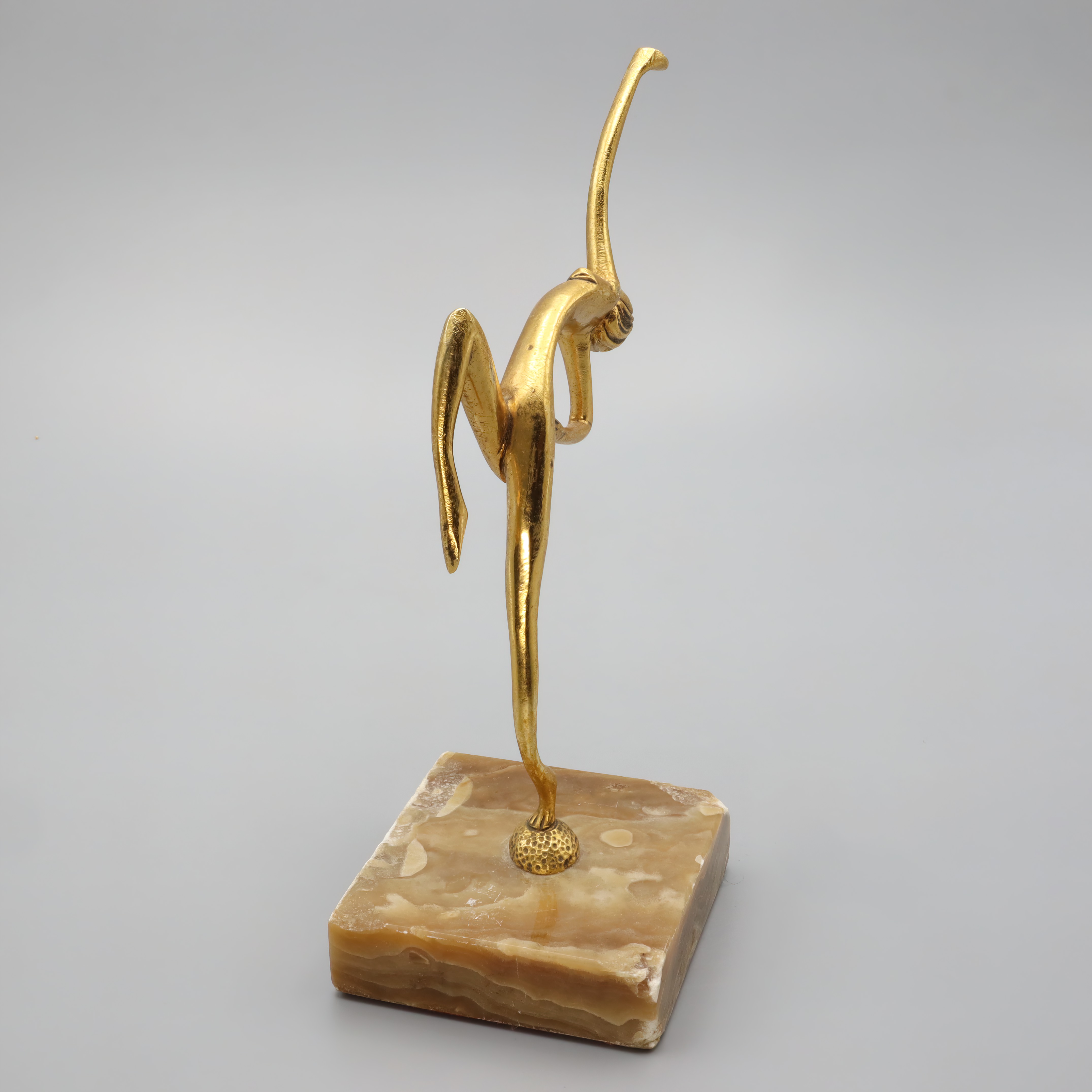 This elegant statue is a classic example of Art Deco design, featuring a bronze figurine of a dancer. Standing at 7.5 inches tall and crafted…