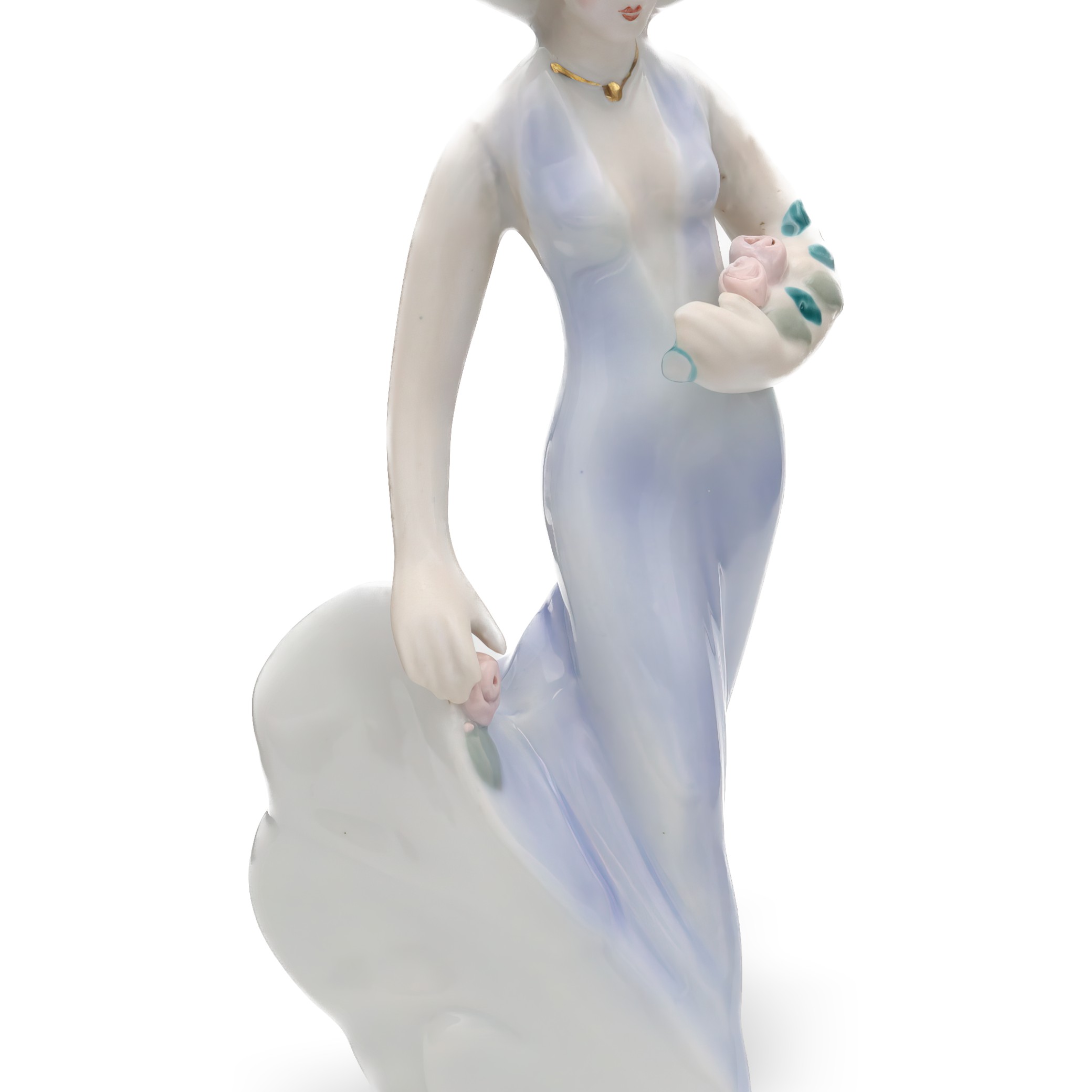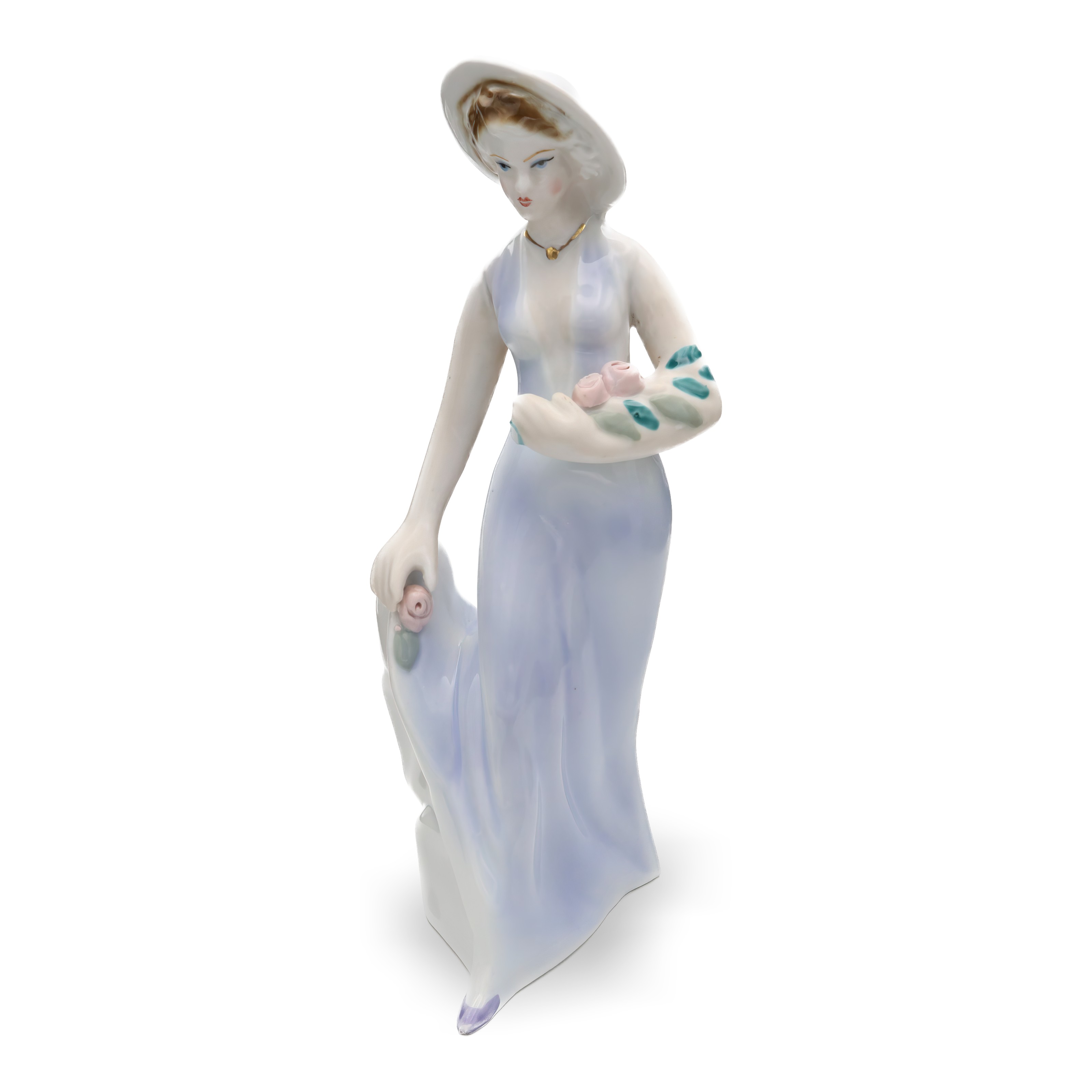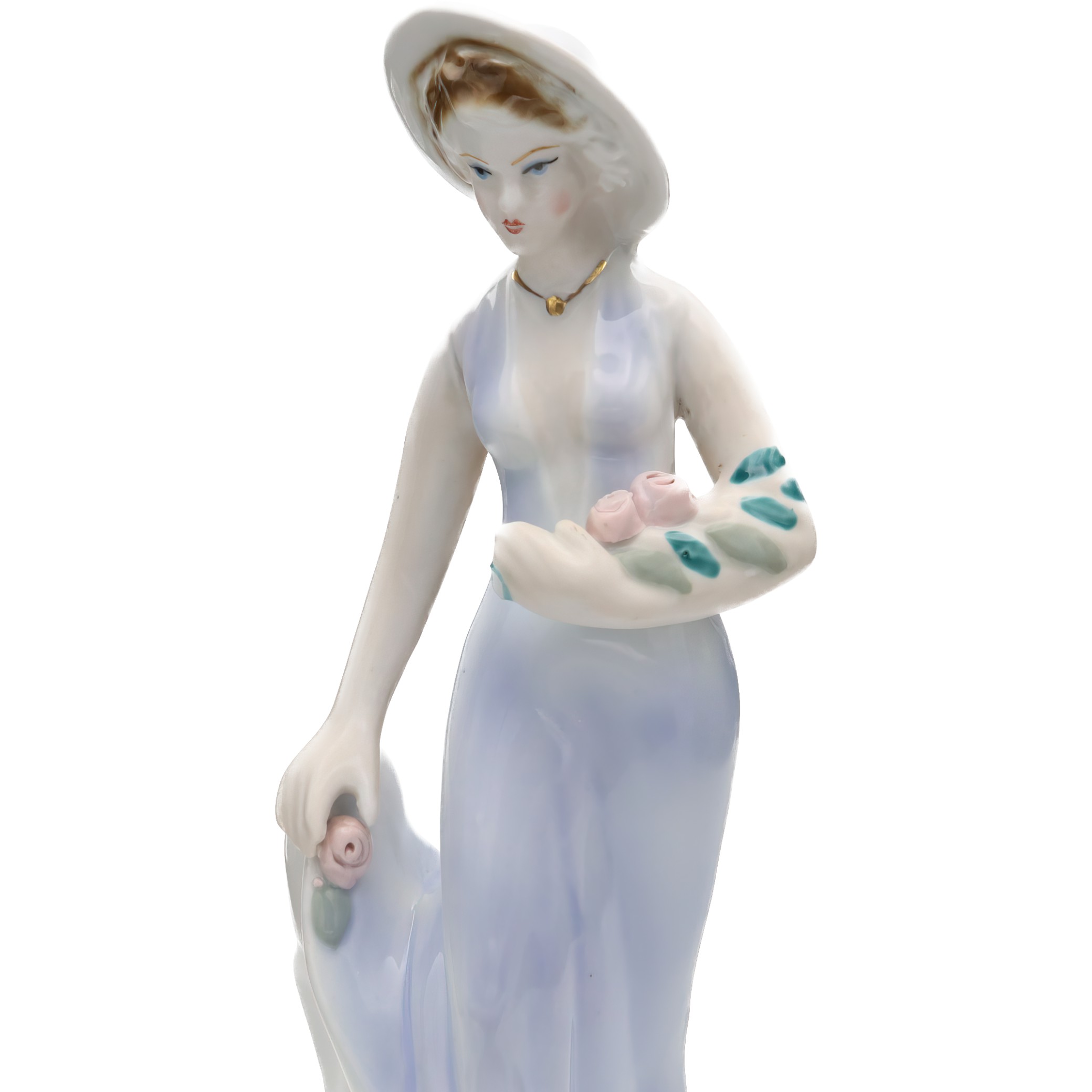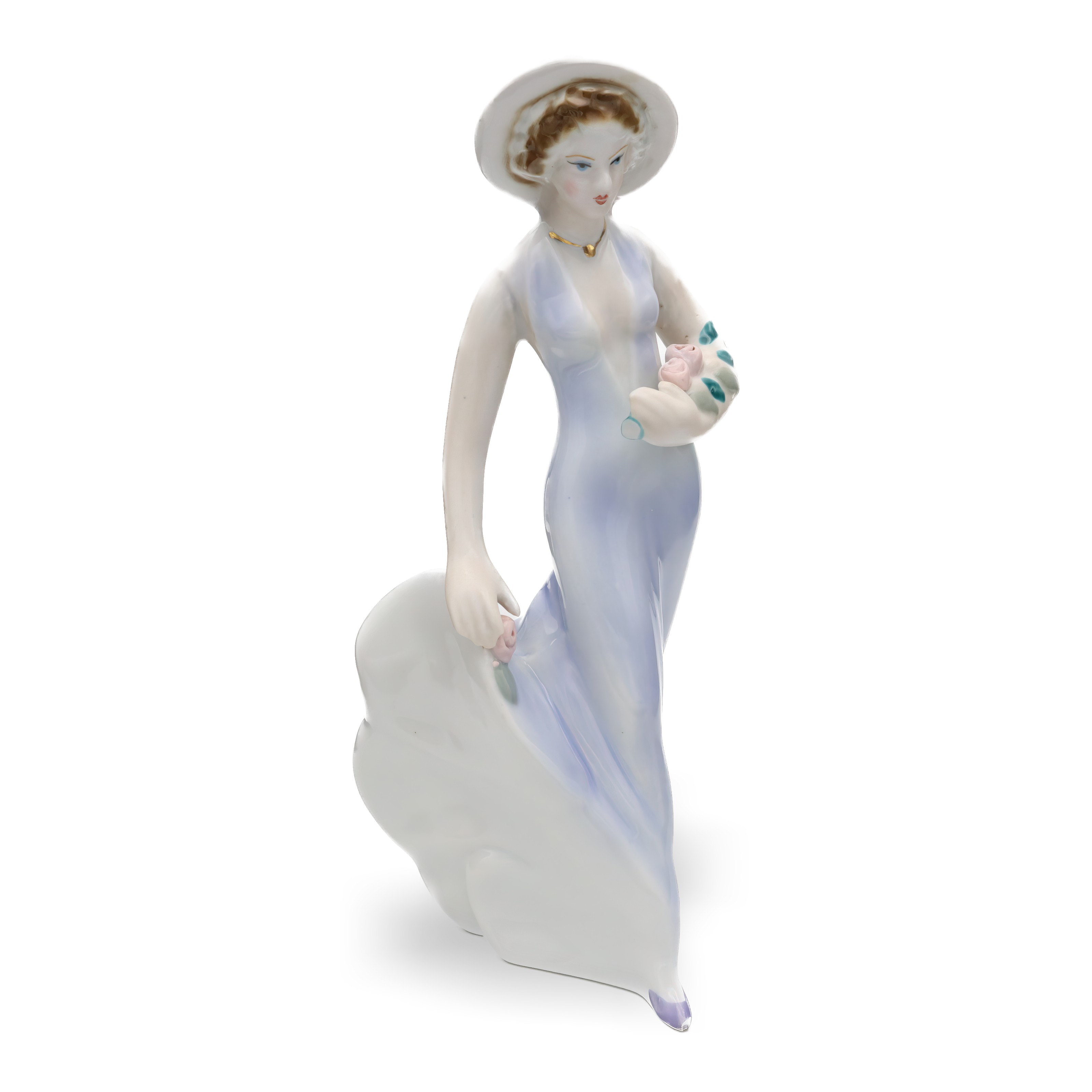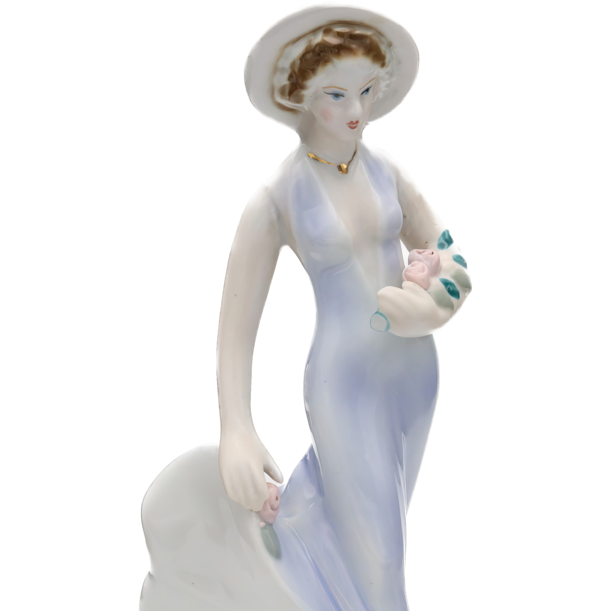 This graceful Art Deco Woman with Flowers figurine captures the elegance and style of the 1920s, even though it was crafted in the 1960s. Standing at 8.5 inches tall and 4 inches wide, this delicate statue beautifully combines the flowing lines and intricate detailing associated with Art Deco design. The figurine depicts a sophisticated woman, carrying flowers, dressed in a long, flowing gown and adorned with a wide-brimmed hat. Its near-mint condition suggests it has been well-preserved over the years, making it a rare find for collectors. The soft pastel hues and the serene expression on the woman’s face add an air of calmness and grace to any home decor.