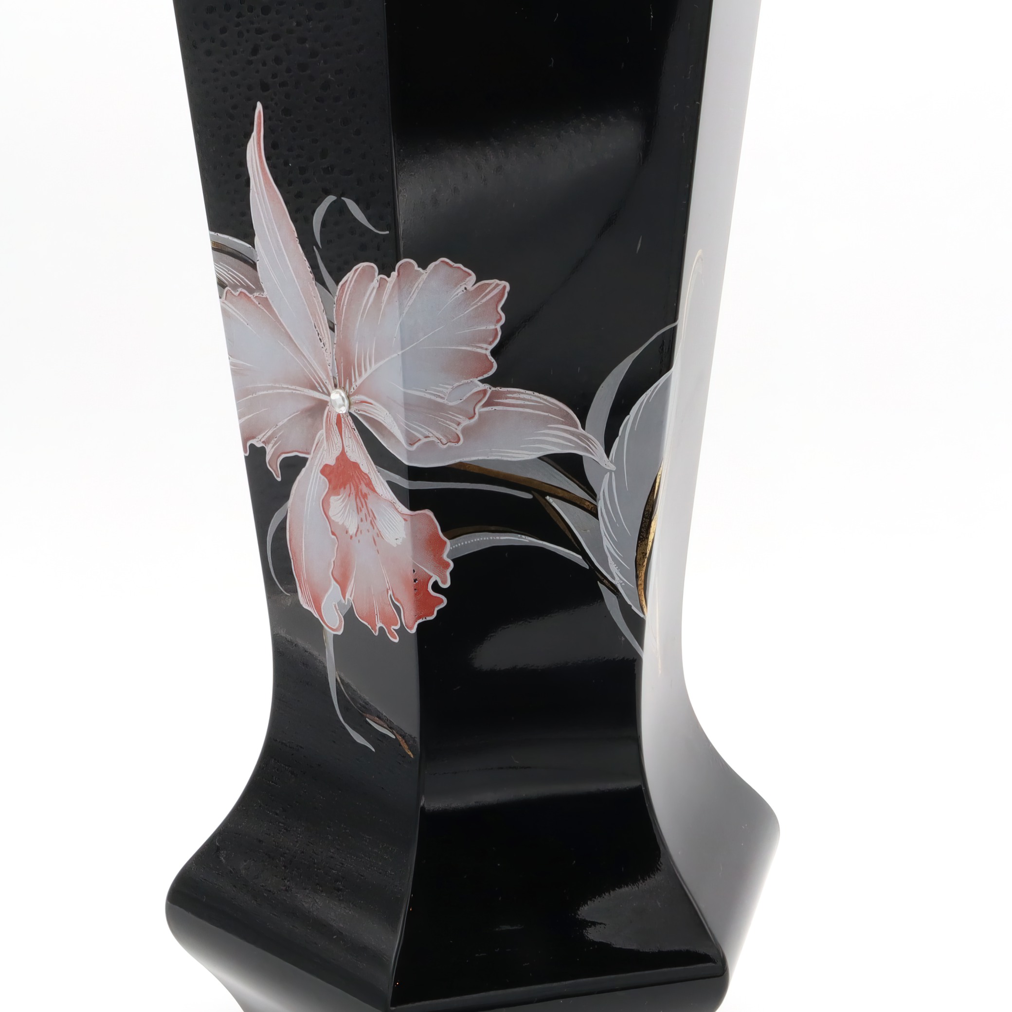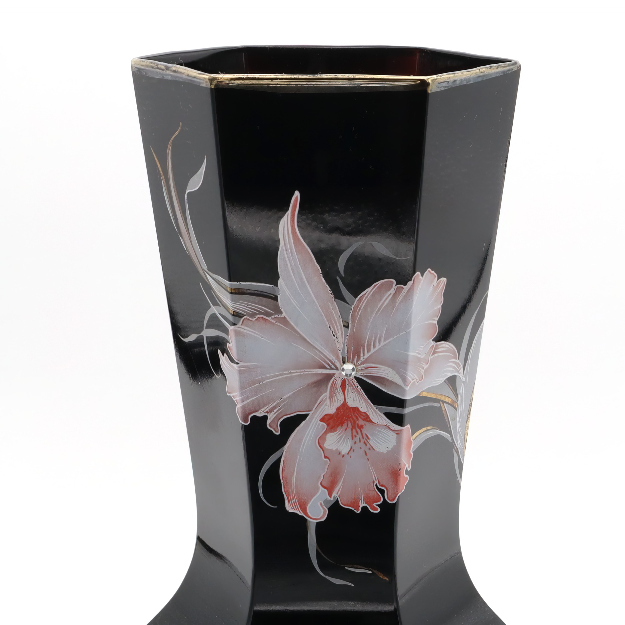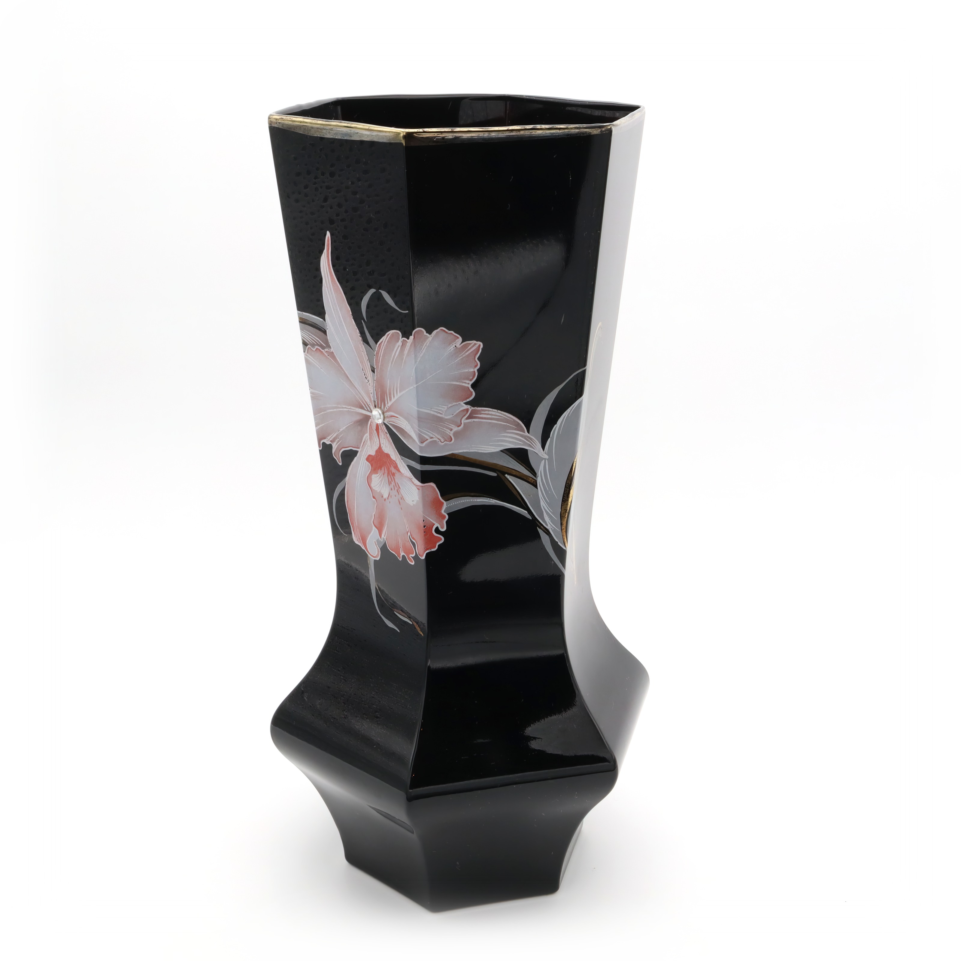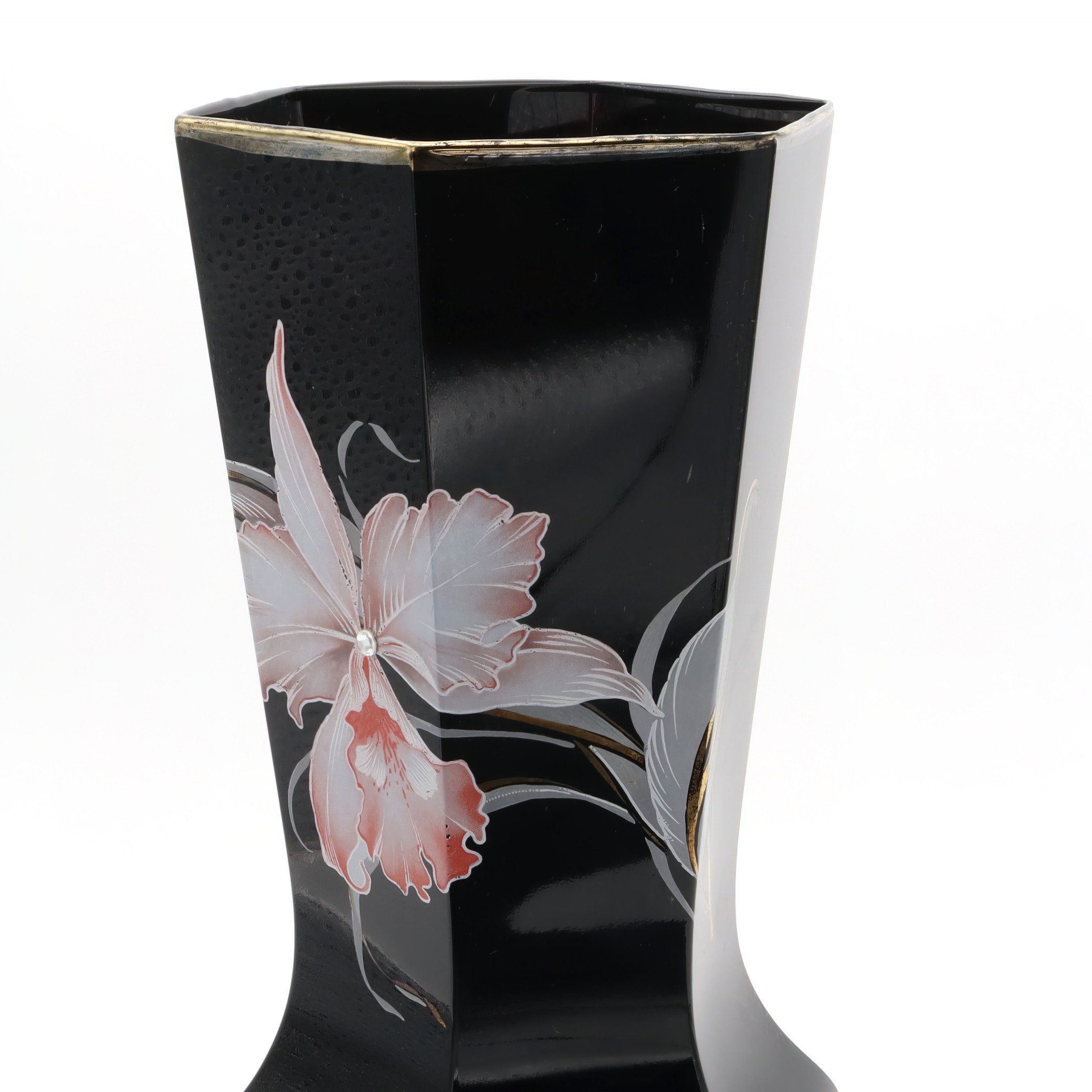 This striking piece is a black Murano vase, notable for its hexagonal shape and captivating design. Handmade in 1980, this vintage collectible is a testament to Italian craftsmanship. The vase’s sleek black body serves as a perfect backdrop for the delicate floral engravings that adorn it. Standing at 10 inches tall with a diameter of 5 inches, it is an impressive yet manageable size for display. Its near mint condition suggests it has been well cared for over the years, making it a rare find for collectors and enthusiasts of Murano glass. With its mid-century modern flair, it adds a touch of sophistication to any home, making it both a decorative piece and a conversation starter.
