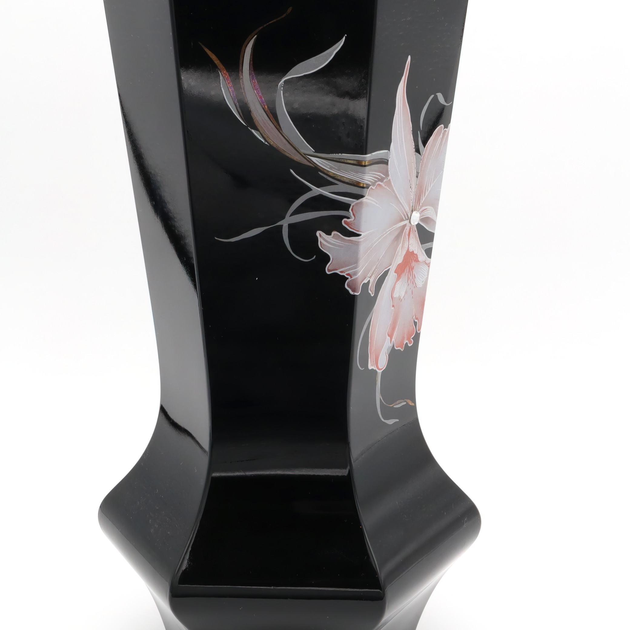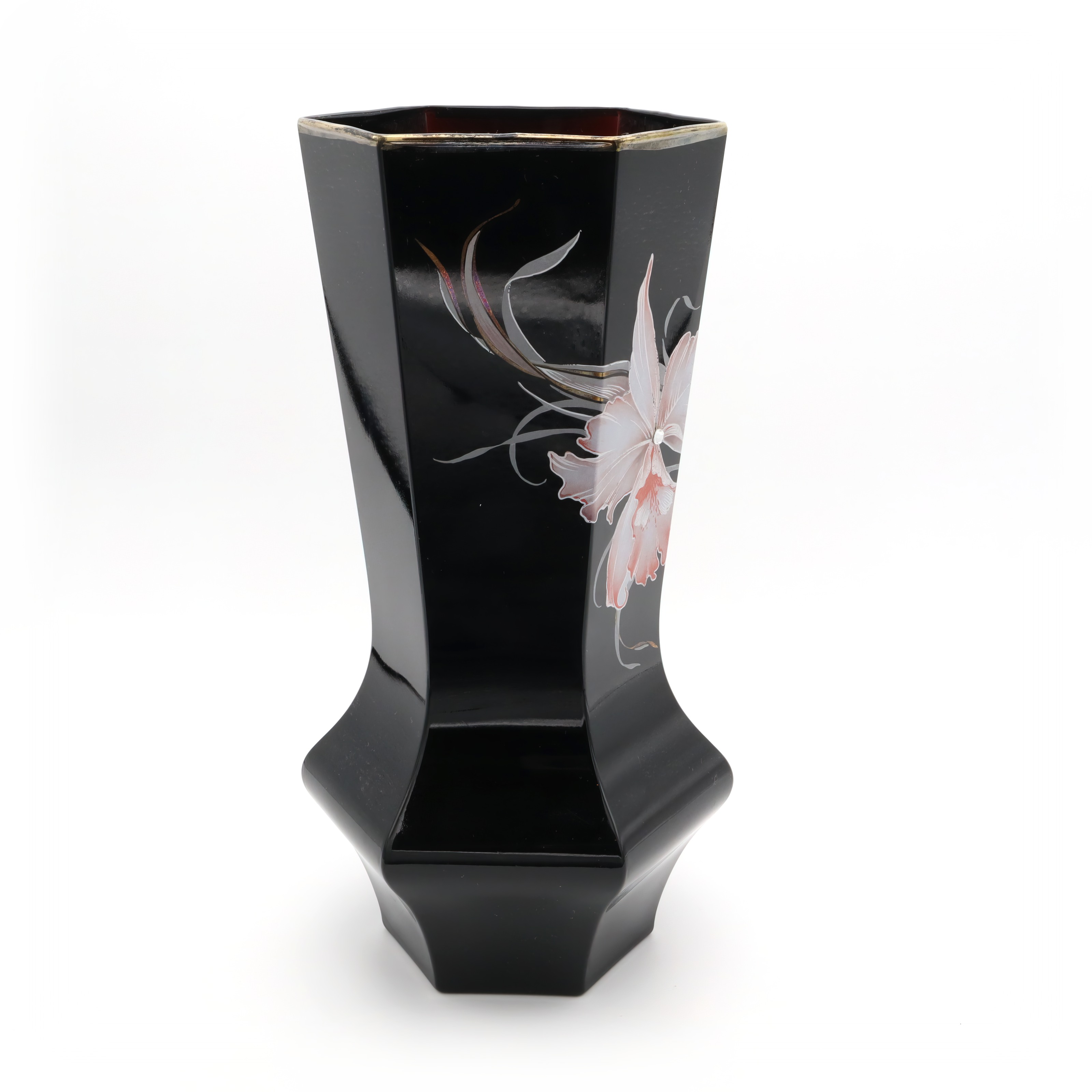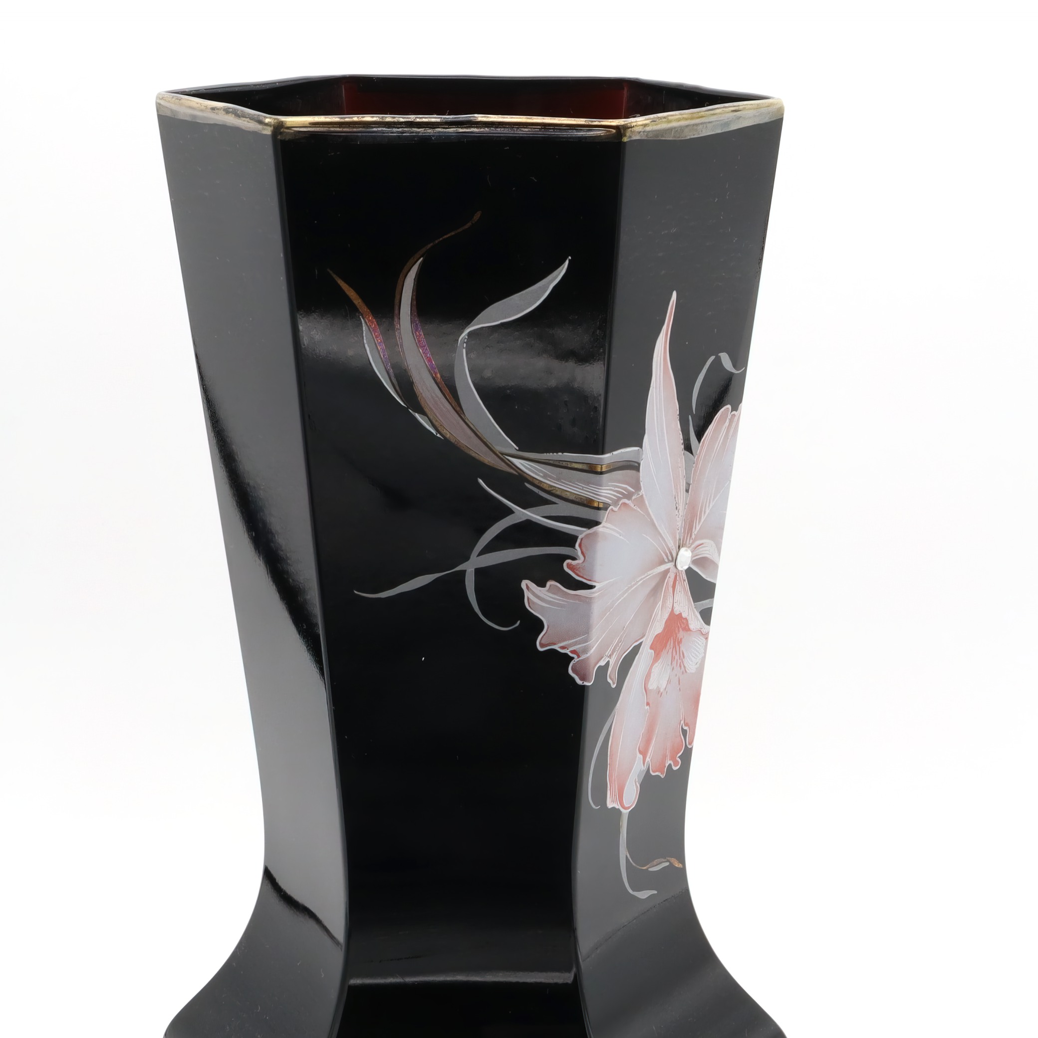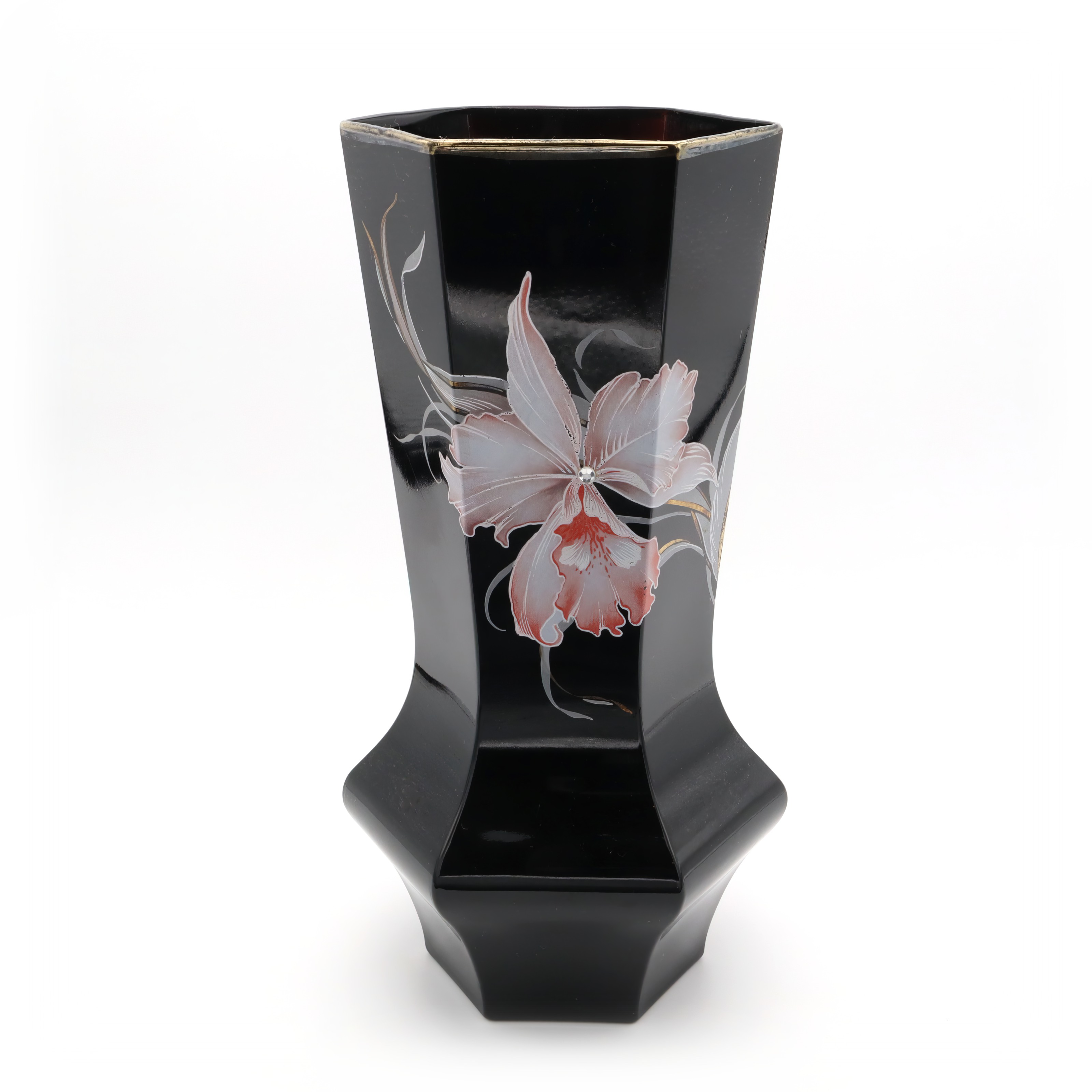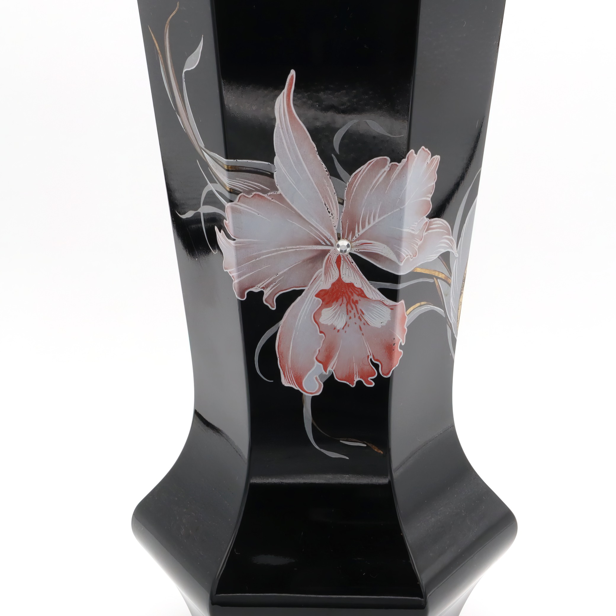 This striking piece is a black Murano vase, notable for its hexagonal shape and captivating design. Handmade in 1980, this vintage collectible is a testament to Italian craftsmanship. The vase’s sleek black body serves as a perfect backdrop for the delicate floral engravings that adorn it. Standing at 10 inches tall with a diameter of 5 inches, it is an impressive yet manageable size for display. Its near mint condition suggests it has been well cared for over the years, making it a rare find for collectors and enthusiasts of Murano glass. With its mid-century modern flair, it adds a touch of sophistication to any home, making it both a decorative piece and a conversation starter.