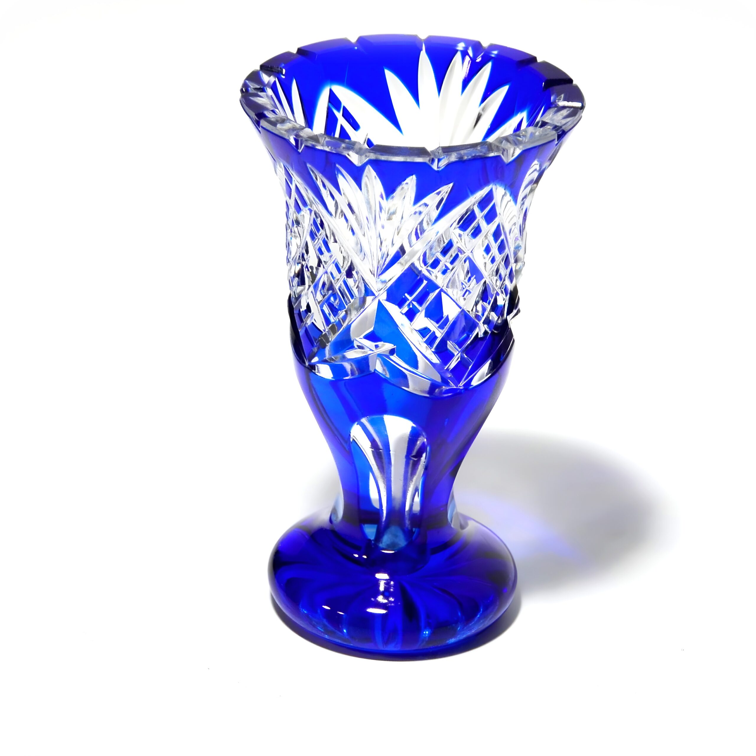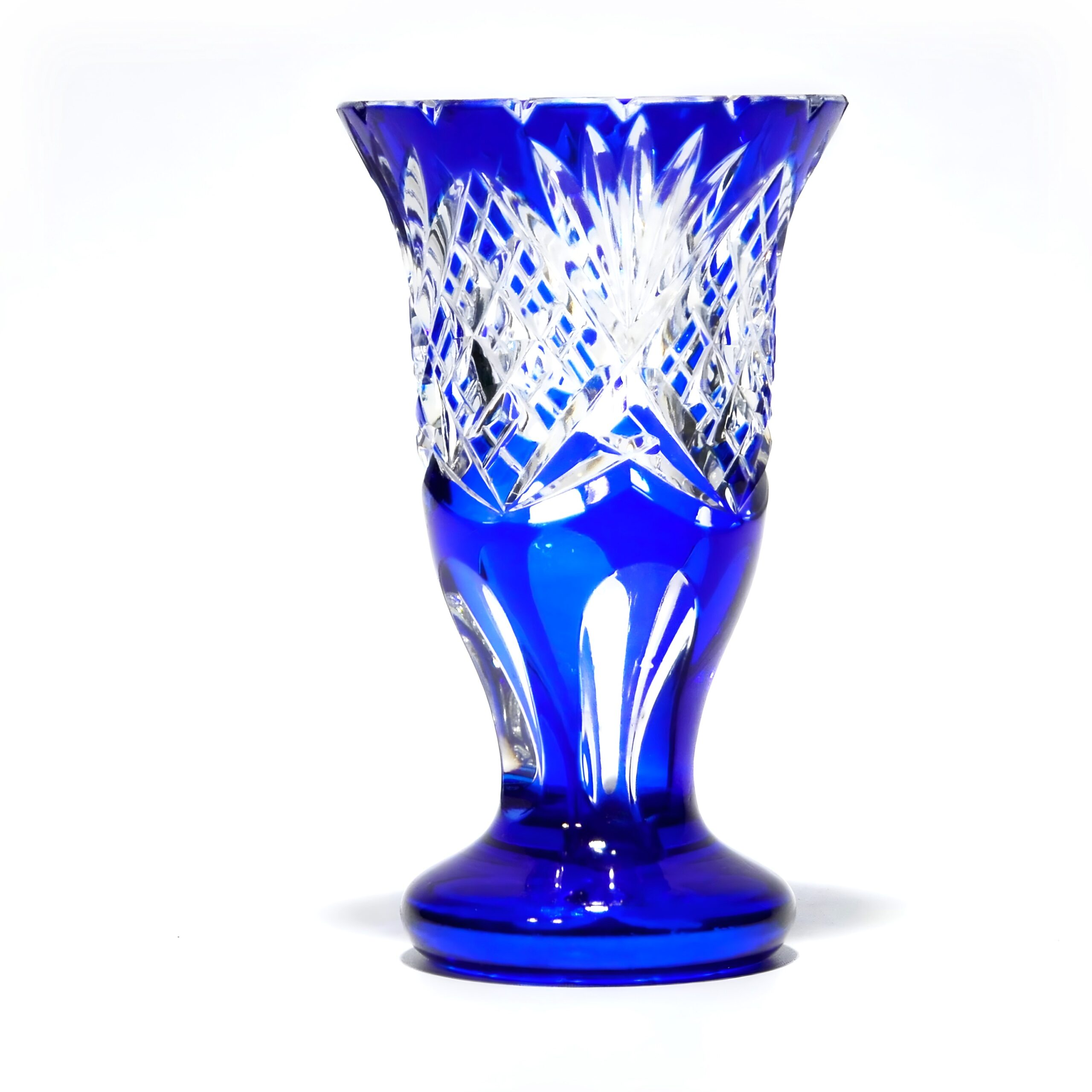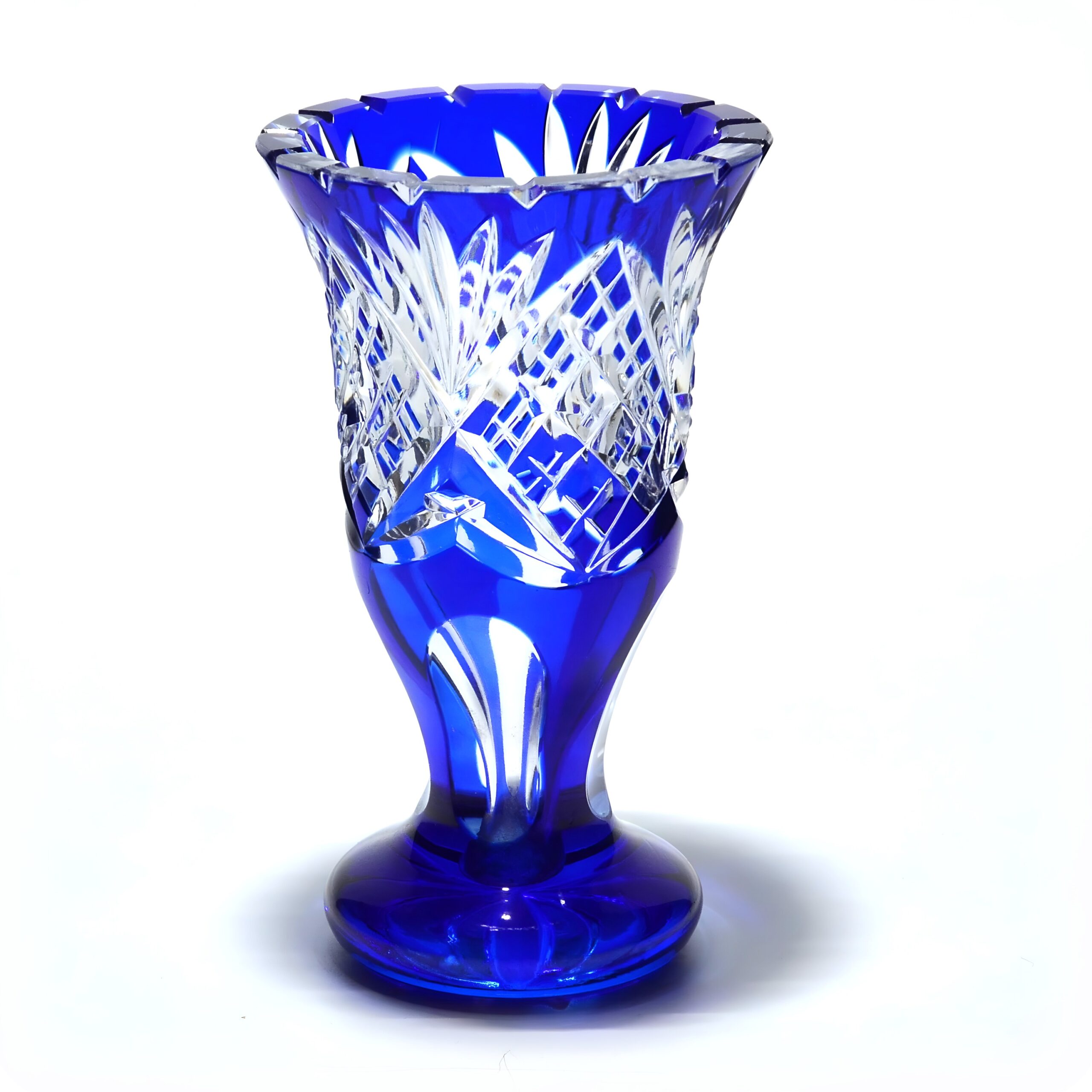 This blue lead crystal vase is a stunning example of vintage craftsmanship, dating back to around 1960. Standing at 5.5 inches tall with a diameter of 3.5 inches, it’s a compact yet eye-catching piece. The vibrant blue hue of the crystal, combined with the intricate geometric cut glass pattern, makes it a standout decorative accent for any home. The vase is in near-mint condition, which is quite remarkable given its age. This suggests it has been well cared for over the decades, adding to its allure and value as a collectible item. Not only is it a functional piece for holding flowers, but it also serves as a conversation starter, with its unique blend of color and design capturing the attention of anyone who sees it.