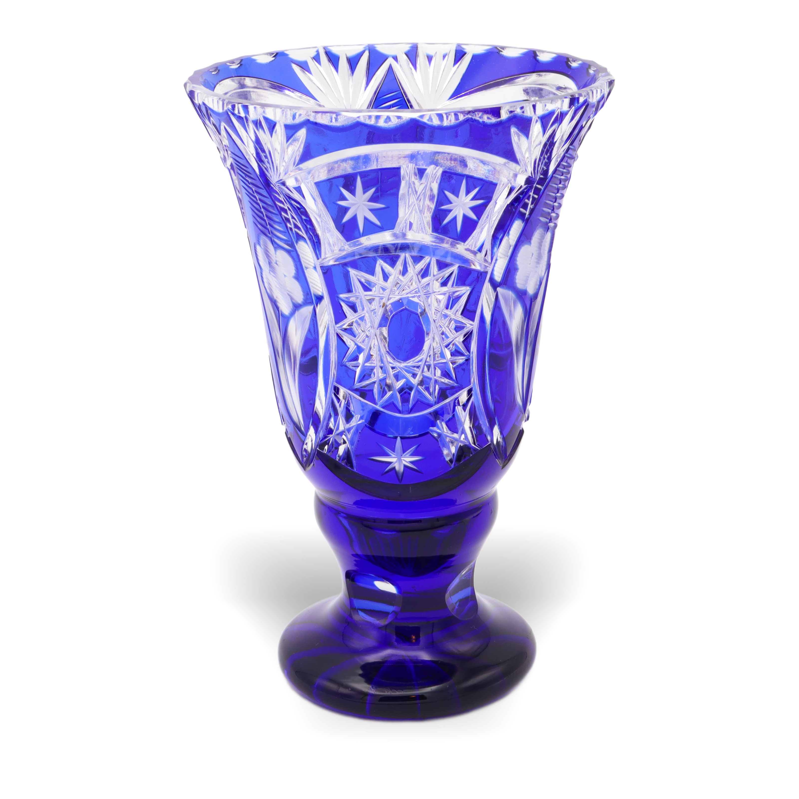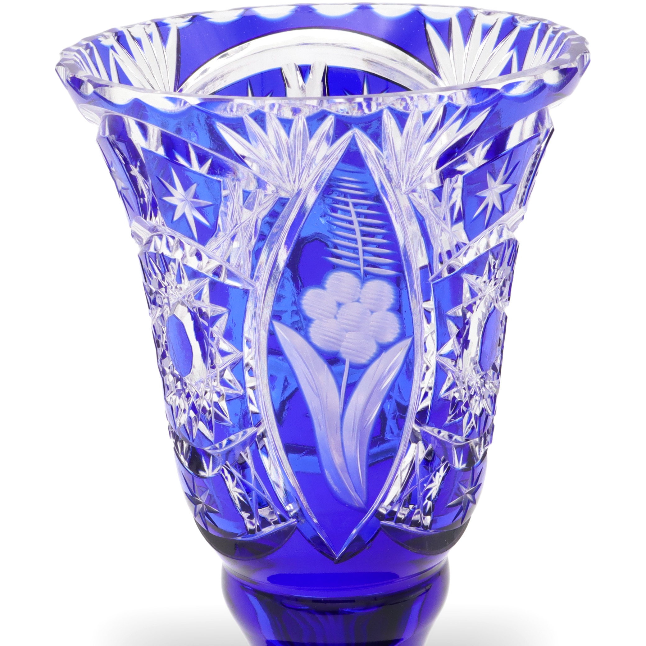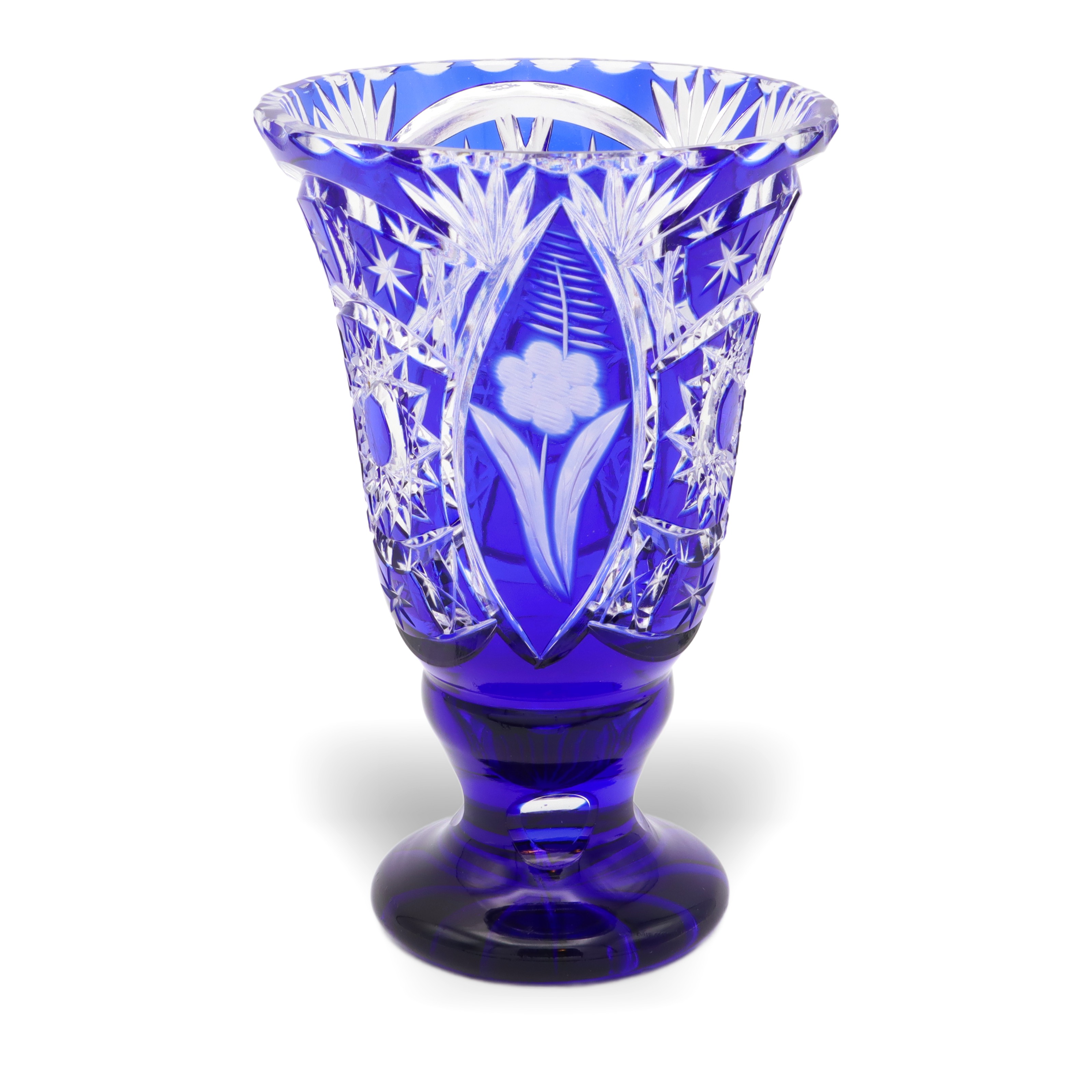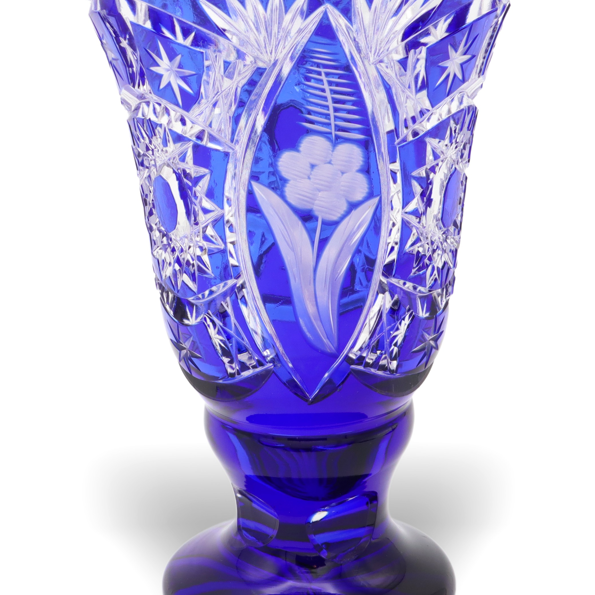 This striking piece is a Bohemia crystal glass hand-cut blue flower vase, crafted around 1960. The deep blue color and intricate hand-cut…