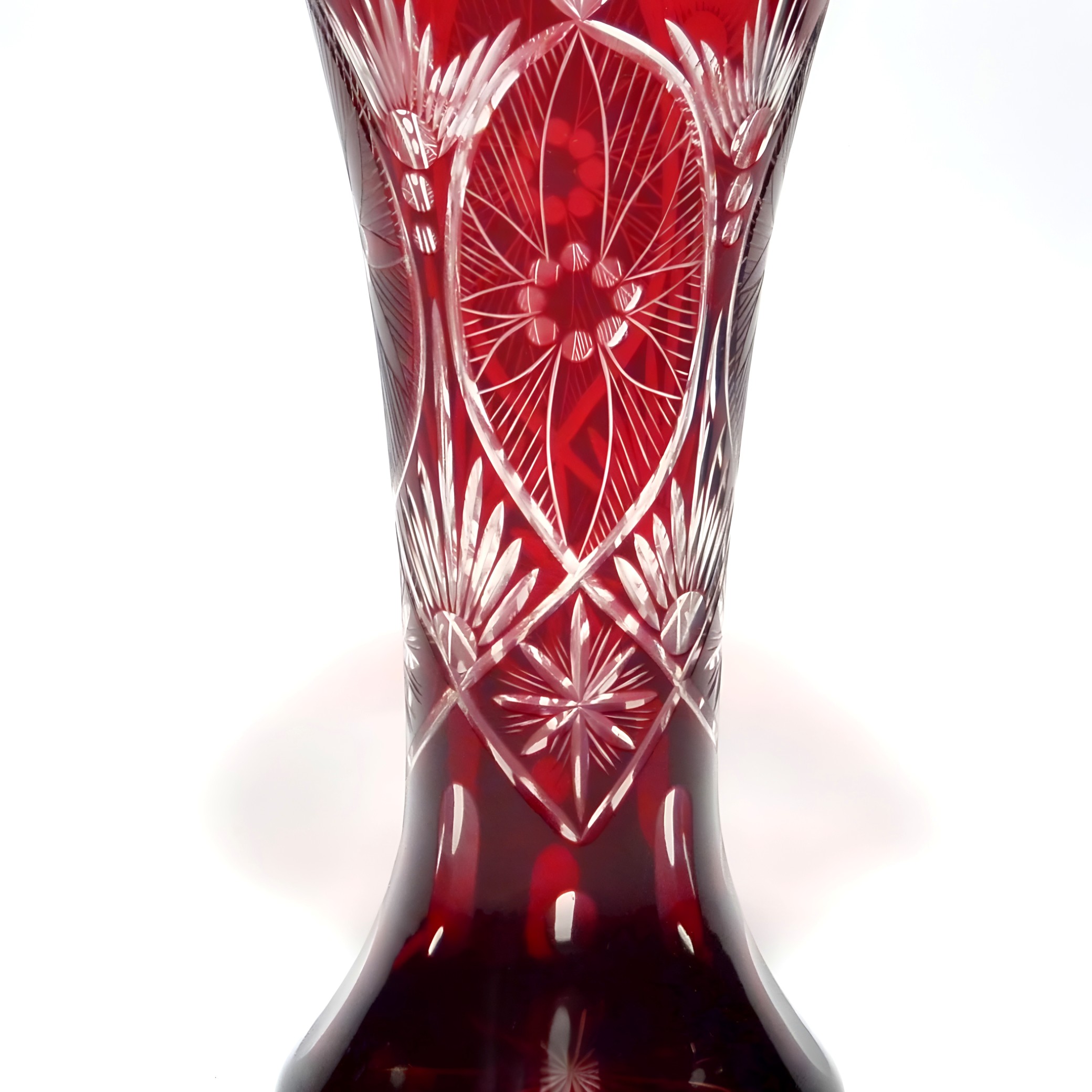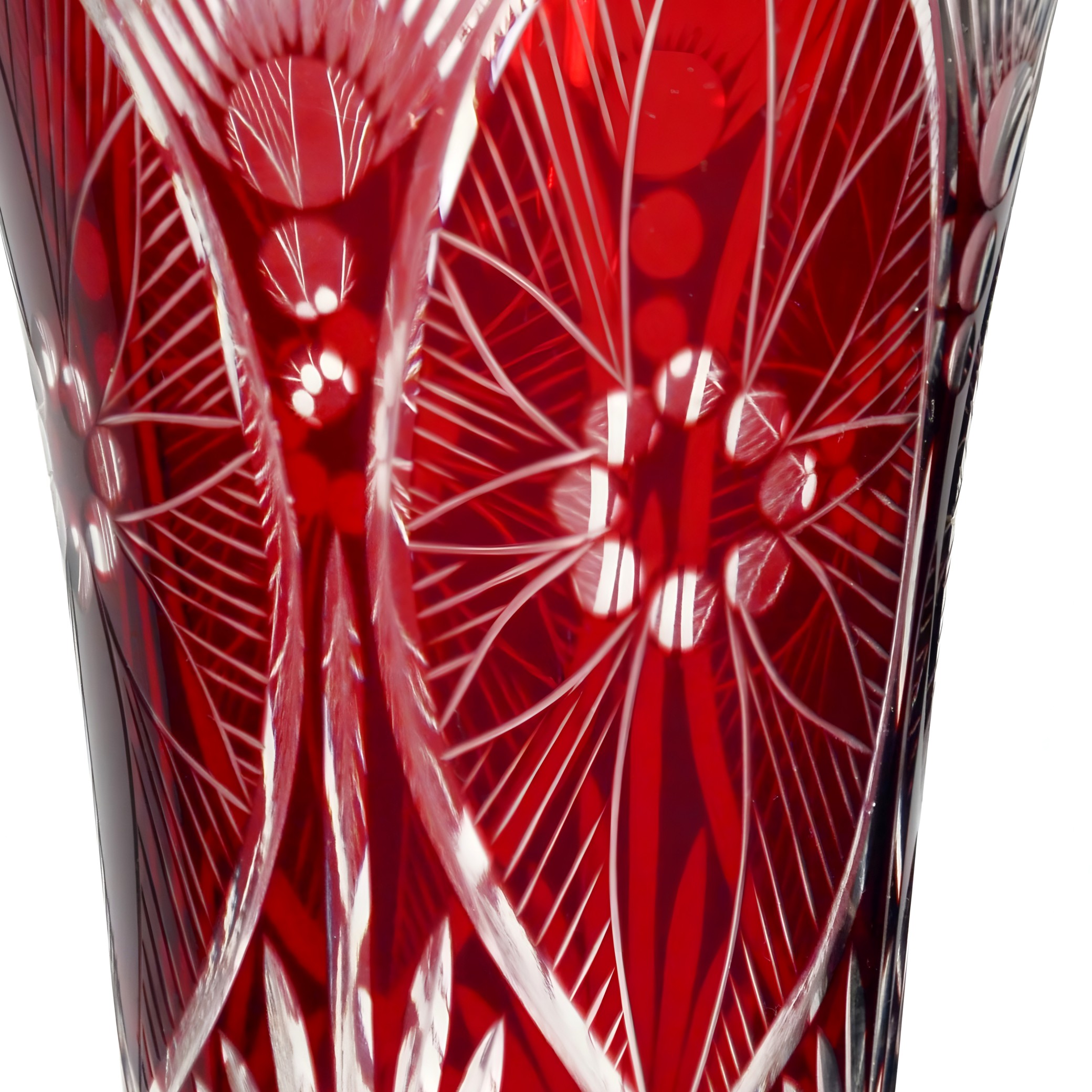 Bohemia crystal originates from the Czech Republic, a region renowned for its high-quality glassmaking dating back centuries. The vases and other glassware pieces from this area are celebrated for their intricate designs and exceptional clarity, often featuring individual cuts and etchings that showcase the artistry involved. The 1980s were an interesting period for Bohemia glass, with makers drawing inspiration from earlier Art Deco and Art Nouveau styles while incorporating more contemporary aesthetics. This particular vase reflects that blend of tradition and modernity, with its deep red hue and ornate patterns.