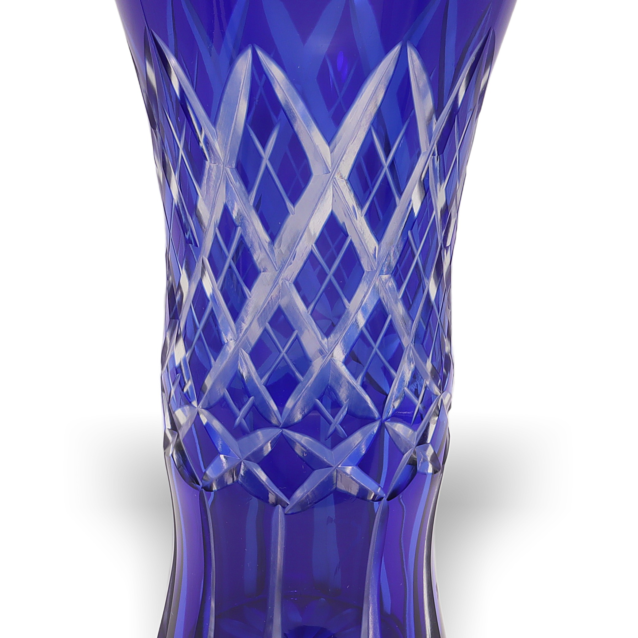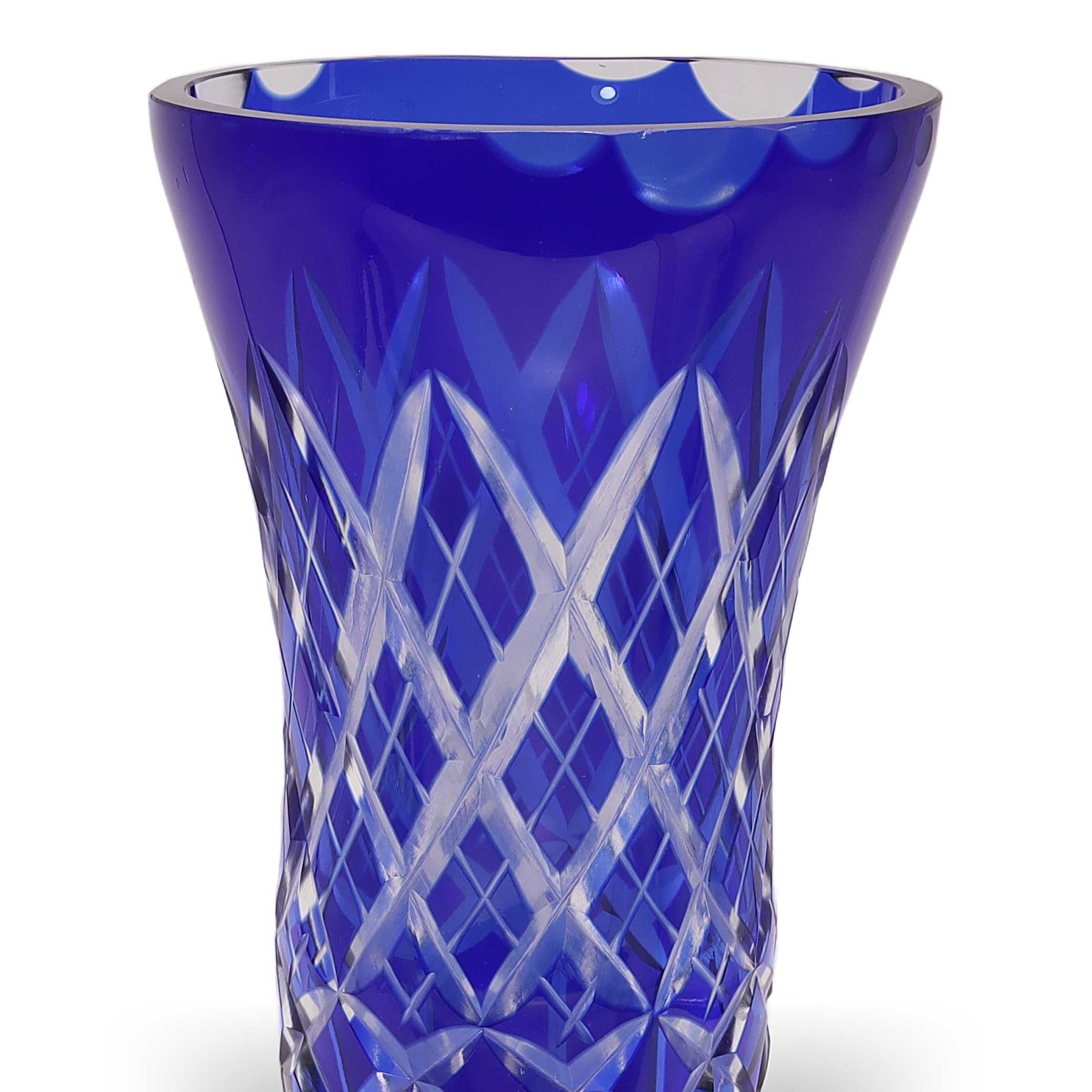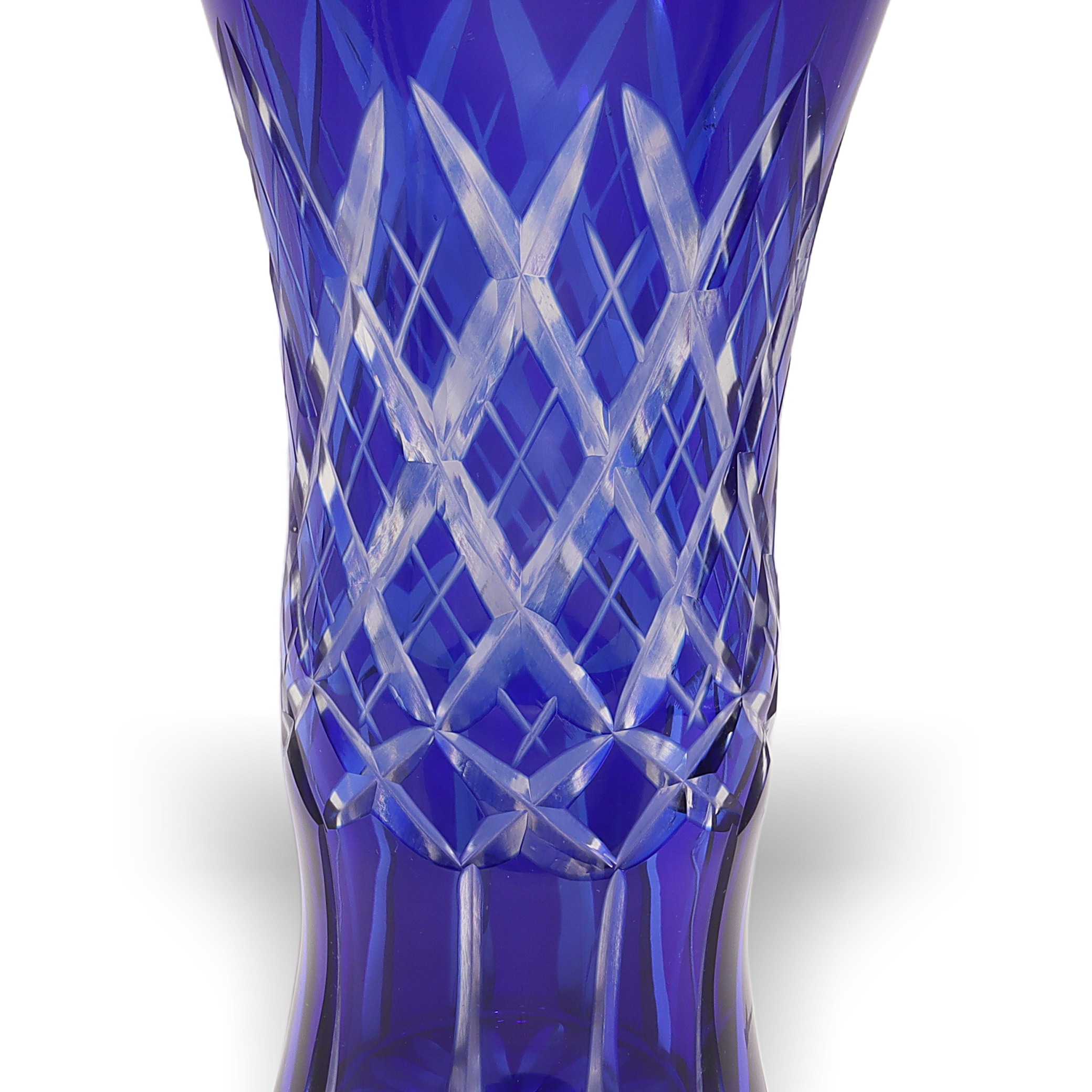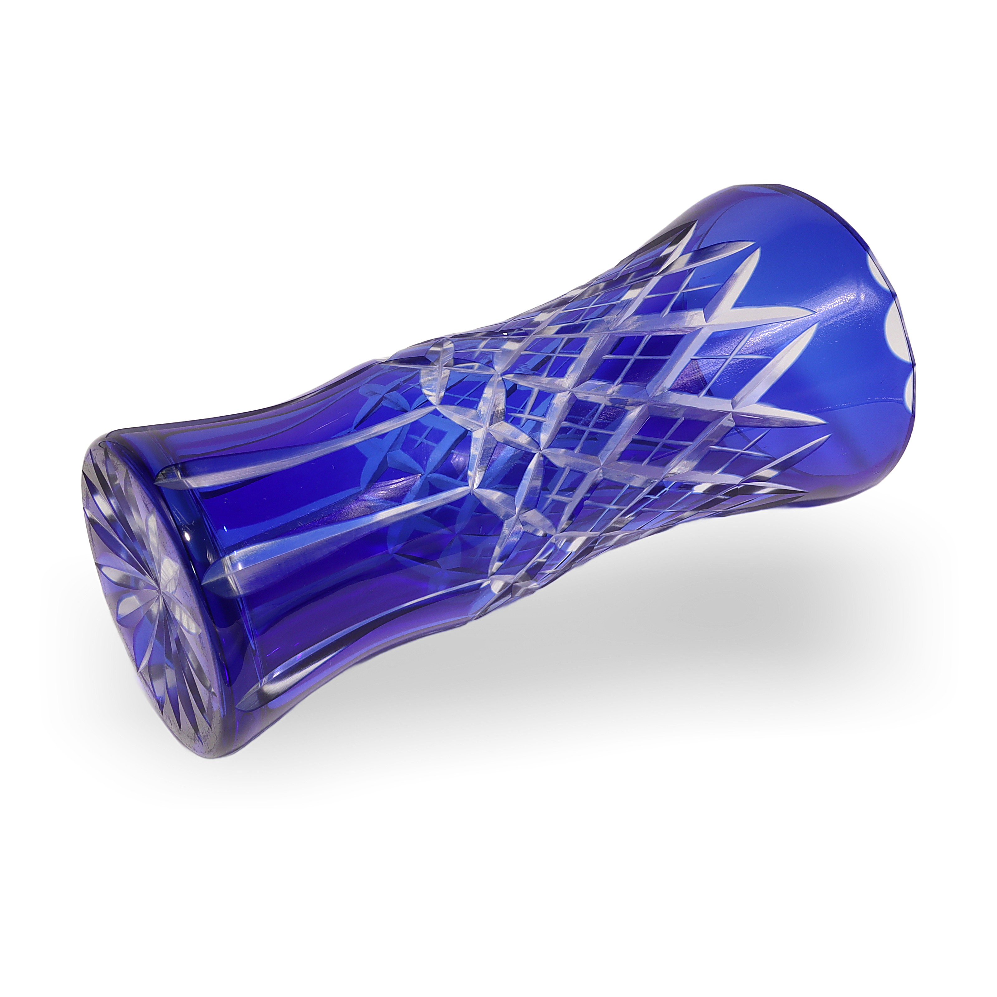 Bohemian glass, sometimes referred to as Bohemia Crystal, has been renowned for centuries as some of the world’s highest-quality hand-cut crystal. Originating from the regions that are now part of the Czech Republic, Bohemian glassmakers became especially well-known during the Art Deco period for their bold colors and sharp geometric patterns. Cobalt blue vases like this one were particularly popular because the rich color stood out, and the intricate cutting work put the artisans’ skills on full display. Today, finding one in such great condition is pretty special—lots of these get chipped or scratched through the years, especially if they’ve actually been used instead of displayed. This vase is not just a decorative piece; for collectors or anyone who loves vintage home decor, it’s a little slice of European glassmaking history.