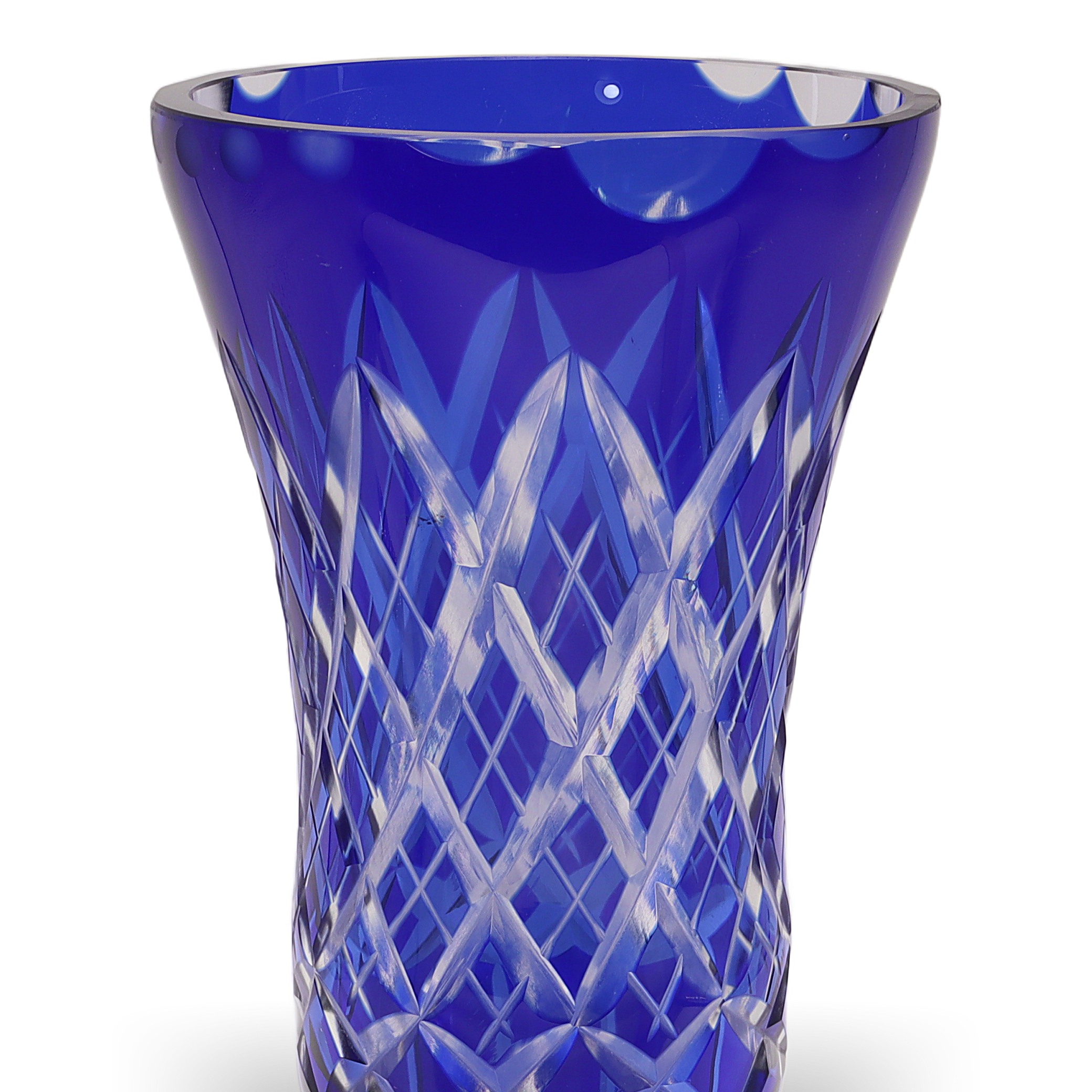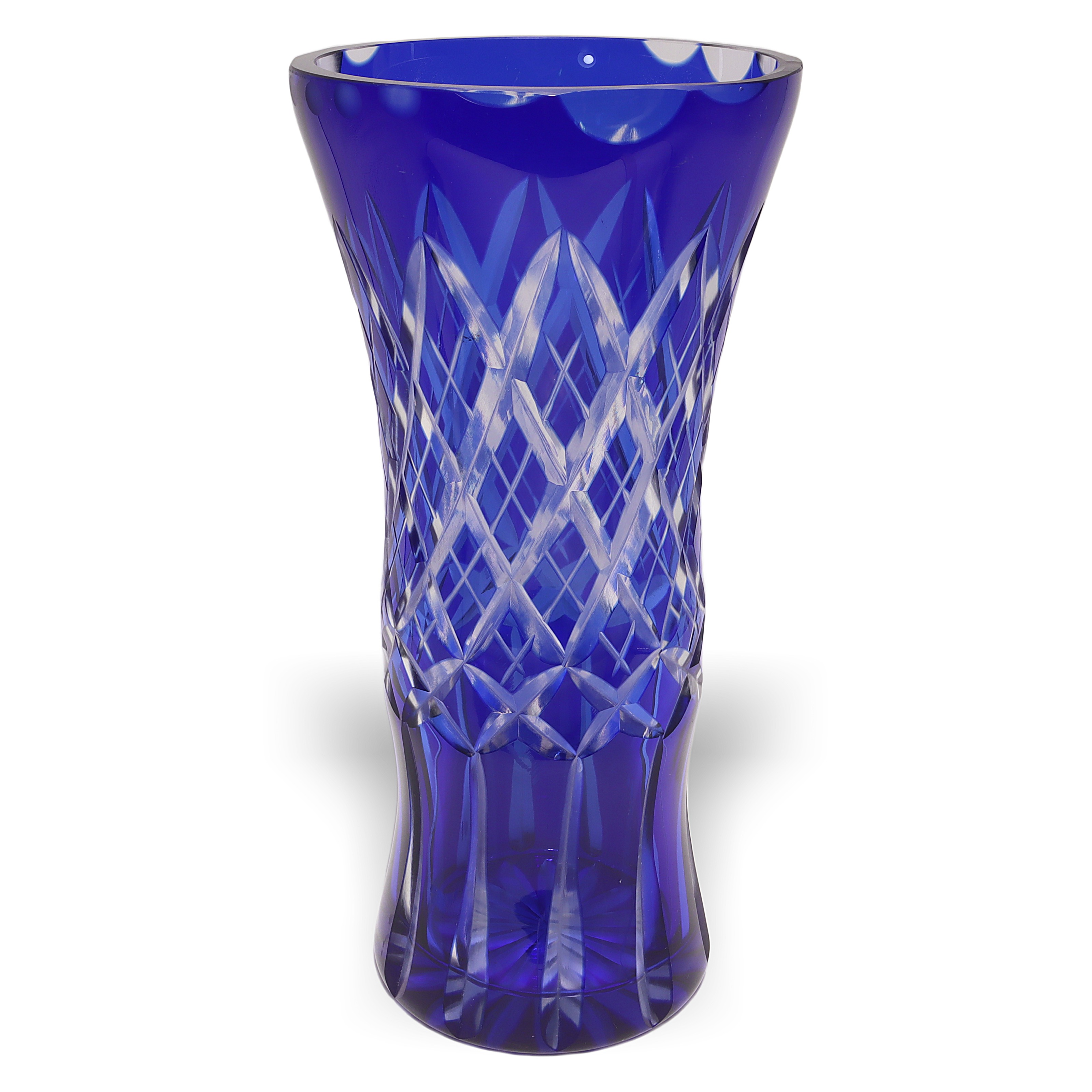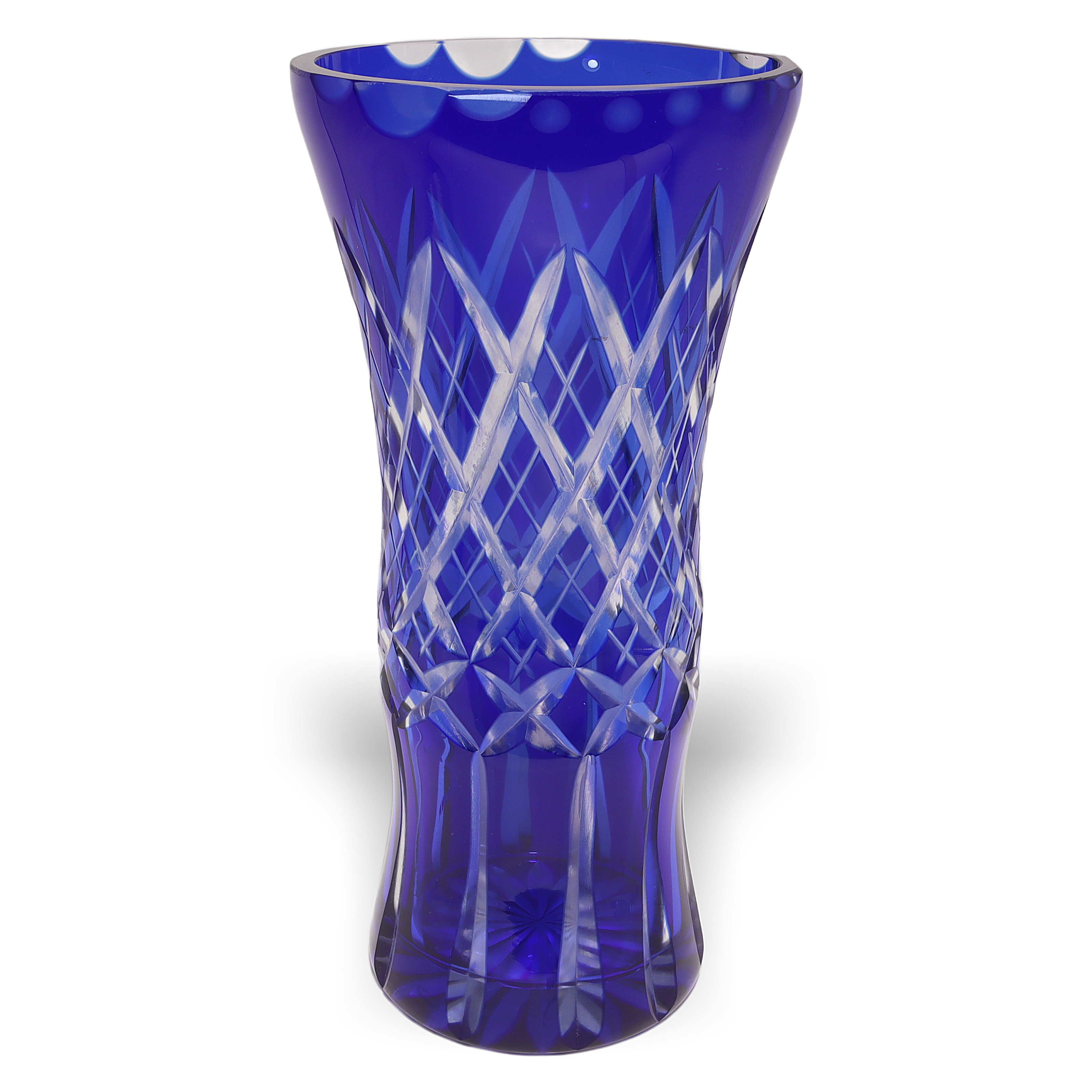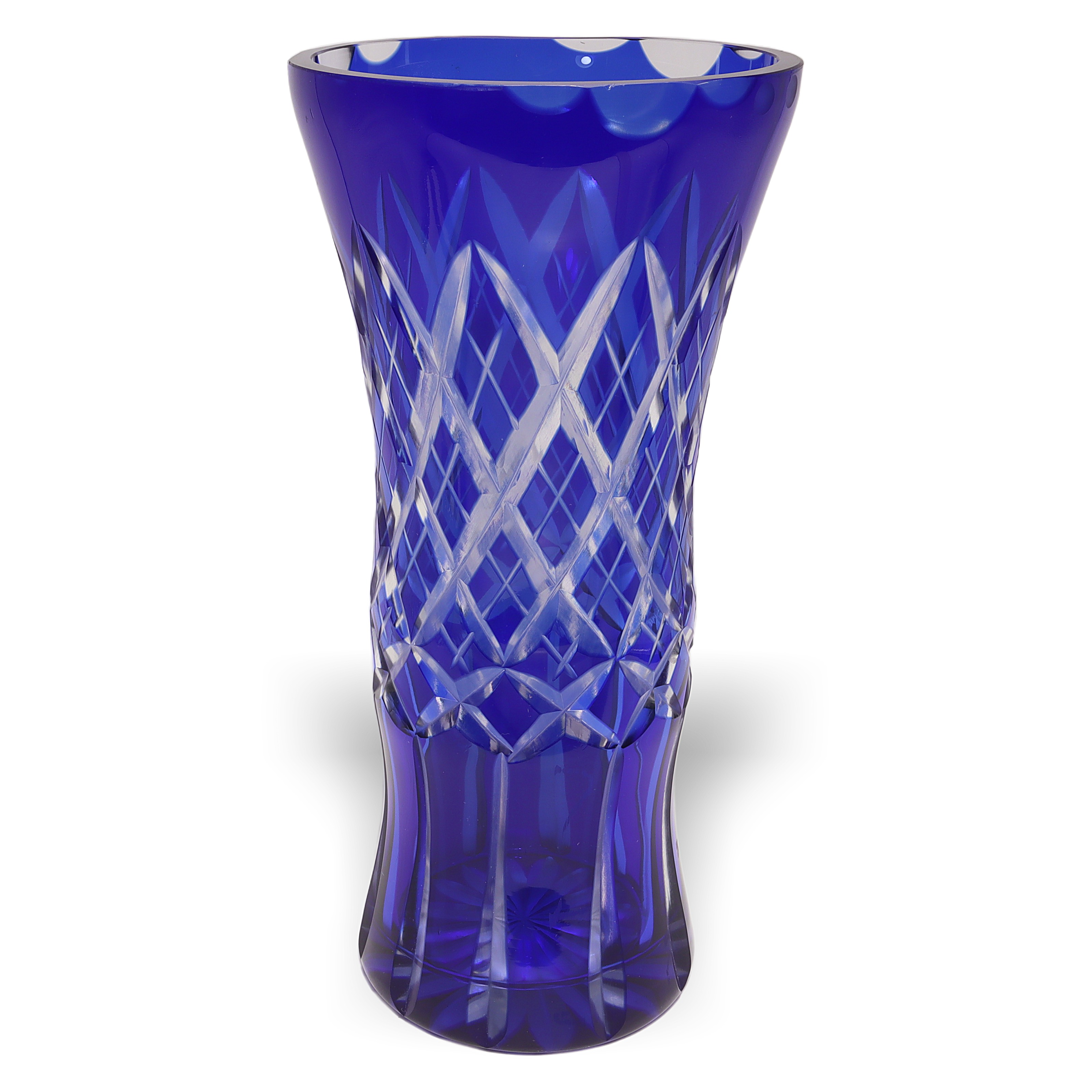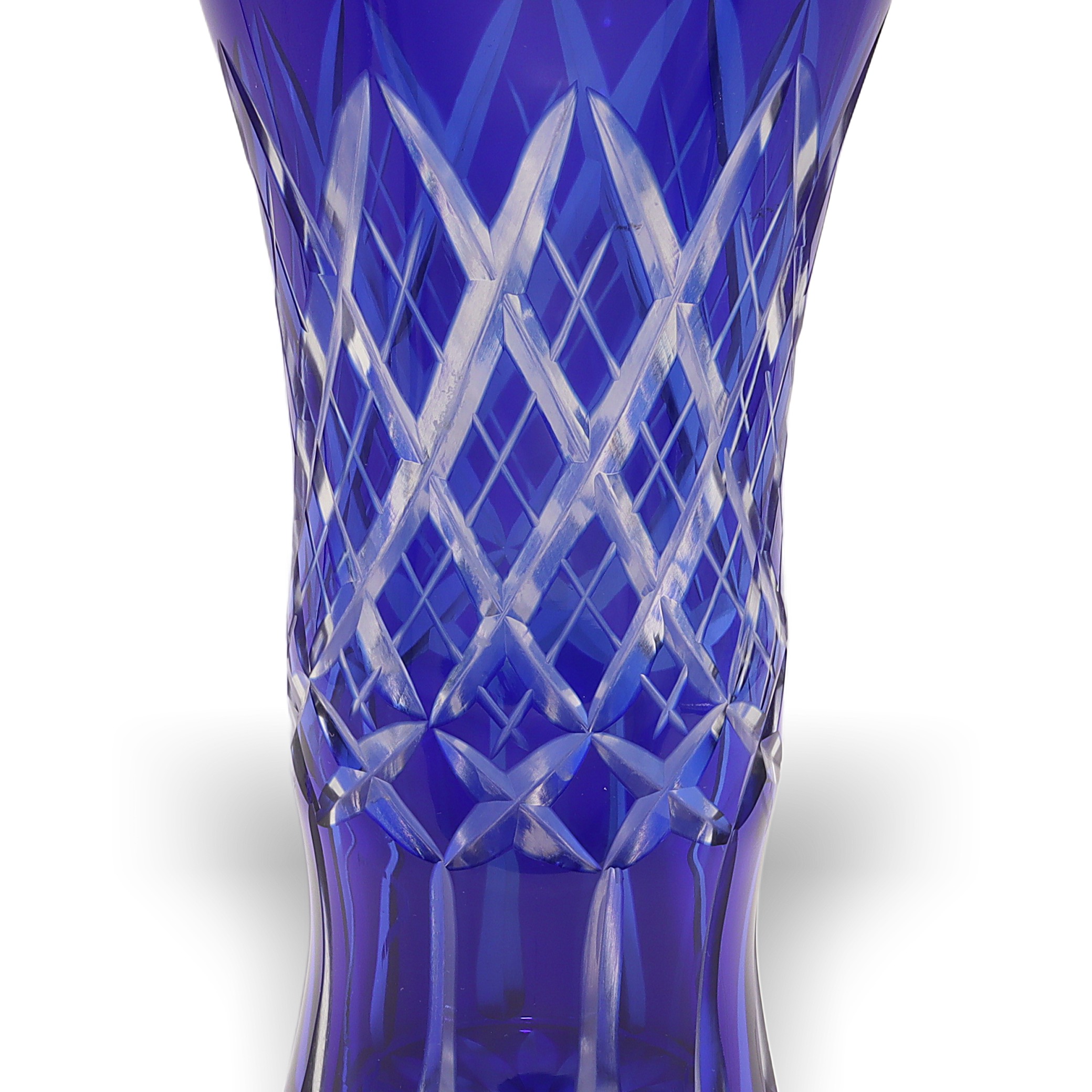 Bohemian glass, sometimes referred to as Bohemia Crystal, has been renowned for centuries as some of the world’s highest-quality hand-cut crystal. Originating from the regions that are now part of the Czech Republic, Bohemian glassmakers became especially well-known during the Art Deco period for their bold colors and sharp geometric patterns. Cobalt blue vases like this one were particularly popular because the rich color stood out, and the intricate cutting work put the artisans’ skills on full display. Today, finding one in such great condition is pretty special—lots of these get chipped or scratched through the years, especially if they’ve actually been used instead of displayed. This vase is not just a decorative piece; for collectors or anyone who loves vintage home decor, it’s a little slice of European glassmaking history.