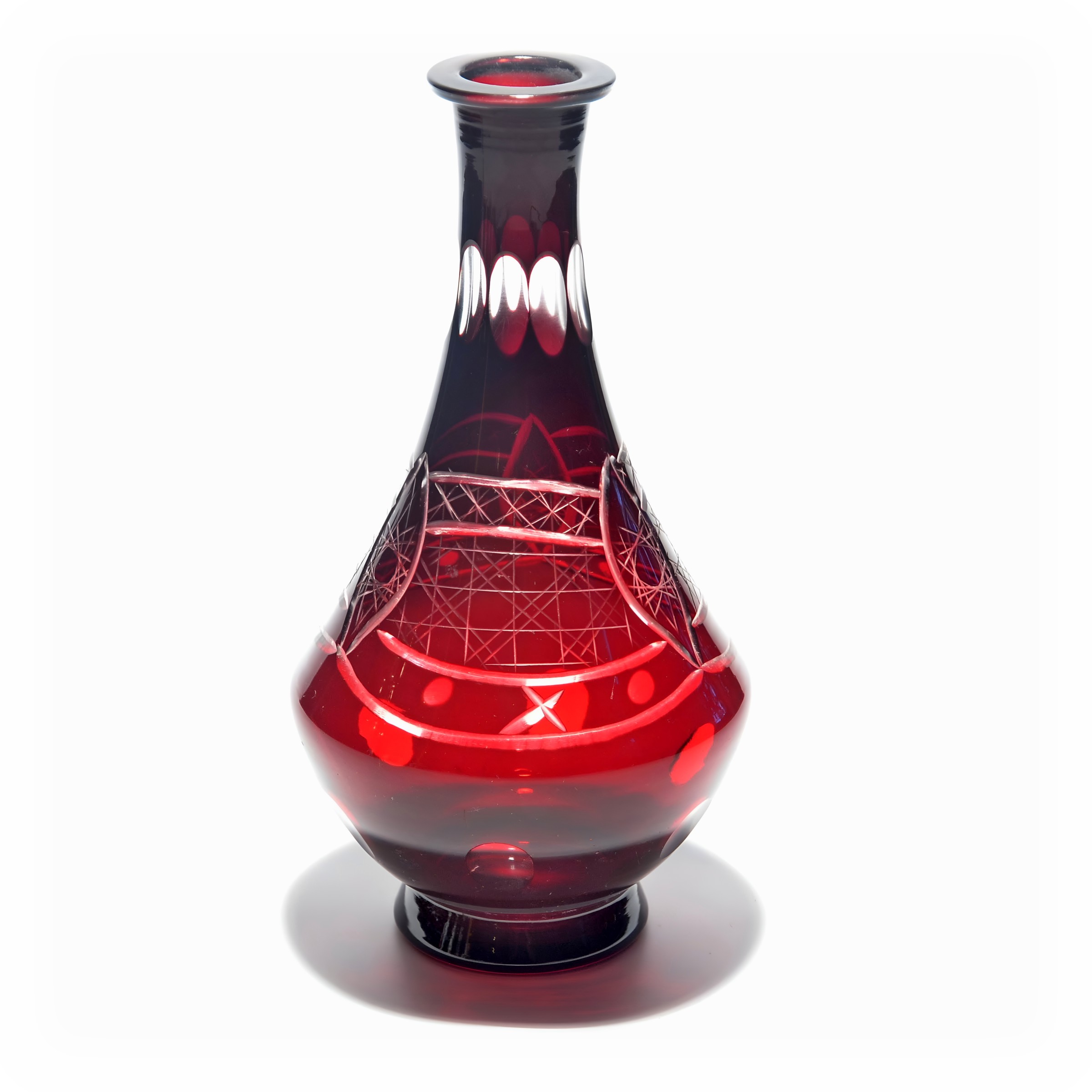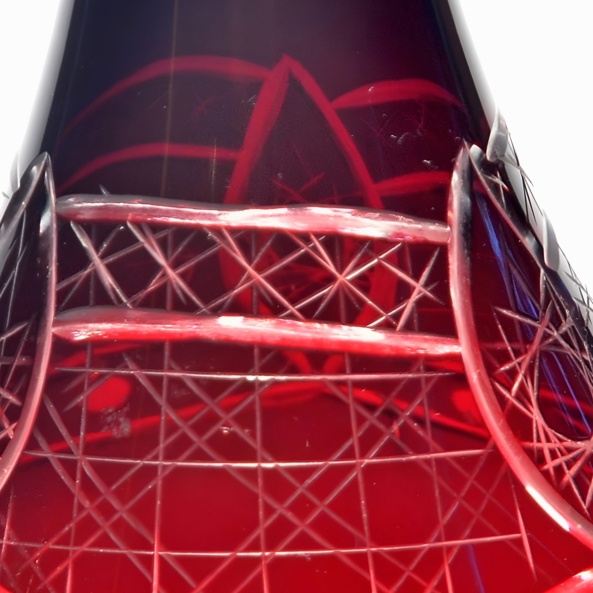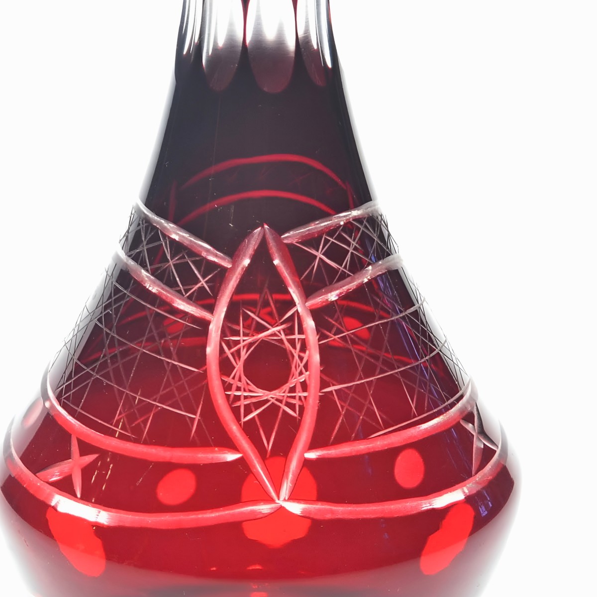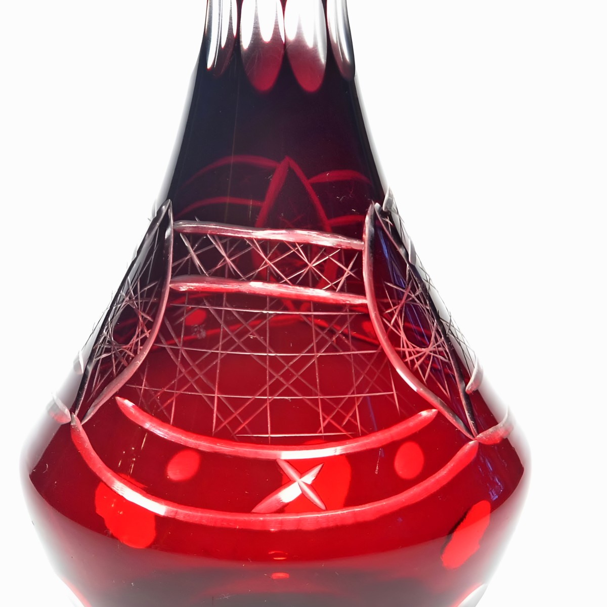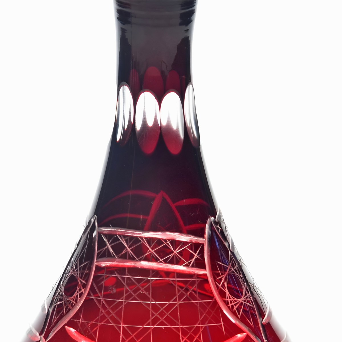 Bohemian lead crystal items like this decanter are renowned around the world for their superior quality and striking beauty. Originating from the Bohemia region, which is now part of the Czech Republic, these pieces represent a long tradition of glassmaking excellence that dates back to the 13th century. The craftsmanship involved in creating each unique piece is a blend of time-honored techniques and skilled artistry. Lead crystal, known for its clarity and weight, adds a luxurious feel that complements its vibrant color. This particular decanter exemplifies that, with its intricate cut patterns that catch and reflect light beautifully.