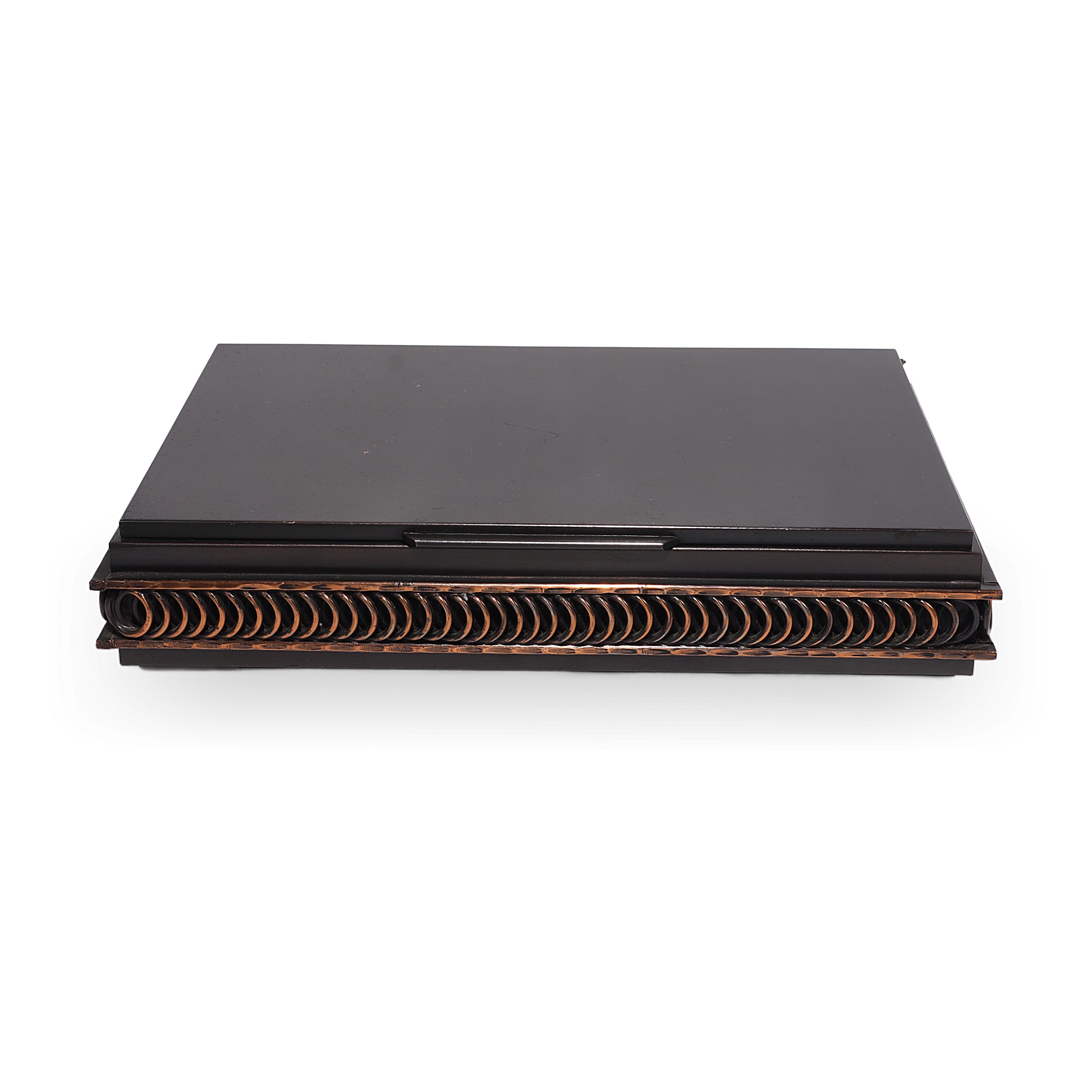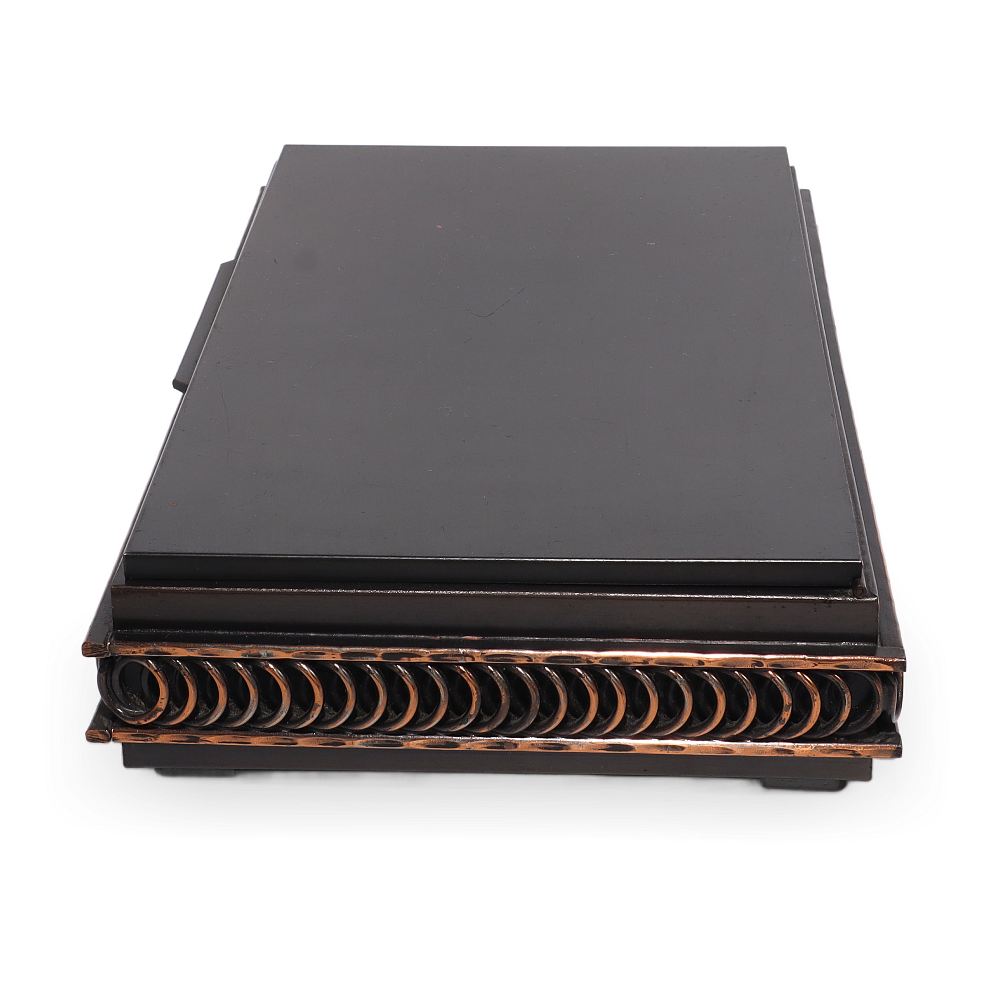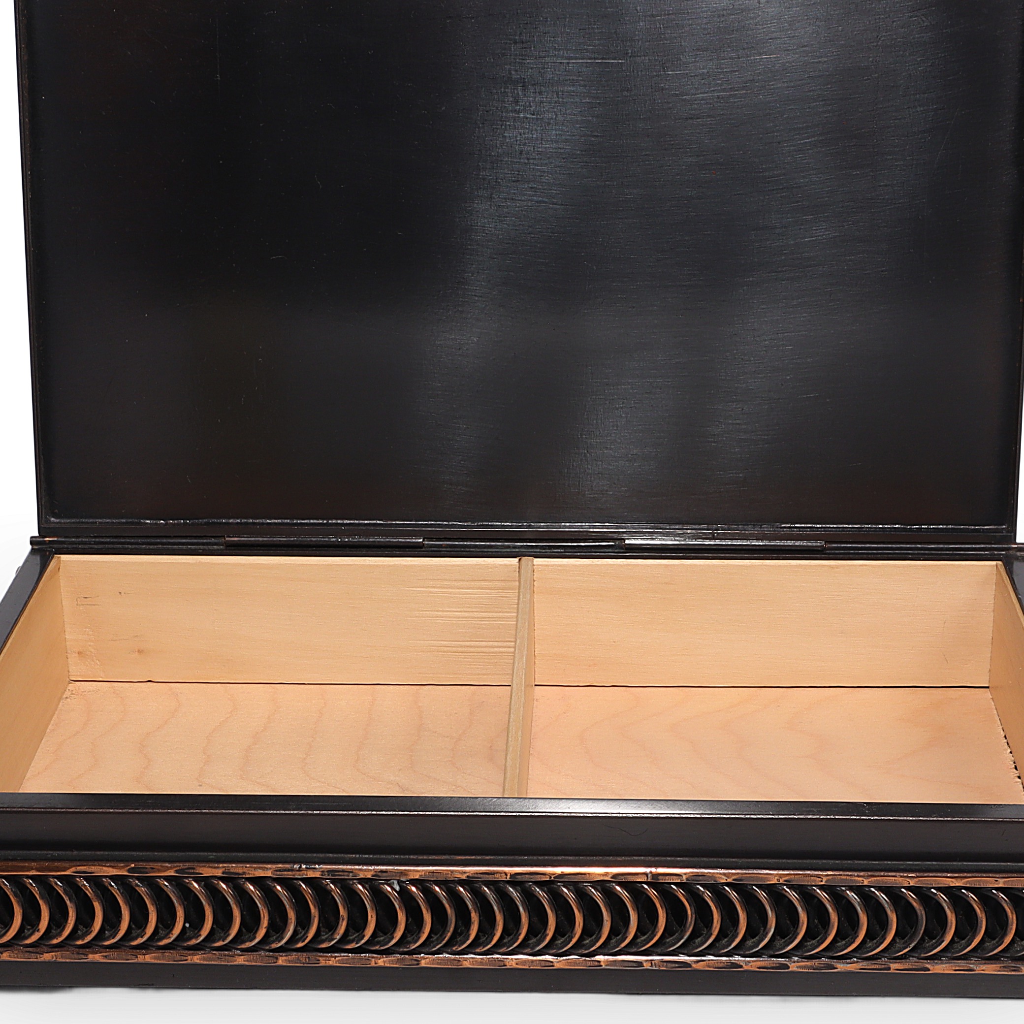 While the maker isn’t marked, boxes like this came from small workshops and giftware lines during the late‑1960s and 1970s Art Deco revival. They favored bronze bodies with copper accents, often patinated or lacquered to keep the color warm. The spiral band is a classic Deco motif, nodding to machine‑age geometry while adding grip. At 9 inches long, it’s larger than many cigarette cases, closer to a tabletop casket for entertaining. Because smoking accessories saw heavy use, Near Mint survivors are less common, which helps this piece stand out. Dust and skip harsh polish to preserve the original finish.