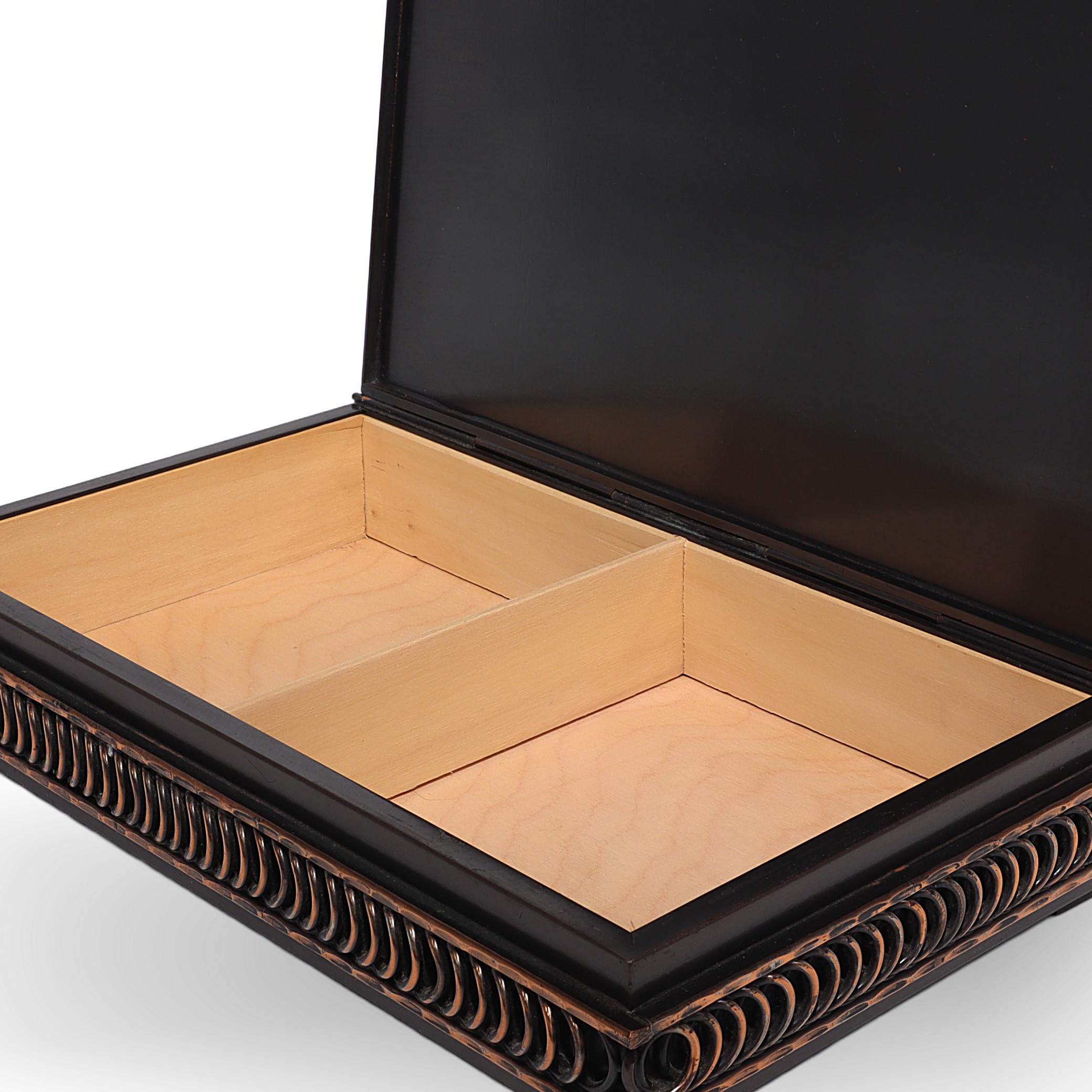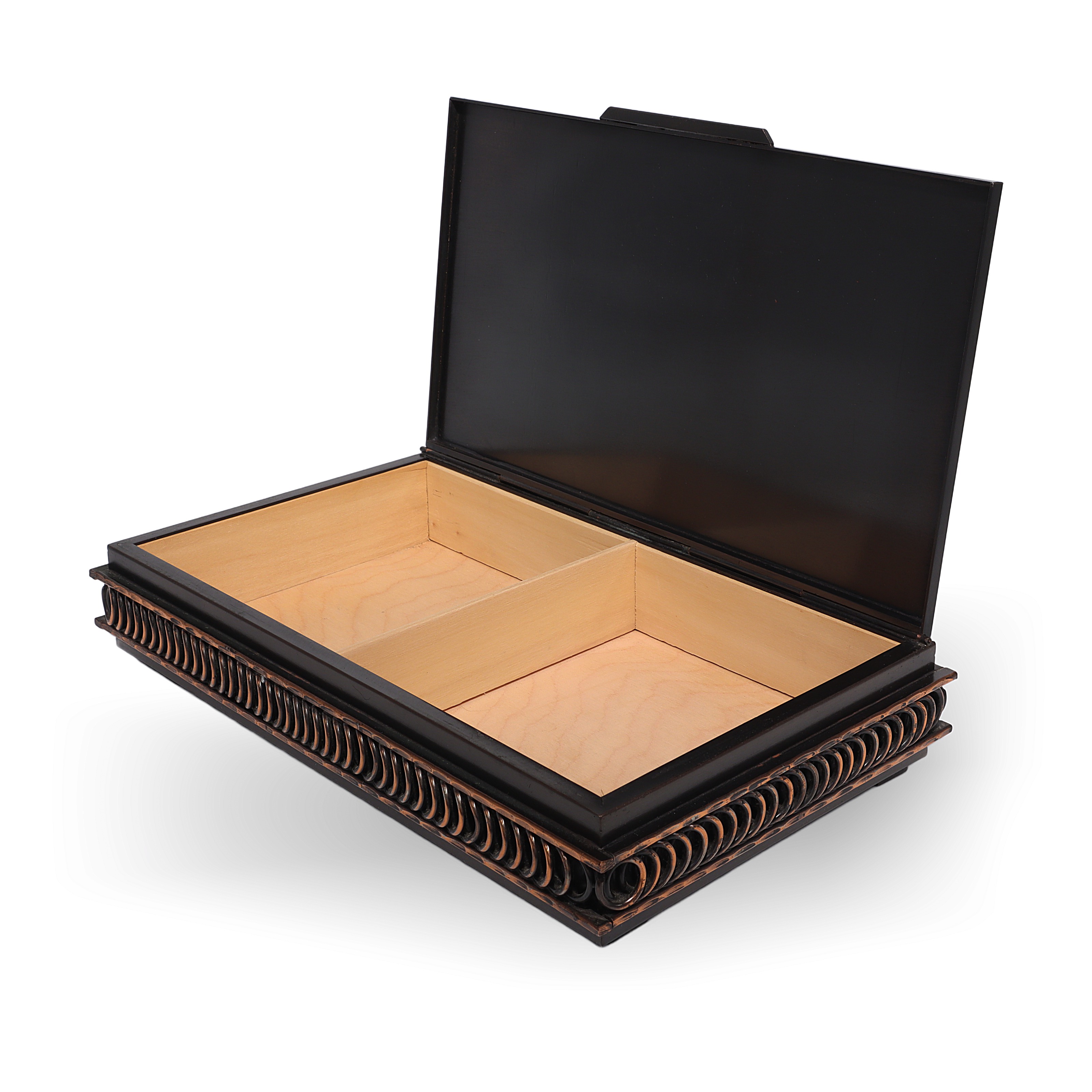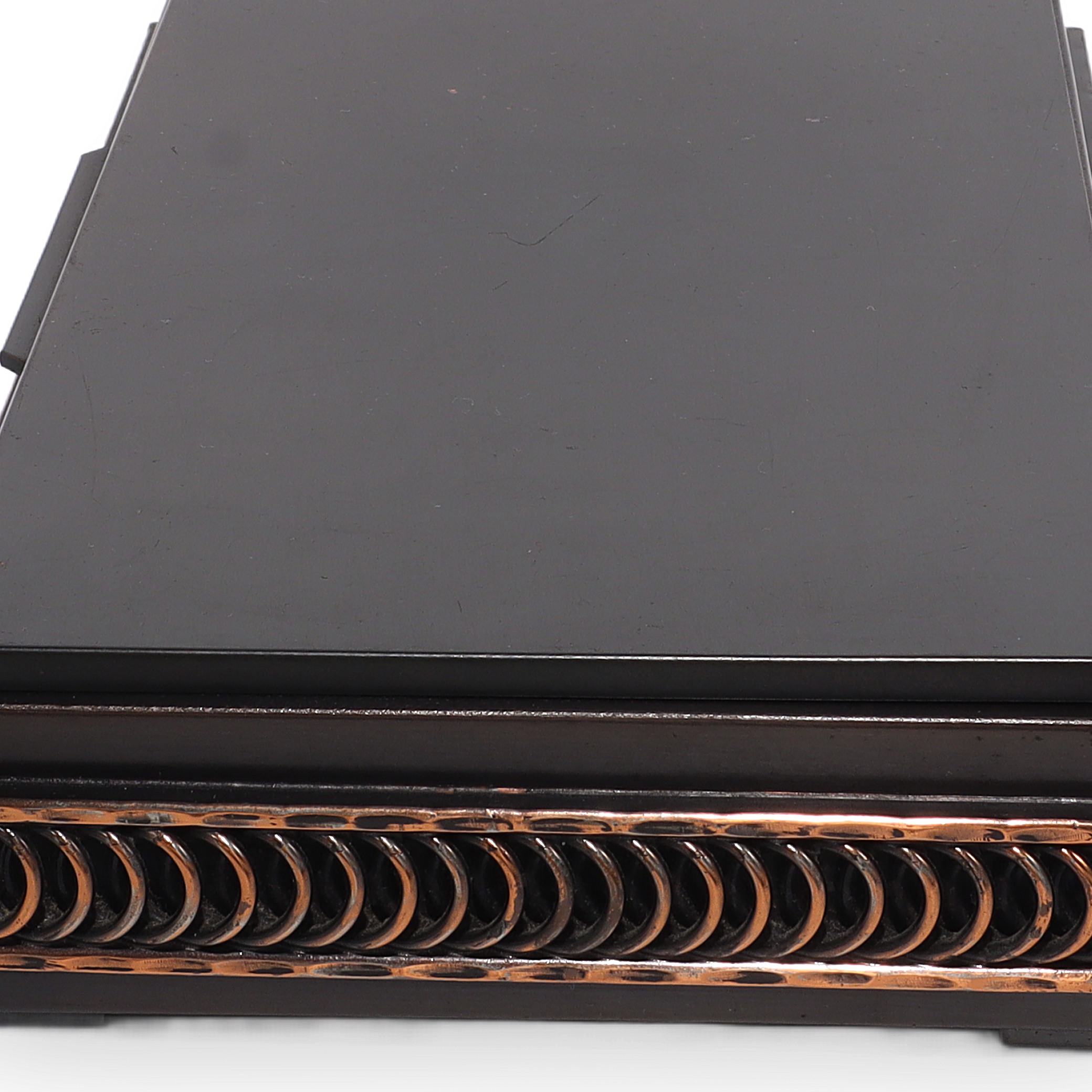 While the maker isn’t marked, boxes like this came from small workshops and giftware lines during the late‑1960s and 1970s Art Deco revival. They favored bronze bodies with copper accents, often patinated or lacquered to keep the color warm. The spiral band is a classic Deco motif, nodding to machine‑age geometry while adding grip. At 9 inches long, it’s larger than many cigarette cases, closer to a tabletop casket for entertaining. Because smoking accessories saw heavy use, Near Mint survivors are less common, which helps this piece stand out. Dust and skip harsh polish to preserve the original finish.