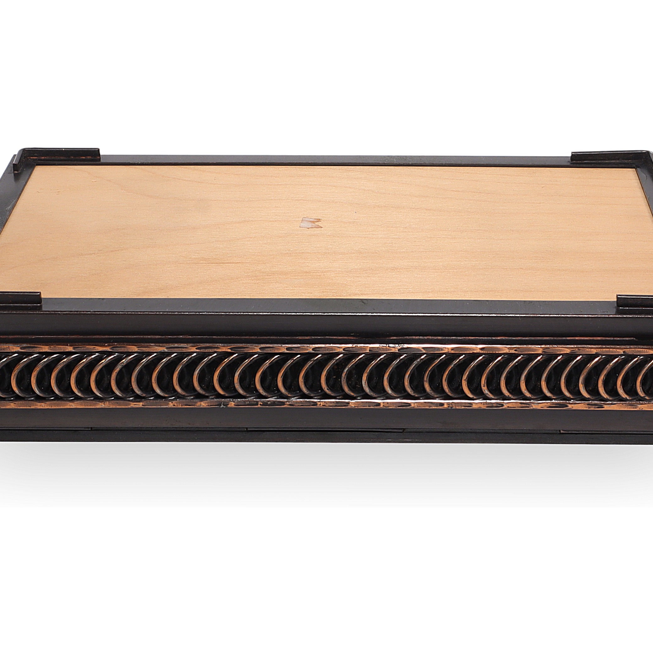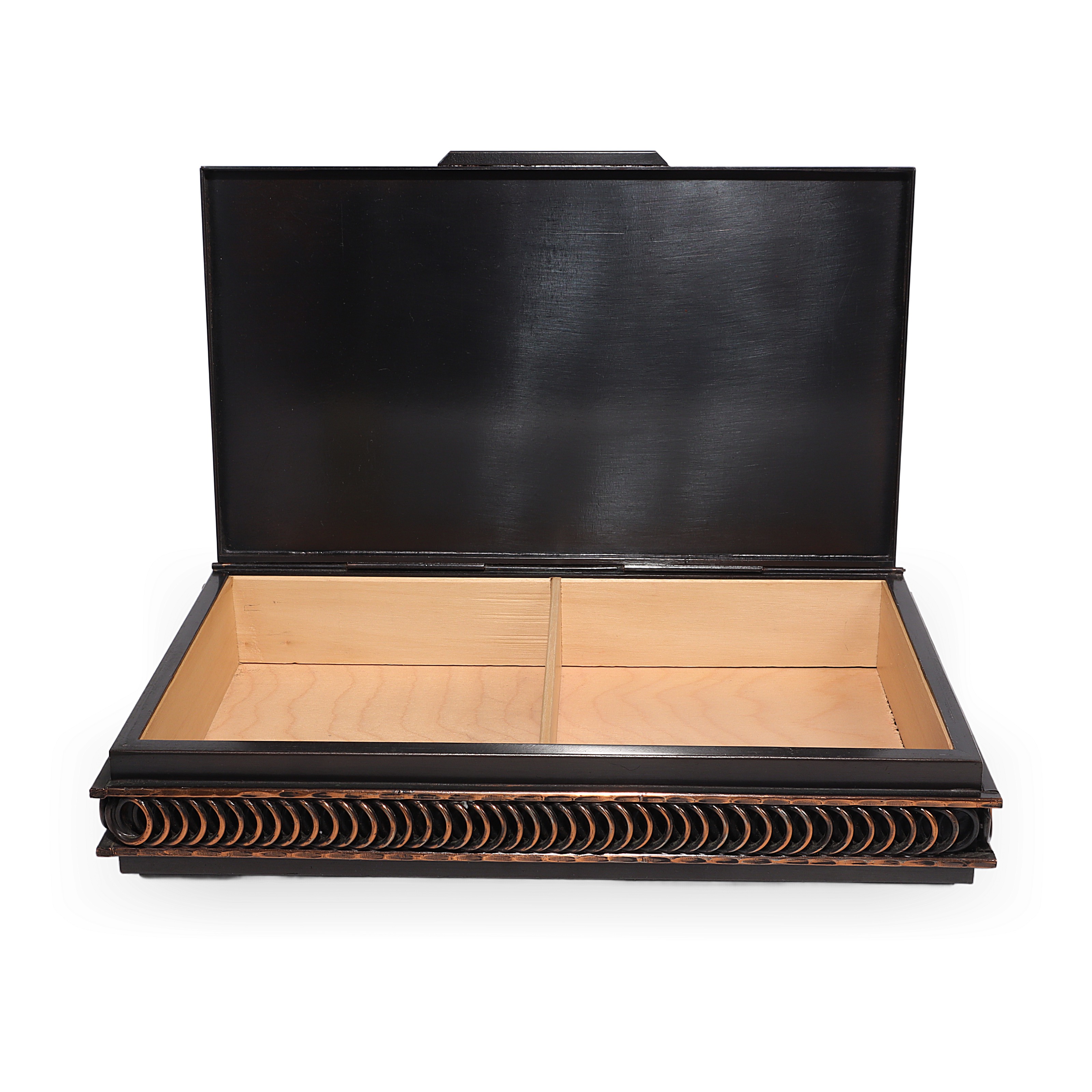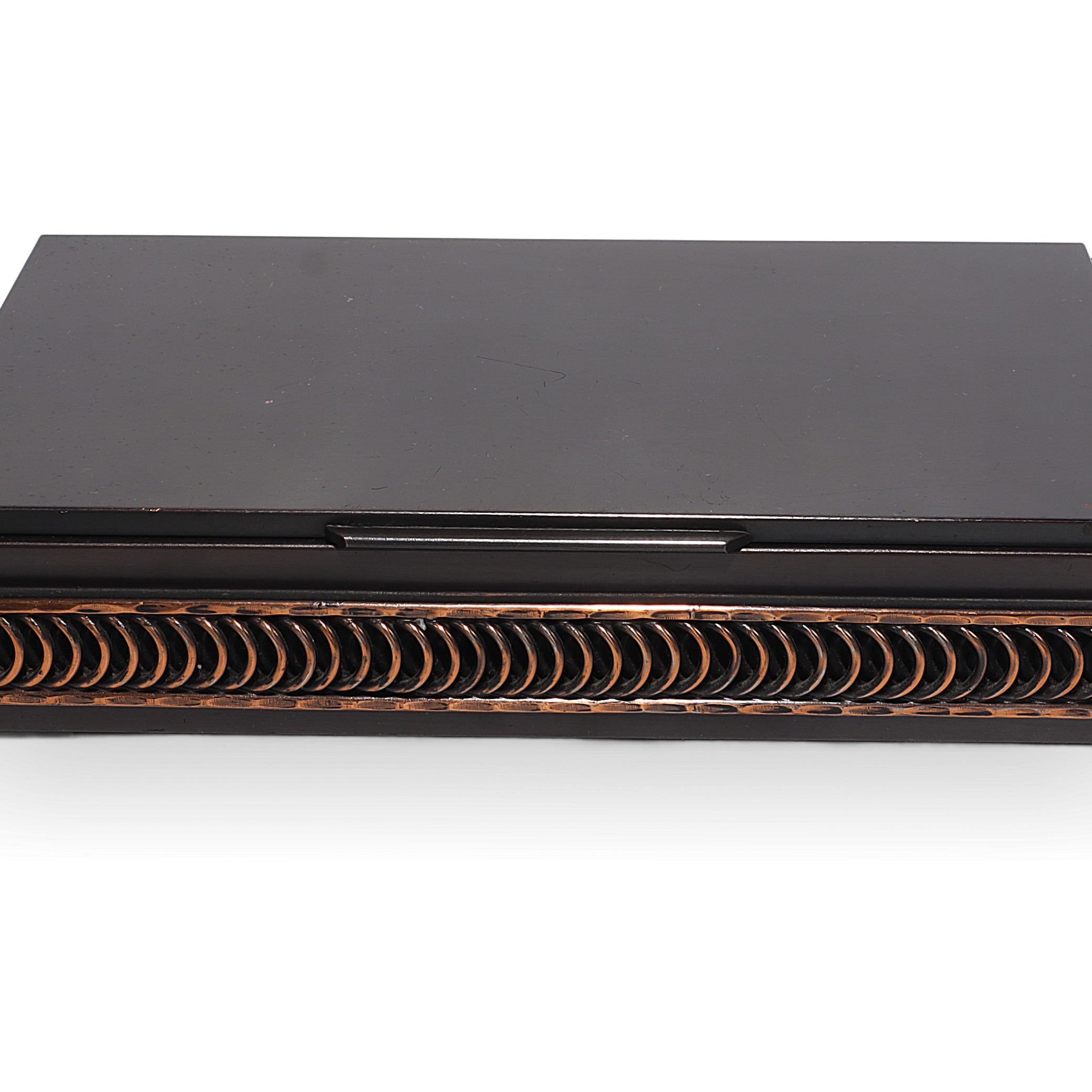 This is a Bronze Box Vintage Art Deco Cigarette Box with a copper spiral design around the sides and a dark, flat lid. It dates to 1970, making it about 56 years old, and it’s in Near Mint condition. The rectangular box feels substantial, opens on a smooth hinge, and shows only light patina that gives the bronze and copper character. It measures 2 inches tall, 5.5 inches wide, and 9 inches long, a handy size for loose cigarettes, small keepsakes, or cards. The bold coil detail delivers that Deco‑meets‑midcentury look that sits well on a coffee table, credenza, or desk.
