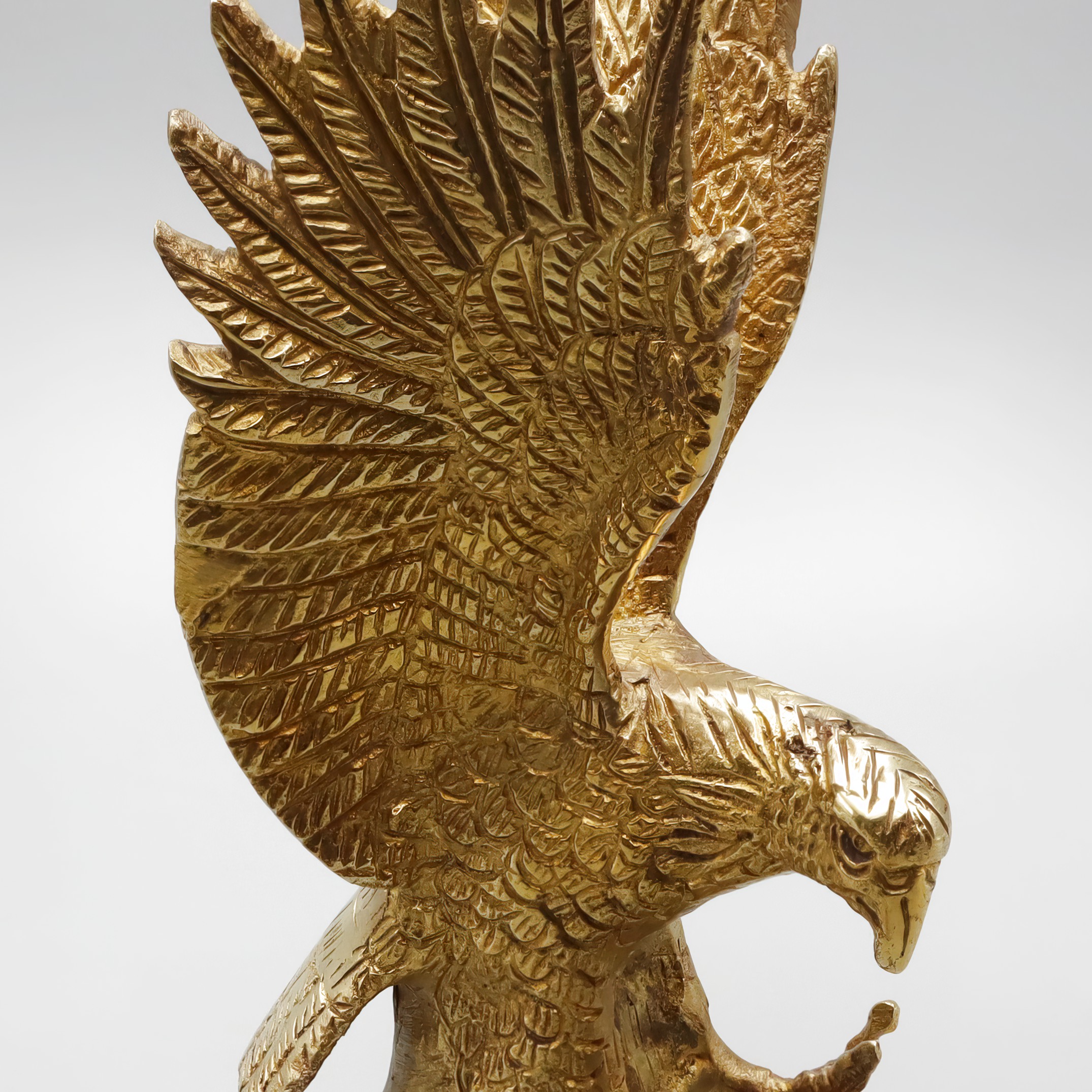 This striking bronze eagle figurine is a stunning example of vintage craftsmanship, embodying the spirit of freedom and strength. Standing at 8.5 inches tall and 4 inches long, this sculpture captures the eagle mid-flight with an incredible attention to detail, from the texture of its feathers to the determined expression. Handmade with care, it not only serves as an eye-catching piece of décor but also as a symbolic artifact reflecting themes of power and liberty. Its near mint condition suggests it has been well-preserved over the years, adding to its desirability among collectors and enthusiasts of wildlife art.
