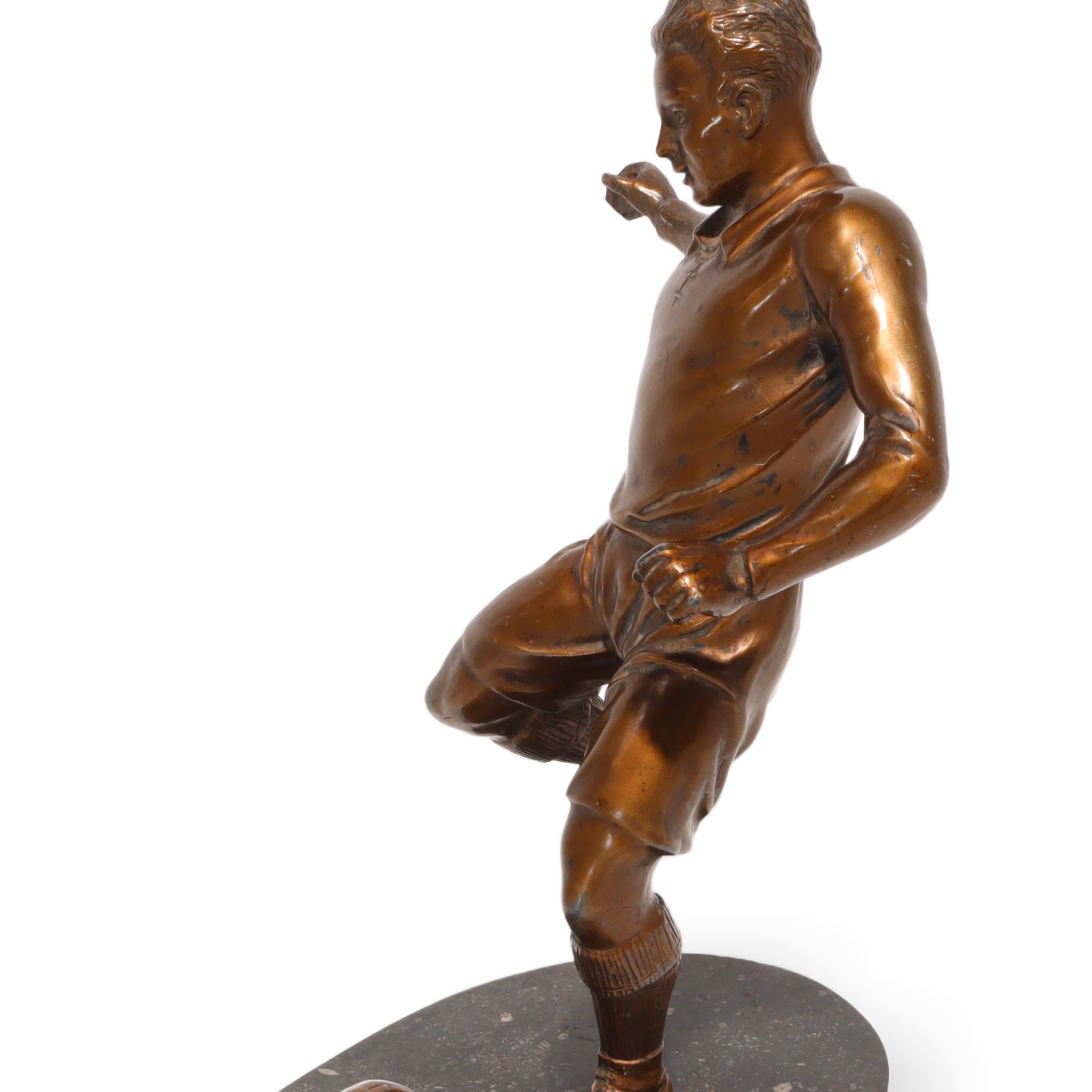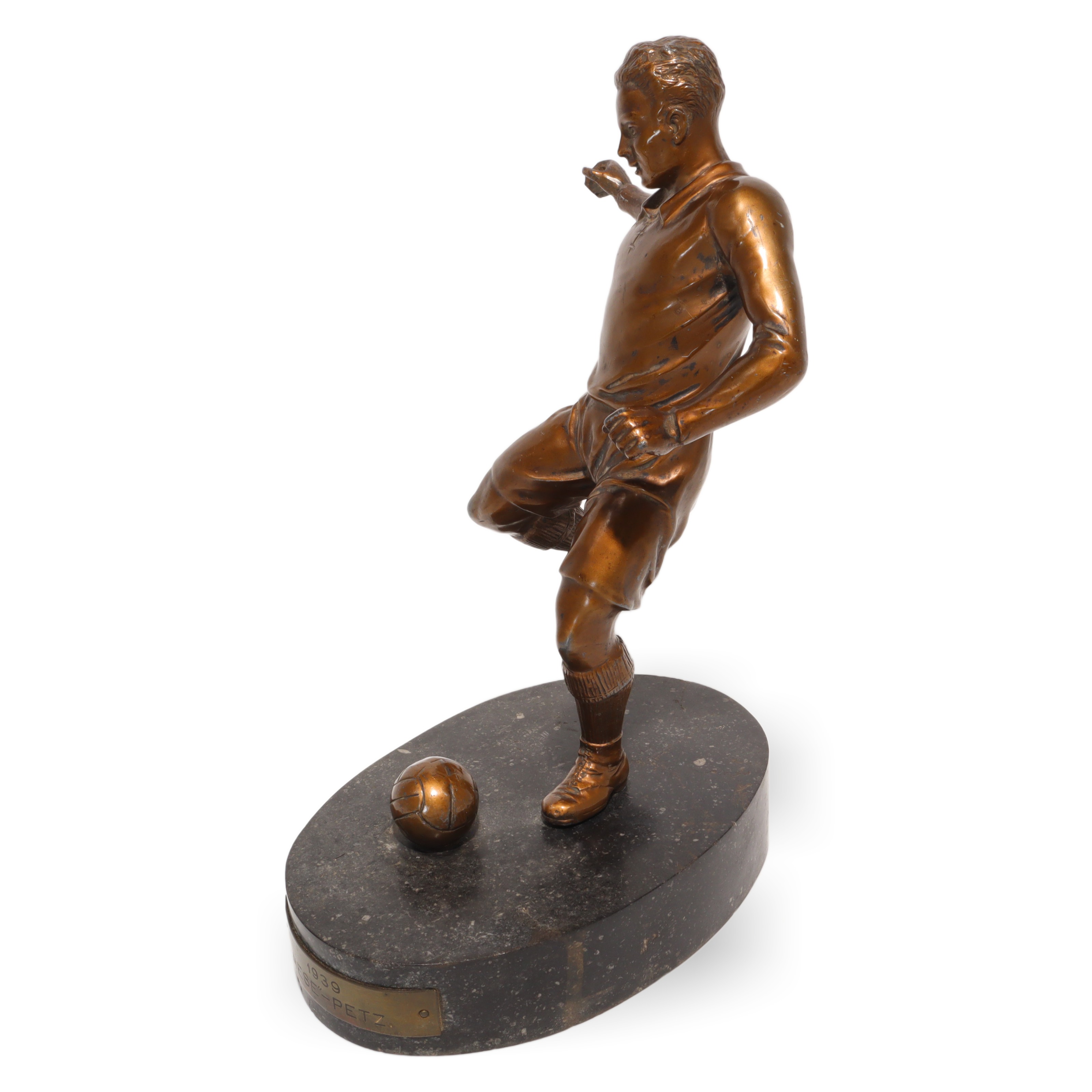 This striking bronze statue captures the vibrant energy of a football player in motion, frozen at the critical moment just before striking the ball. With a height of 10 inches (25 cm), a width of 6 inches (15 cm), and a length of 8 inches (20 cm), it is perfectly sized for a desk or a display shelf. The sculpture, dating back to around 1940, showcases classic Art Deco influences with its smooth lines and athletic form, a true testament to the elegance and spirit of sportsmanship from nearly a century ago. Its near mint condition makes it an exceptional find among vintage sports collectibles. The player is decked out in timeless gear, and the craftsmanship highlights every detail, from his focused expression to the folds in his kit, making it a favorite for anyone who appreciates both sport and art.