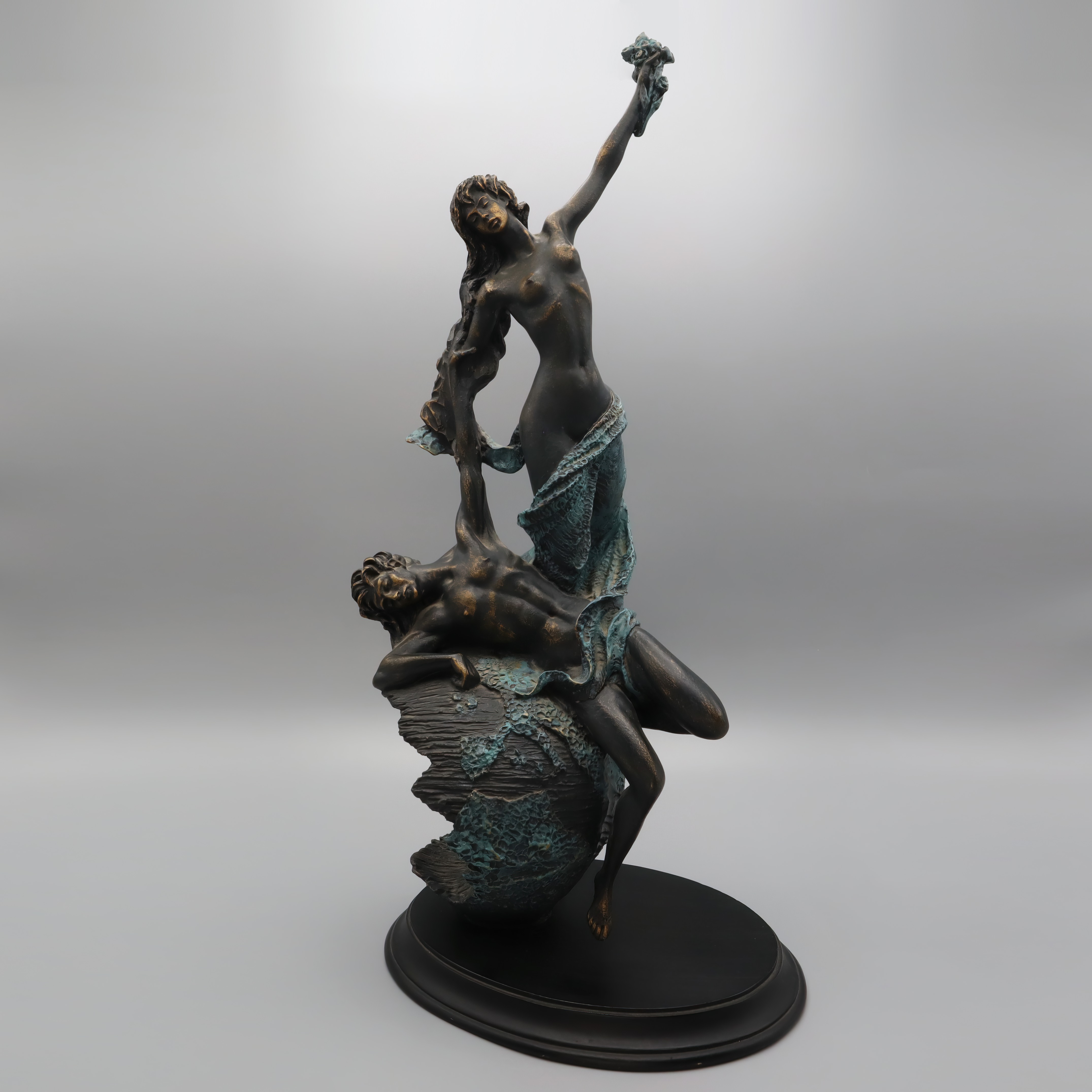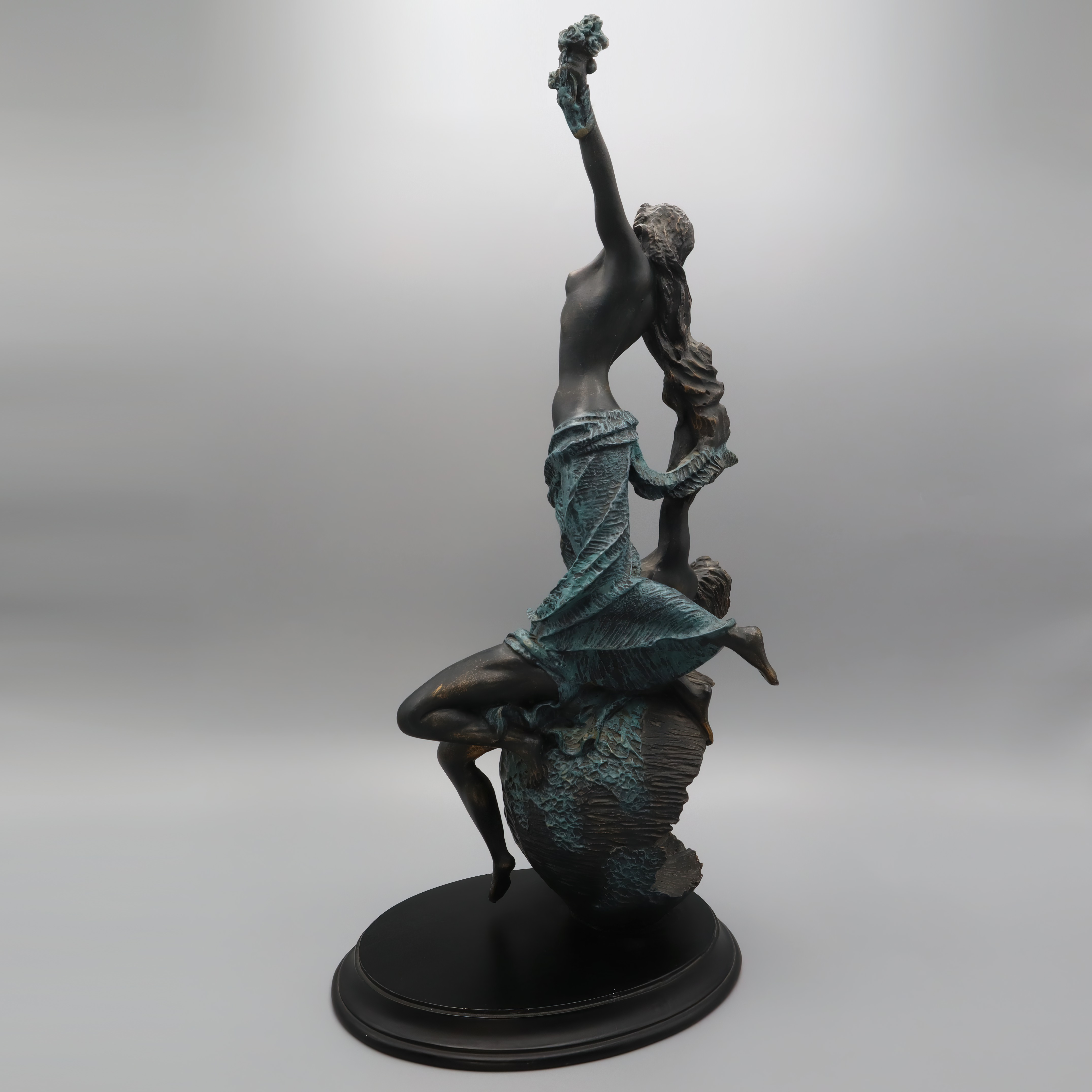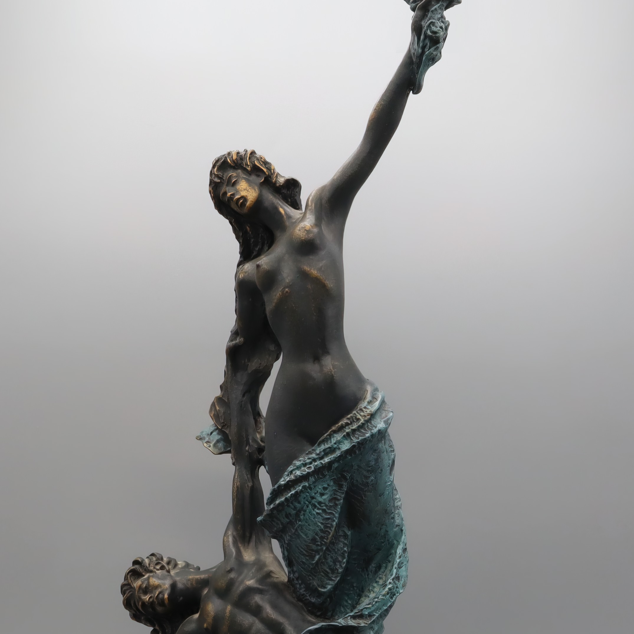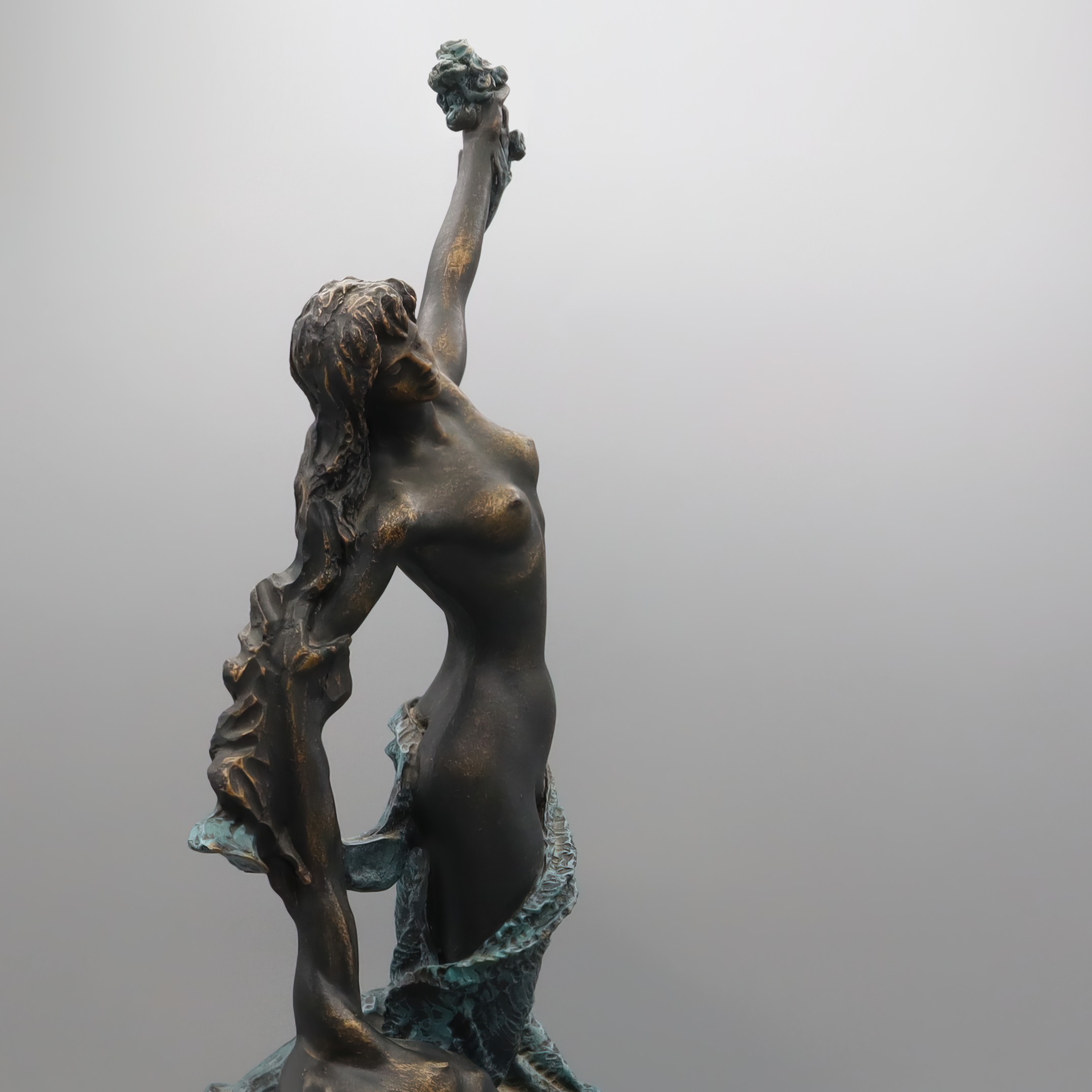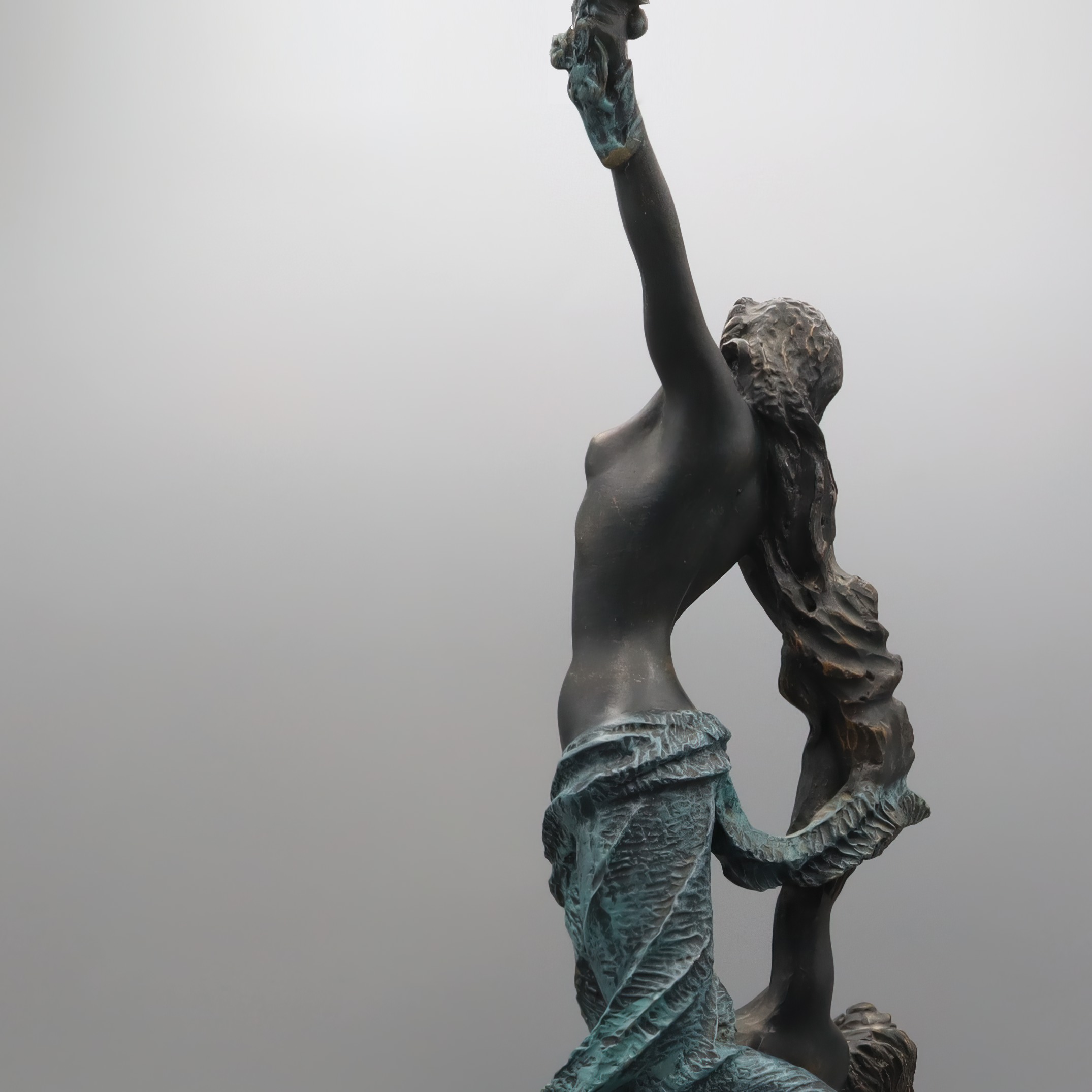 Art Deco, the style this piece represents, emerged in the 1920s and became prominent in the decades that followed, including into the 1960s. Known for its bold geometric shapes and lavish ornamentation, Art Deco brought together luxury and functionality, which is evident in this bronze figurine. Such pieces are considered rare finds today, as they embody the craftsmanship and aesthetic sensibilities of their time. Collectible bronze art like this is particularly treasured by art lovers and enthusiasts who appreciate the intricacy and historical significance that such sculptures hold. The Allegria statue not only serves as a decorative piece but also as a cherished artifact that transports viewers back to an era of artistic innovation and elegance. Its age, now over sixty years, adds to its vintage charm, making it a remarkable and sought-after addition to any collection.