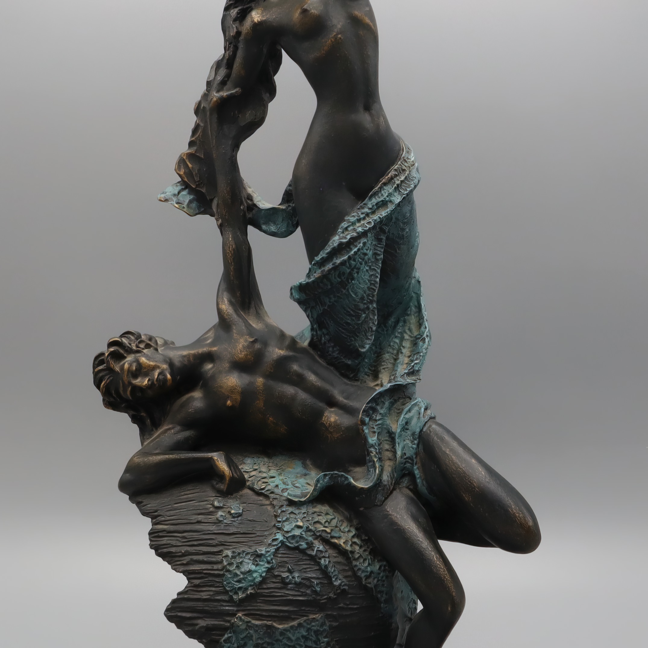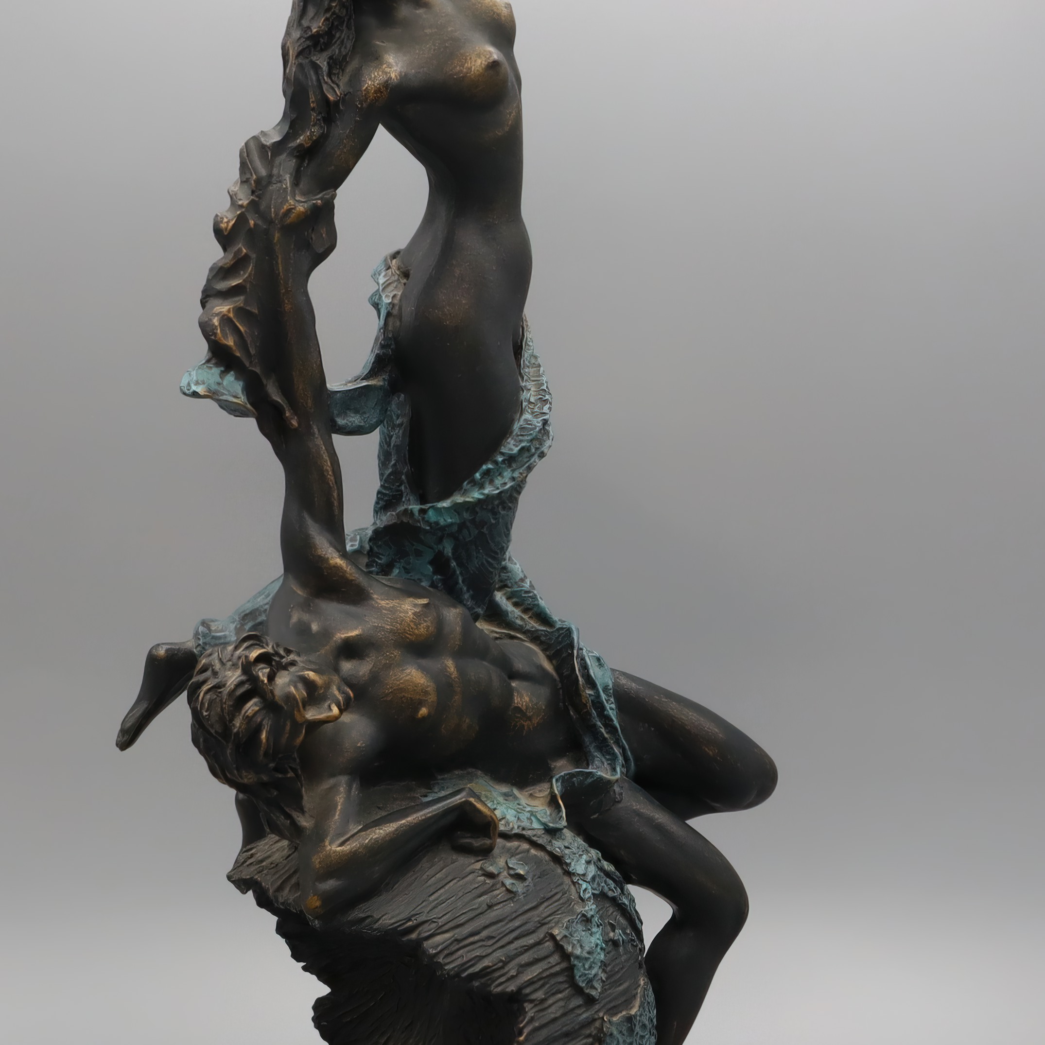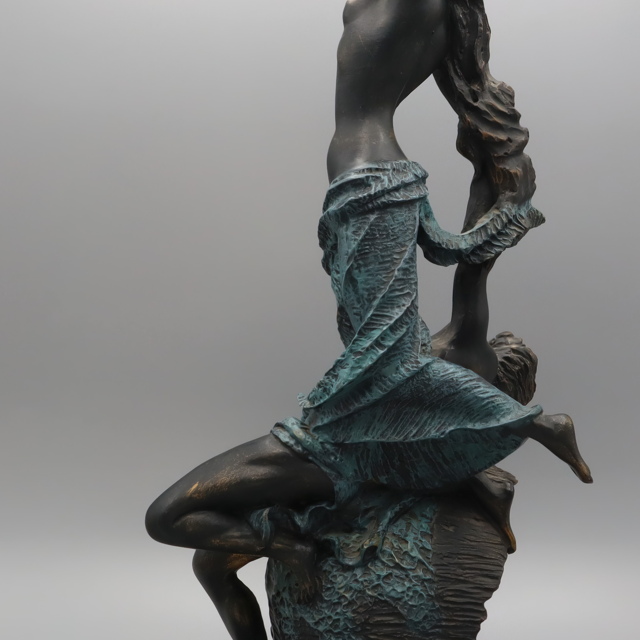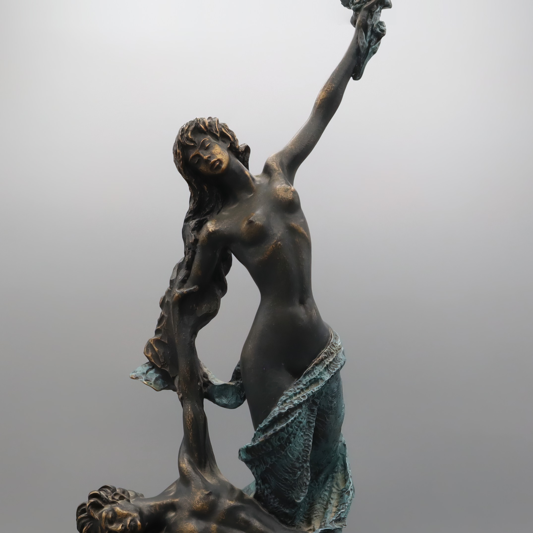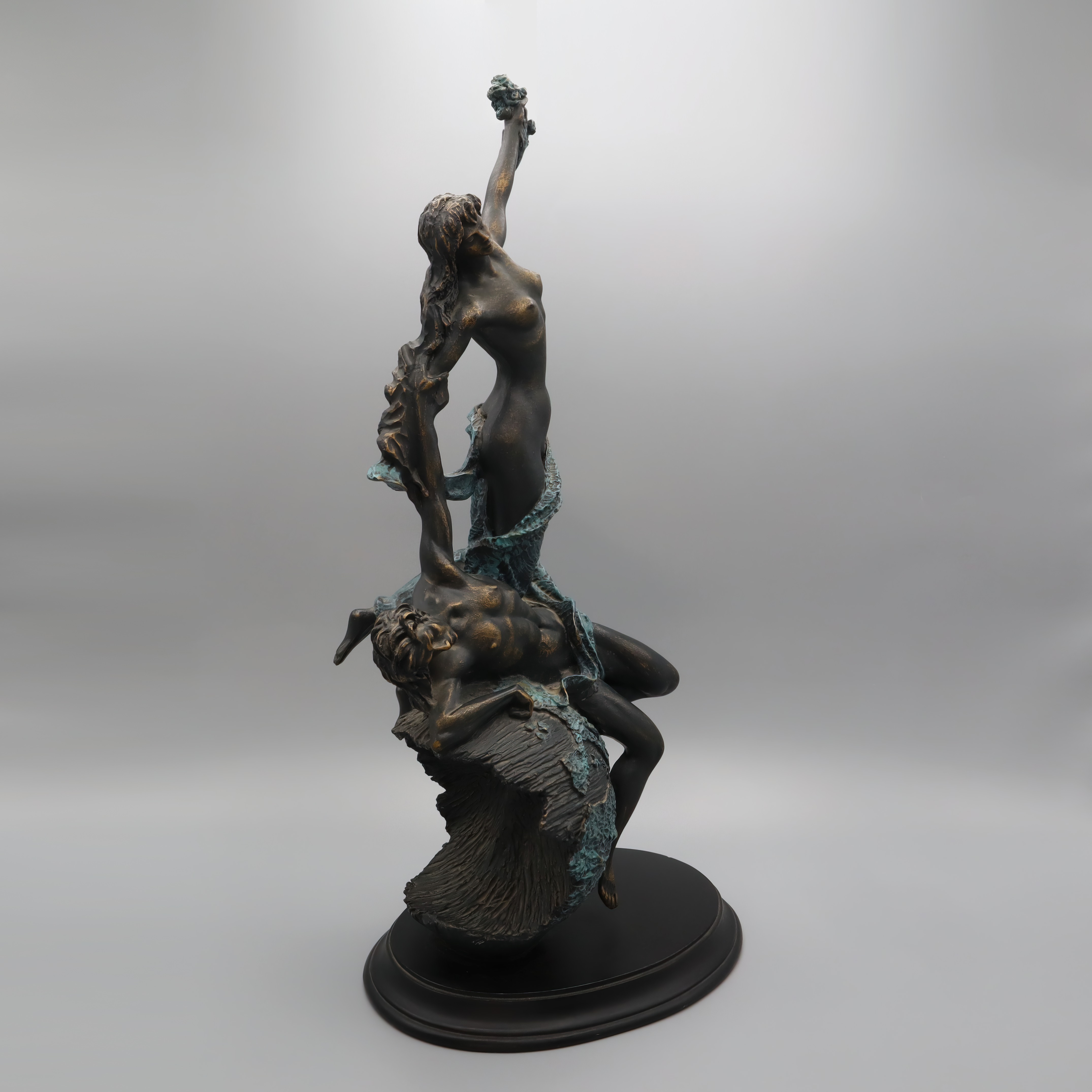 Art Deco, the style this piece represents, emerged in the 1920s and became prominent in the decades that followed, including into the 1960s. Known for its bold geometric shapes and lavish ornamentation, Art Deco brought together luxury and functionality, which is evident in this bronze figurine. Such pieces are considered rare finds today, as they embody the craftsmanship and aesthetic sensibilities of their time. Collectible bronze art like this is particularly treasured by art lovers and enthusiasts who appreciate the intricacy and historical significance that such sculptures hold. The Allegria statue not only serves as a decorative piece but also as a cherished artifact that transports viewers back to an era of artistic innovation and elegance. Its age, now over sixty years, adds to its vintage charm, making it a remarkable and sought-after addition to any collection.