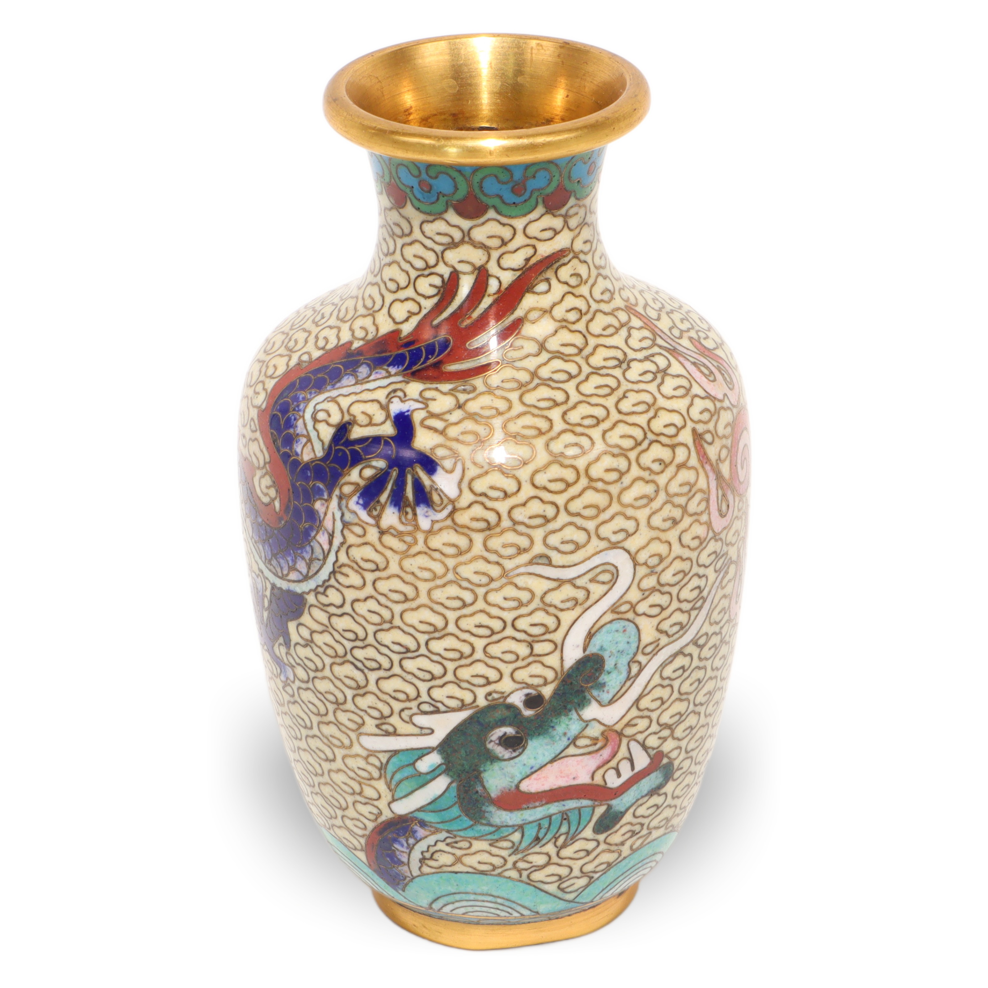 This little beauty is a vintage Chinese cloisonné dragon vase, crafted around the year 1960. Standing just 4 inches tall and about 2.5 inches wide, it packs a lot of detail into a small package. The vase is made with brass and features vibrant enamel work—just look at that classic swirling dragon winding its way over a cloud-filled background. The gold-colored rim and base catch the light, giving the whole piece a rich, elegant feel. For a vase over 60 years old, it’s in near mint condition, which is pretty special to find these days. Pieces like this don’t show up every day, especially ones that have survived so well without chips or major wear.