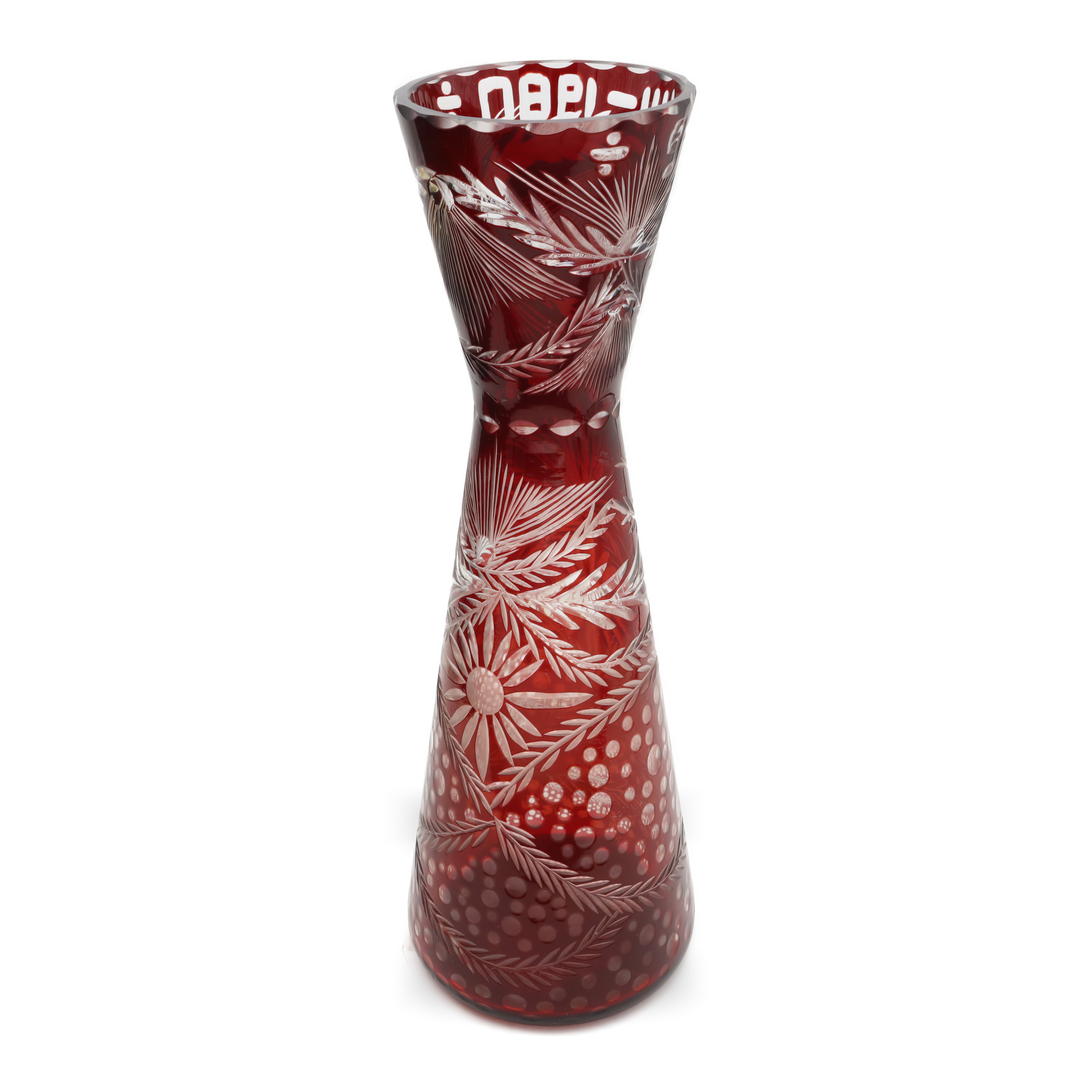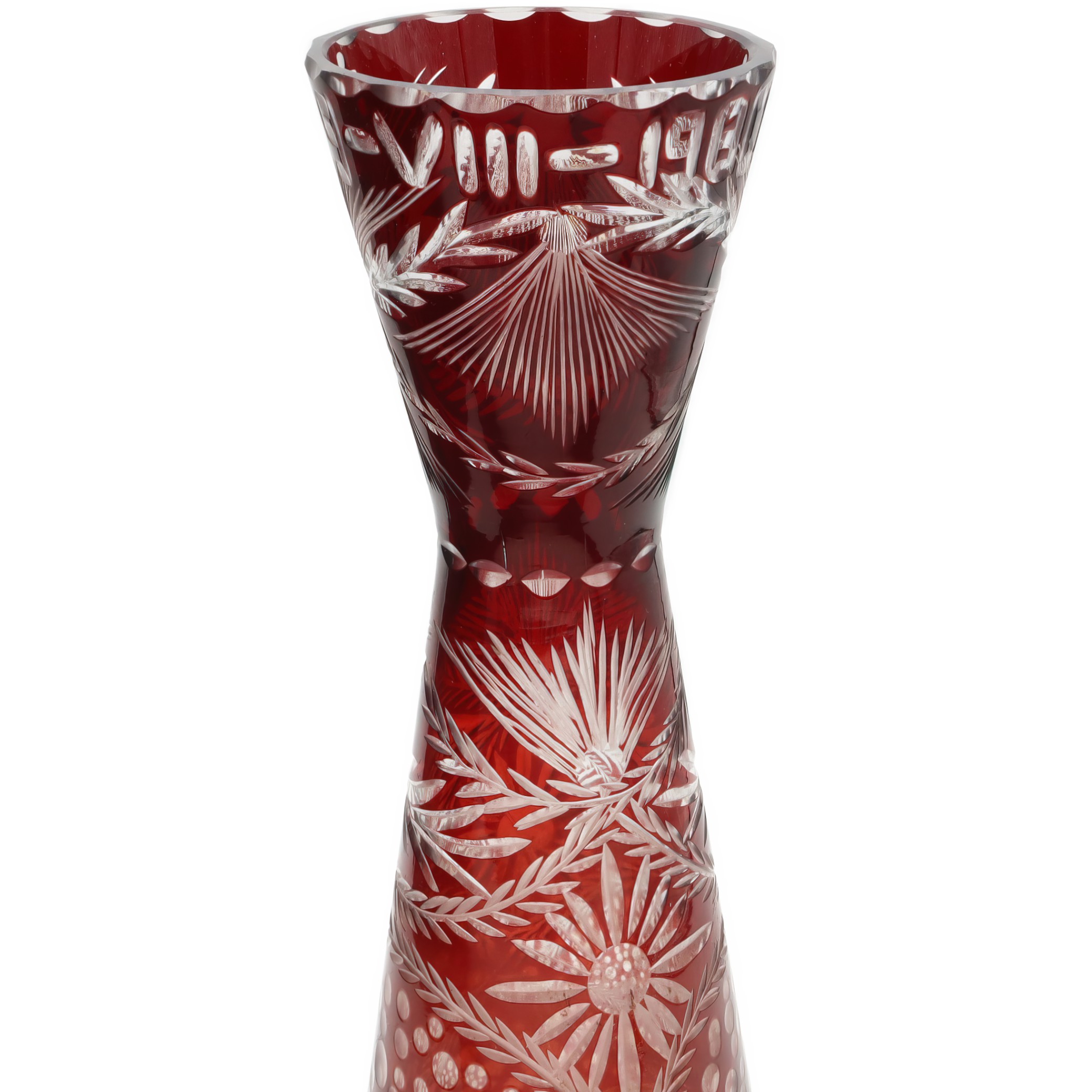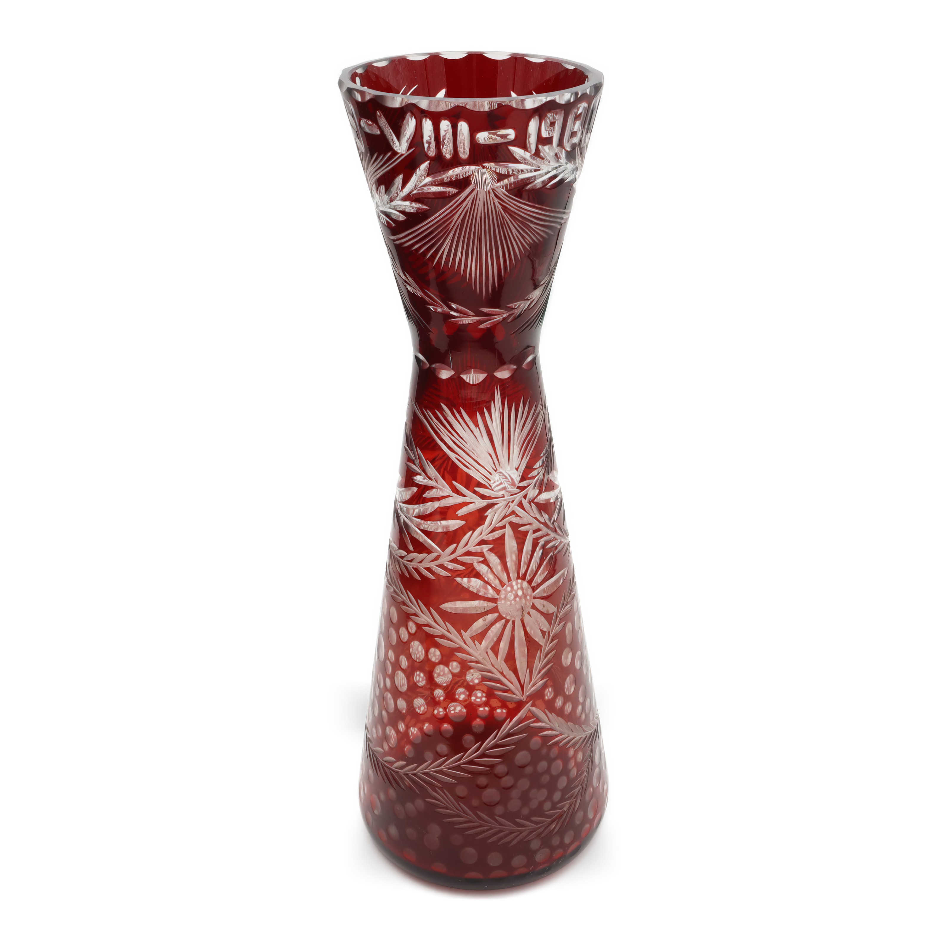 This is a Cut Crystal Slim Hourglass Vase made from stunning red Bohemia glass. Produced in 1980, it’s a beautiful decorative piece that stands 10 inches tall and has a…