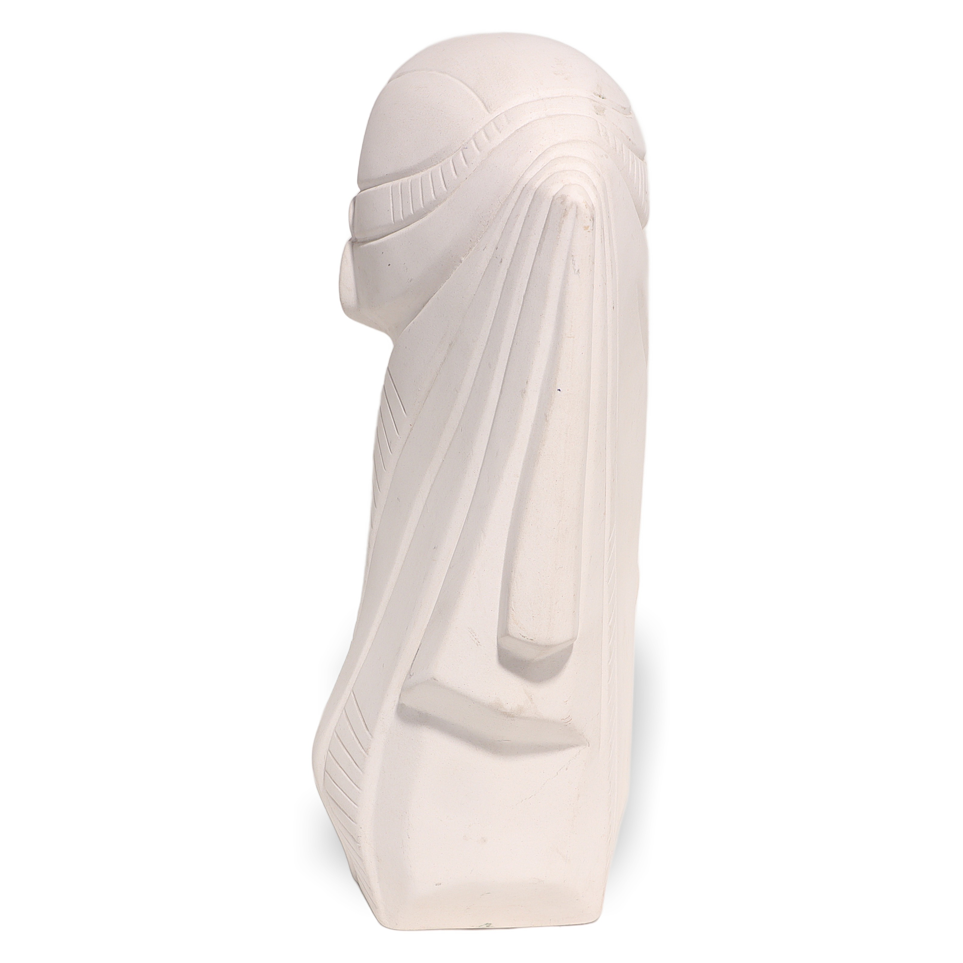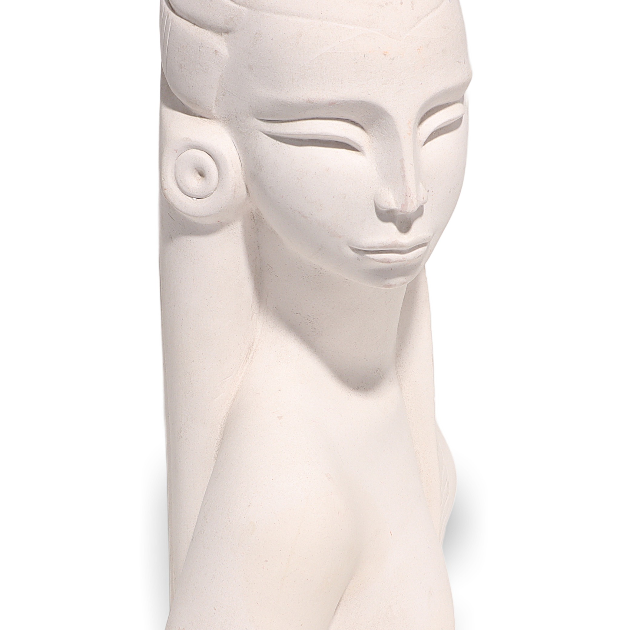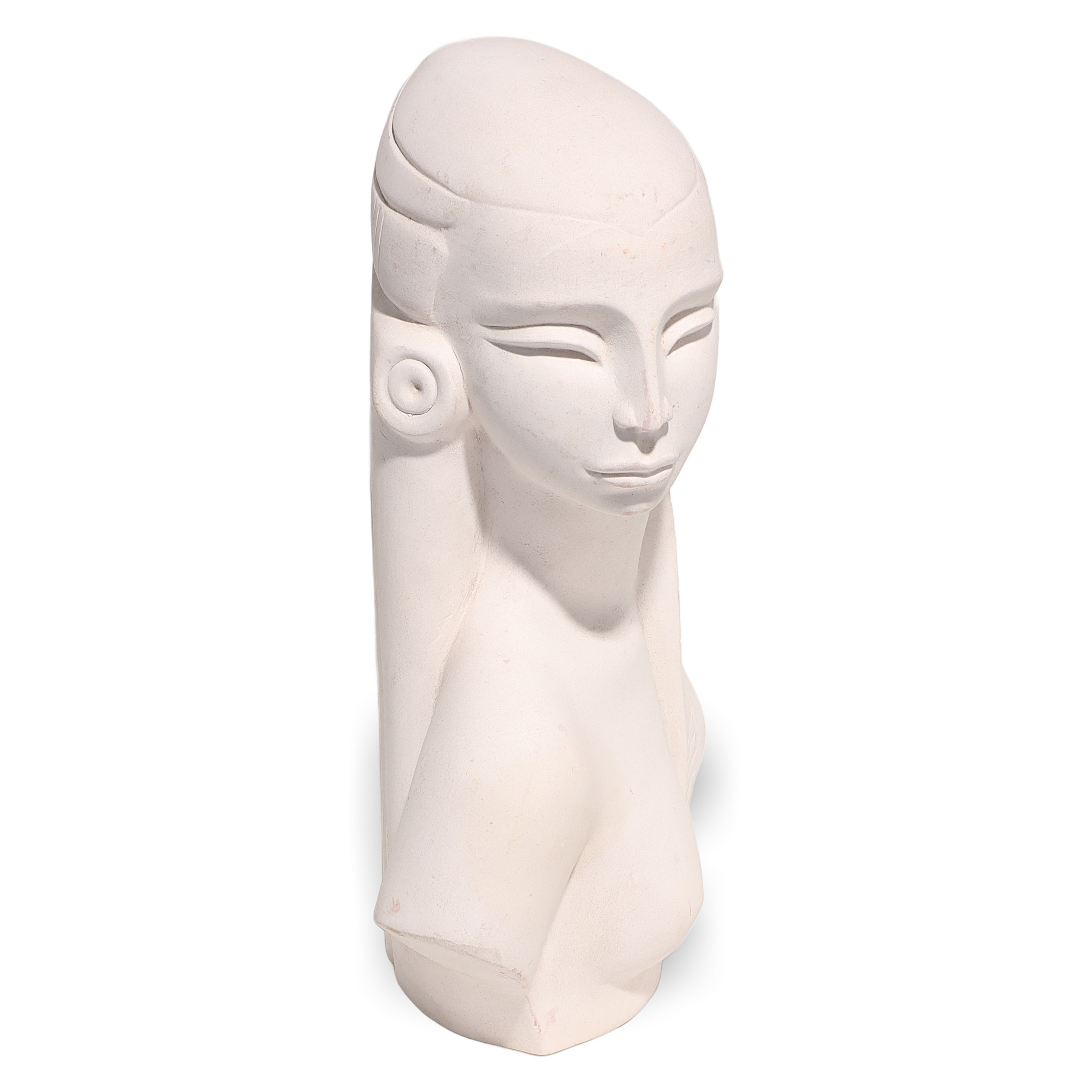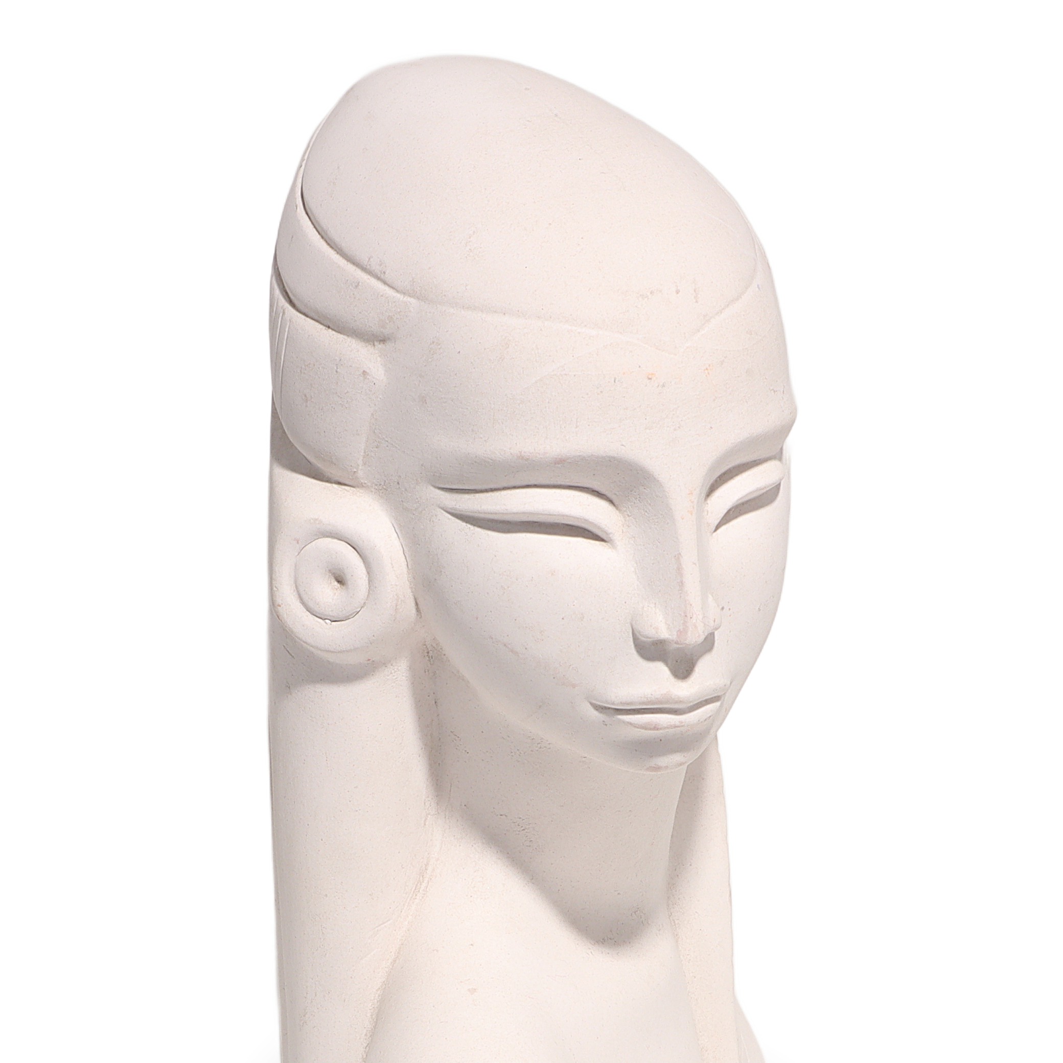 This beautiful artifact is a vintage Egyptian Woman Bisque Porcelain Statue, dating back to around 1970. Standing at 9 inches high, 6 inches wide, and 3 inches deep, it makes an impressive display as a piece of collectible home decor. The statue features a serene, stylized bust of an Egyptian woman, with classic features like elongated eyes, a sculpted headdress, and large round earrings, recalling the art and mystique of ancient Egypt. Even after more than 50 years, this figurine is in near mint condition, with clean white porcelain and minimal signs of wear, making it quite a find for collectors or anyone with a love for vintage objects.