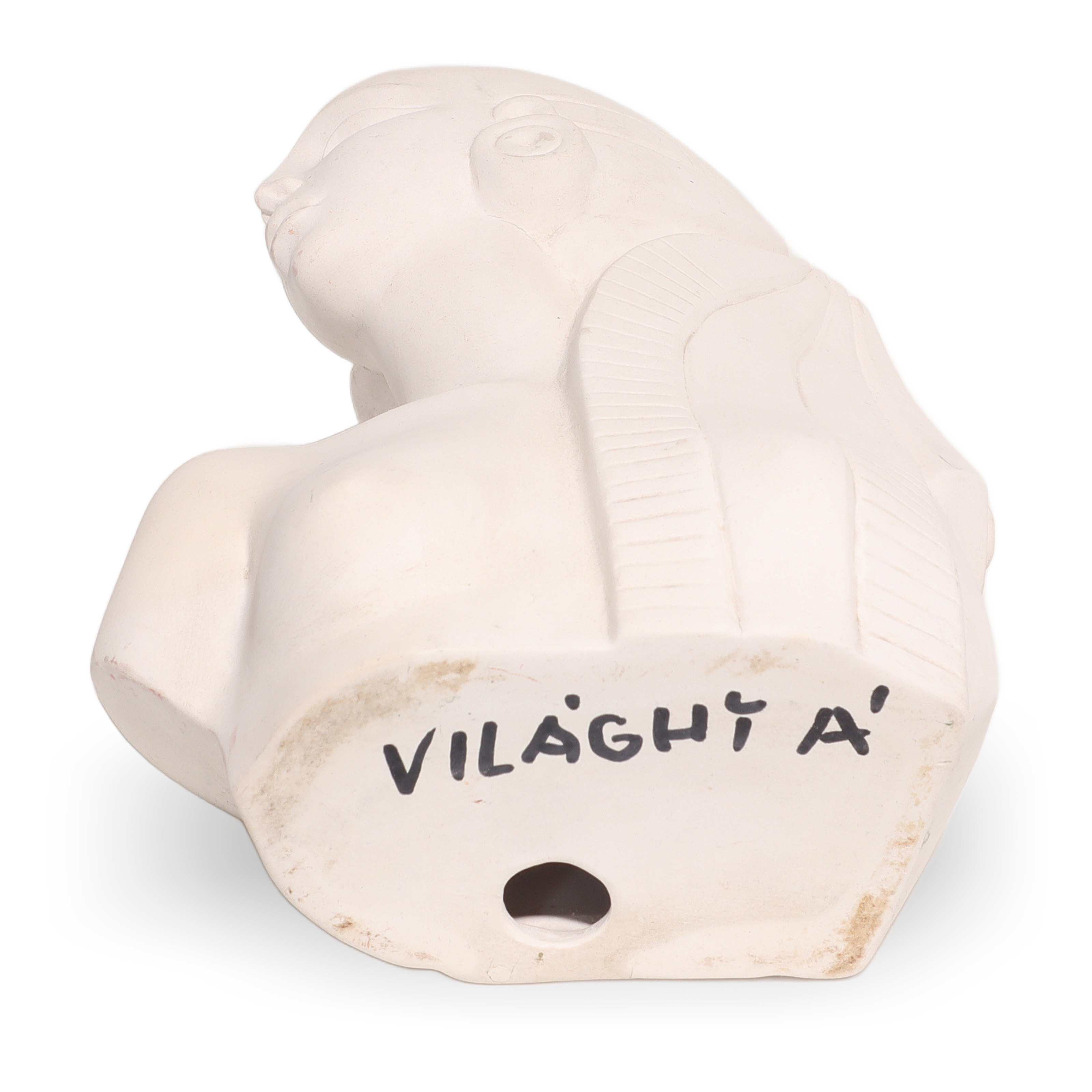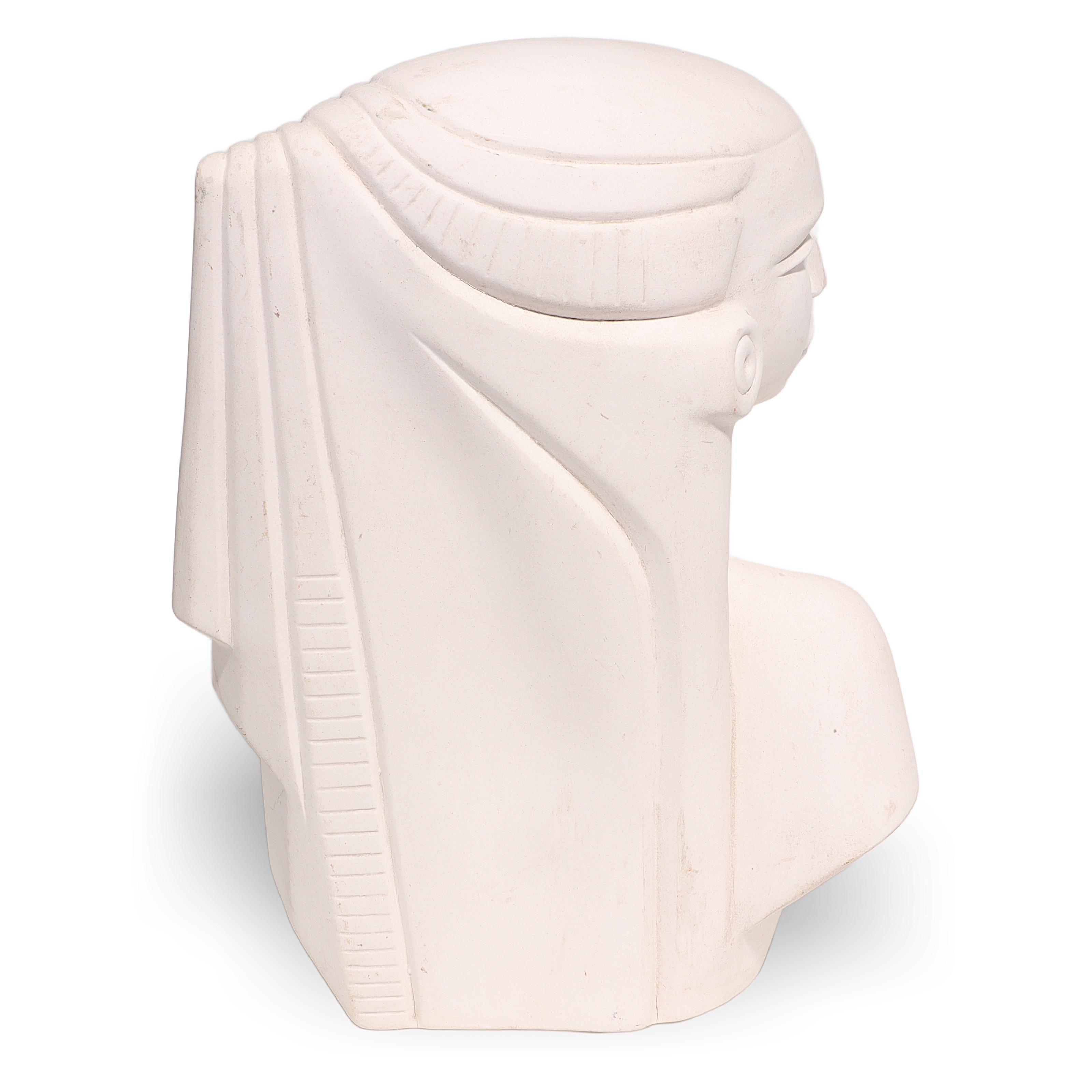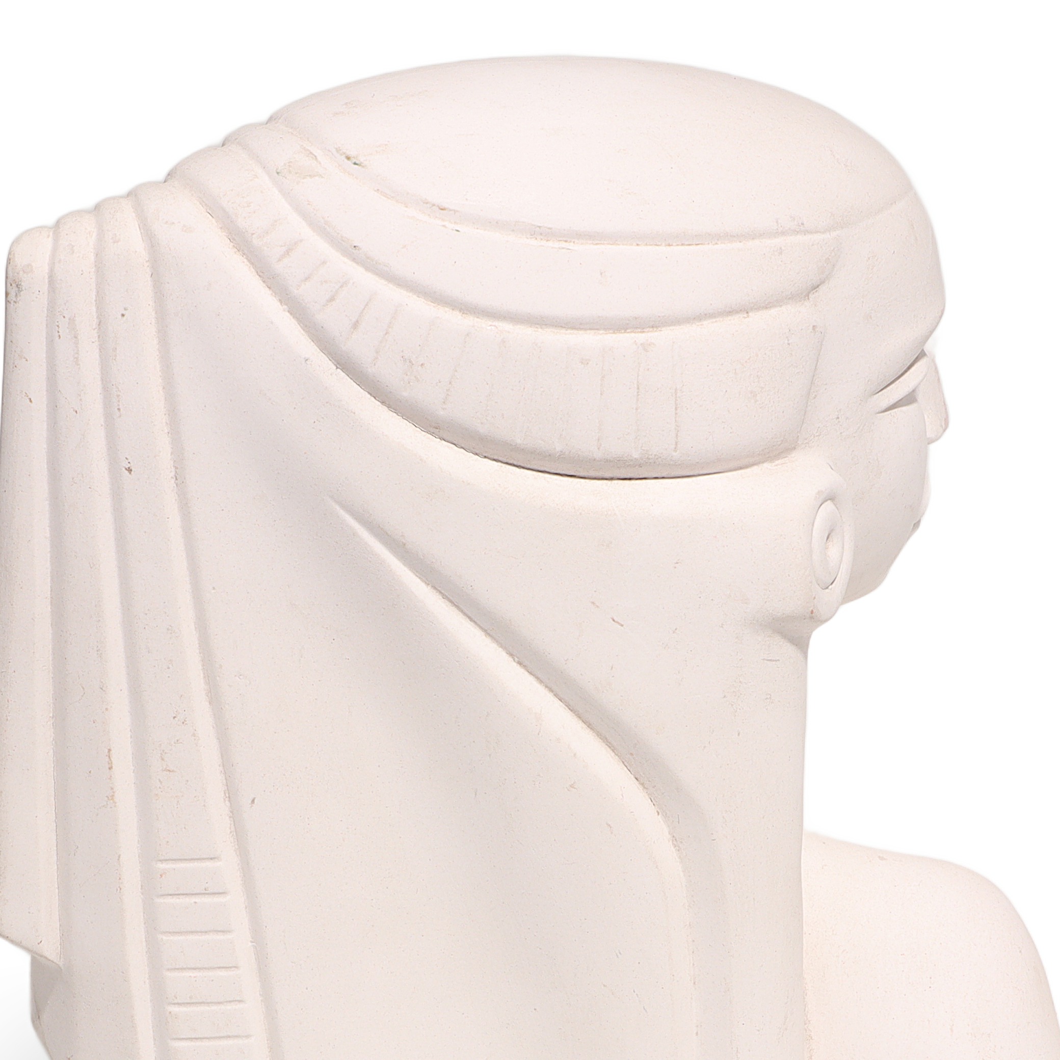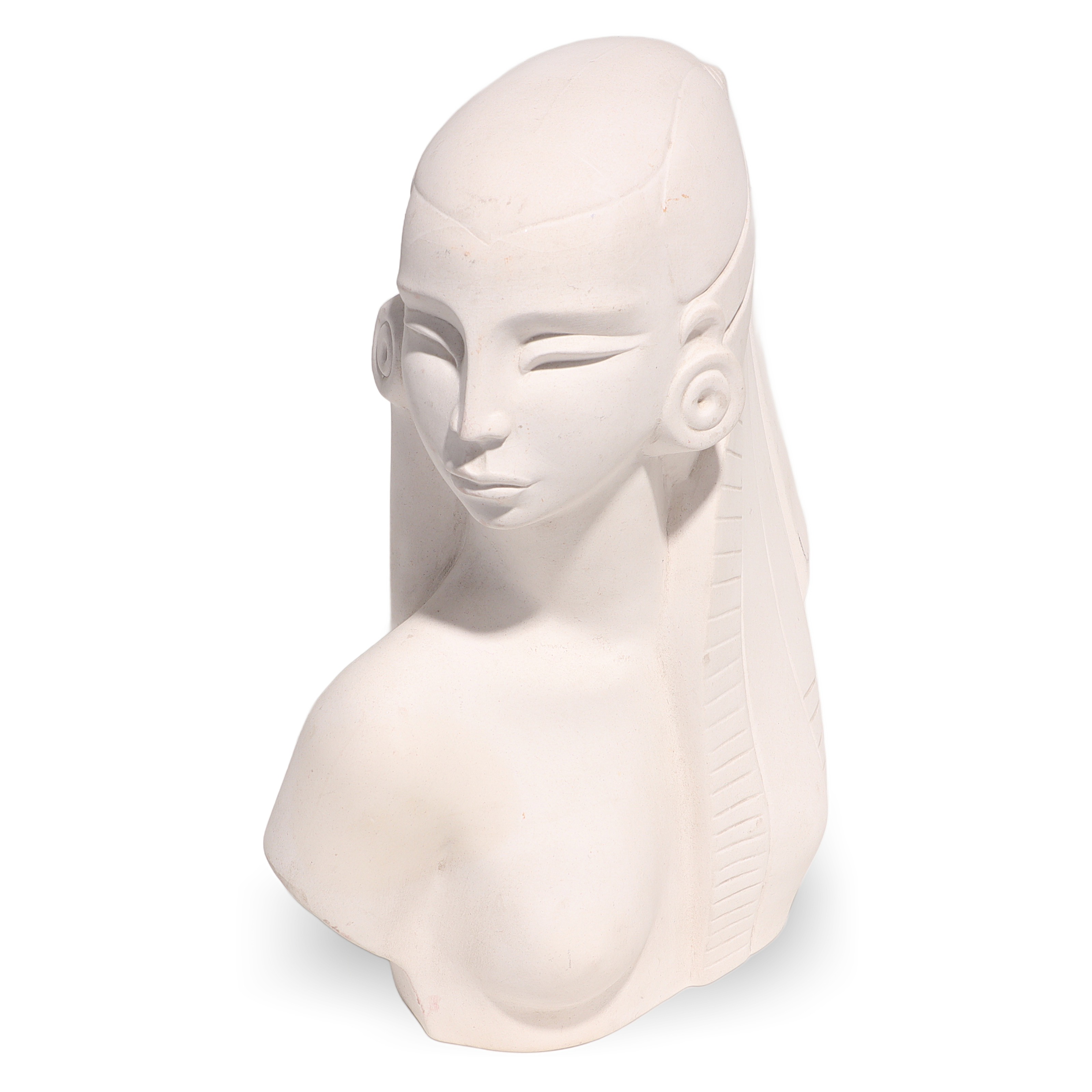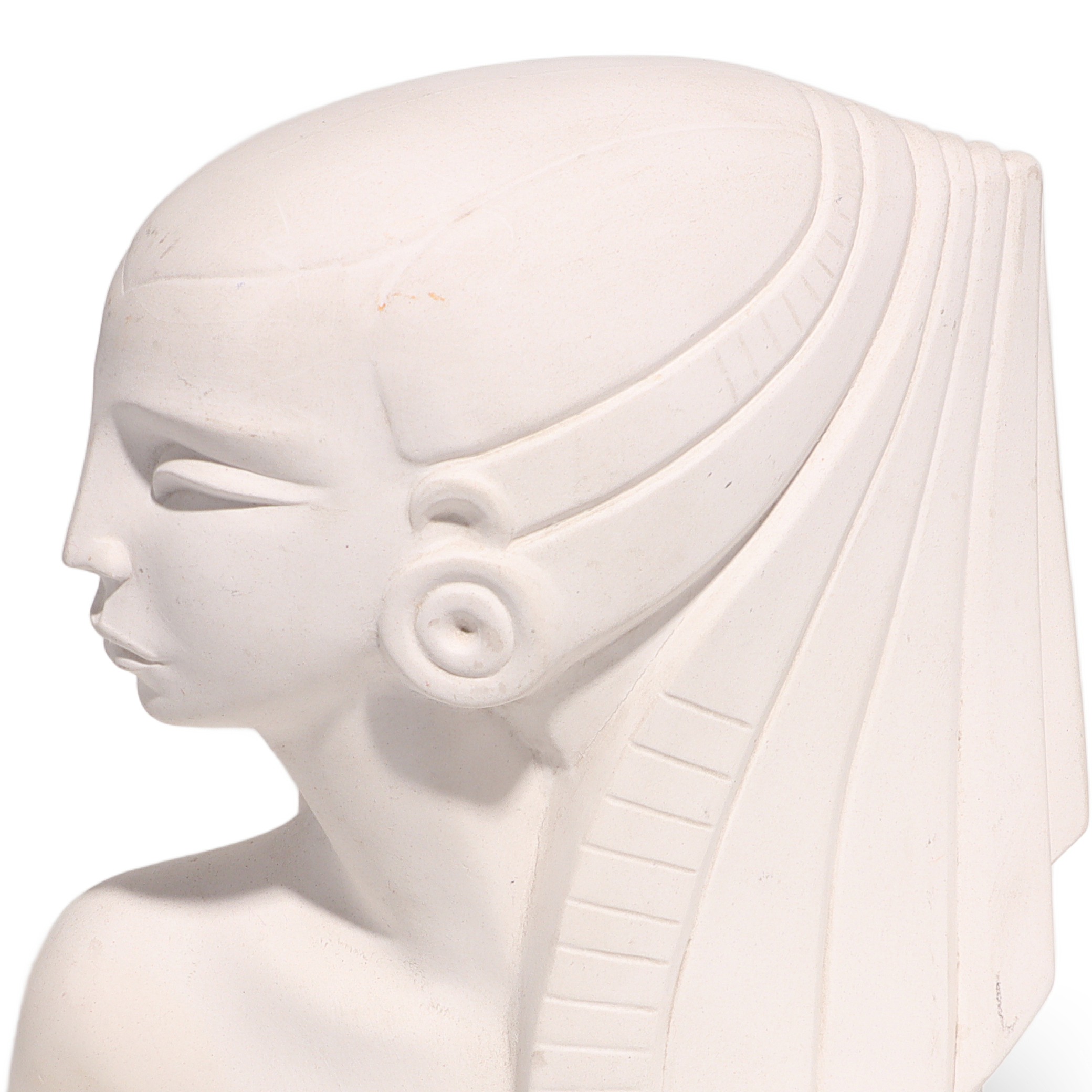 This beautiful artifact is a vintage Egyptian Woman Bisque Porcelain Statue, dating back to around 1970. Standing at 9 inches high, 6 inches wide, and 3 inches deep, it makes an impressive display as a piece of collectible home decor. The statue features a serene, stylized bust of an Egyptian woman, with classic features like elongated eyes, a sculpted headdress, and large round earrings, recalling the art and mystique of ancient Egypt. Even after more than 50 years, this figurine is in near mint condition, with clean white porcelain and minimal signs of wear, making it quite a find for collectors or anyone with a love for vintage objects.