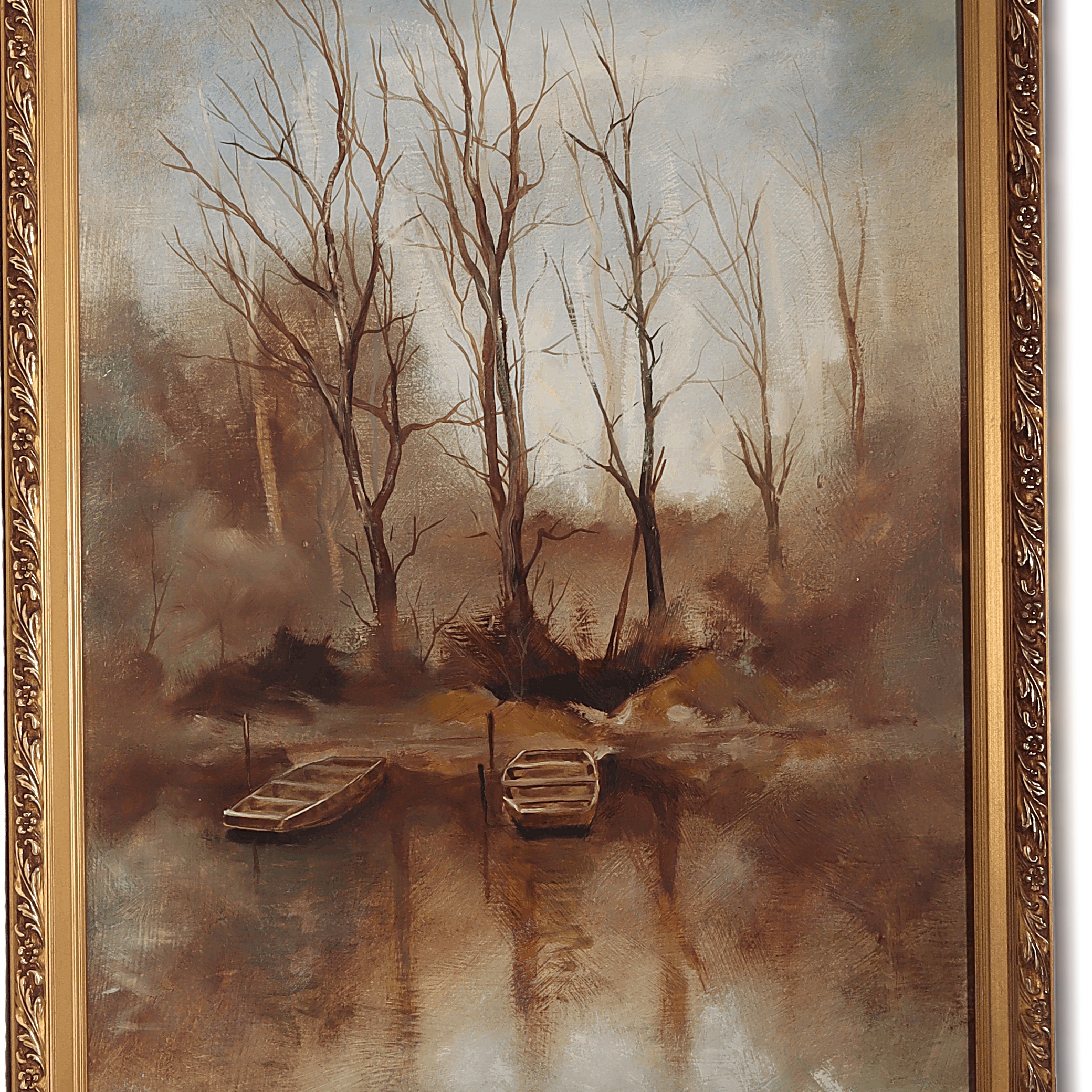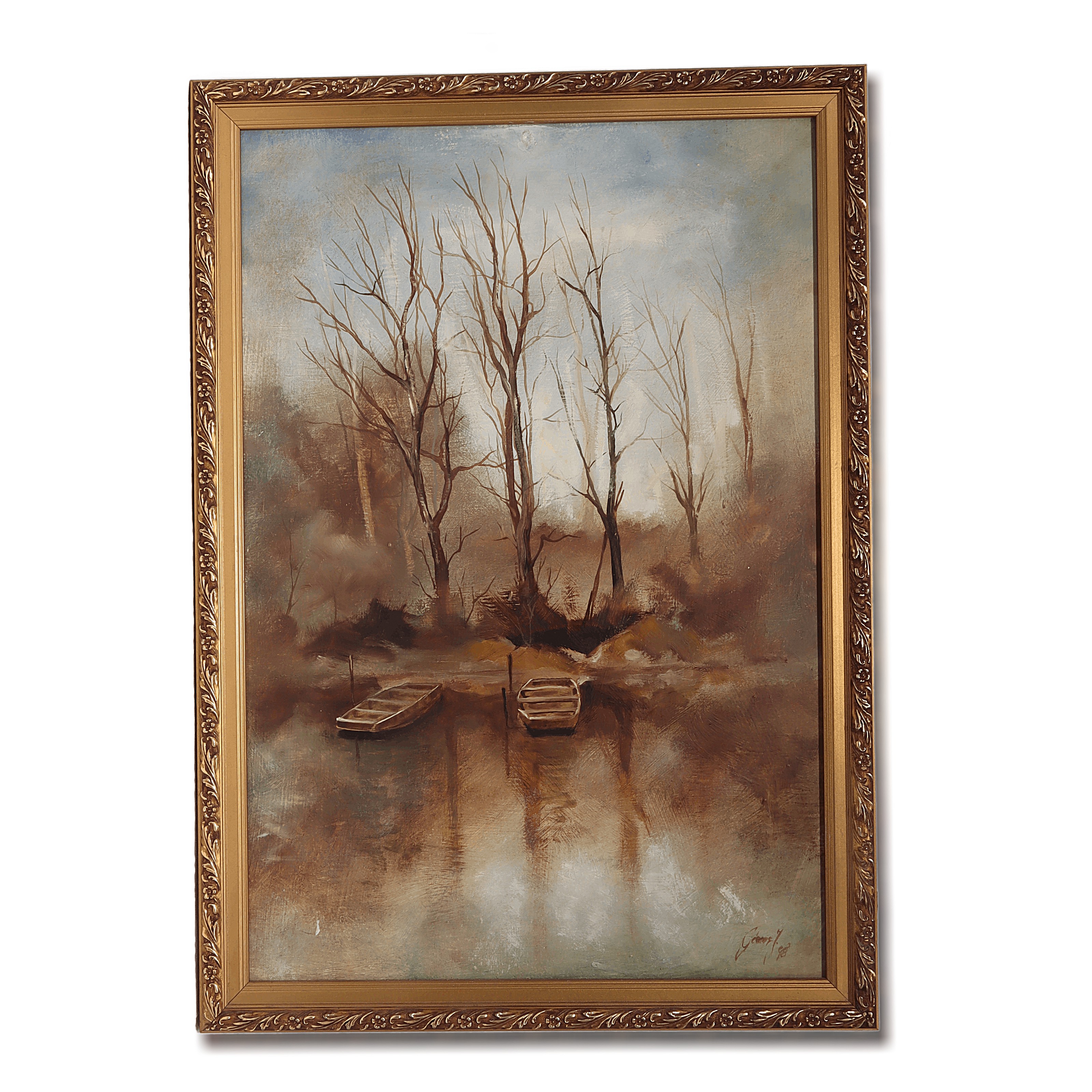 This is a Gemes J vintage framed landscape oil painting on panel from 1998, titled “Bare Trees Rustic Serenity.” The artwork beautifully captures a quiet, reflective moment with leafless trees standing by the water’s edge, where two simple rowboats are docked. The earthy, muted tones set a calm and peaceful mood, making it easy to imagine this spot as a secluded place for quiet walks or morning fishing trips. Measuring 20 inches high by 14 inches wide, the piece is set in an ornate frame that’s got enough classic detailing to give it a rich, old-fashioned vibe without being too fussy. Even though it’s from the late ‘90s, this painting feels like a scene from a much earlier era—maybe that’s what makes it so charming.