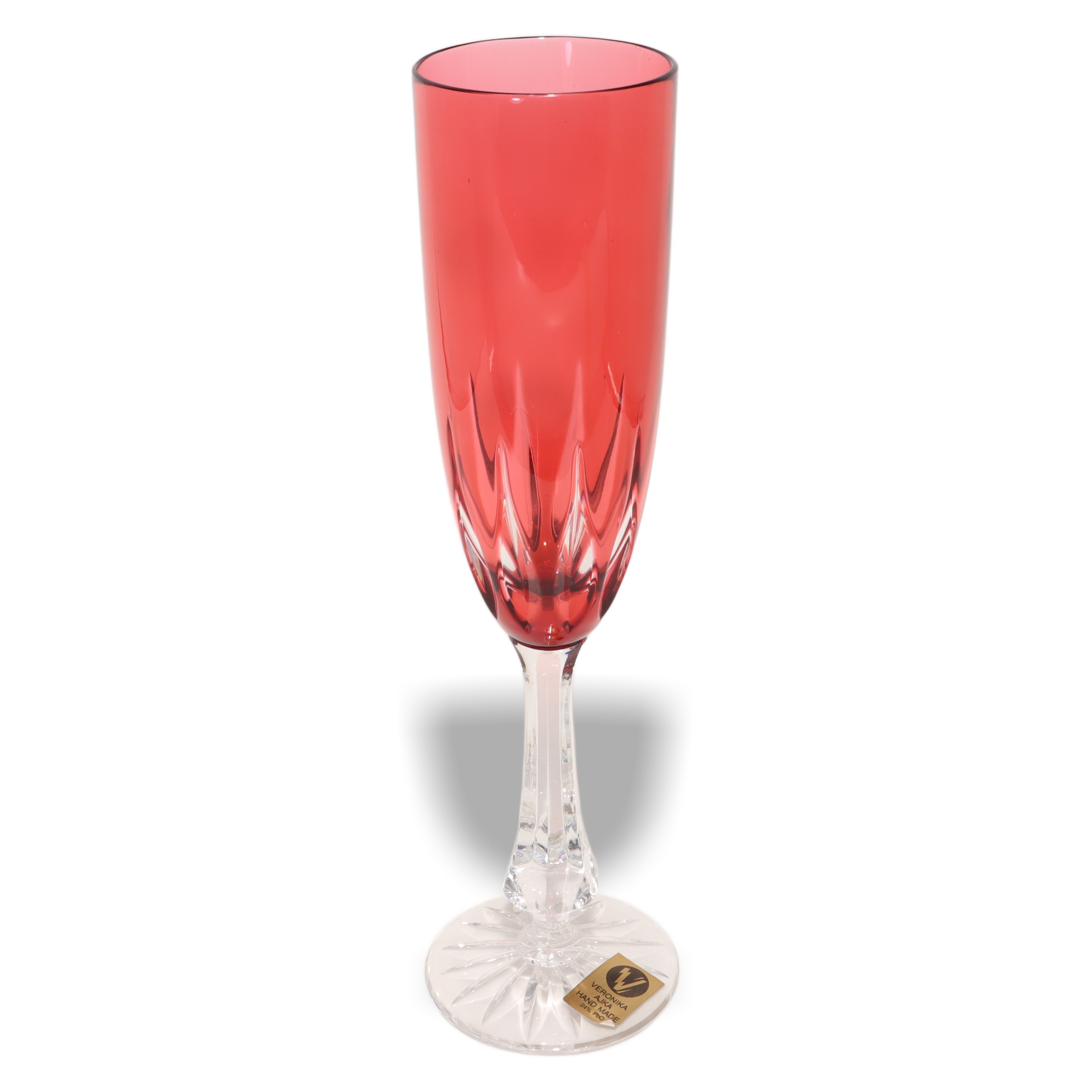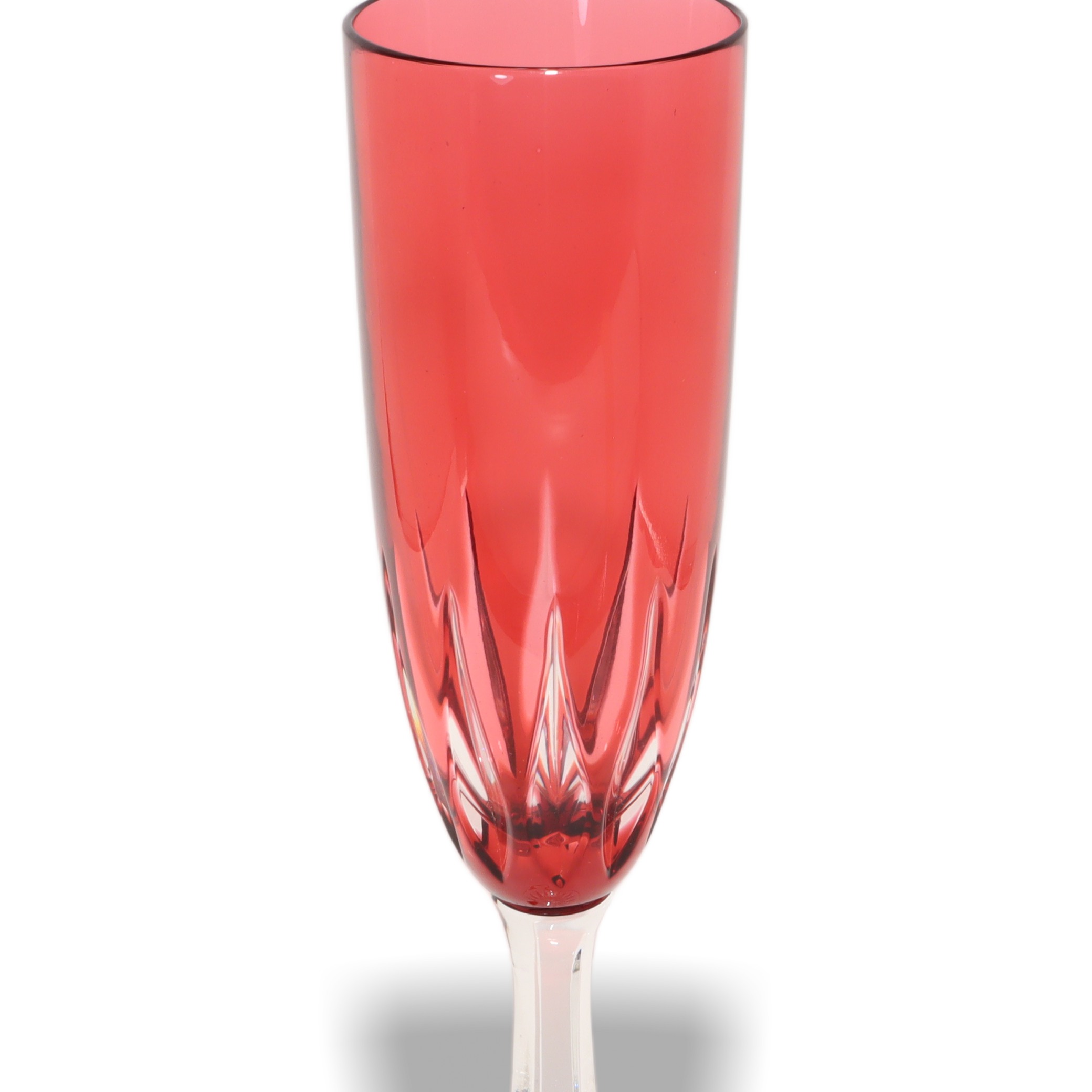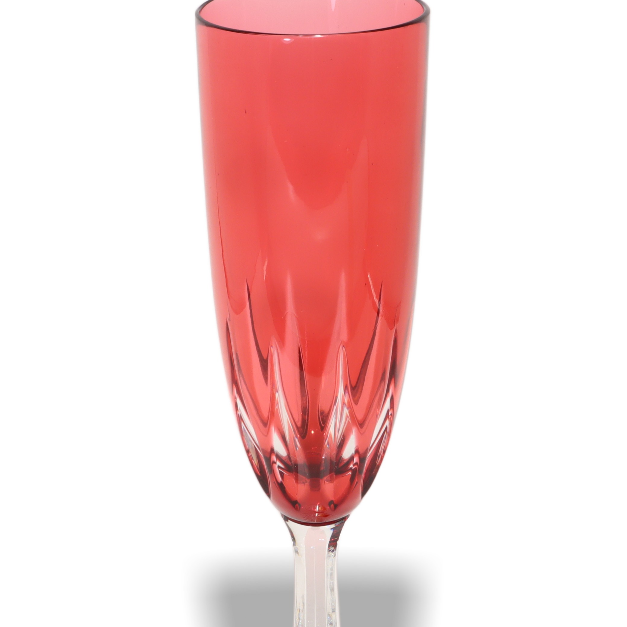 This lovely piece is from a vintage set of hand cut crystal champagne glasses, made by Ajka in Hungary around 1970. What you’ll notice right away is the beautiful red crystal on top, which gradually blends into a clear, detailed stem and foot, catching the light and throwing little rainbows. Measuring 10 inches tall, it’s got a graceful and tall shape that makes it perfect for raising a toast at a special occasion. The glass is in near mint condition, looking as fresh as the day it was made over 50 years ago. If you’re used to today’s mass-produced glassware, this is something special—each glass is unique because it was cut by hand, not by a machine. With a set of six like this, it would really stand out on a dinner table or in a home bar, catching the eye of anyone who appreciates something nostalgic and well-made.