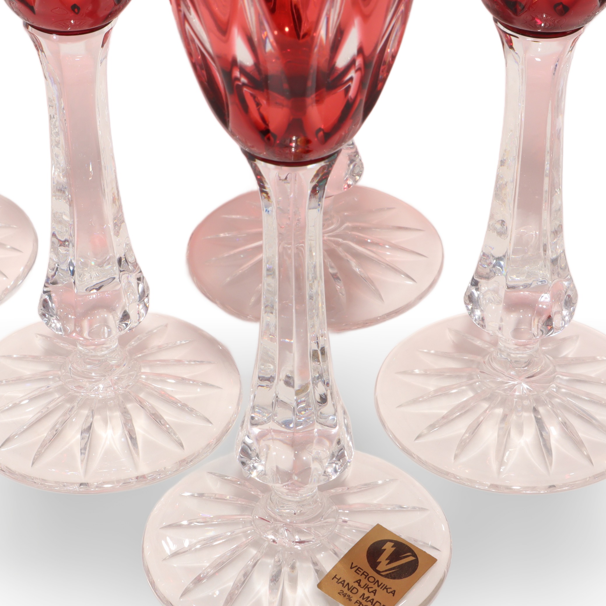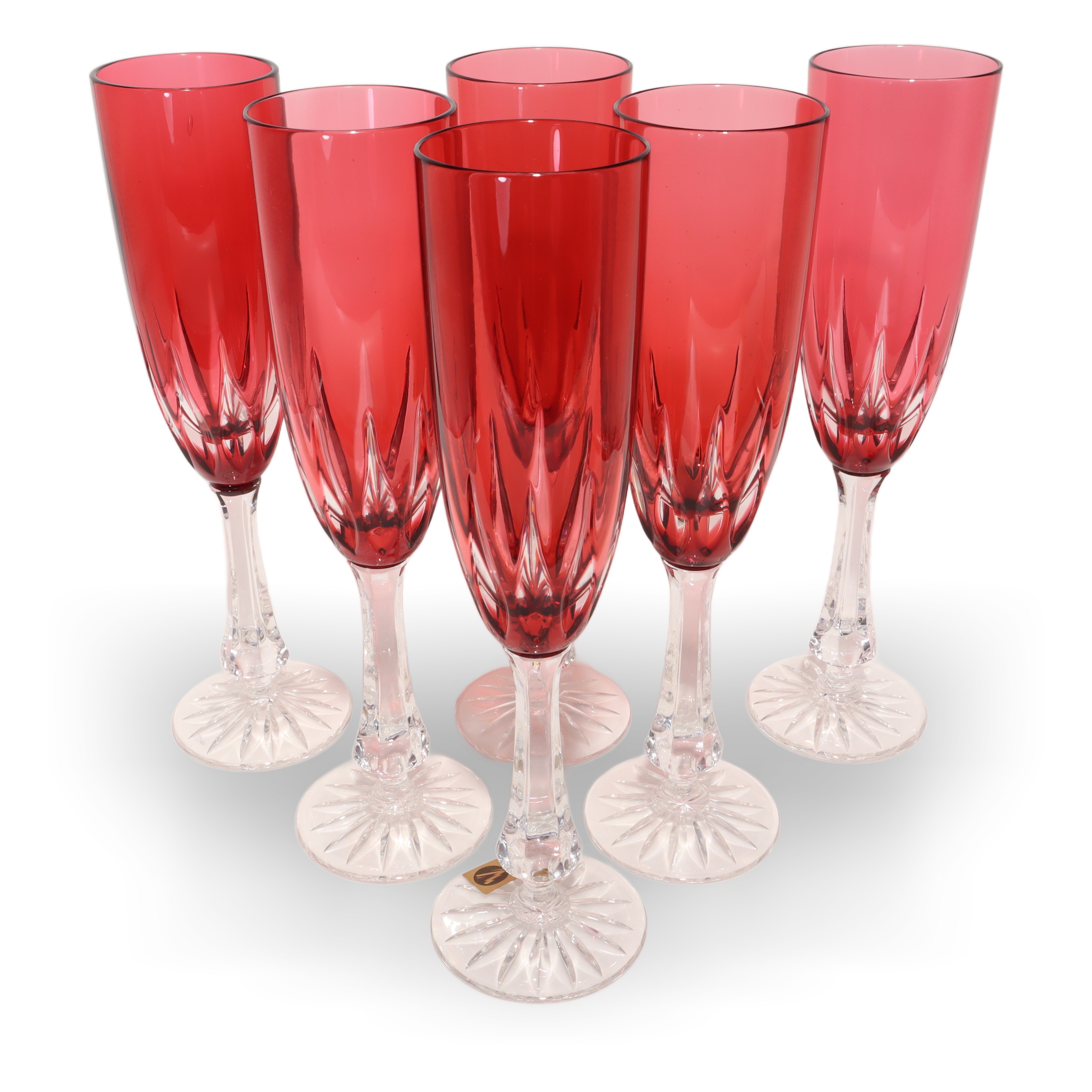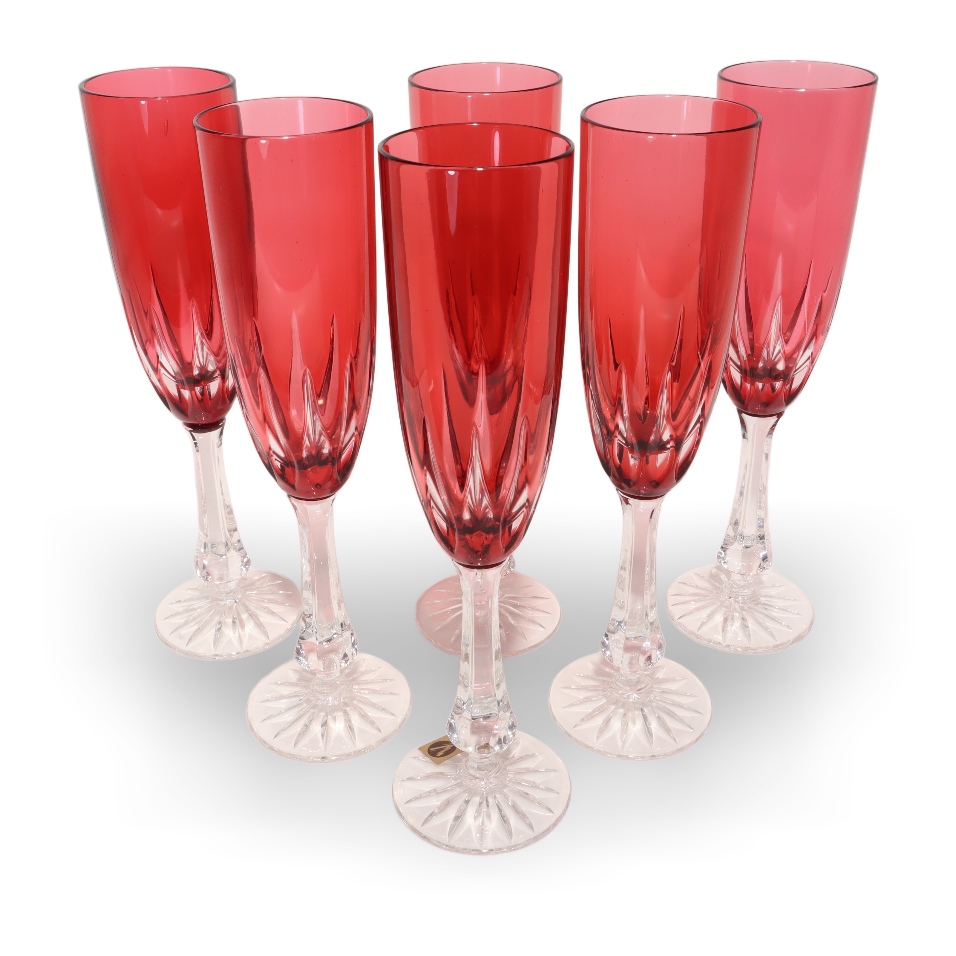This lovely piece is from a vintage set of hand cut crystal champagne glasses, made by Ajka in Hungary around 1970. What you’ll notice right away is the beautiful red crystal on top, which gradually blends into a clear, detailed stem and foot, catching the light and throwing little rainbows. Measuring 10 inches tall, it’s got a graceful and tall shape that makes it perfect for raising a toast at a special occasion. The glass is in near mint condition, looking as fresh as the day it was made over 50 years ago. If you’re used to today’s mass-produced glassware, this is something special—each glass is unique because it was cut by hand, not by a machine. With a set of six like this, it would really stand out on a dinner table or in a home bar, catching the eye of anyone who appreciates something nostalgic and well-made.
