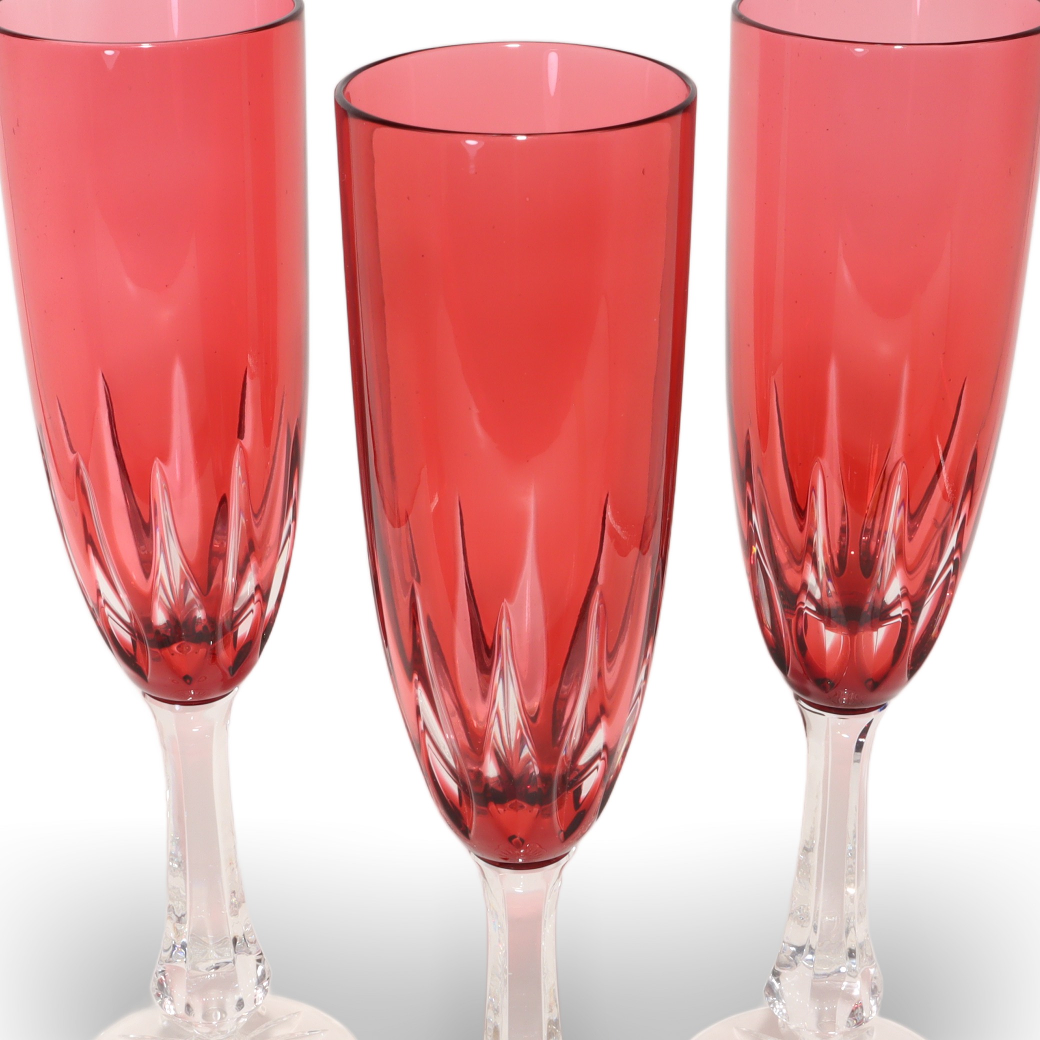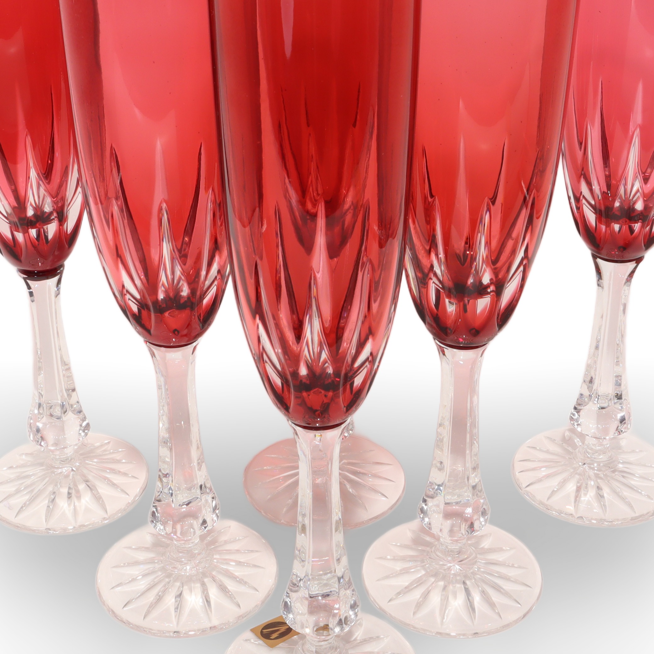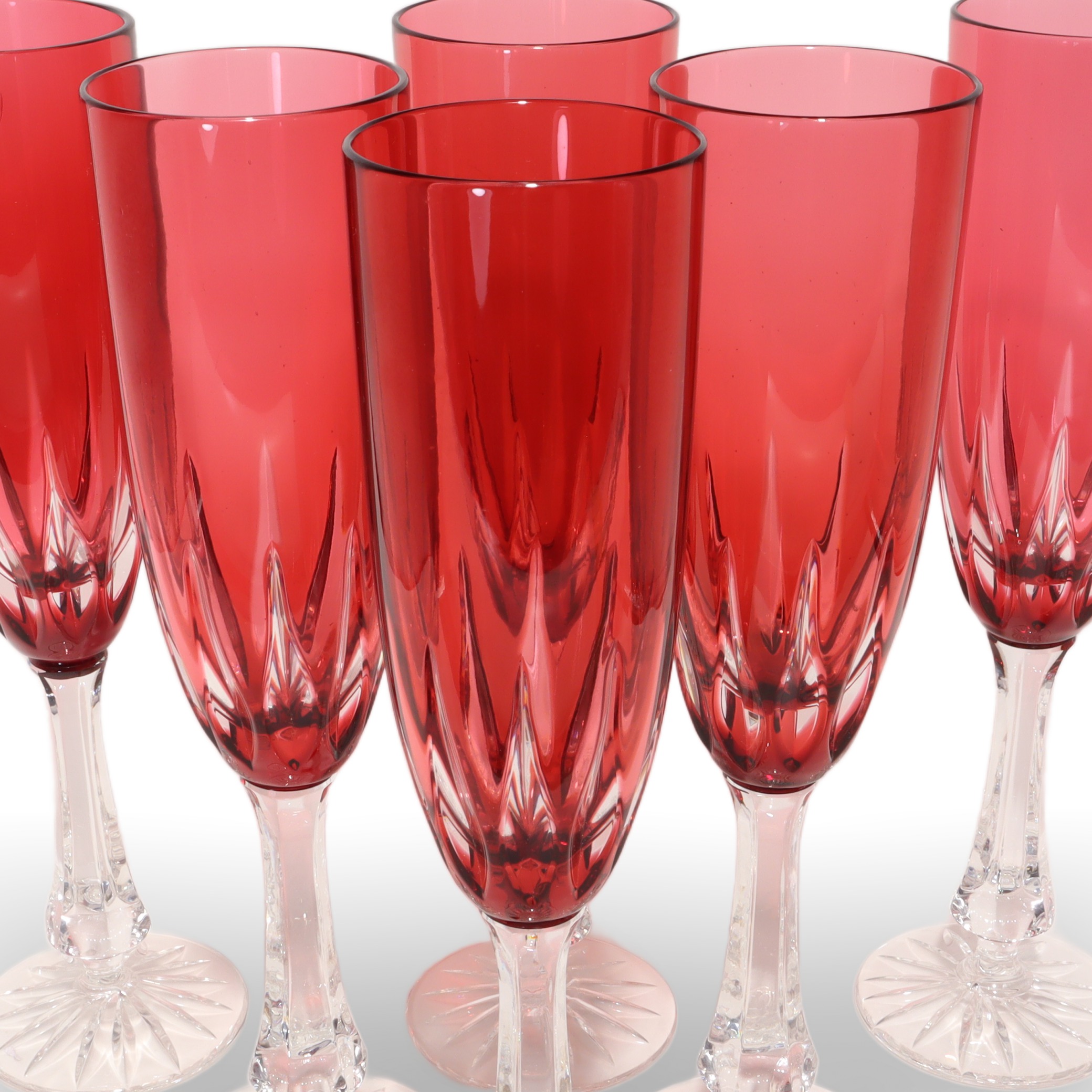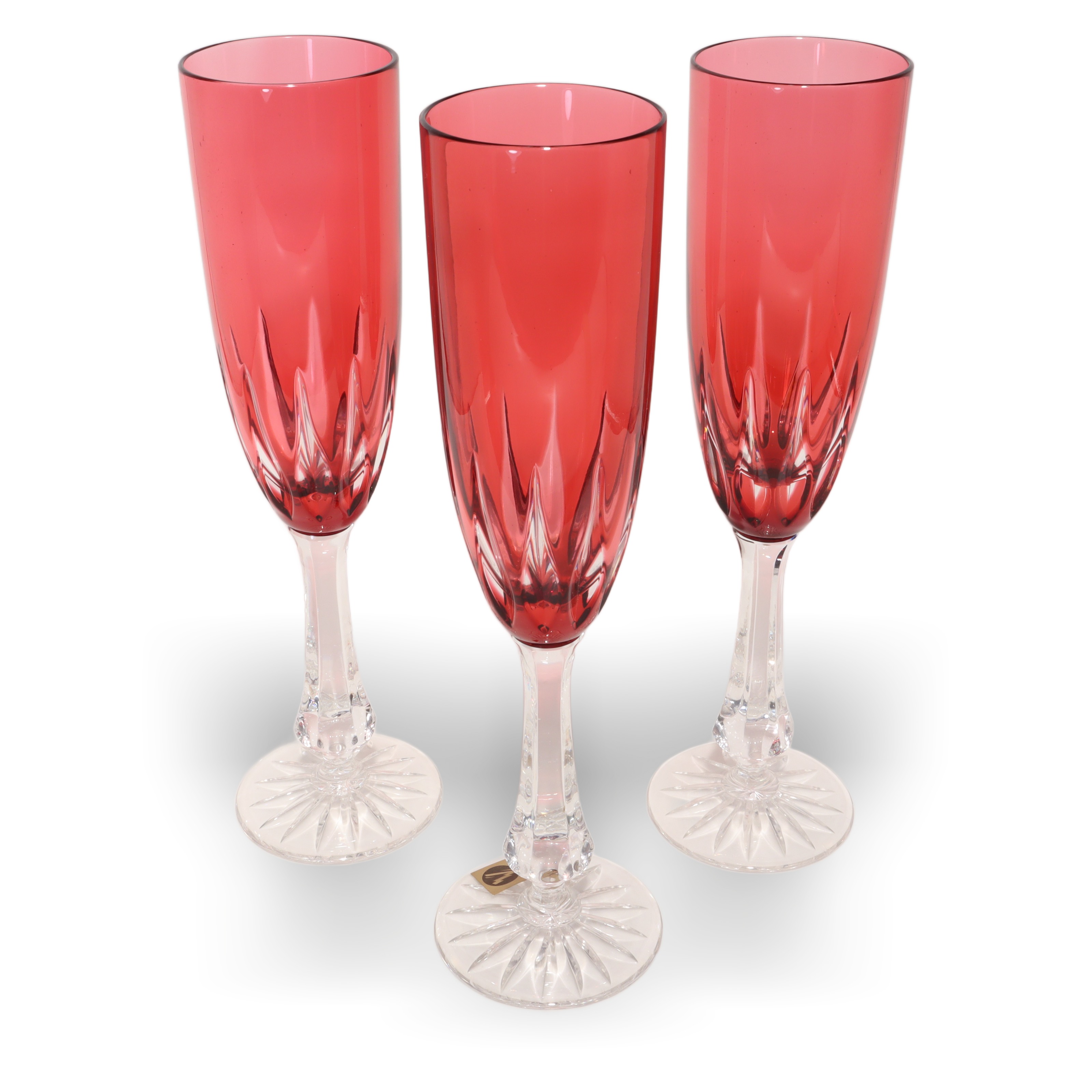 Ajka crystal has a real reputation for luxury. Founded in Hungary, the Ajka Crystal factory has been producing high-quality crystal since 1878, and for much of the twentieth century, they made glassware that was exported all over the world, especially to Western Europe and the United States. Their pieces are known for brilliant colors and precise, beautiful hand-cut patterns. This set of champagne glasses is no exception—it shows off the craftsmanship and vibrant styling Ajka is known for. These pieces are getting harder to find in such great shape, so when you come across a nearly mint set from the 1970s, it really is a rare treat. Collectors and fans of vintage barware love Ajka for these reasons, and you can see why just by picking up one of these dazzling glasses.