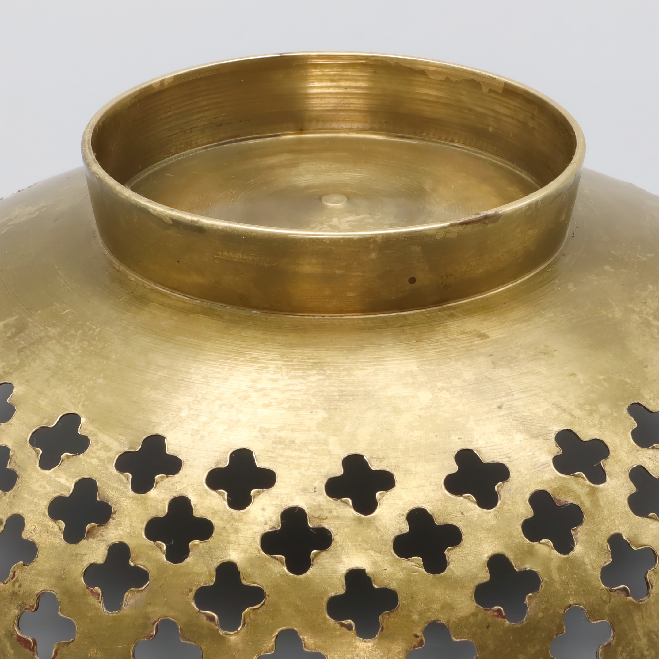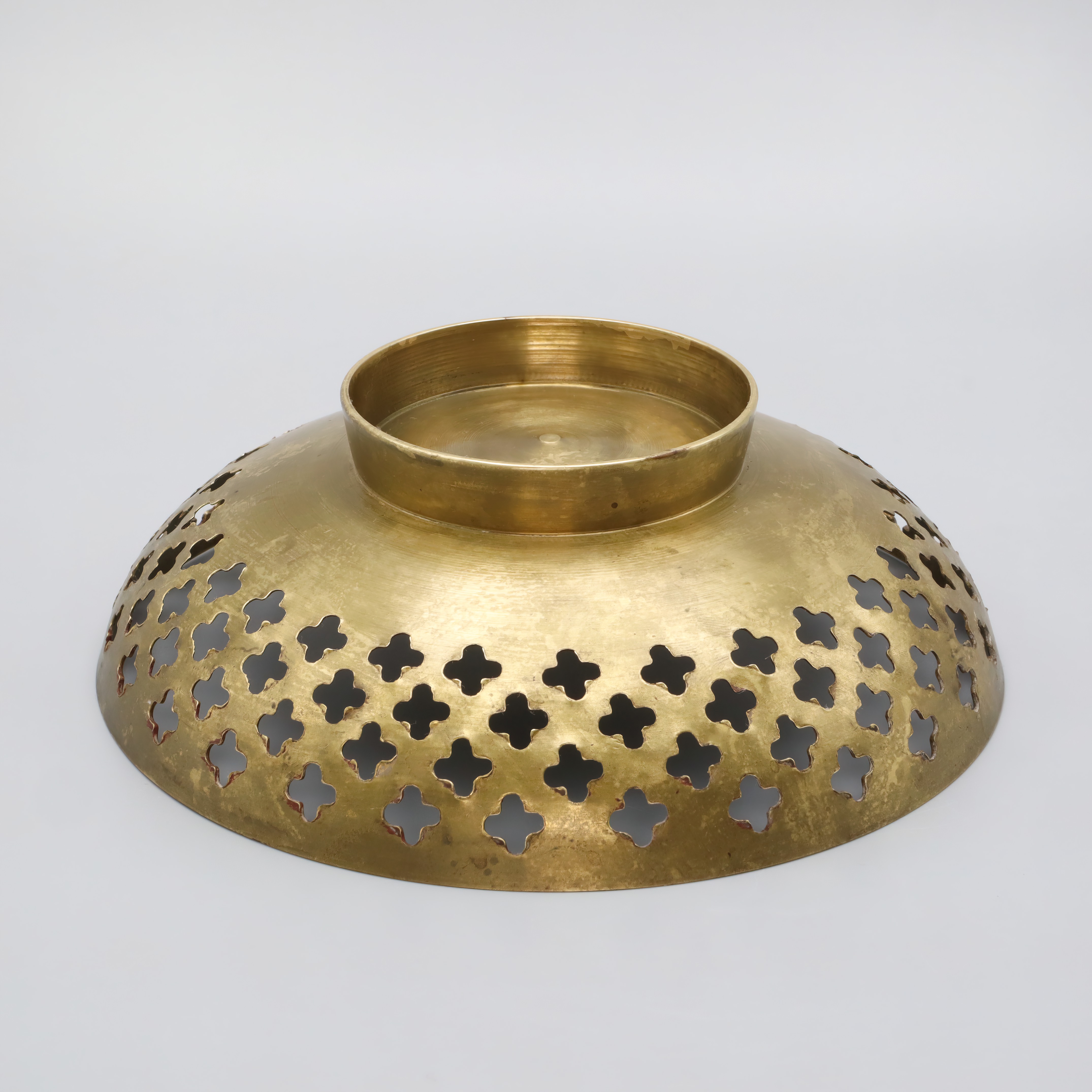 This is a beautifully crafted hand-made bronze fruit basket from around 1960. With its intricate Mediterranean style, this piece seamlessly blends functionality with rustic charm. It stands 2 inches tall and measures 6 inches in diameter, making it a perfect centerpiece for any boho-themed or vintage kitchen decor. Its pierced design showcases Spanish influences, offering not just utility but also an artistic flair to your table setting. The age of this basket gives it a certain rarity that adds to its appeal, and its very good plus condition suggests it has been well cared for over the years. It’s an eye-catching item that complements a variety of home styles, offering a timeless quality that you don’t often find in modern decor.