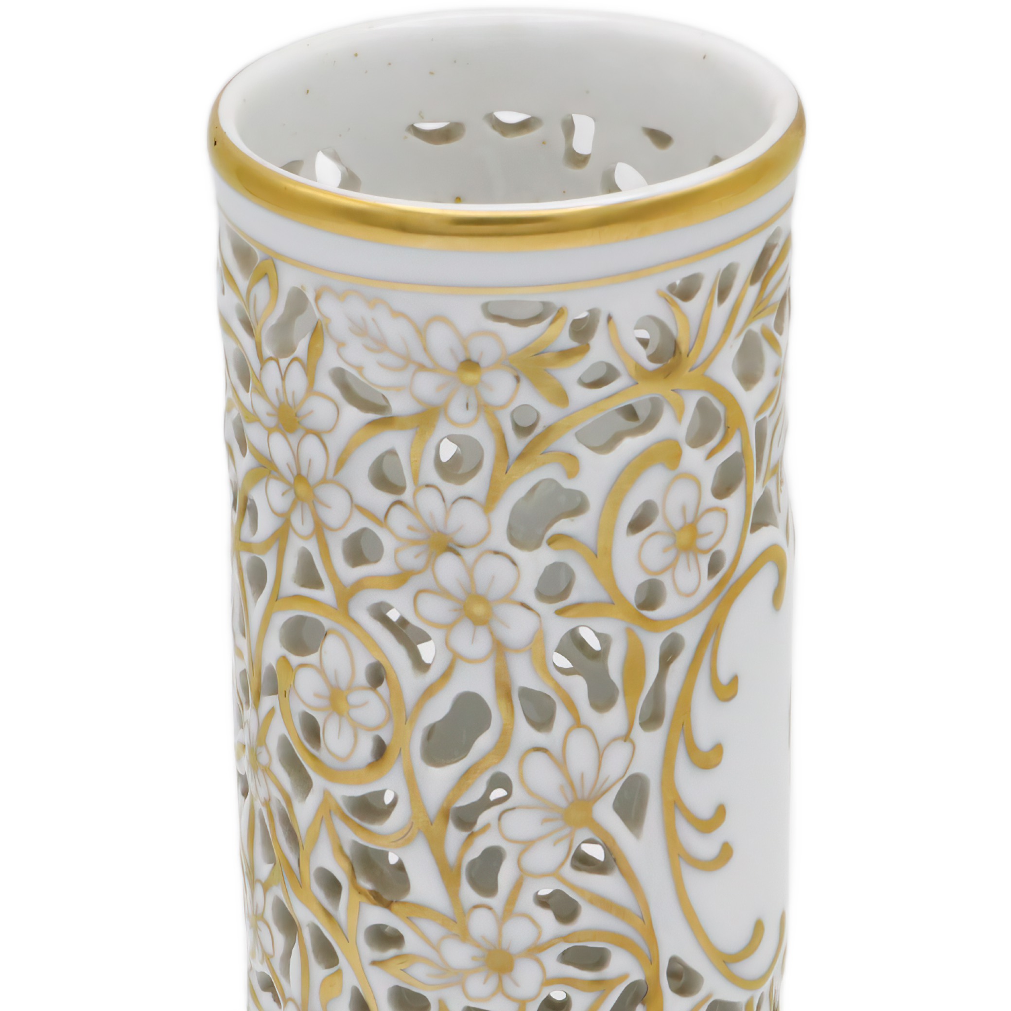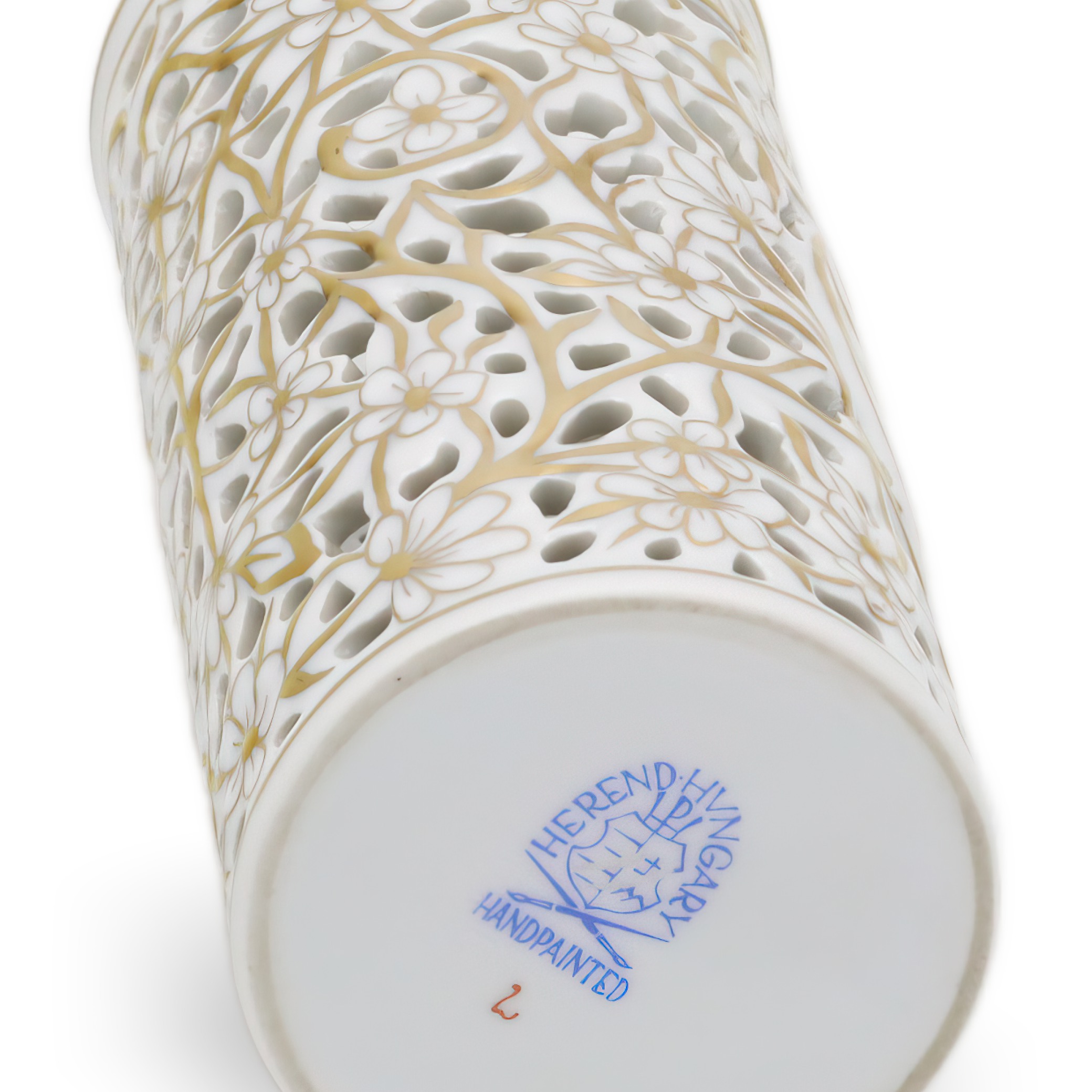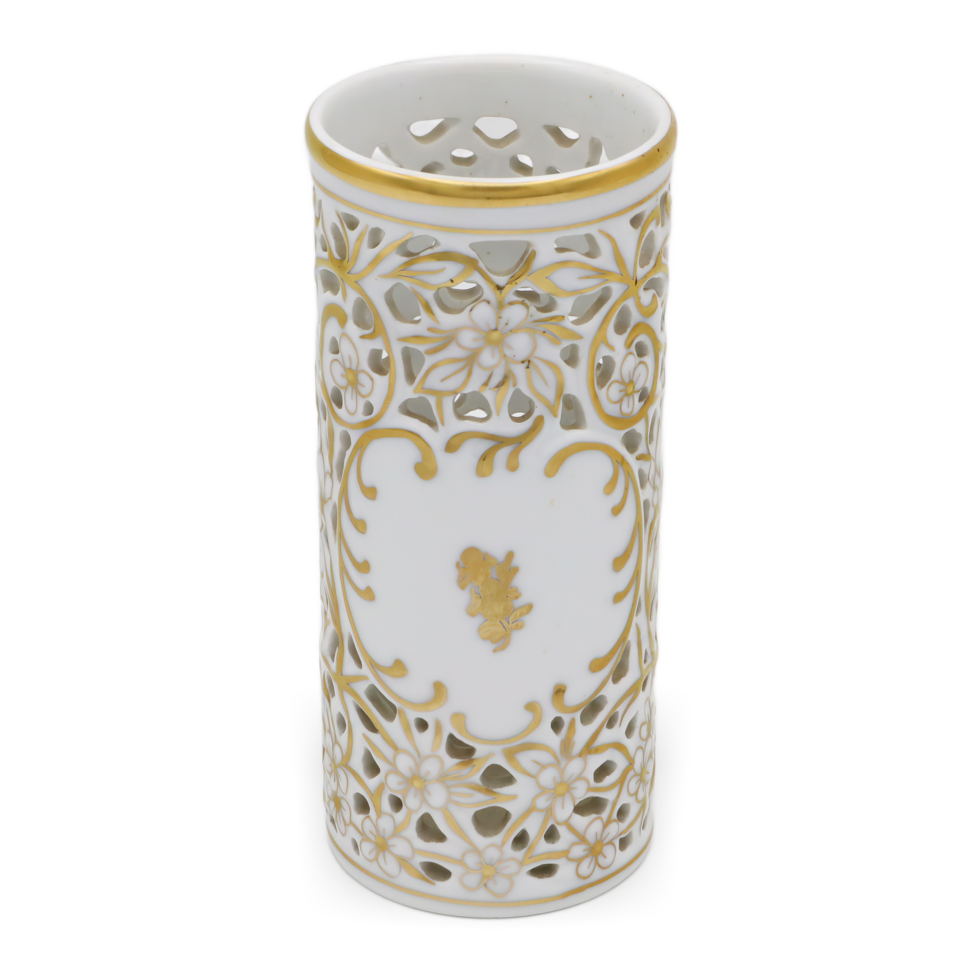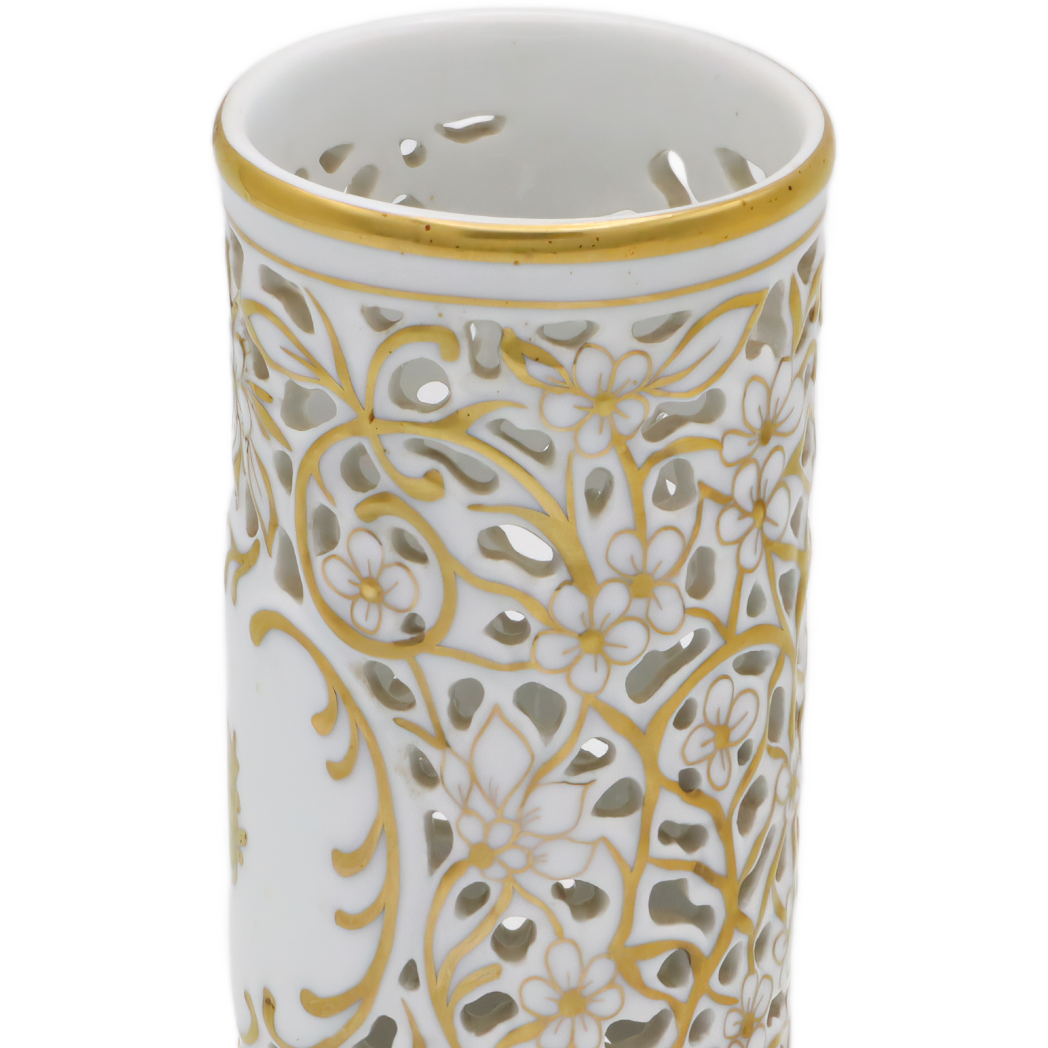 This stunning piece is a Herend Antique Openwork Vase from around 1930, and it really showcases just how elegant vintage porcelain can be. It’s fairly small, standing about 5 inches tall and only about 2 inches wide and long—making it perfect as a classy little centerpiece or an accent on a shelf. What really stands out is the detailed cutout work along the sides, forming a delicate floral pattern that’s highlighted with fine gold accents. It’s in near mint condition, which is rare for items this old, especially when you consider it’s nearly a century old. The white porcelain has stayed bright, and the gold decoration still has that beautiful, mellow shine that antique pieces pick up over the years.