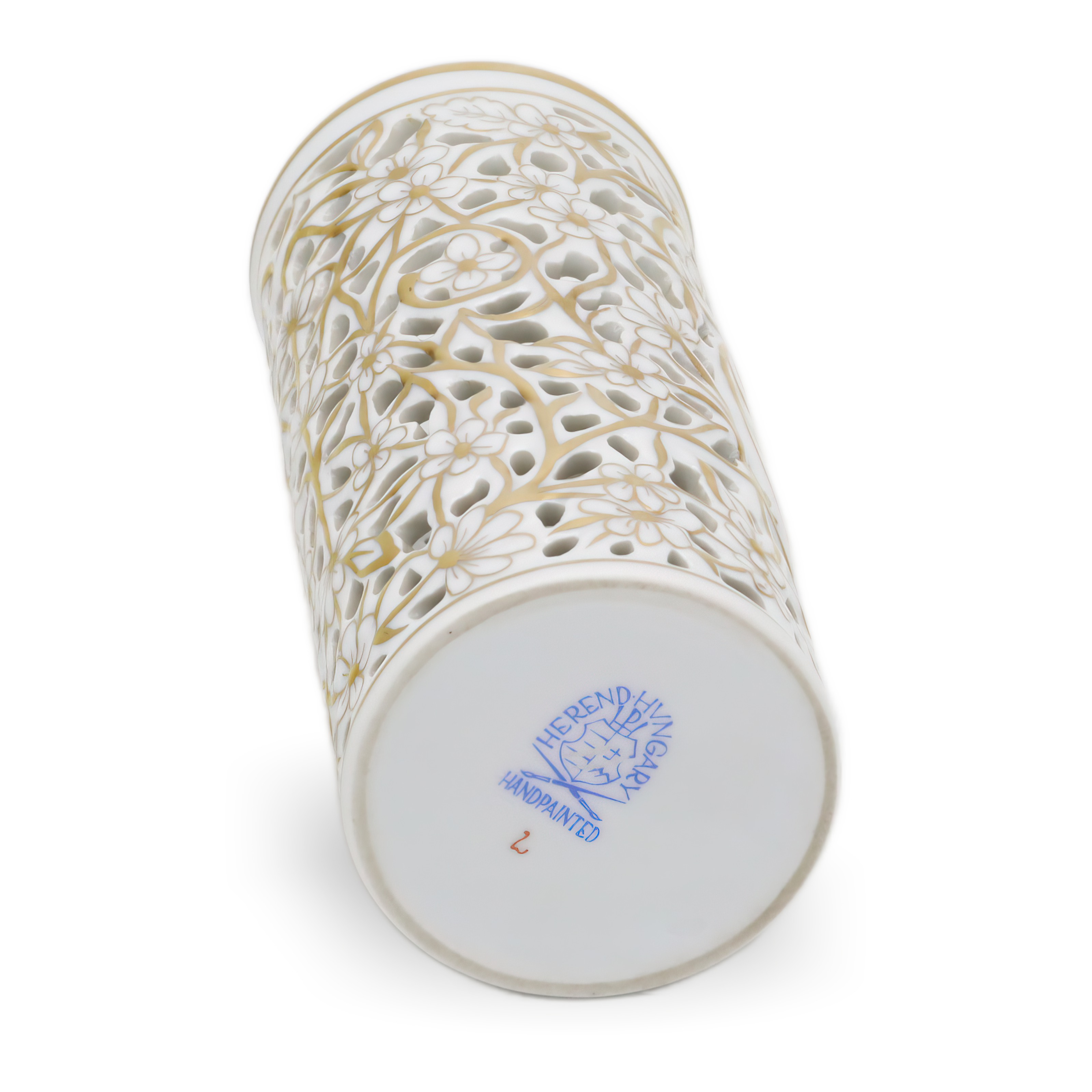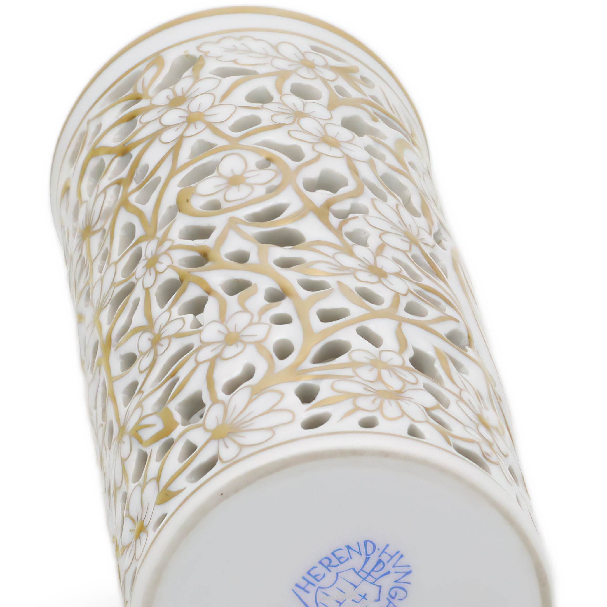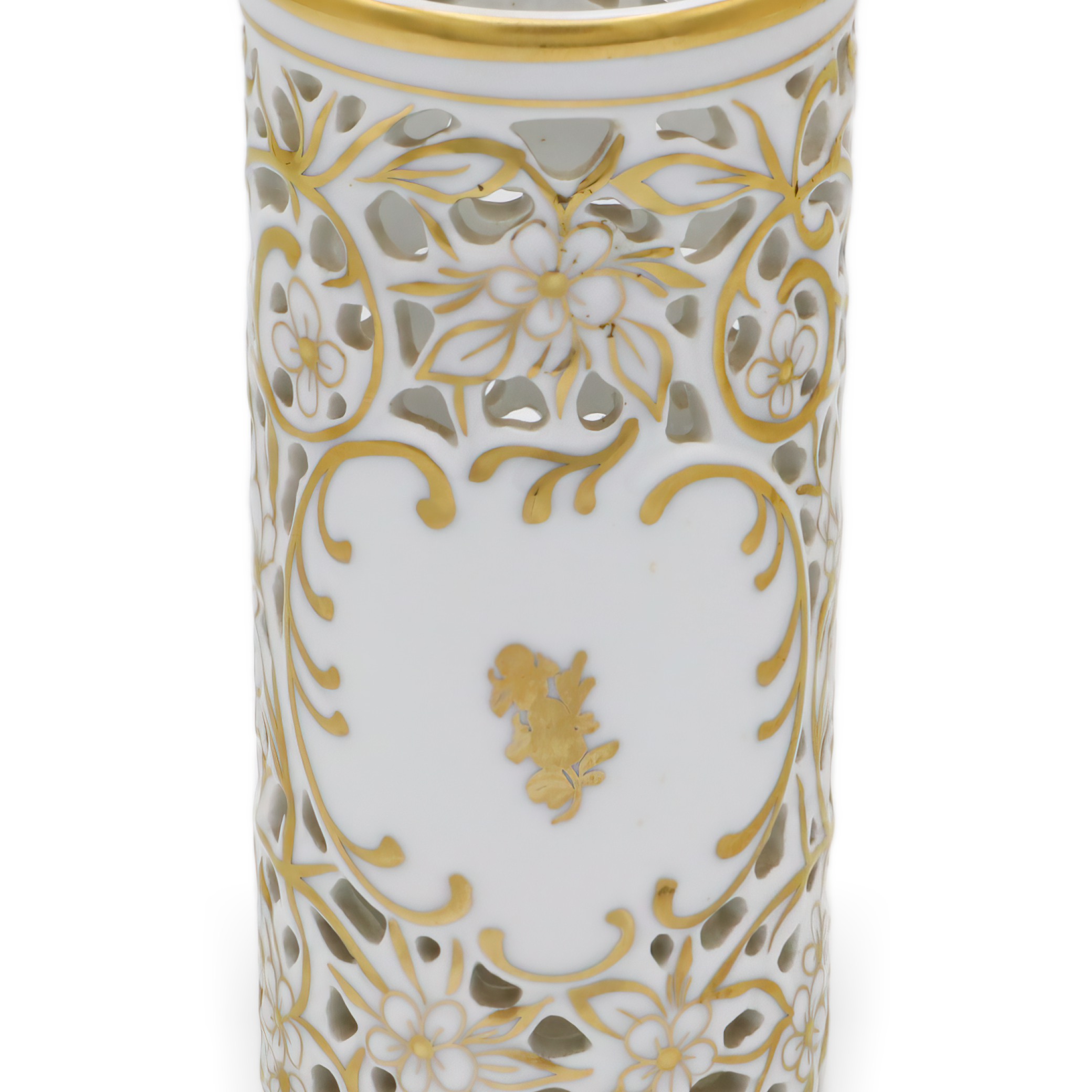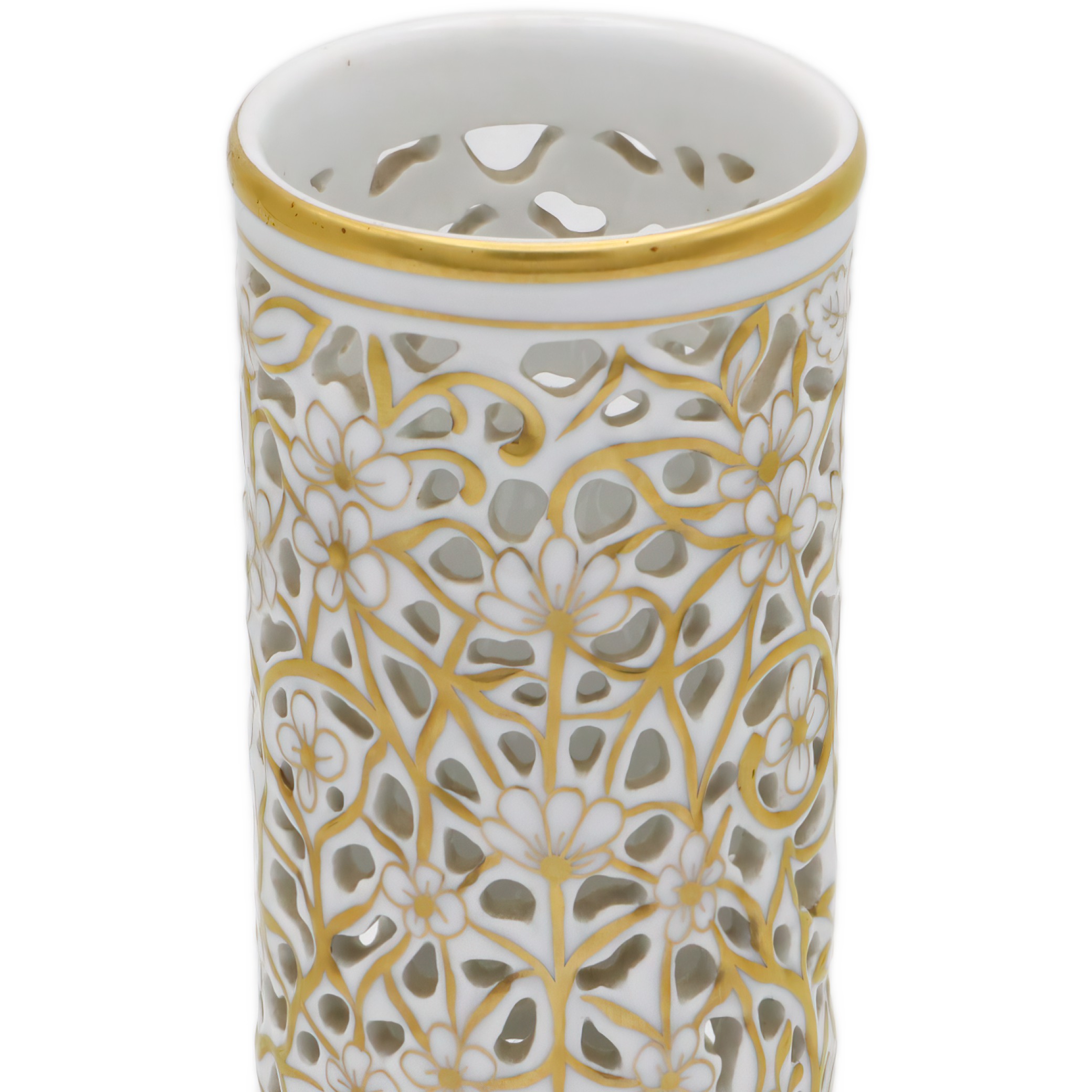 This stunning piece is a Herend Antique Openwork Vase from around 1930, and it really showcases just how elegant vintage porcelain can be. It’s fairly small, standing about 5 inches tall and only about 2 inches wide and long—making it perfect as a classy little centerpiece or an accent on a shelf. What really stands out is the detailed cutout work along the sides, forming a delicate floral pattern that’s highlighted with fine gold accents. It’s in near mint condition, which is rare for items this old, especially when you consider it’s nearly a century old. The white porcelain has stayed bright, and the gold decoration still has that beautiful, mellow shine that antique pieces pick up over the years.
