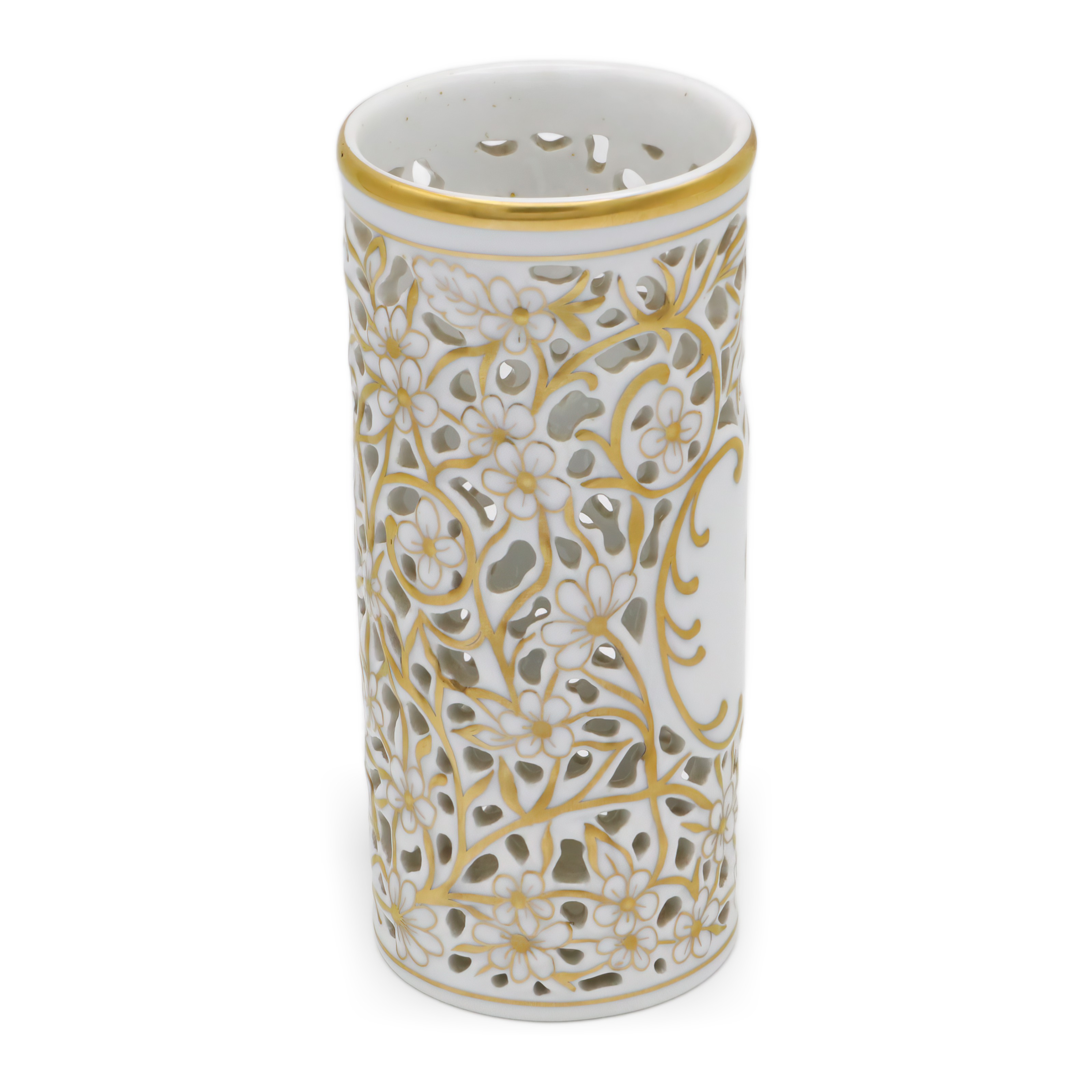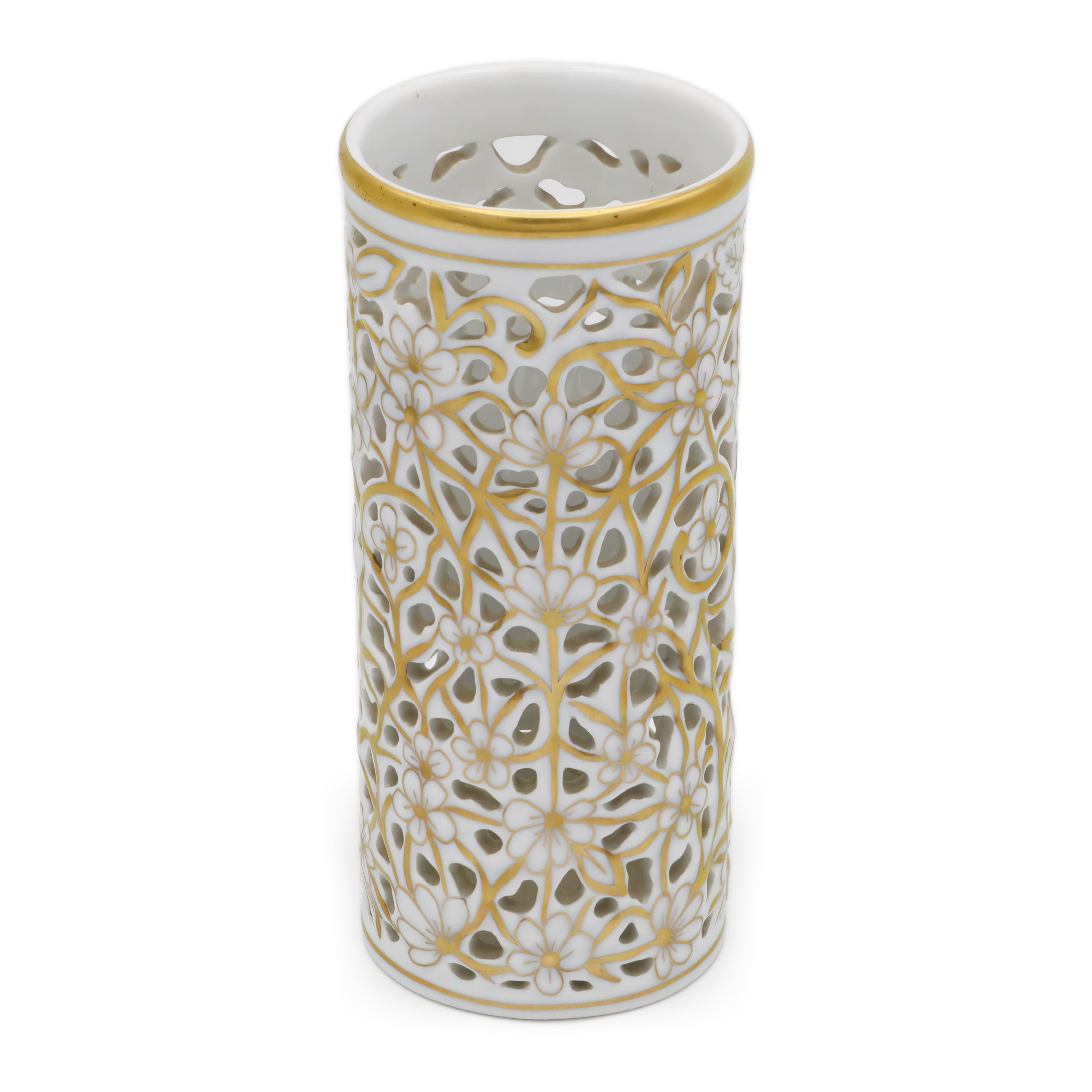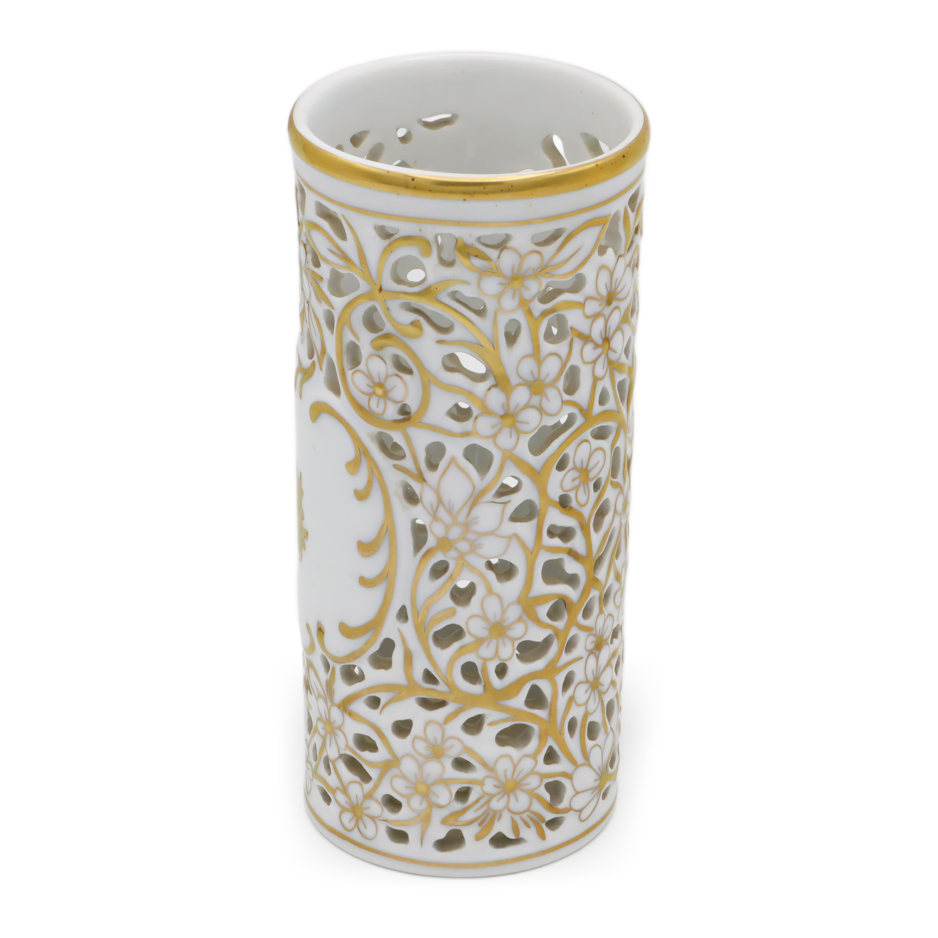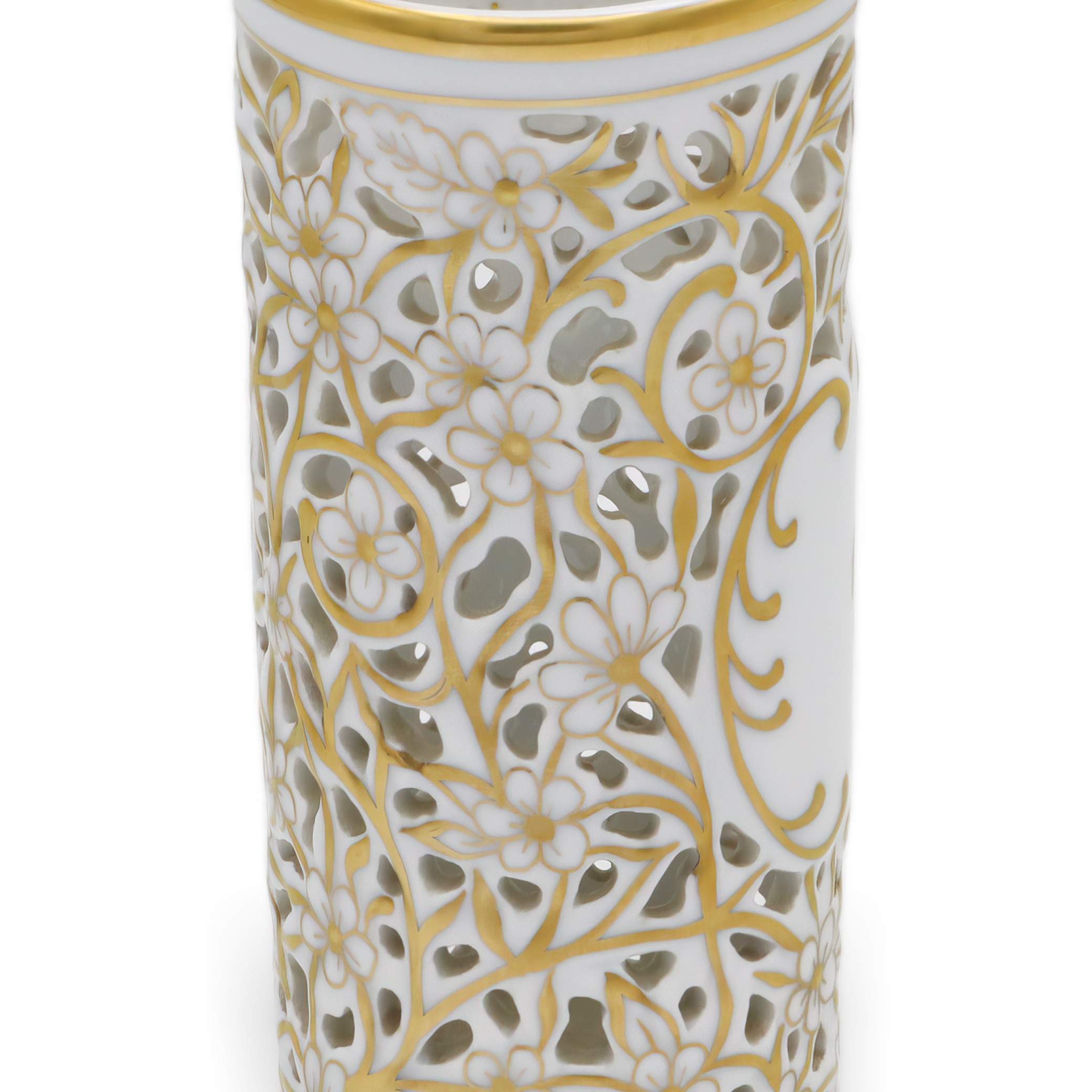 This stunning piece is a Herend Antique Openwork Vase from around 1930, and it really showcases just how elegant vintage porcelain can be. It’s fairly small, standing about 5 inches tall and only about 2 inches wide and long—making it perfect as a classy little centerpiece or an accent on a shelf. What really stands out is the detailed cutout work along the sides, forming a delicate floral pattern that’s highlighted with fine gold accents. It’s in near mint condition, which is rare for items this old, especially when you consider it’s nearly a century old. The white porcelain has stayed bright, and the gold decoration still has that beautiful, mellow shine that antique pieces pick up over the years.