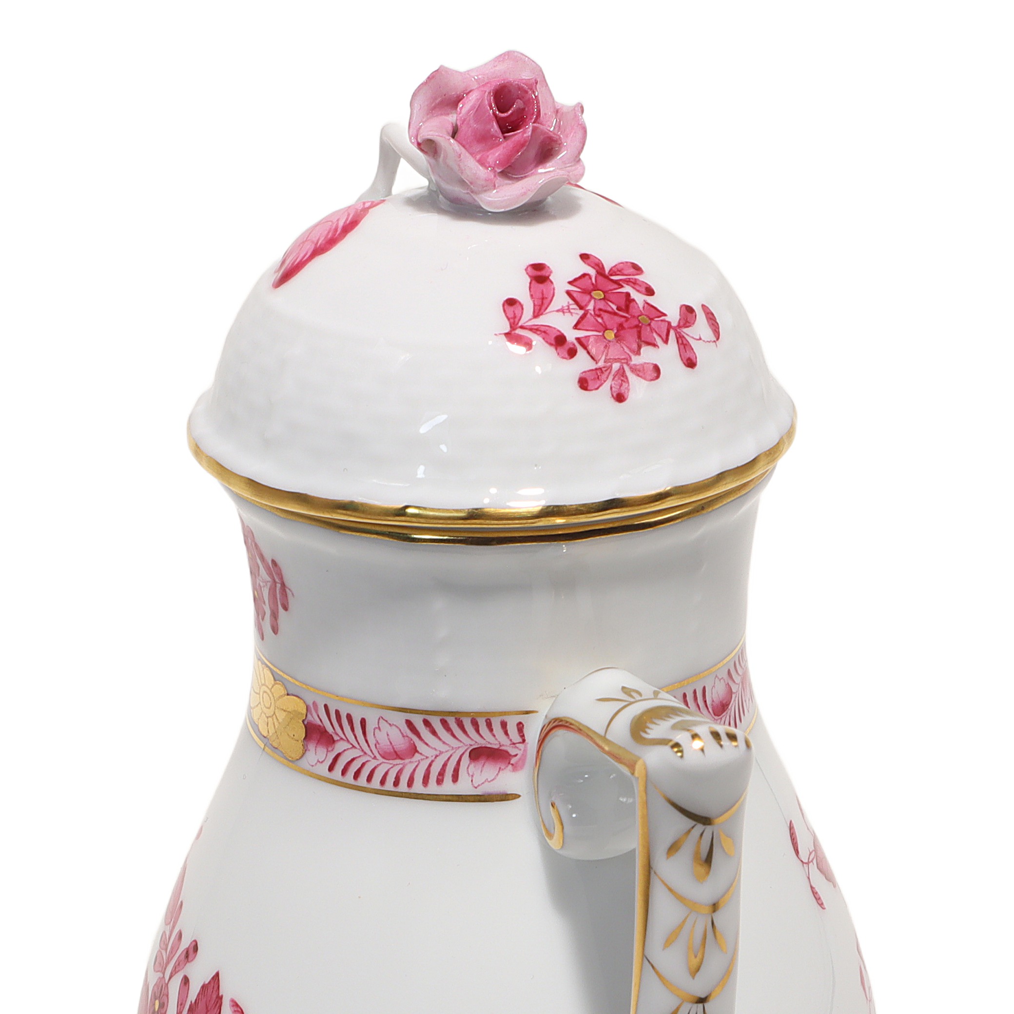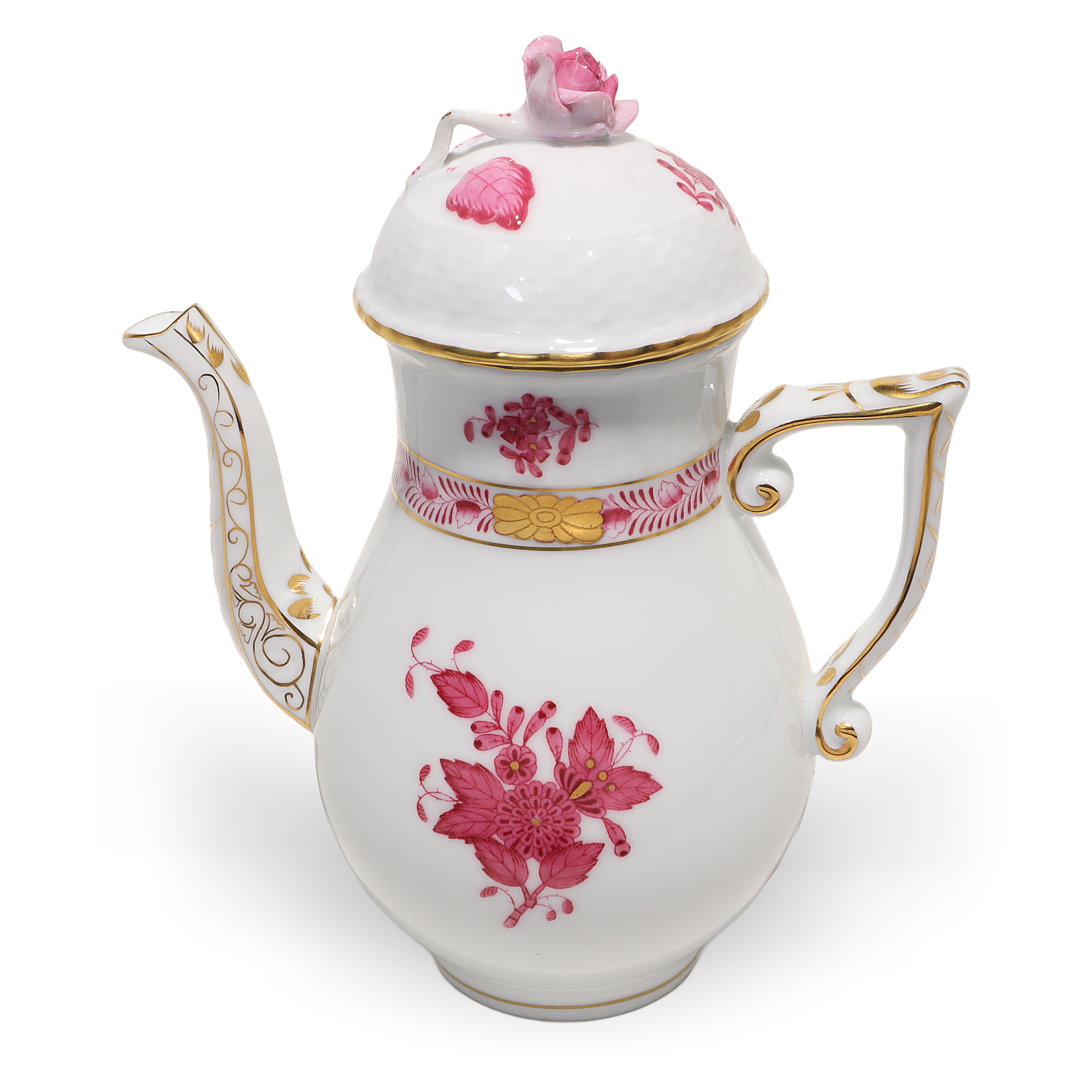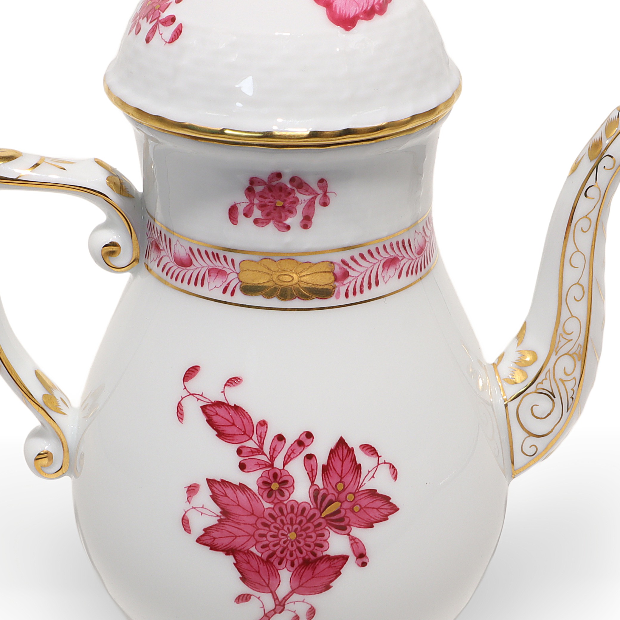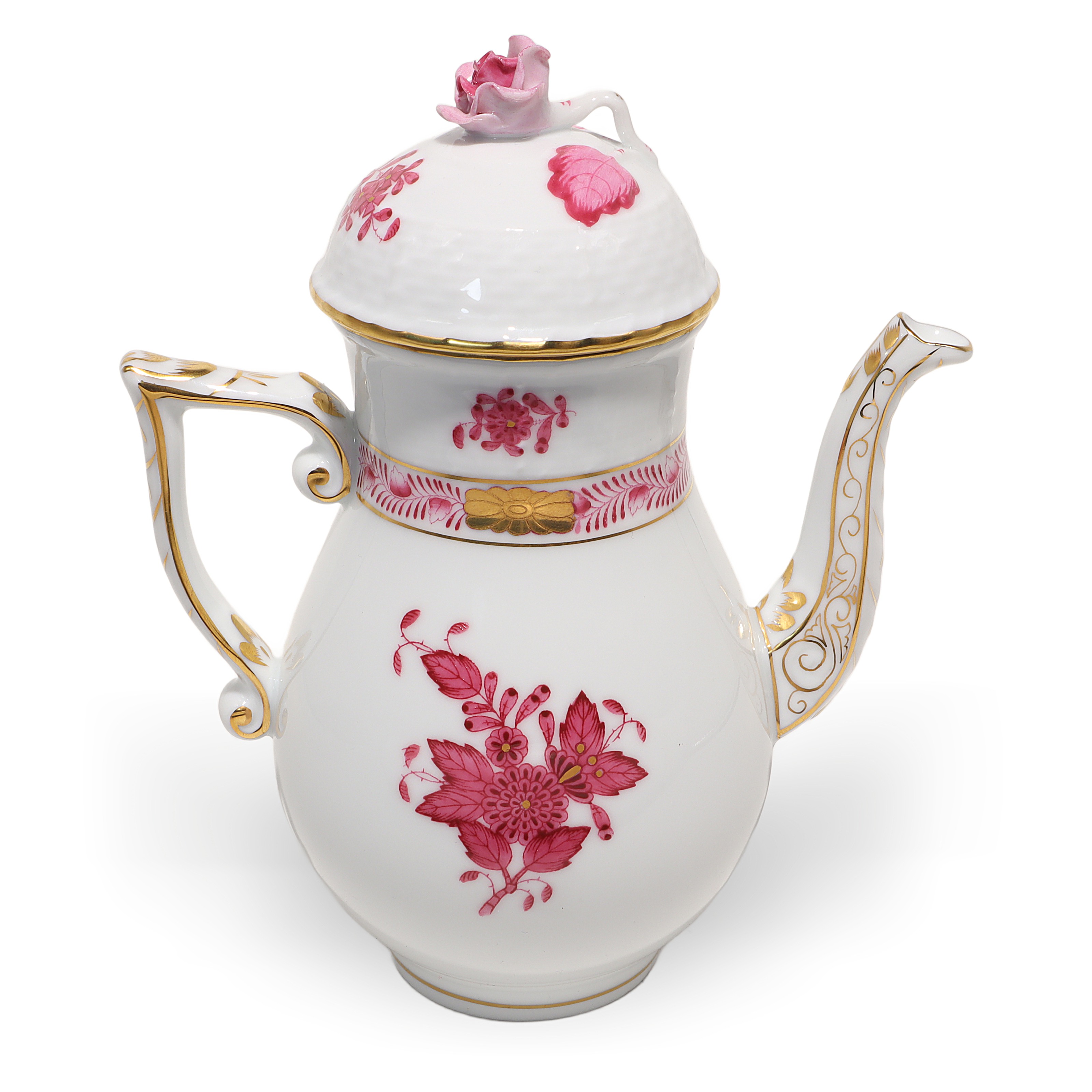 This lovely piece is a Herend Apponyi Mocha Set, often called a Tête-à-Tête set, made in 1980. It’s a two-person coffee set, perfect for sharing intimate coffee moments with a friend or loved one. The pattern is the iconic Raspberry Chinese Bouquet, which stands out with its rich pink floral designs and delicate touches of gold along the rims and handles. At over 40 years old, this set is considered vintage, and its condition is described as near mint, meaning it looks almost as good as when it was made. The set includes a coffee pot, sugar bowl, creamer, two cups, and matching saucers—everything you need to enjoy a fresh brew in style. With its fine porcelain construction and exquisite hand-painted details, this isn’t your run-of-the-mill coffee set. It’s something special for those who appreciate elegance and a bit of history with their morning routine.