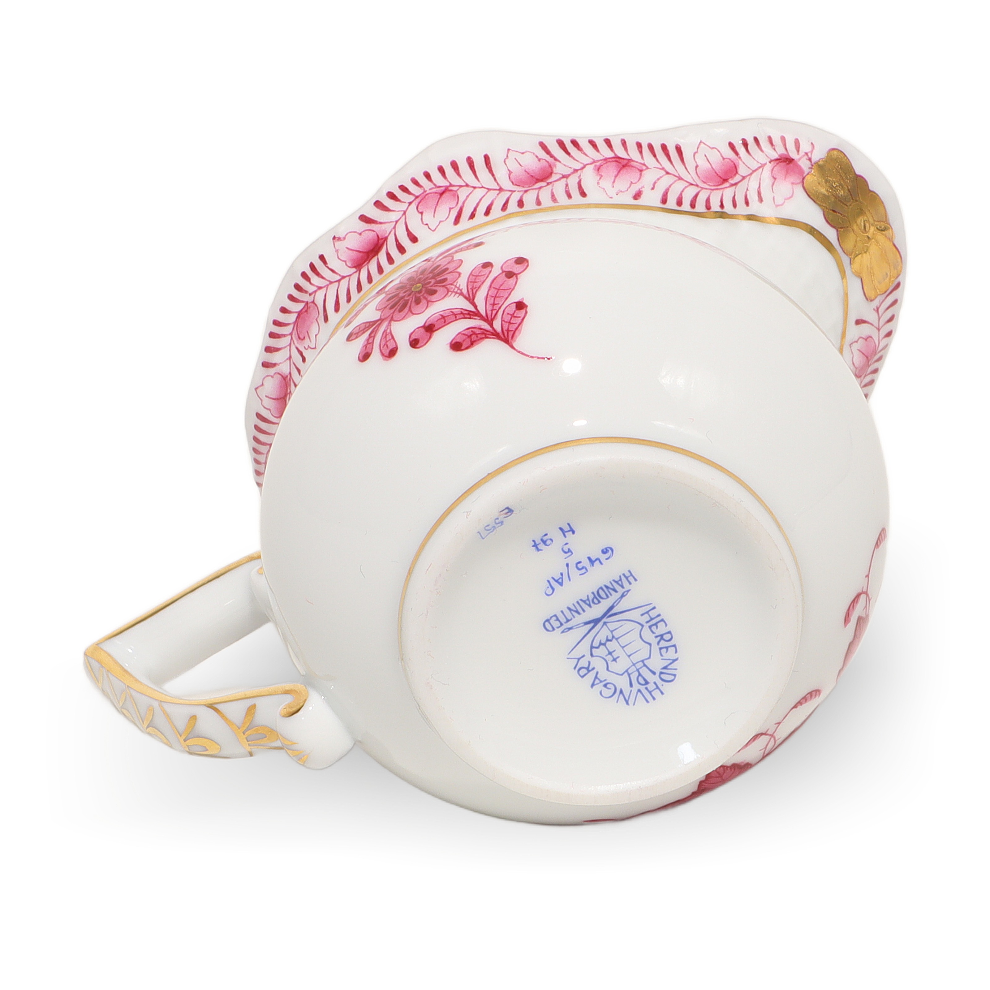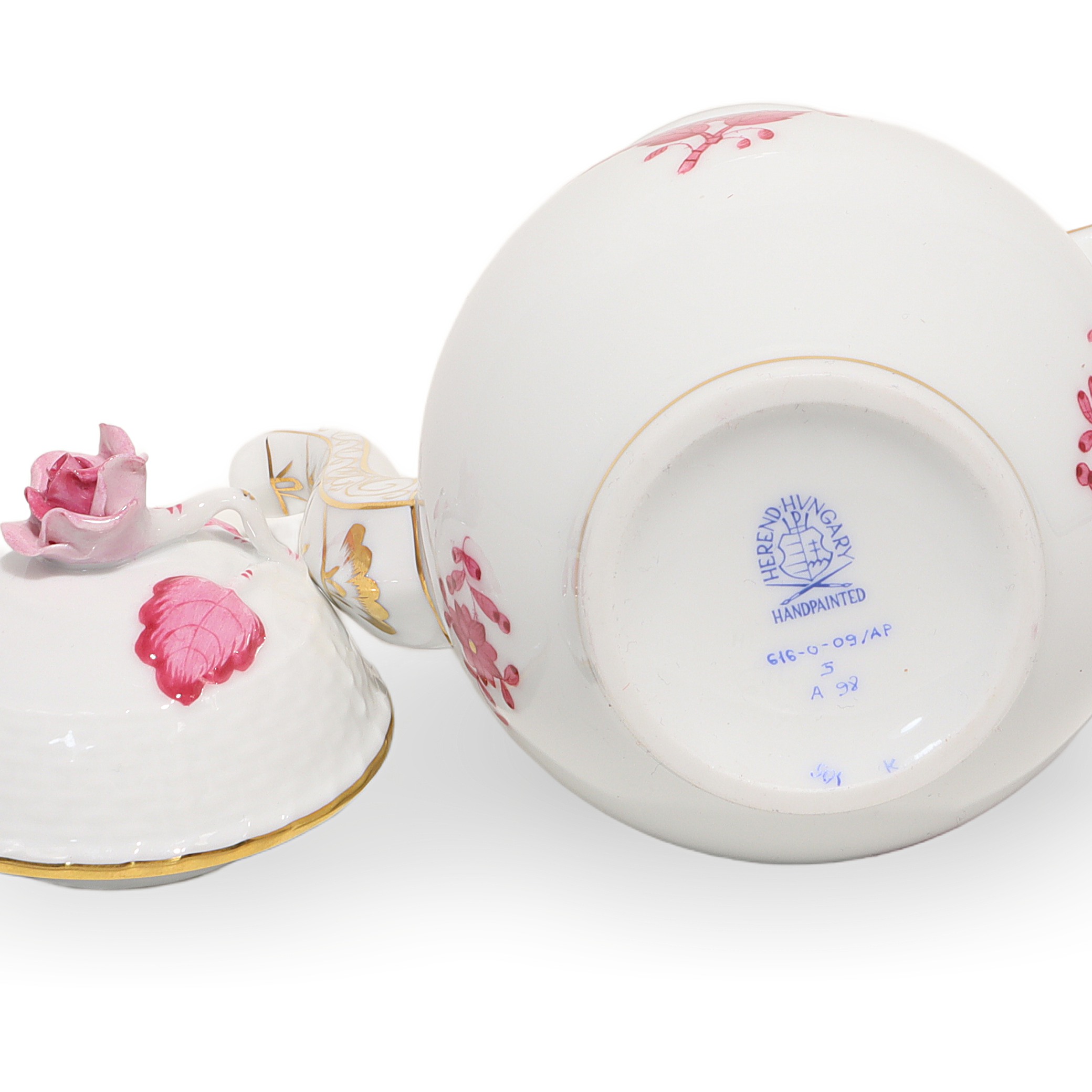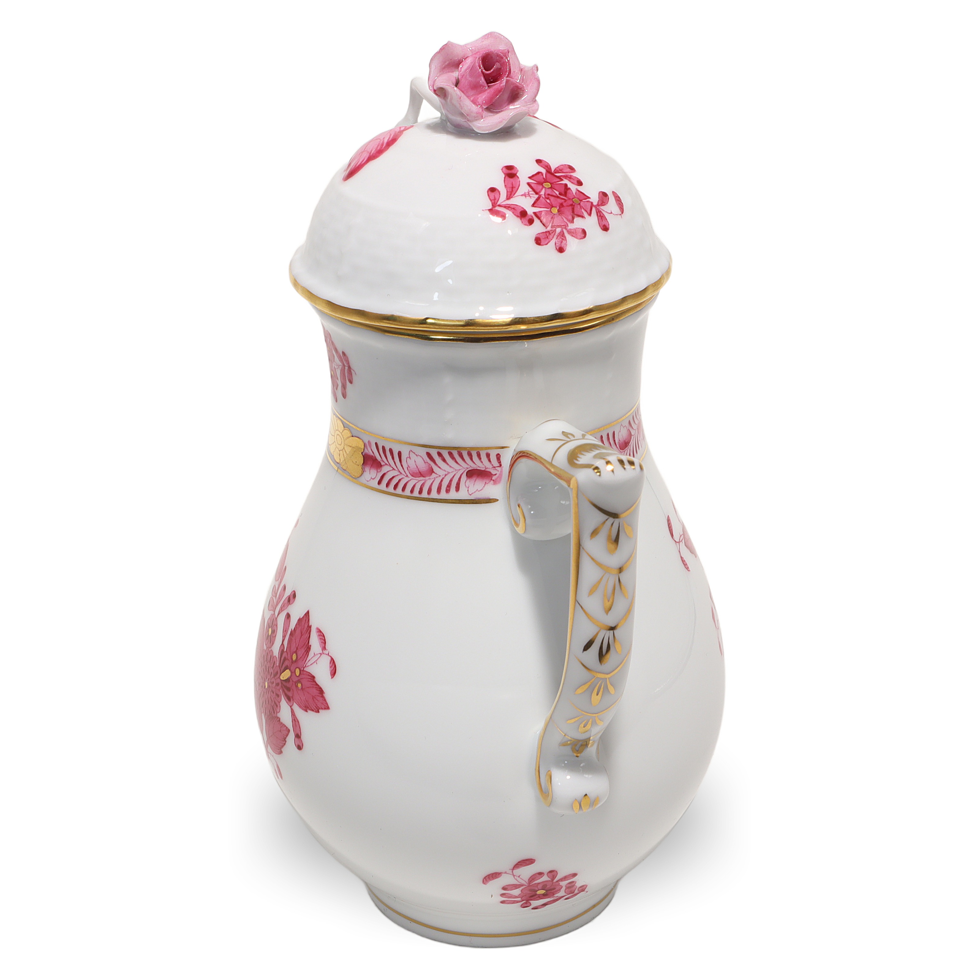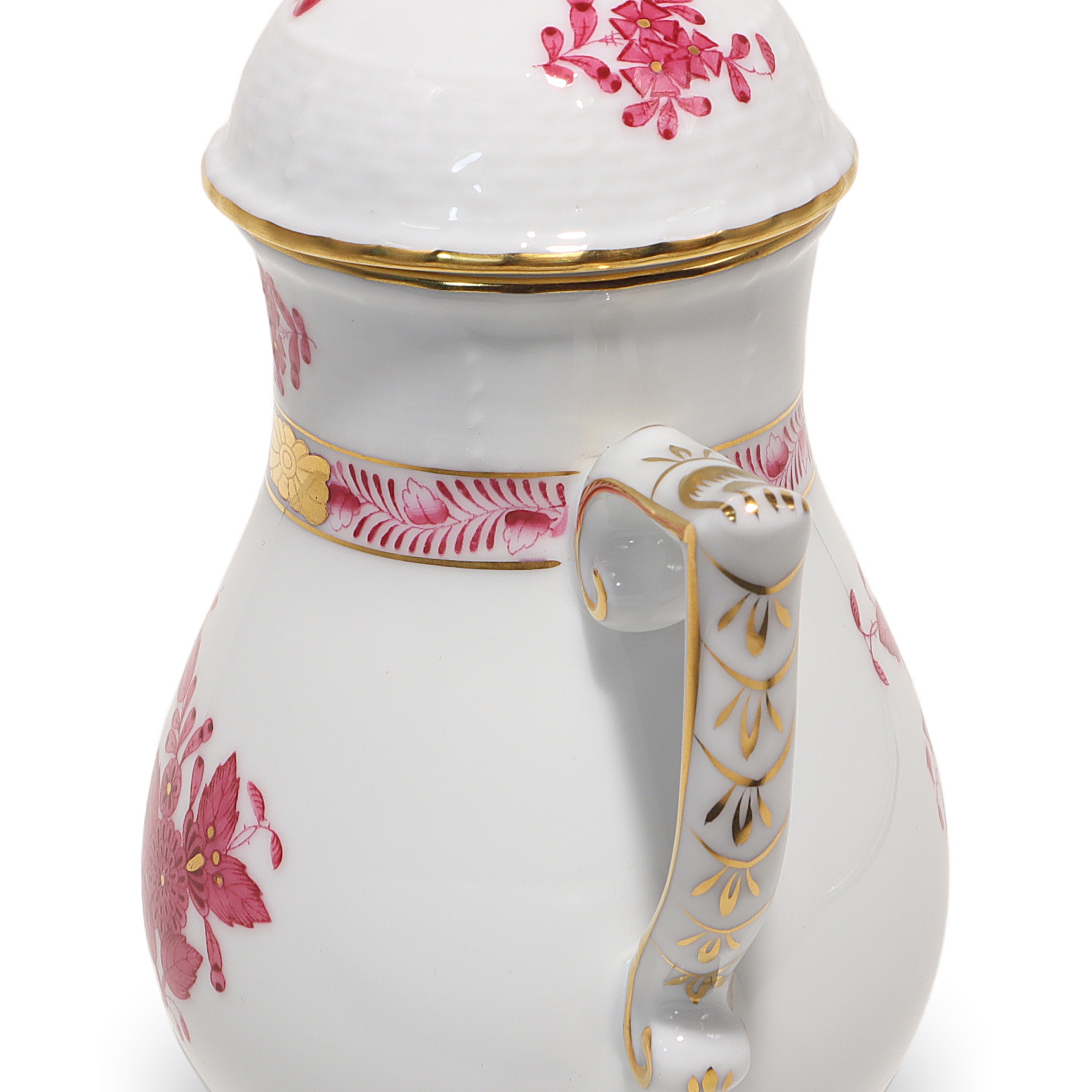 This lovely piece is a Herend Apponyi Mocha Set, often called a Tête-à-Tête set, made in 1980. It’s a two-person coffee set, perfect for sharing intimate coffee moments with a friend or loved one. The pattern is the iconic Raspberry Chinese Bouquet, which stands out with its rich pink floral designs and delicate touches of gold along the rims and handles. At over 40 years old, this set is considered vintage, and its condition is described as near mint, meaning it looks almost as good as when it was made. The set includes a coffee pot, sugar bowl, creamer, two cups, and matching saucers—everything you need to enjoy a fresh brew in style. With its fine porcelain construction and exquisite hand-painted details, this isn’t your run-of-the-mill coffee set. It’s something special for those who appreciate elegance and a bit of history with their morning routine.