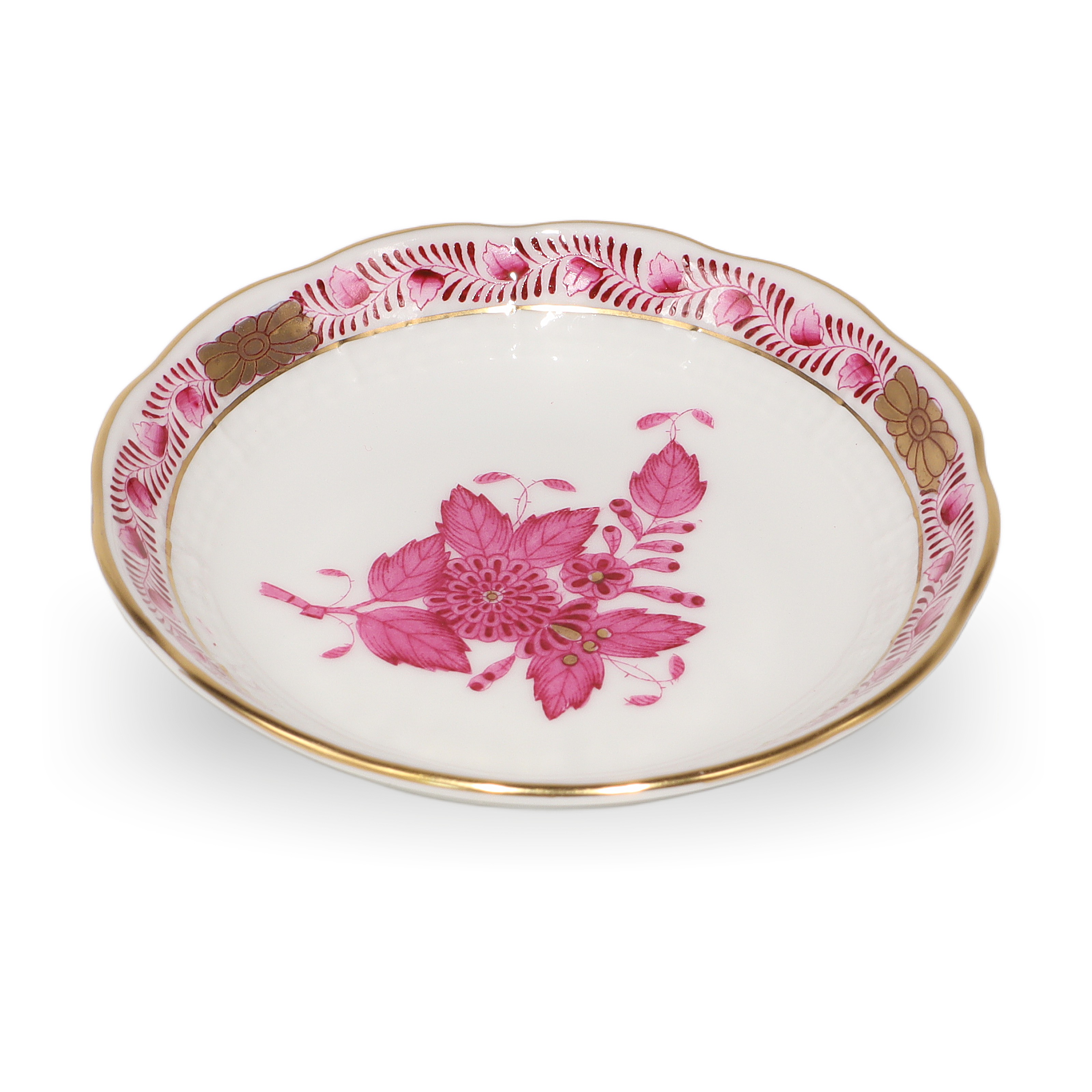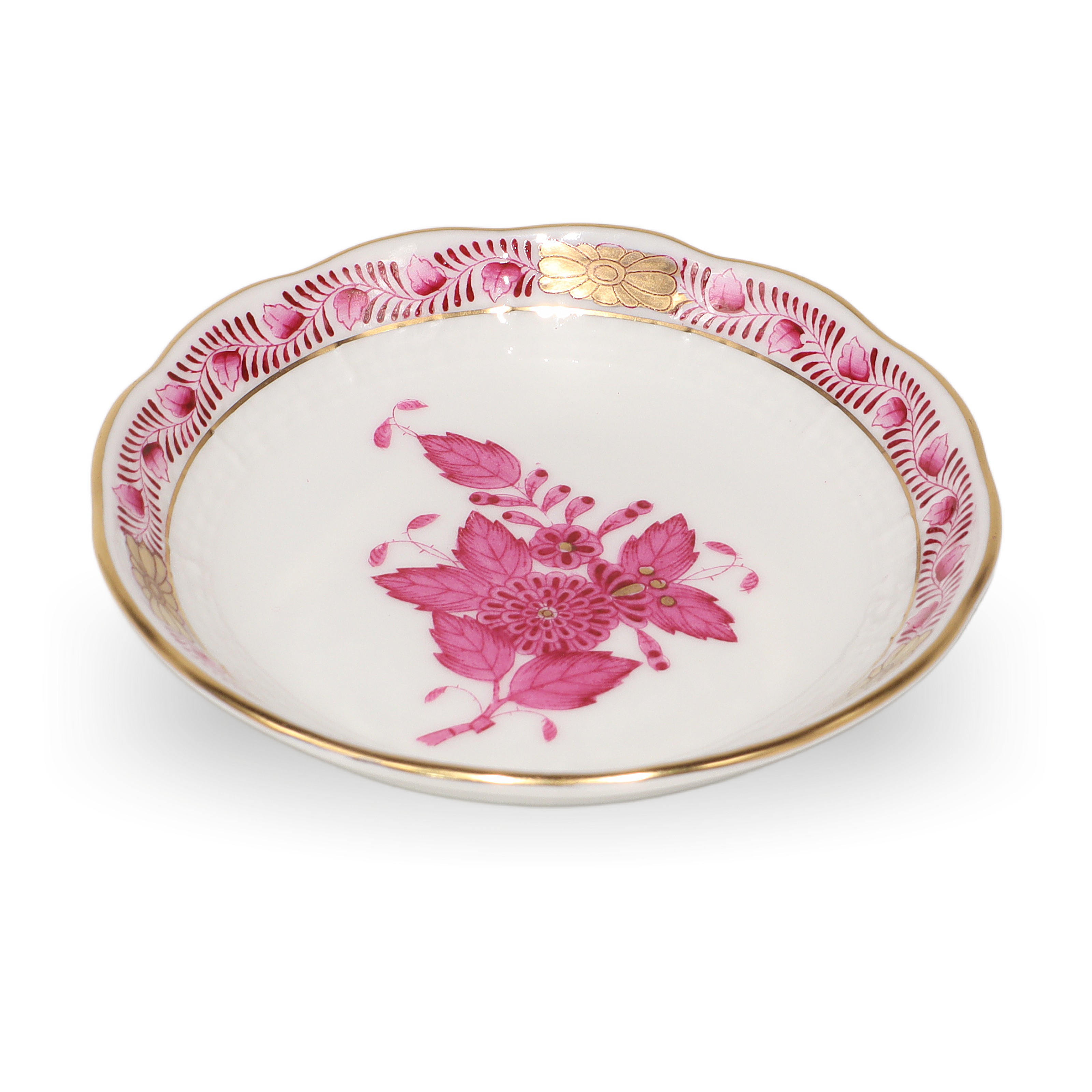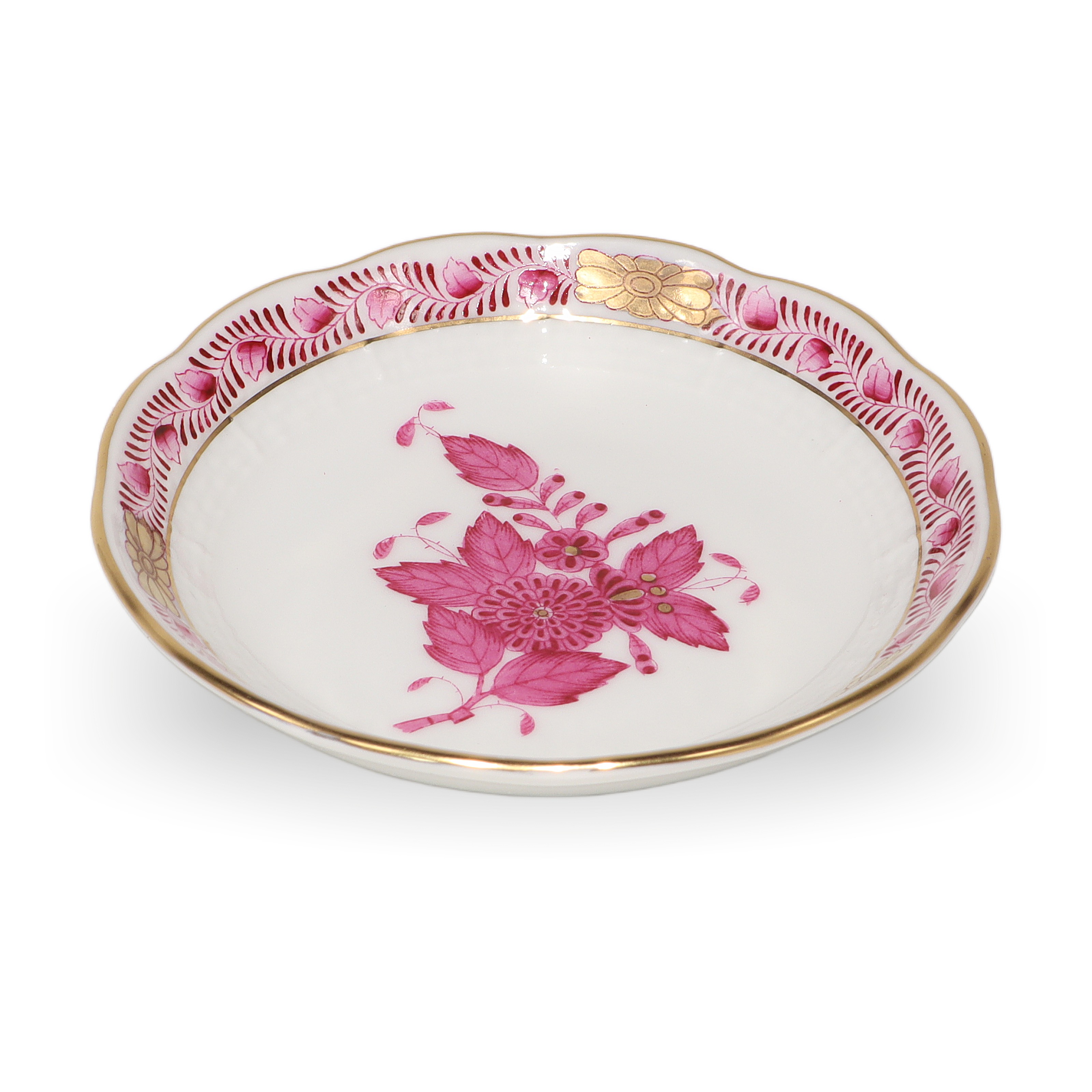 Herend is a famous Hungarian porcelain manufacturer that has been around since 1826, known worldwide for its hand-painted and often intricate designs. The Apponyi pattern, often called the “Chinese Bouquet,” traces its roots back to the 19th century and was originally made for Hungarian nobility. Over the years, it’s been done in many colors, but the pink (Pur Pur) version is especially striking for collectors. Herend porcelain is still crafted by hand today using traditional techniques, and each piece is unique. Many people collect Herend for its artistic flair and the connection to European history. Owning a piece from the 1960s means having a slice of that tradition, and with its age and near-pristine condition, this small plate is both vintage and quite rare to come by, adding a touch of timeless elegance to any setting.