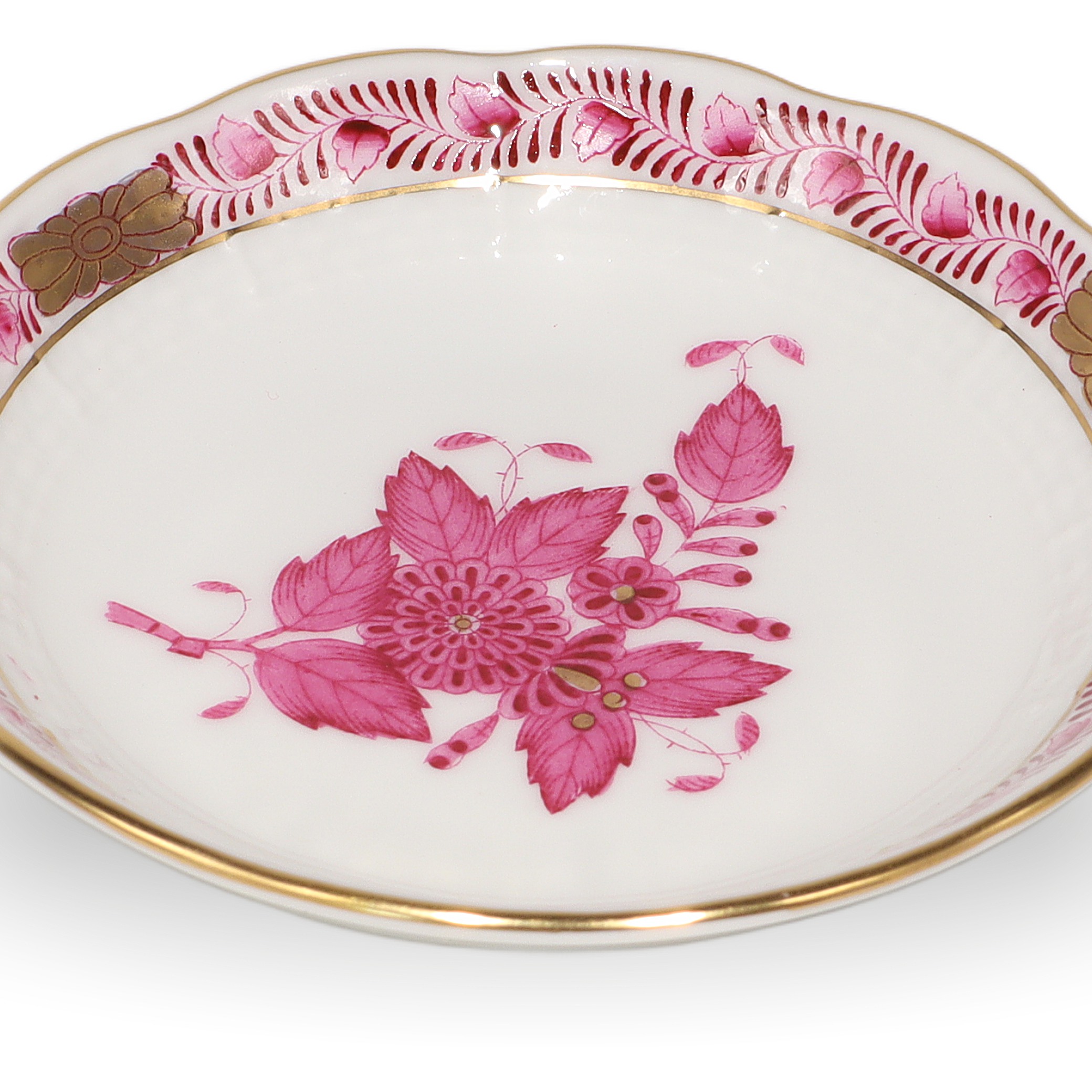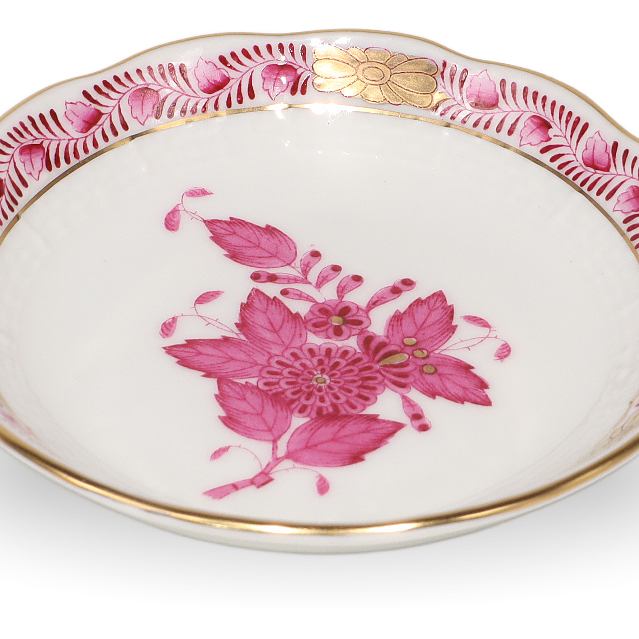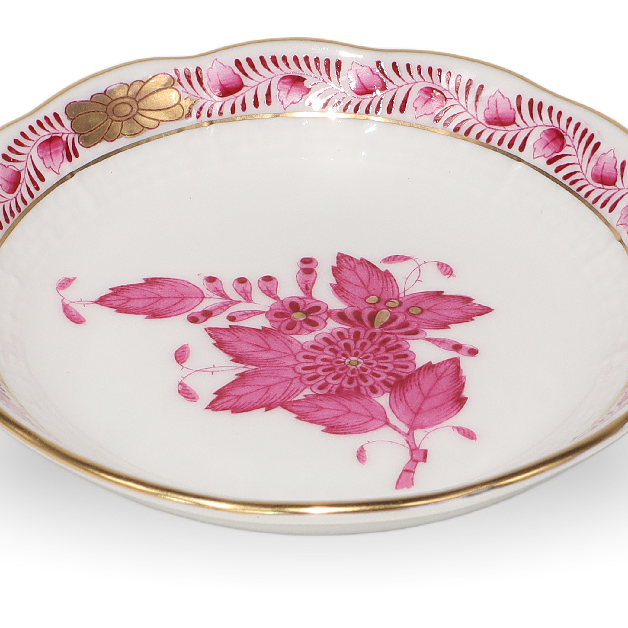 Herend is a famous Hungarian porcelain manufacturer that has been around since 1826, known worldwide for its hand-painted and often intricate designs. The Apponyi pattern, often called the “Chinese Bouquet,” traces its roots back to the 19th century and was originally made for Hungarian nobility. Over the years, it’s been done in many colors, but the pink (Pur Pur) version is especially striking for collectors. Herend porcelain is still crafted by hand today using traditional techniques, and each piece is unique. Many people collect Herend for its artistic flair and the connection to European history. Owning a piece from the 1960s means having a slice of that tradition, and with its age and near-pristine condition, this small plate is both vintage and quite rare to come by, adding a touch of timeless elegance to any setting.