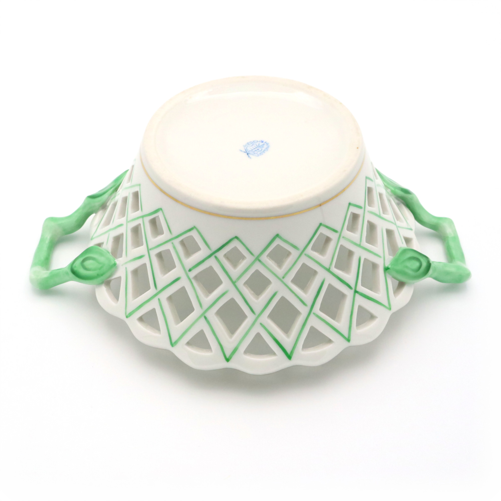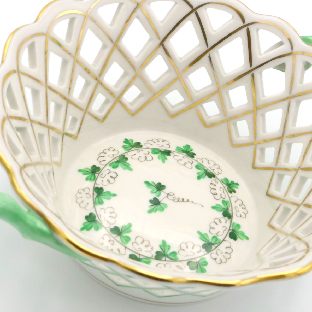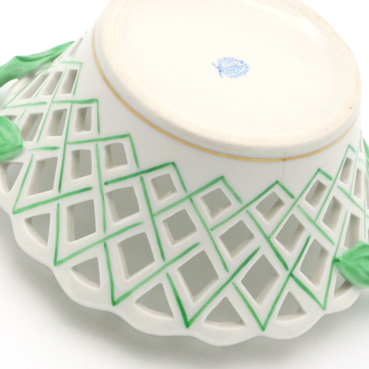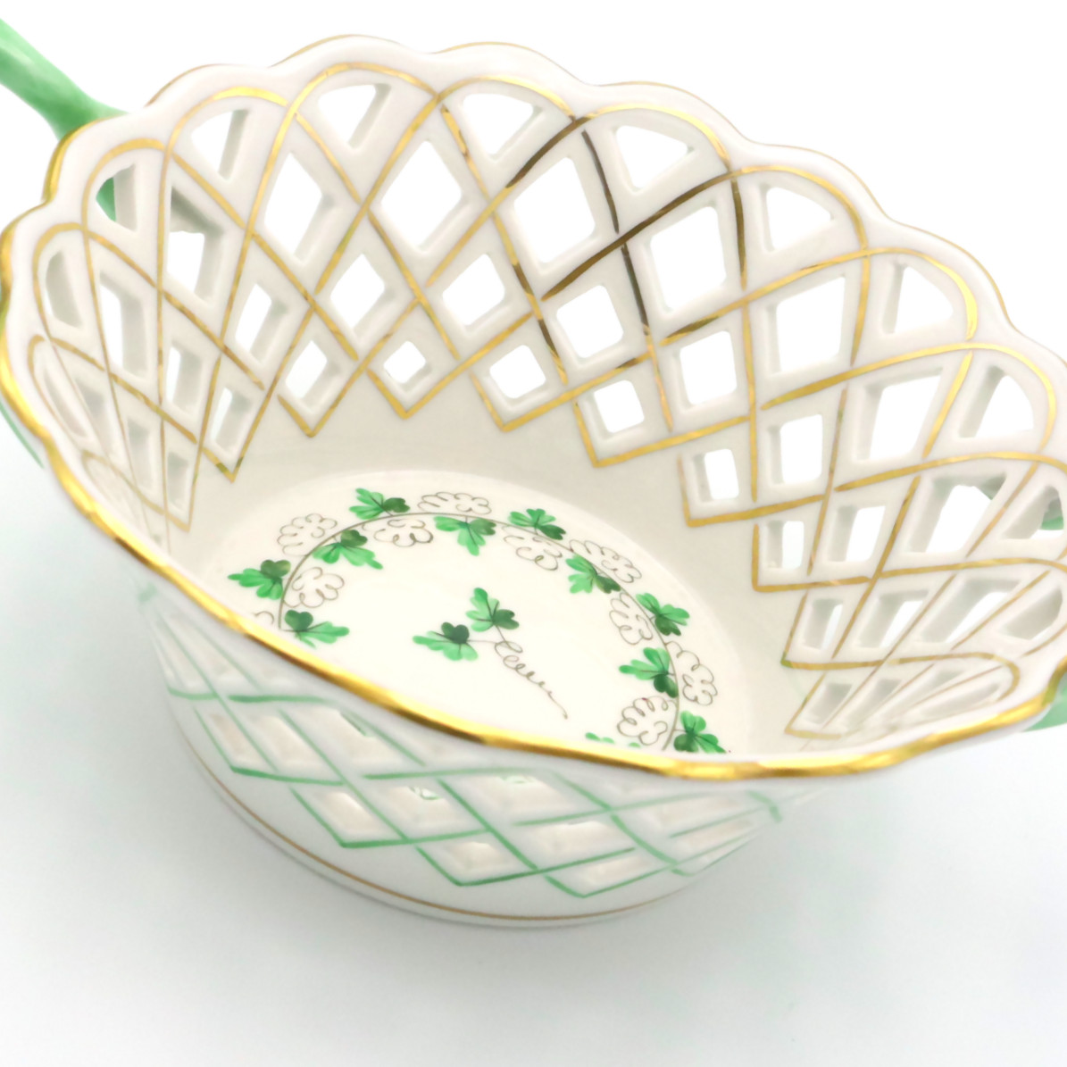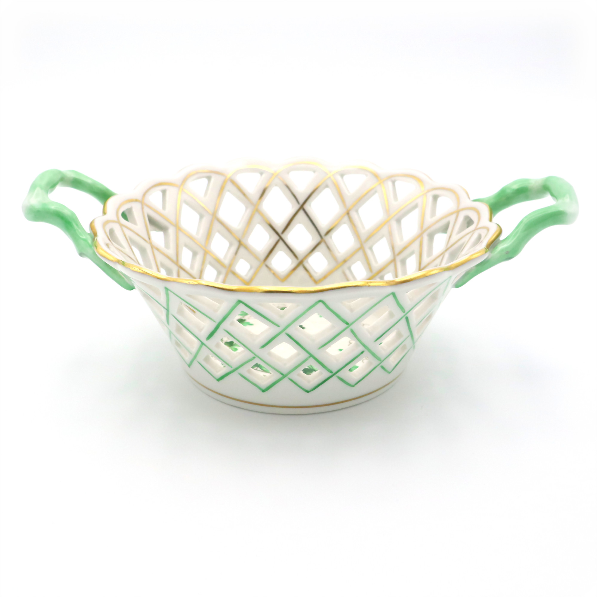 Step into the world of timeless elegance with this exquisite Herend Cachepot with a Pierced Rim, featuring the iconic Parsley Pattern. This piece is an unparalleled fusion of artistry and functionality, masterfully crafted to bring sophistication to any setting. The cachepot boasts a meticulously hand-painted lattice design adorned with vibrant green parsley motifs, perfectly contrasting with the subtle white porcelain backdrop. The pierced rim, accentuated with delicate gold trim, adds a touch of luxury, making this a standout piece in any home decor. Measuring approximately 8 inches in diameter and 3 inches in height, this cachepot is the ideal size to house your cherished plants, hold fresh-cut flowers, or serve as a decorative centerpiece, eliciting compliments from all who behold it.