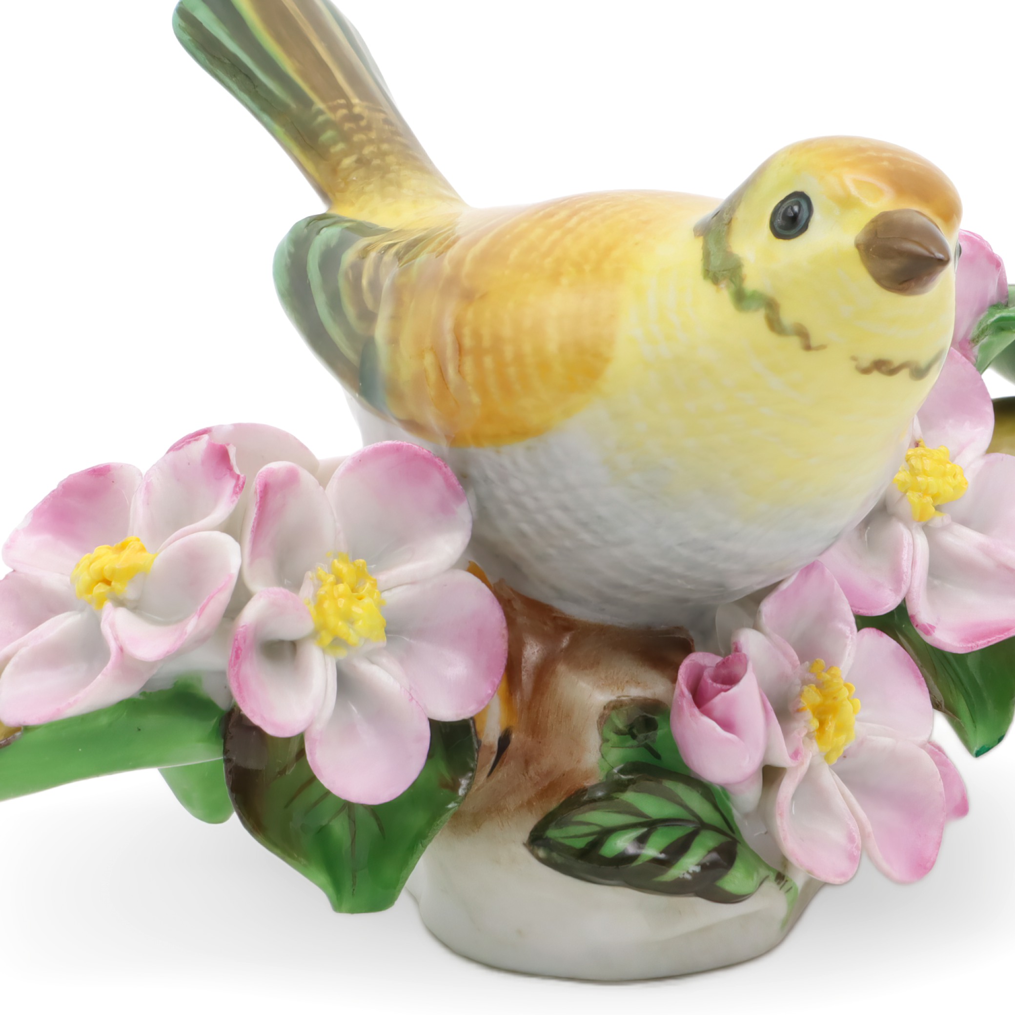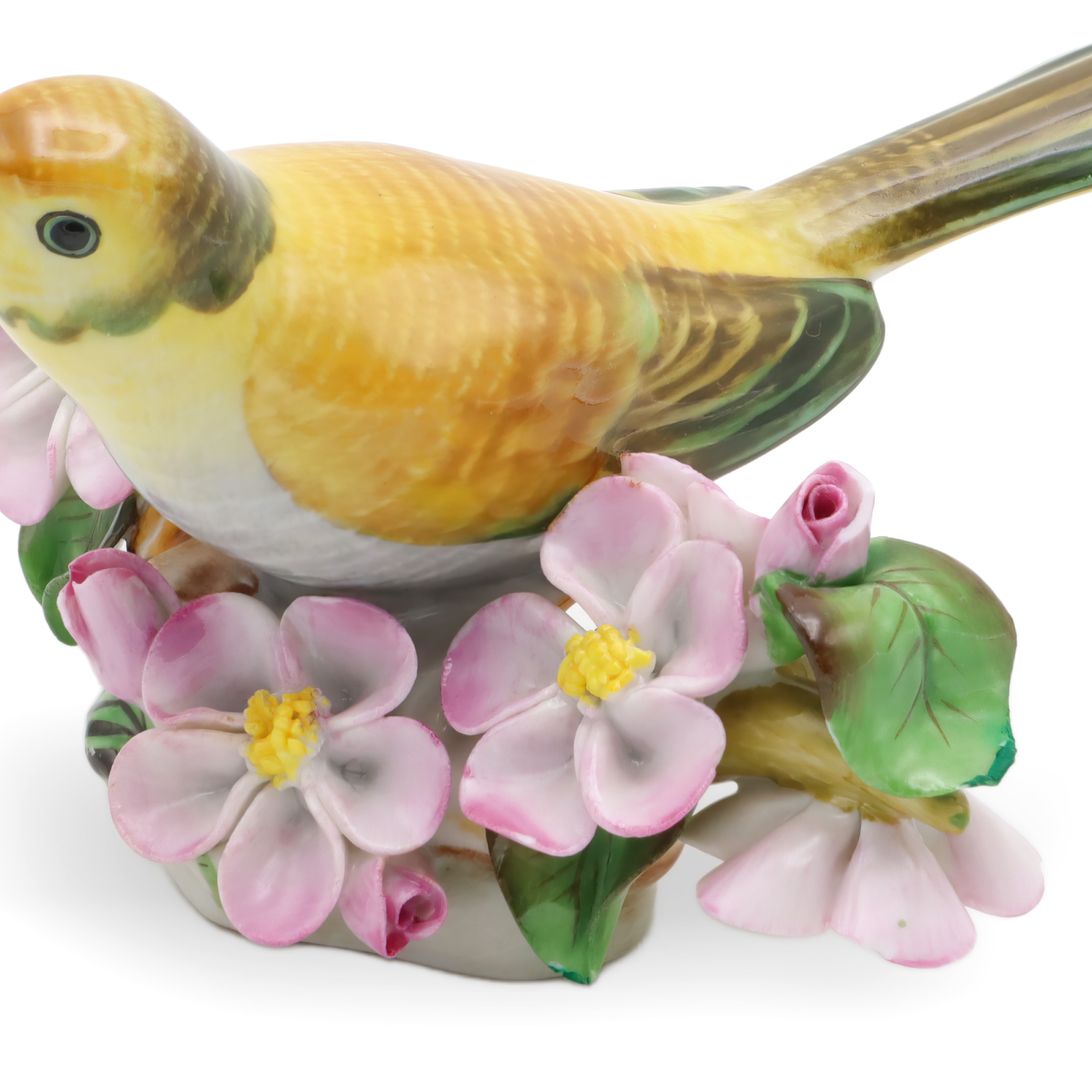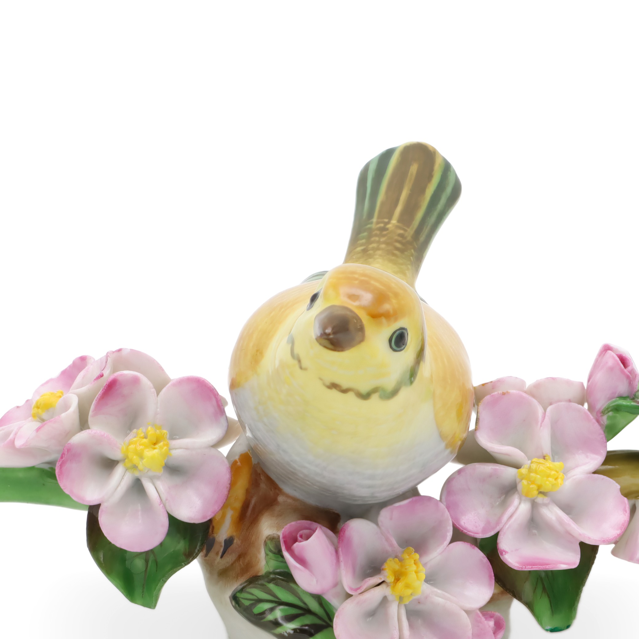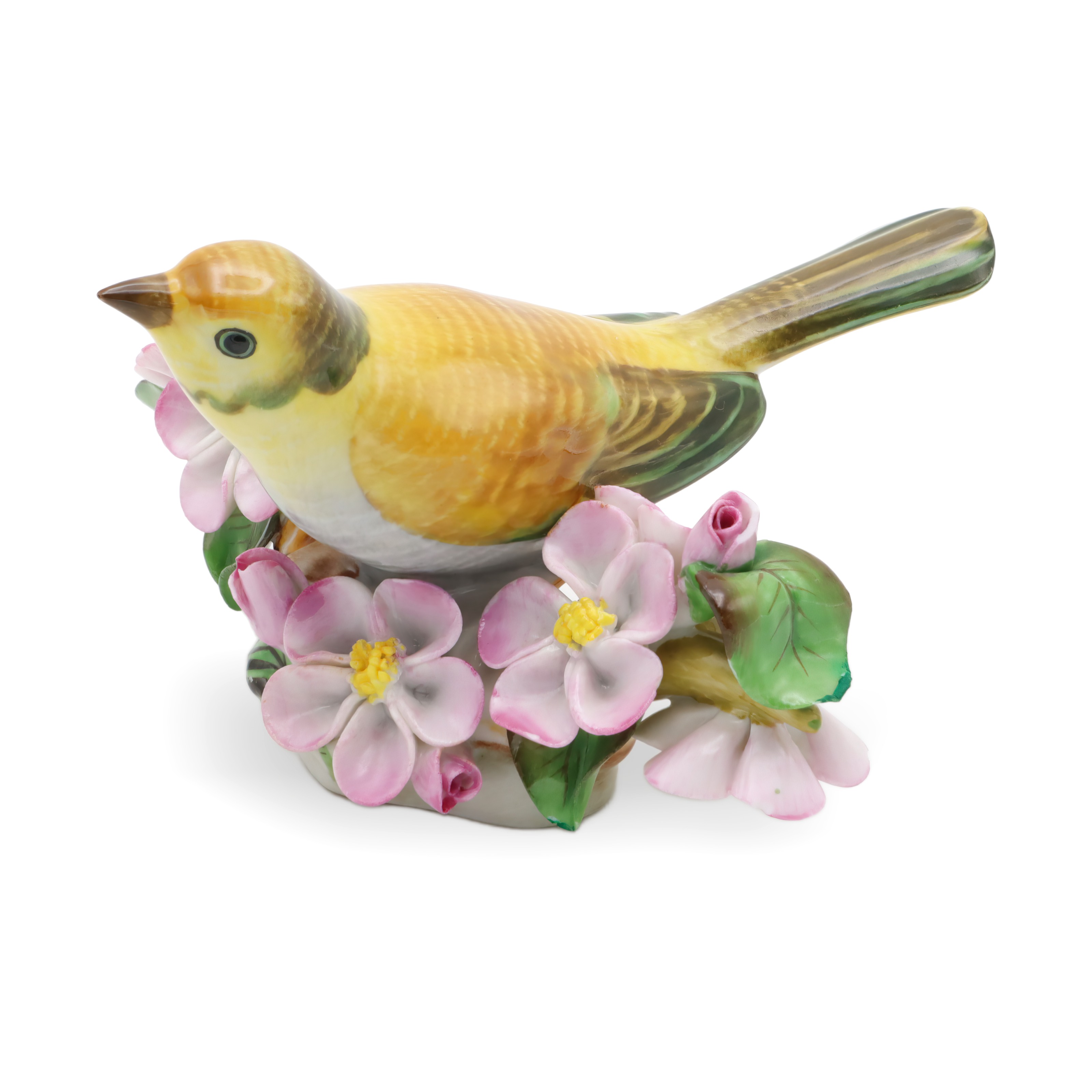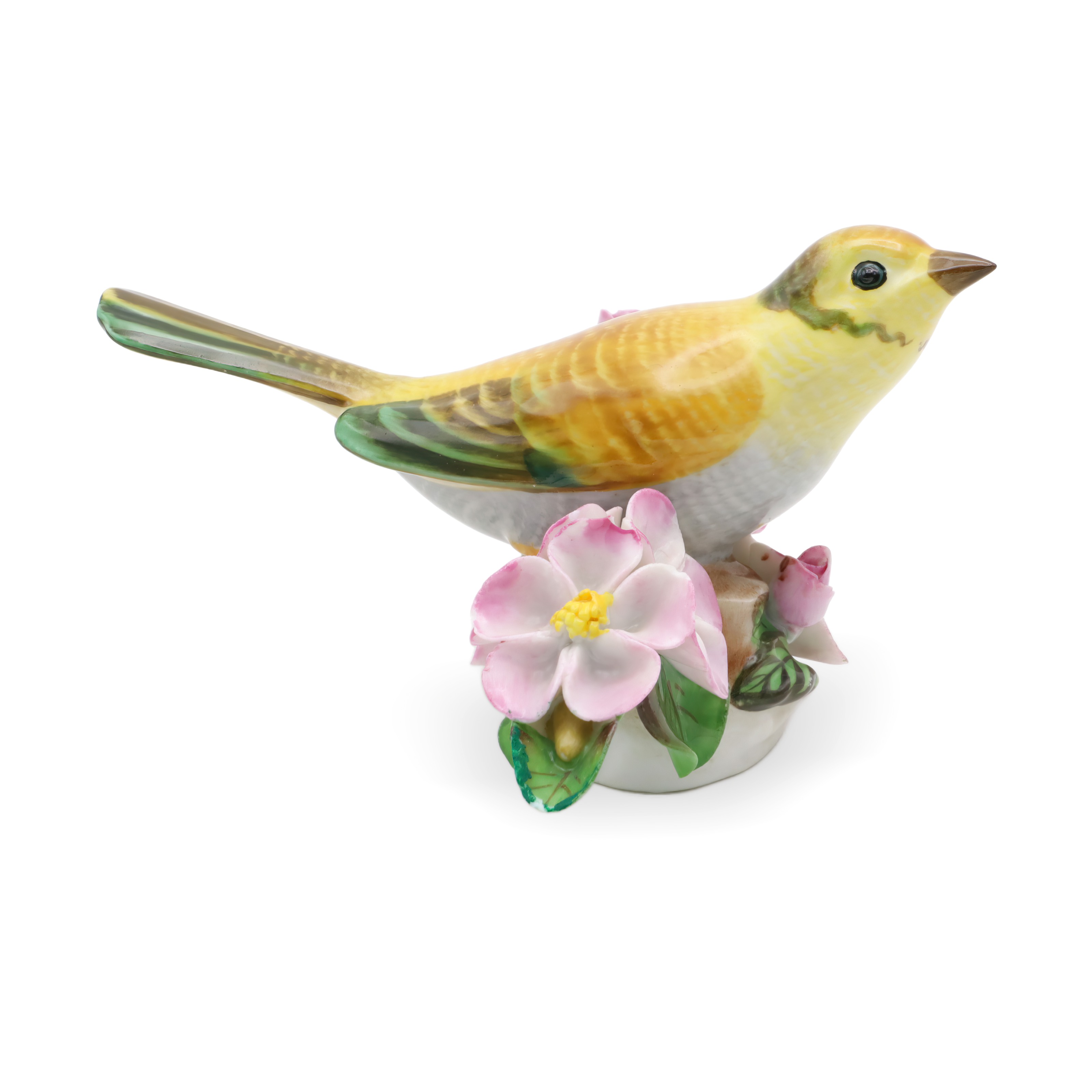 The item pictured is a Herend hand painted yellow porcelain bird figurine from around 1980. Standing about 3 inches tall, 5 inches wide, and 4.5 inches long, this sweet little statue features a bright yellow songbird perched among delicate pink blossoms and lush green leaves. The detail is pretty incredible—even the feathers are painted with tiny brushstrokes, and the flowers have a natural softness that makes this piece pop. For something over 40 years old, it’s still in near mint condition, which is not easy to find for porcelain collectibles from this era. This figurine is a perfect example of the kind of cheerful, eye-catching decor that Herend is known for, and it’s a great choice for anyone who likes vintage finds that aren’t just for display—they spark a bit of joy, too.