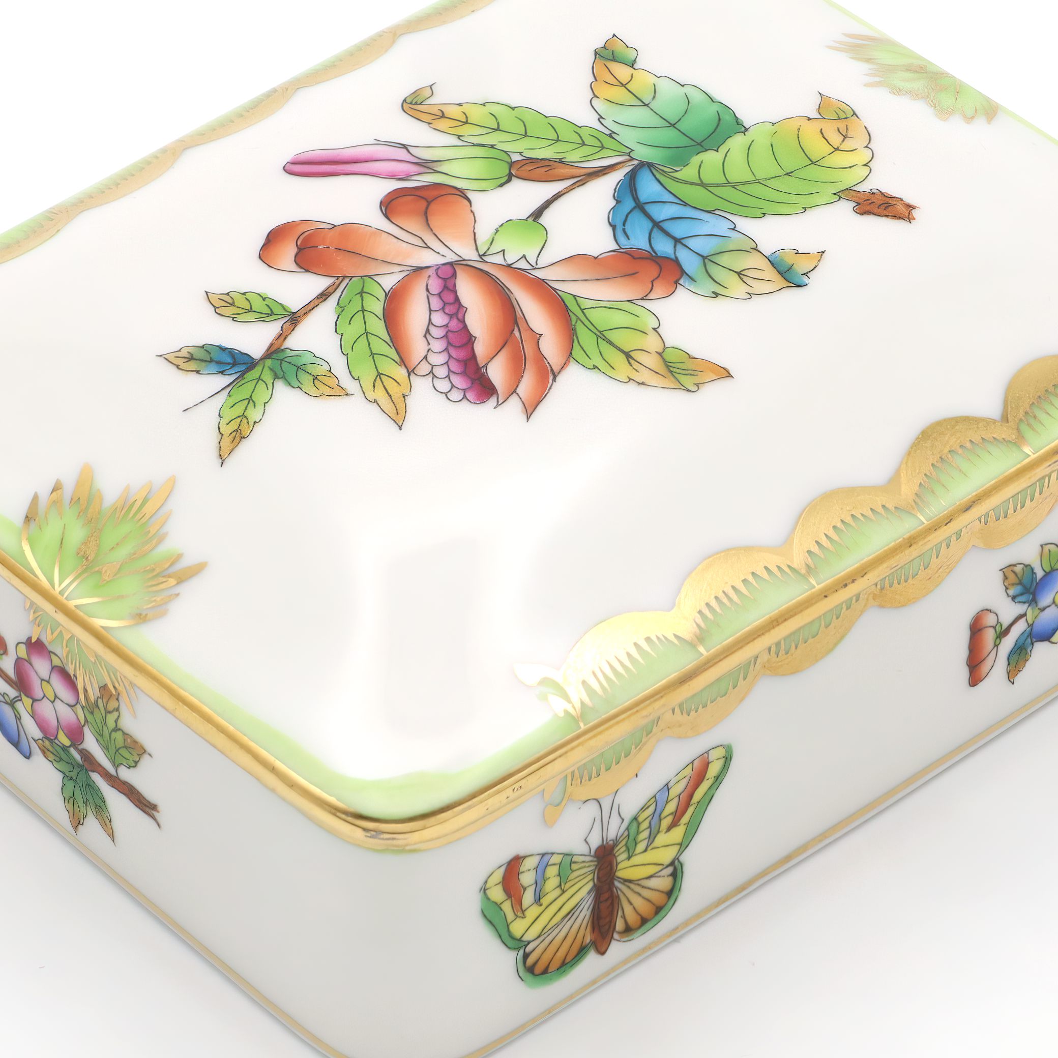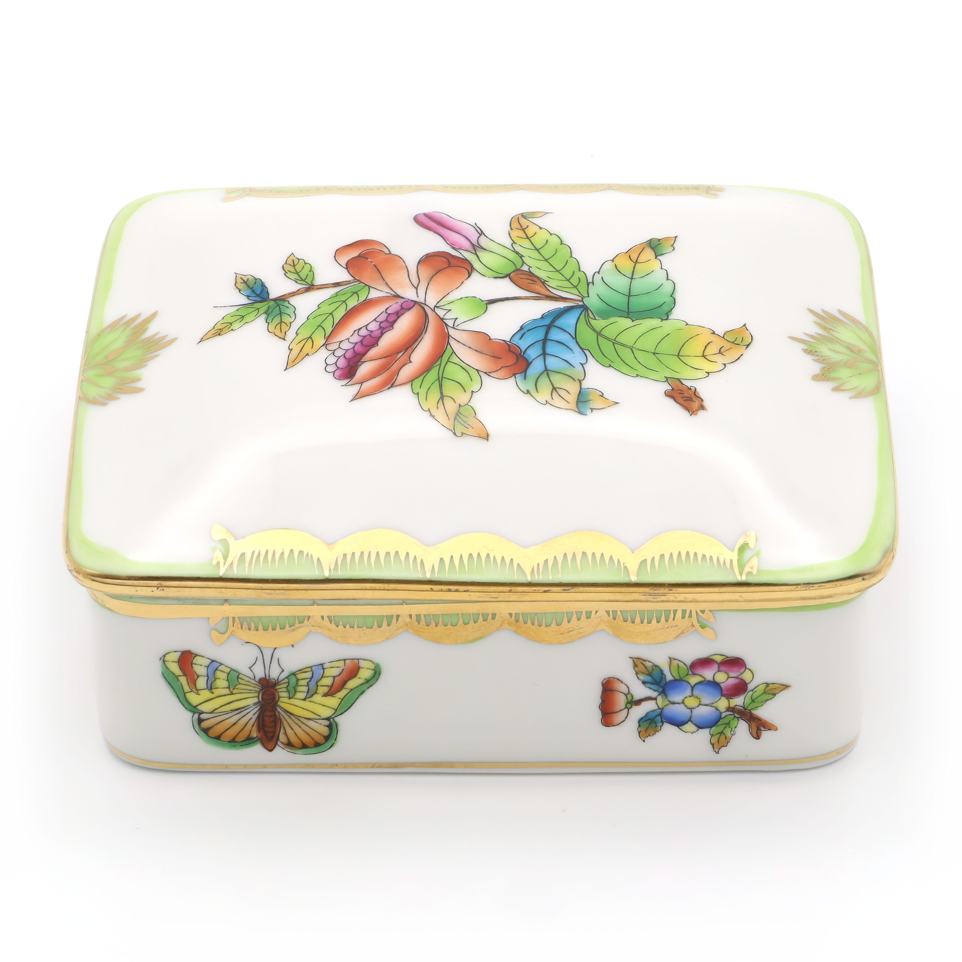 Herend, the legendary Hungarian porcelain manufacturer, is known for producing some of the world’s most beautiful hand-painted porcelain. Started back in 1826, Herend quickly gained a reputation for high quality and stunning, detailed artistry. The Queen Victoria pattern, introduced in 1851 at the London Great Exhibition, is probably their best-known and most beloved pattern. The story goes that Queen Victoria herself admired the pattern so much that it was named after her. With its playful butterflies, peonies, and lush greens and golds, the Queen Victoria design has become almost iconic in the world of fine china. Genuine vintage Herend pieces, especially those in this excellent condition, are highly sought after by collectors because of their age, rarity, and the hand-crafted artistry that goes into each item. Each porcelain piece is hand-painted by a skilled artist, so no two are exactly the same—giving items like this jewelry box a sense of uniqueness and personal charm you just don’t get from modern mass production. Owning a Herend Queen Victoria trinket box is like owning a little piece of art and history, wrapped up in color, craftsmanship, and old-world elegance.