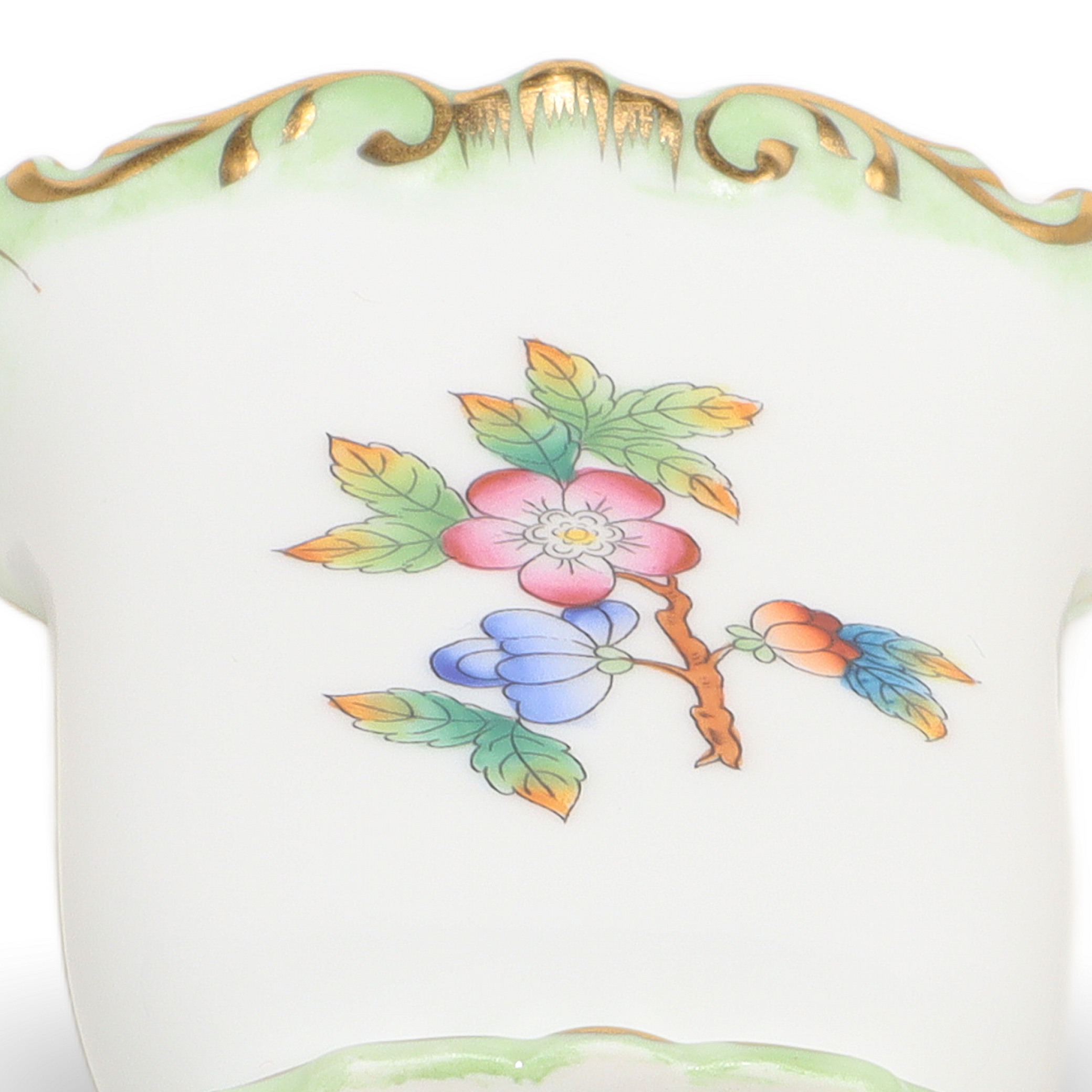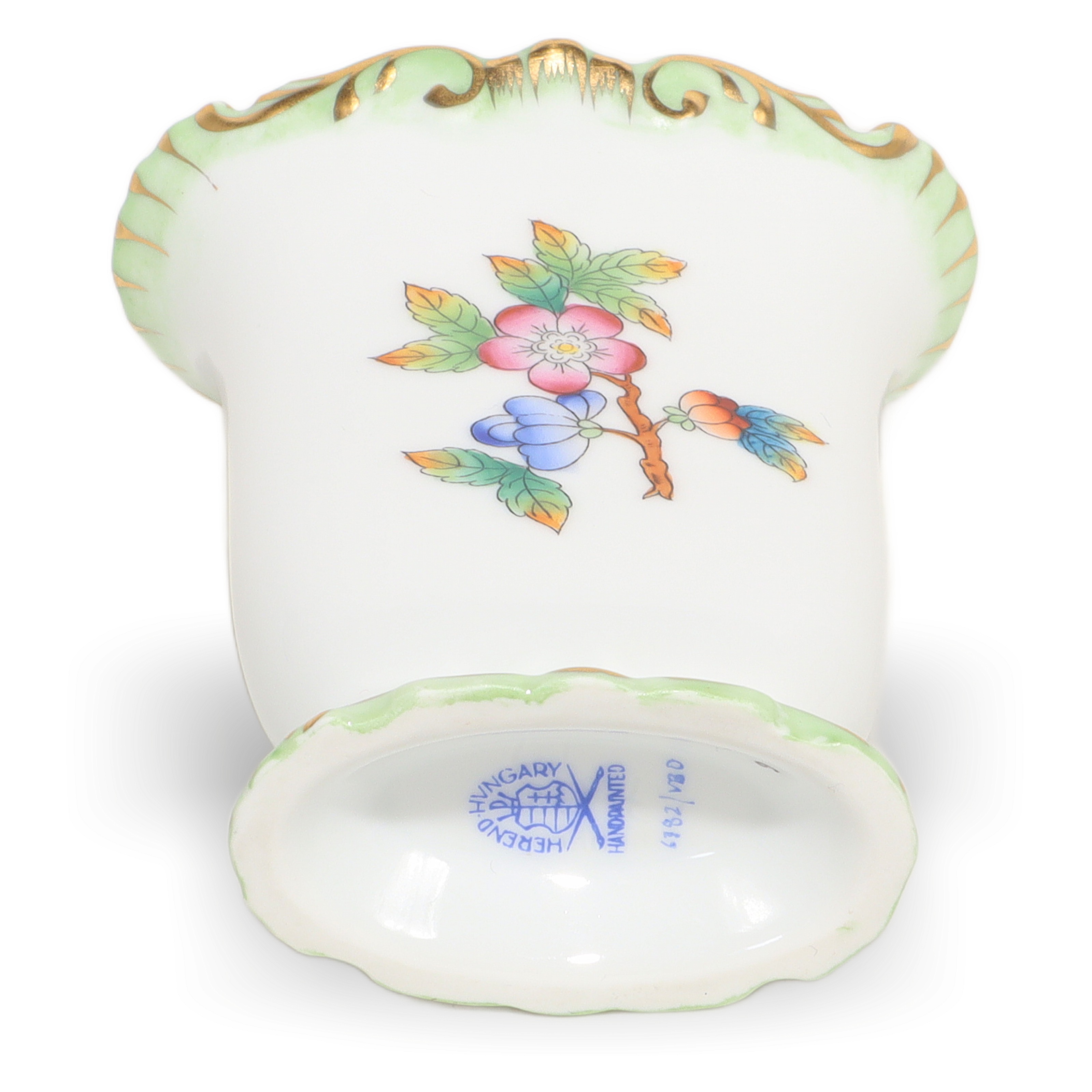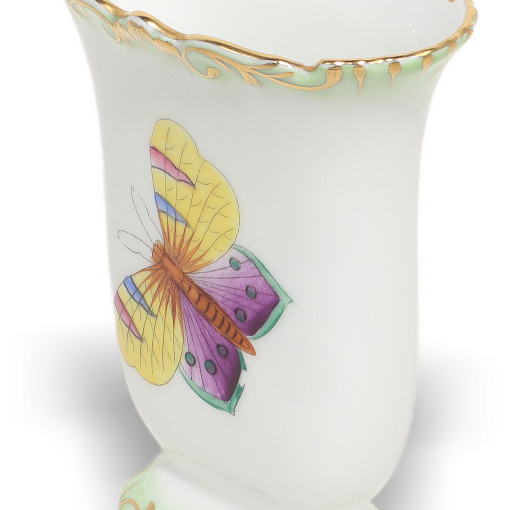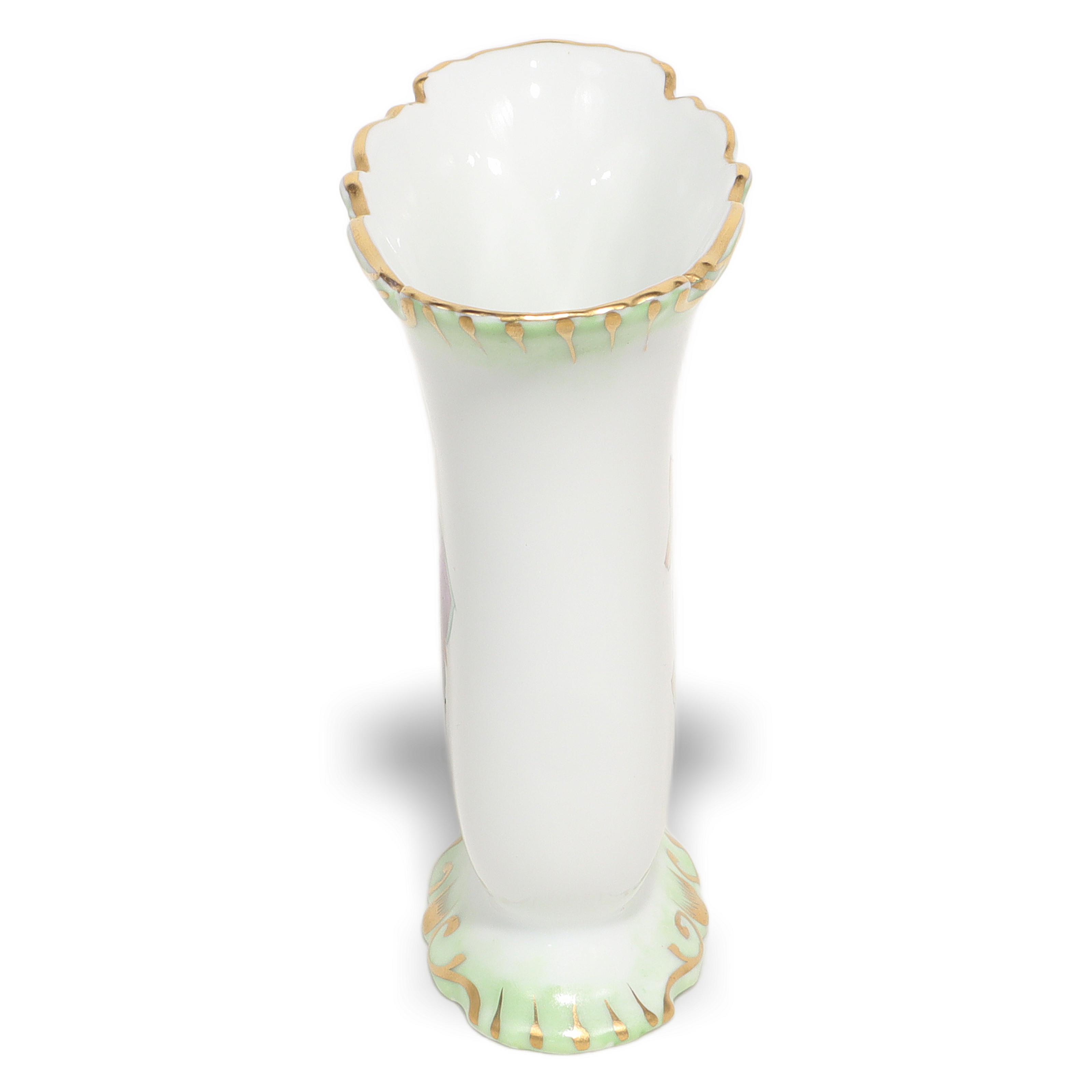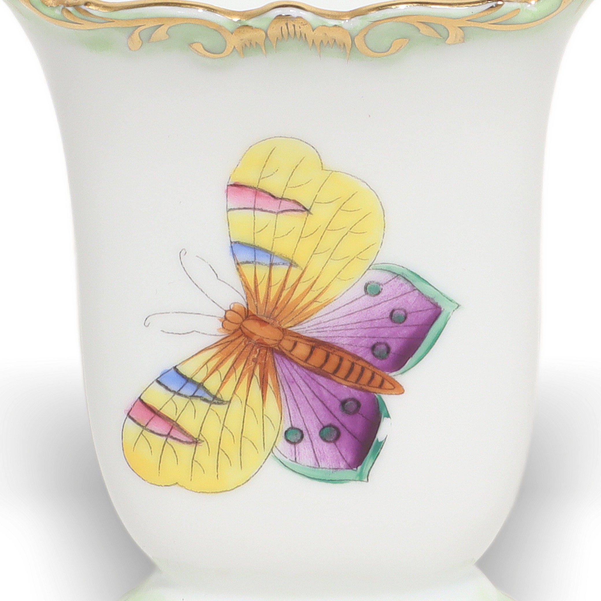 This is a Herend mini porcelain vase in the Queen Victoria pattern, hand painted with a bright butterfly and finished with a scalloped rim trimmed in gold. Made around 1970, it’s about 56 years old, putting it squarely in vintage territory. The vase stands 3.5 inches tall (8.75 cm) and measures 2.5 inches wide (6.25 cm) by 1.5 inches long (3.75 cm), a perfect size for a single bloom or to sit pretty on a shelf. Condition is Near Mint, with crisp colors and clean gilding, a lovely find for something this age. The soft green shading on the foot and rim adds a gentle, old-world glow.