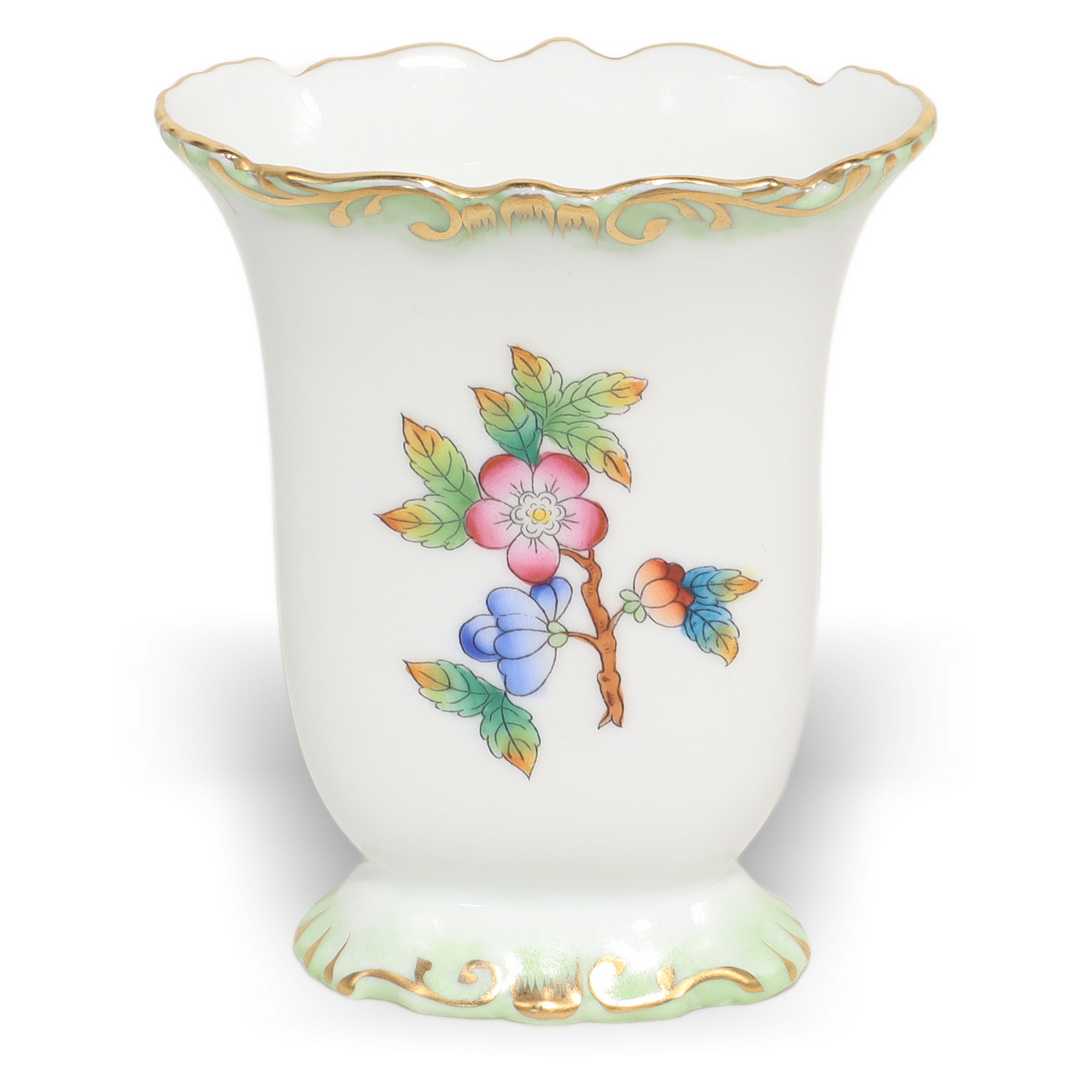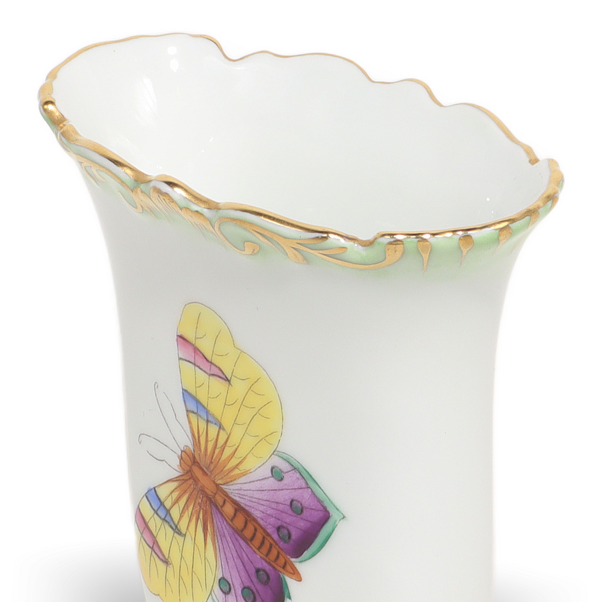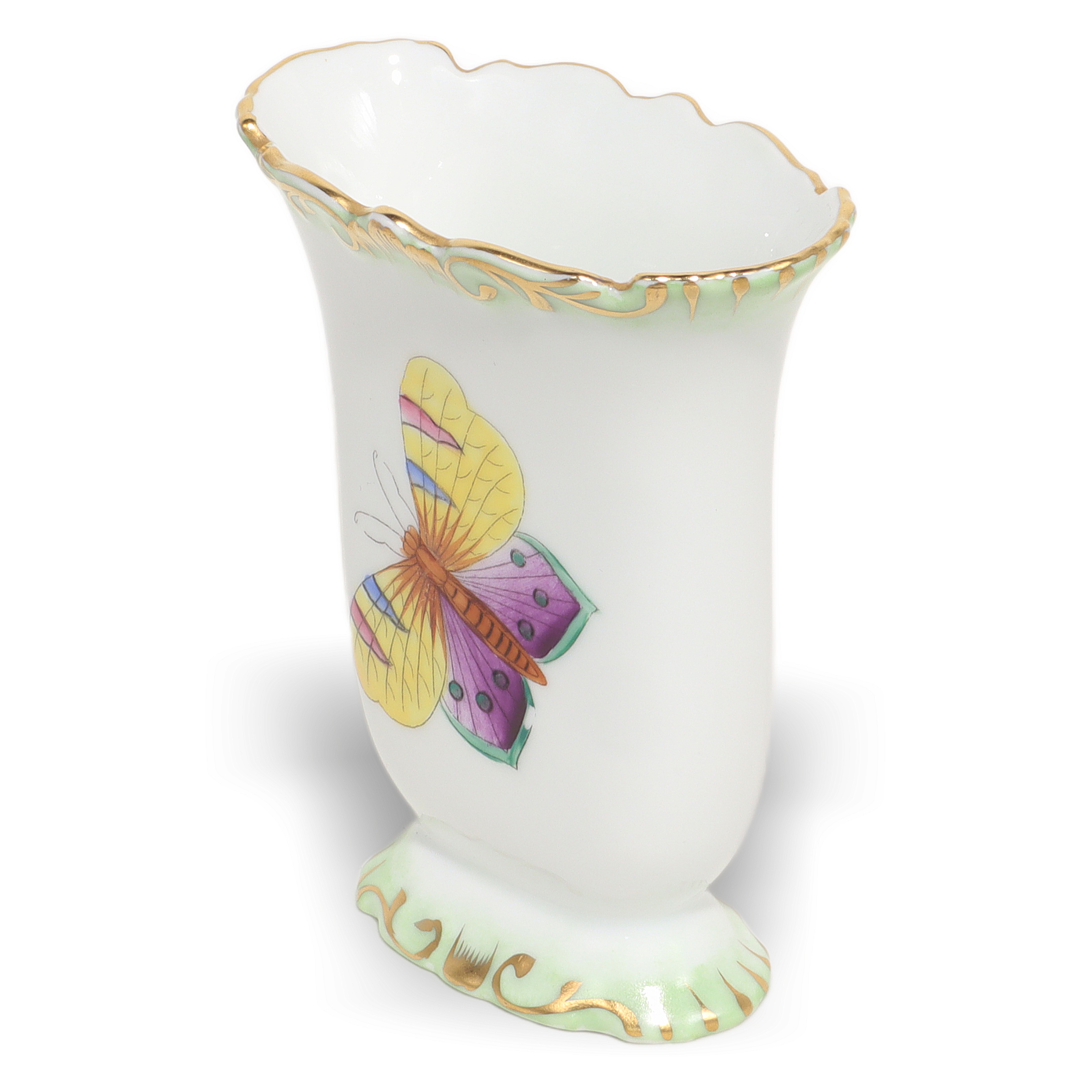 Herend, founded in 1826 in Hungary, is famed for fine, hand-painted hard-paste porcelain. Queen Victoria, known by the factory code VBO, debuted at London’s Great Exhibition in 1851 and won royal favor, inspiring its name. The design mixes butterflies, florals, and gilded flourishes, each piece painted by an individual artist, so small variations are normal. Mini vases from the late 1960s–1970s aren’t common, especially in this fresh condition. Collectors look for sharp colors, intact gold, and clear backstamps. With careful dusting and gentle display, this petite 1970 example should keep delighting for decades.