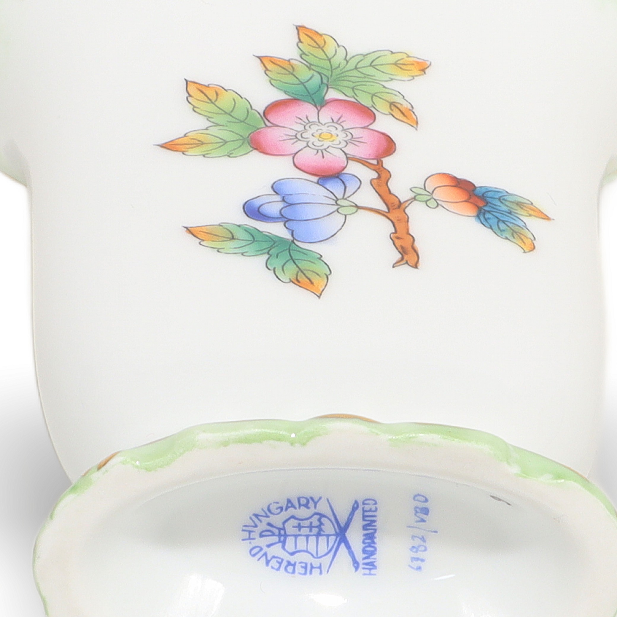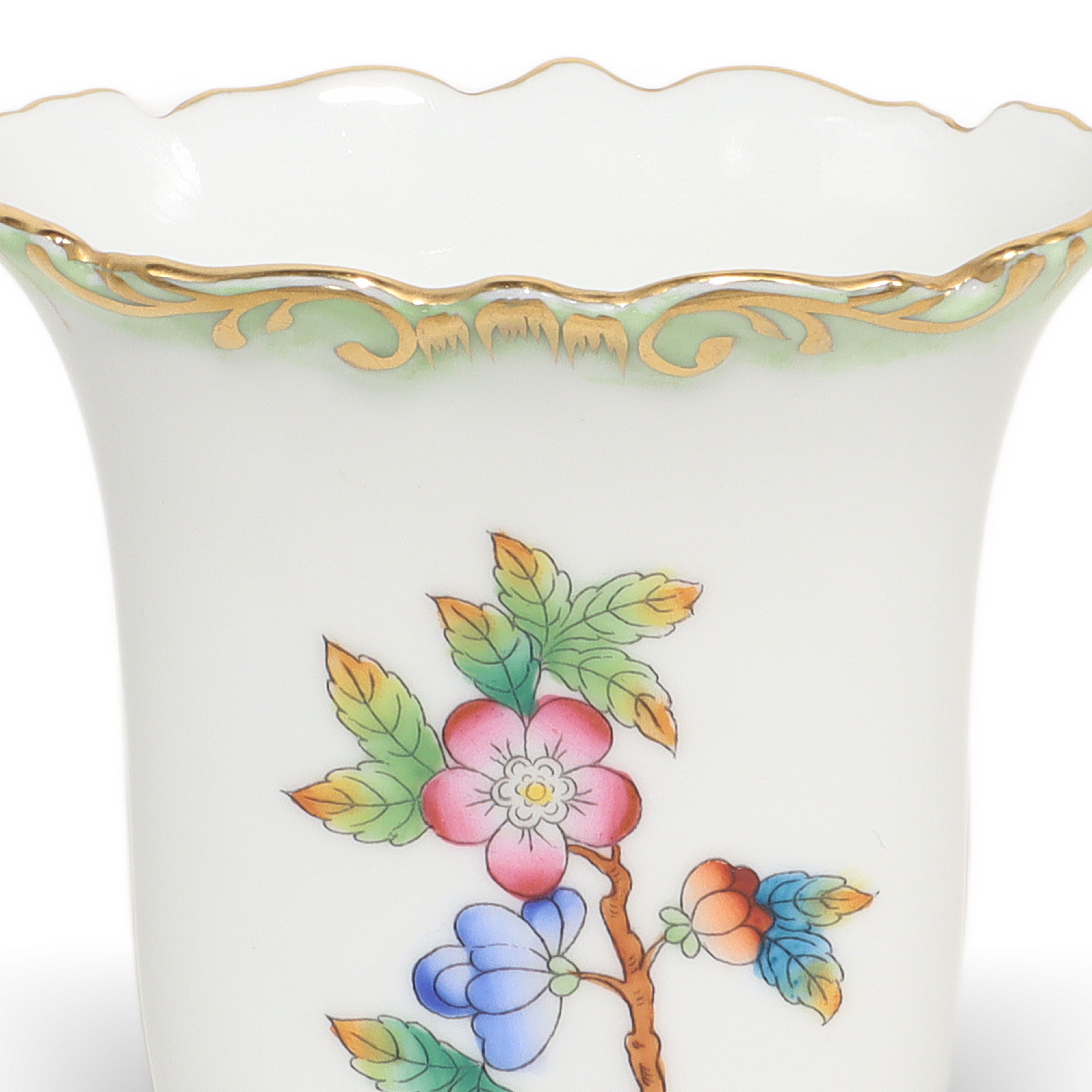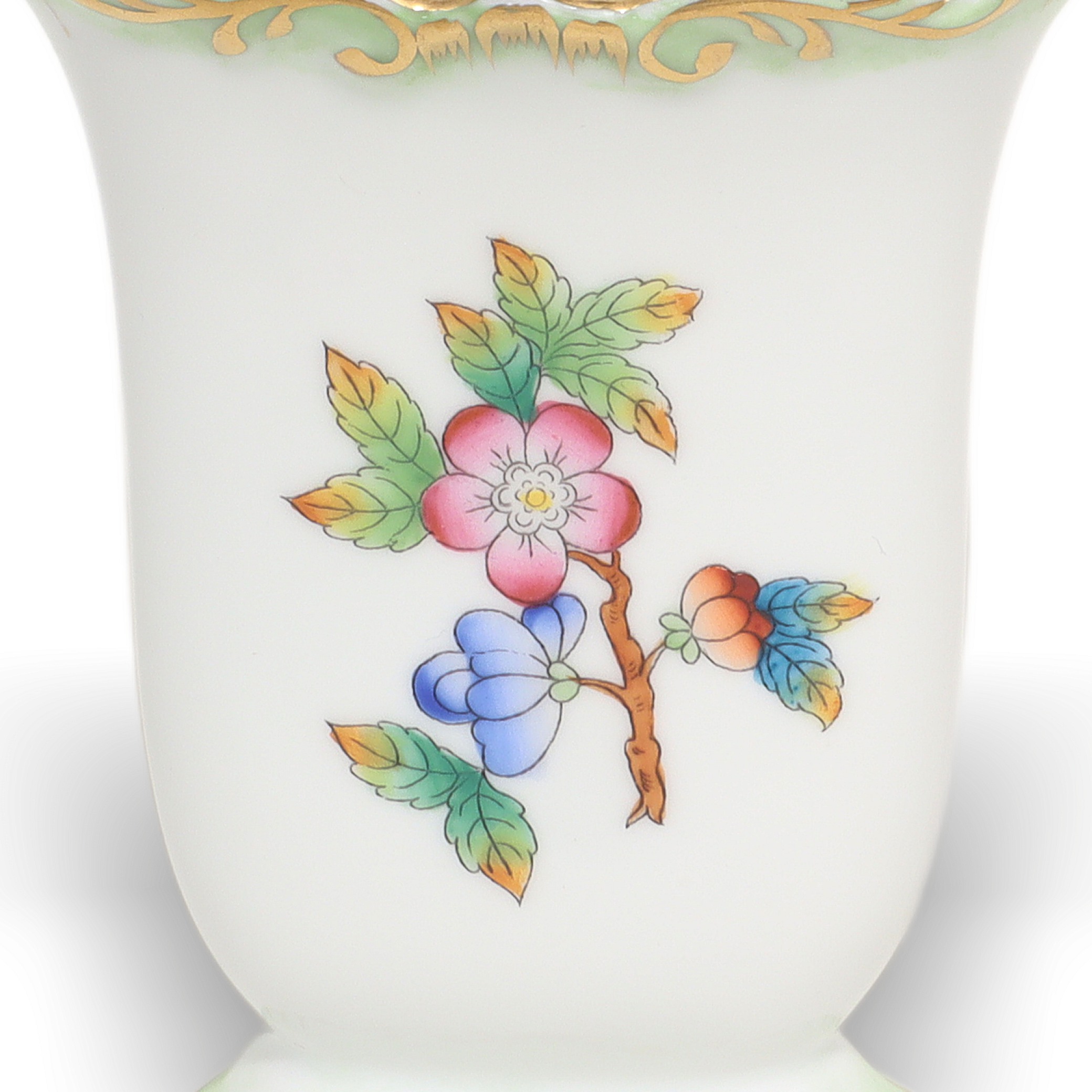 Herend, founded in 1826 in Hungary, is famed for fine, hand-painted hard-paste porcelain. Queen Victoria, known by the factory code VBO, debuted at London’s Great Exhibition in 1851 and won royal favor, inspiring its name. The design mixes butterflies, florals, and gilded flourishes, each piece painted by an individual artist, so small variations are normal. Mini vases from the late 1960s–1970s aren’t common, especially in this fresh condition. Collectors look for sharp colors, intact gold, and clear backstamps. With careful dusting and gentle display, this petite 1970 example should keep delighting for decades.
