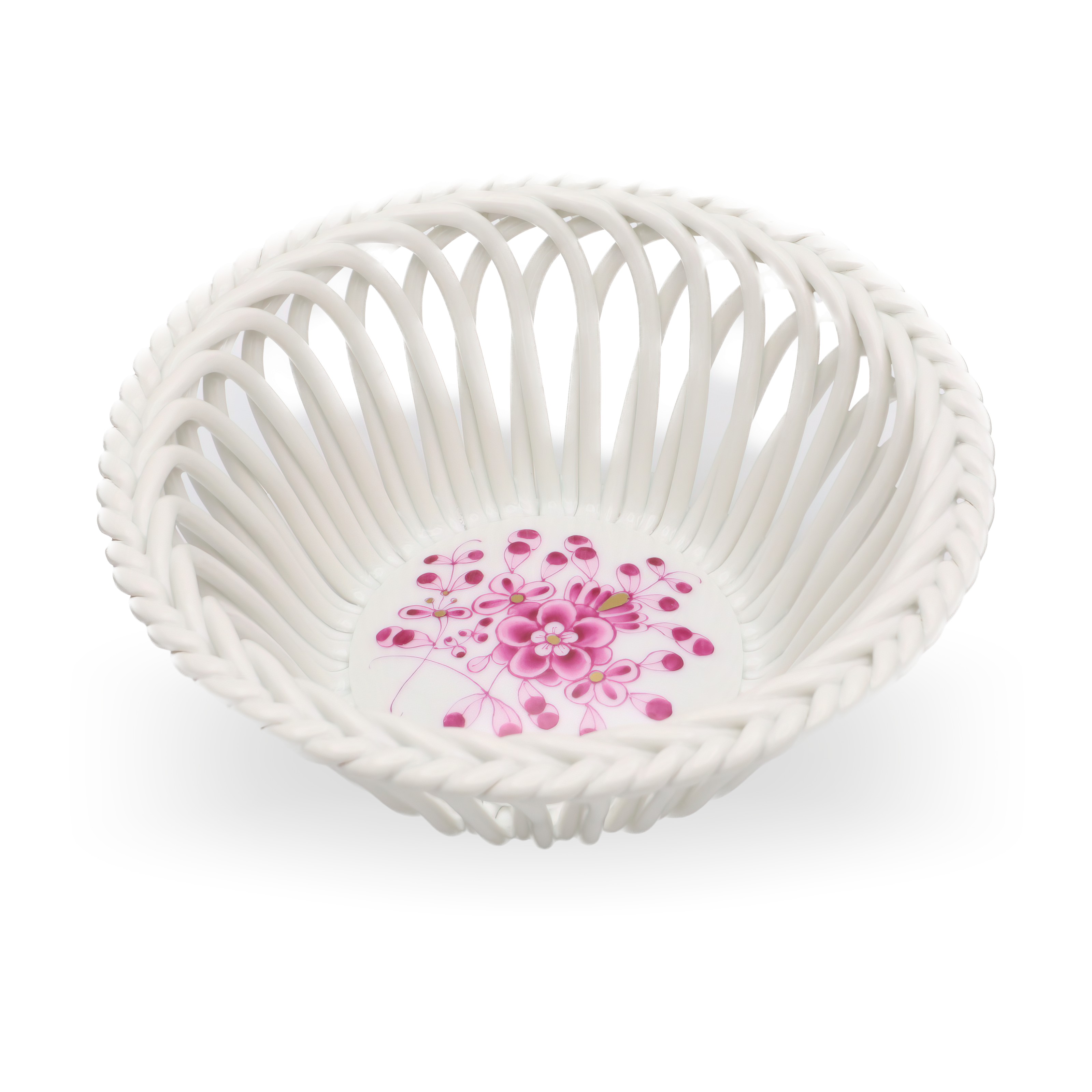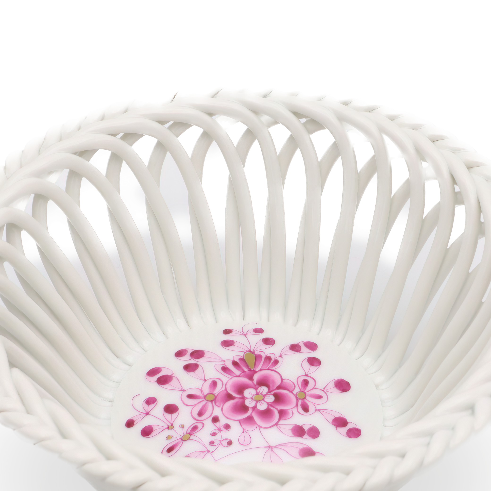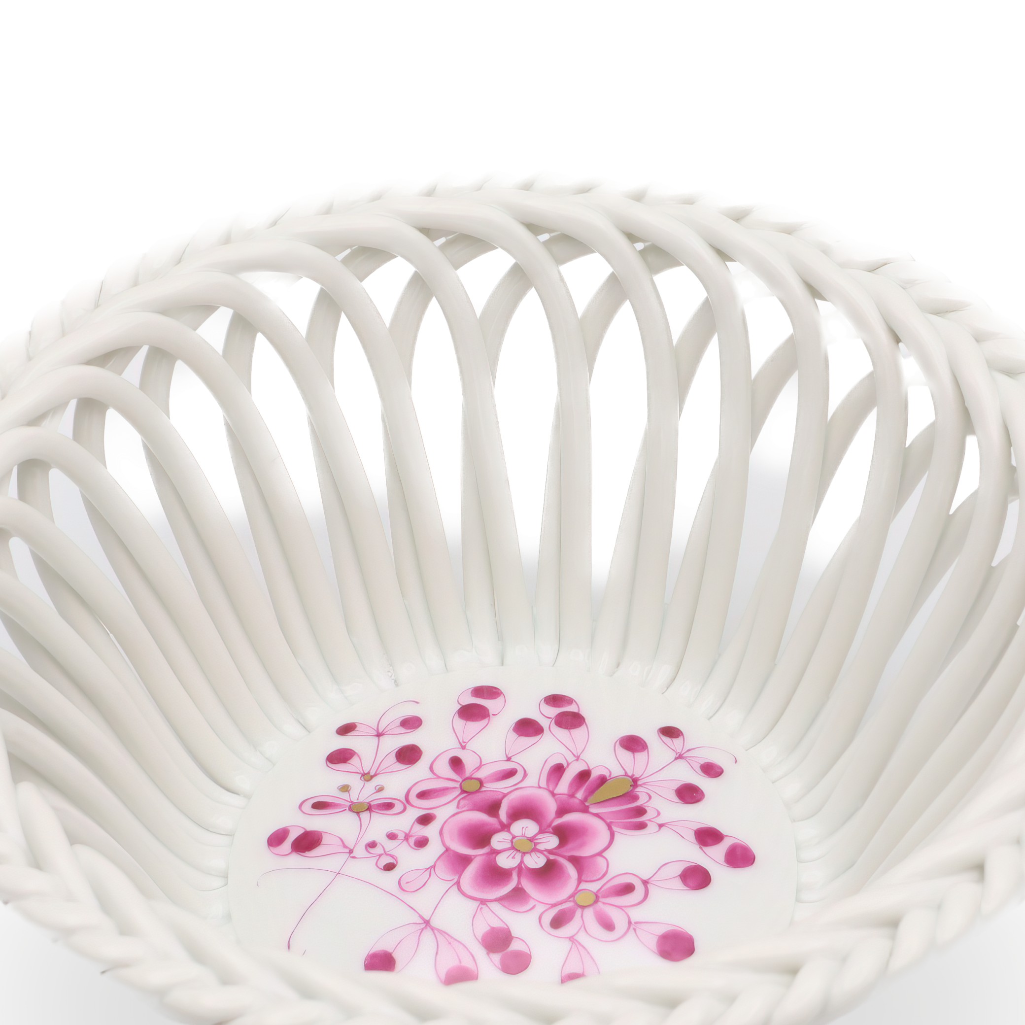 The openwork or reticulated design evident in this basket is one of Herend’s specialties, often crafted by skilled artisans who have honed their talents over years. Herend’s pieces tend to have an enduring quality, made with a pure, creamy-white porcelain base that highlights the vivid hand-painted scenes or motifs that adorn each item. Because every piece is meticulously painted by hand, slight variations ensure each item is unique, much like a miniature work of art. This personal touch, along with the brand’s commitment to quality craftsmanship, is a significant reason why Herend continues to be highly regarded and collected worldwide today.