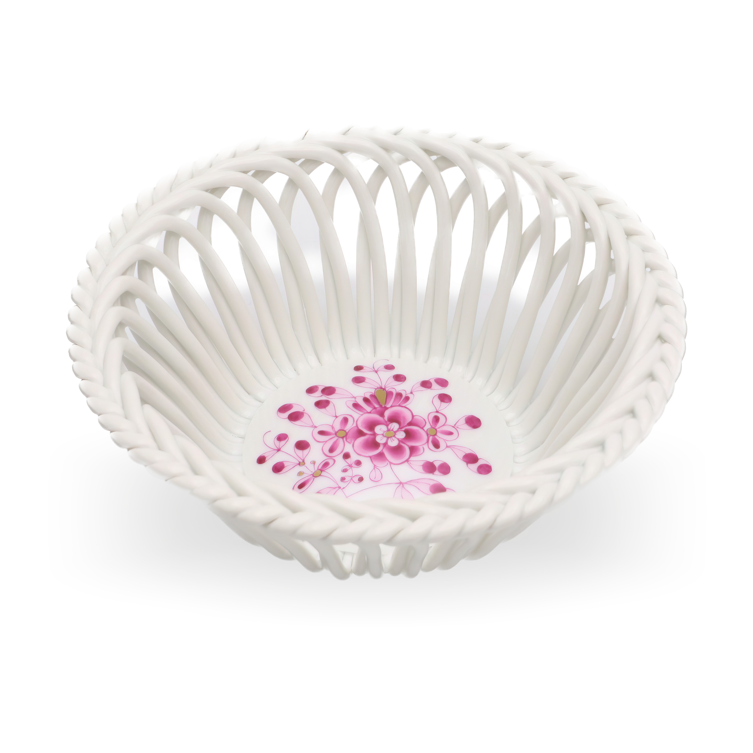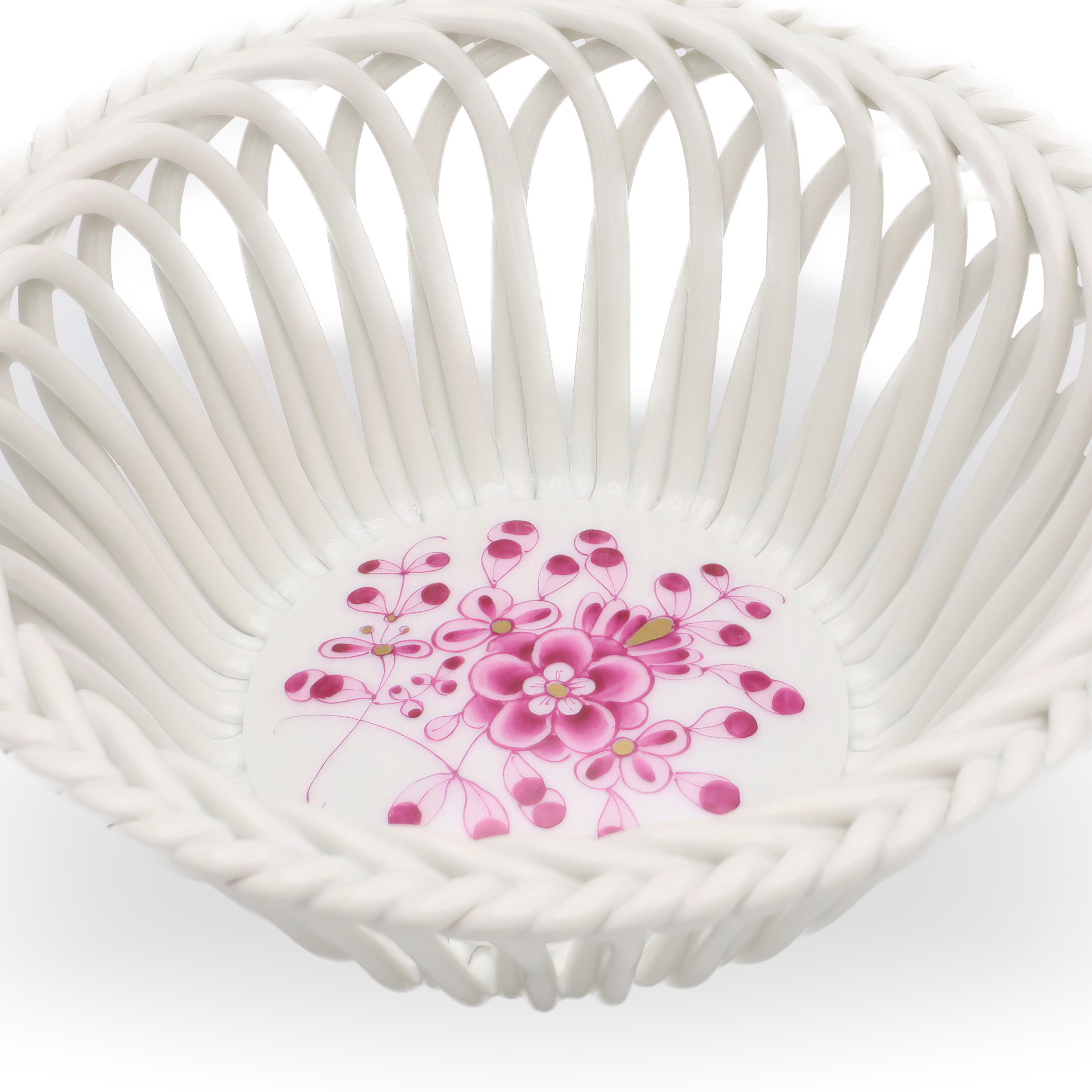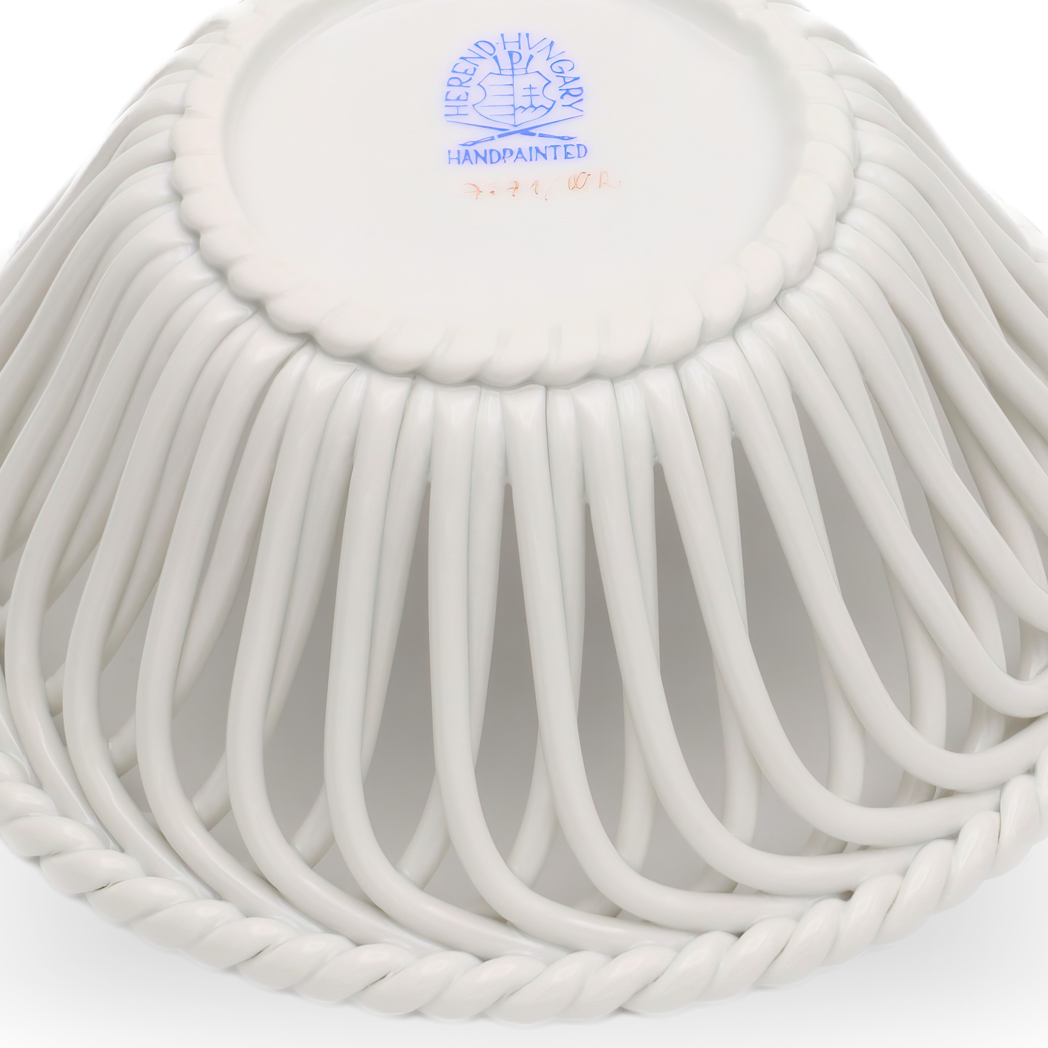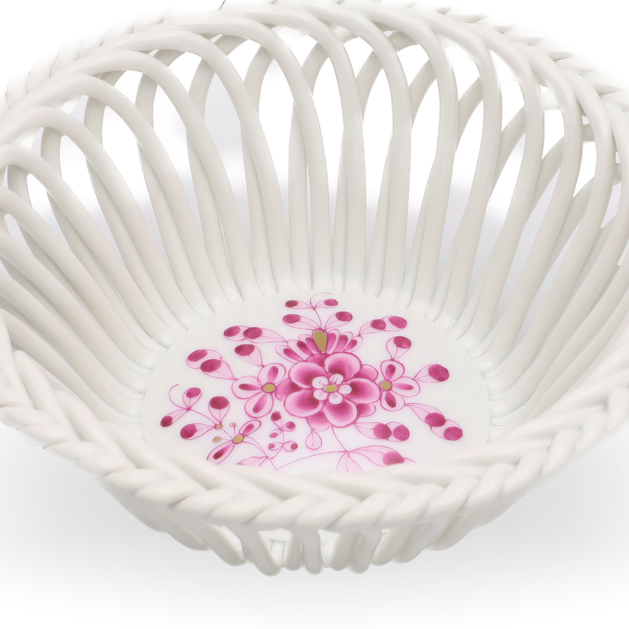 The openwork or reticulated design evident in this basket is one of Herend’s specialties, often crafted by skilled artisans who have honed their talents over years. Herend’s pieces tend to have an enduring quality, made with a pure, creamy-white porcelain base that highlights the vivid hand-painted scenes or motifs that adorn each item. Because every piece is meticulously painted by hand, slight variations ensure each item is unique, much like a miniature work of art. This personal touch, along with the brand’s commitment to quality craftsmanship, is a significant reason why Herend continues to be highly regarded and collected worldwide today.